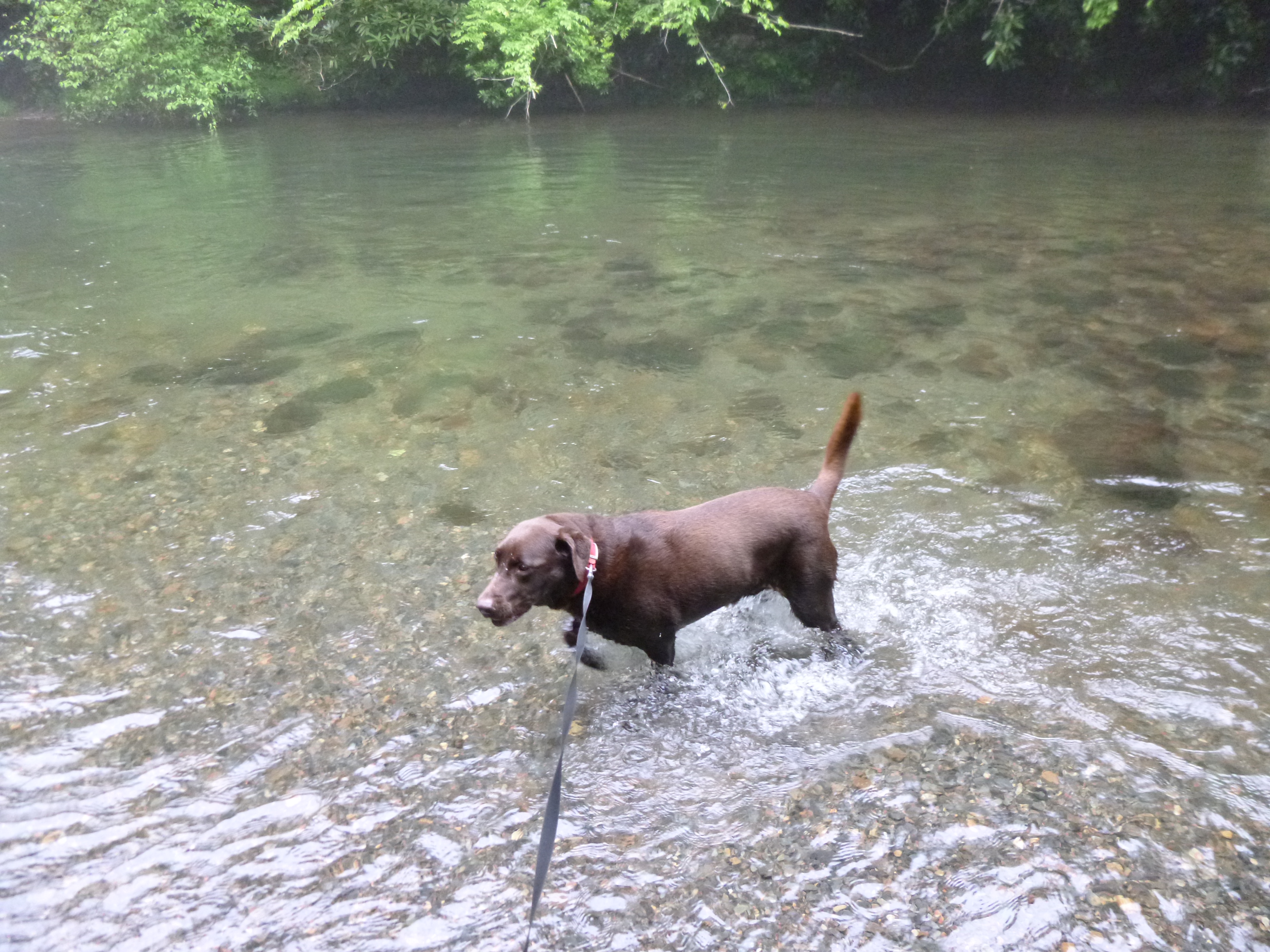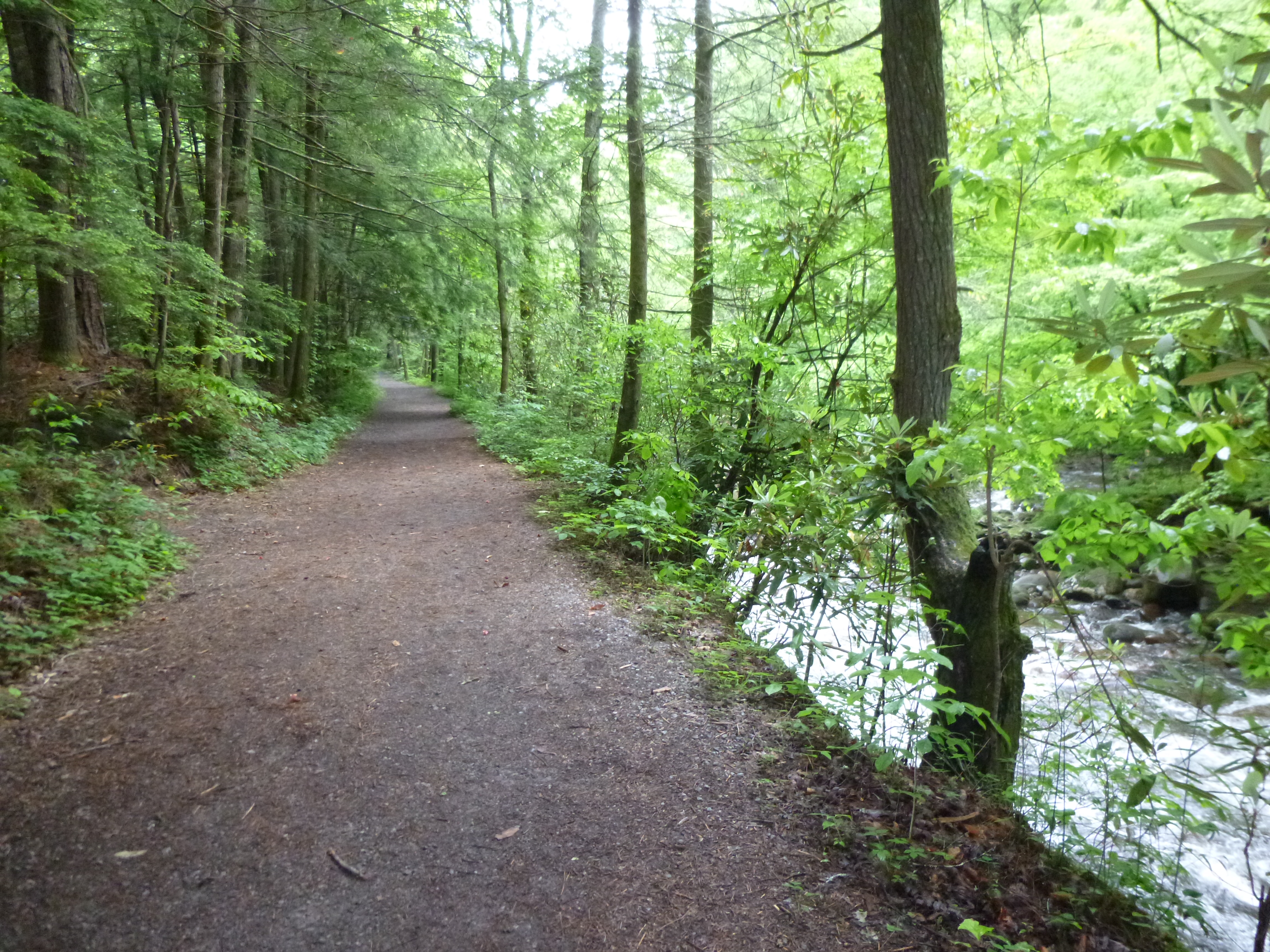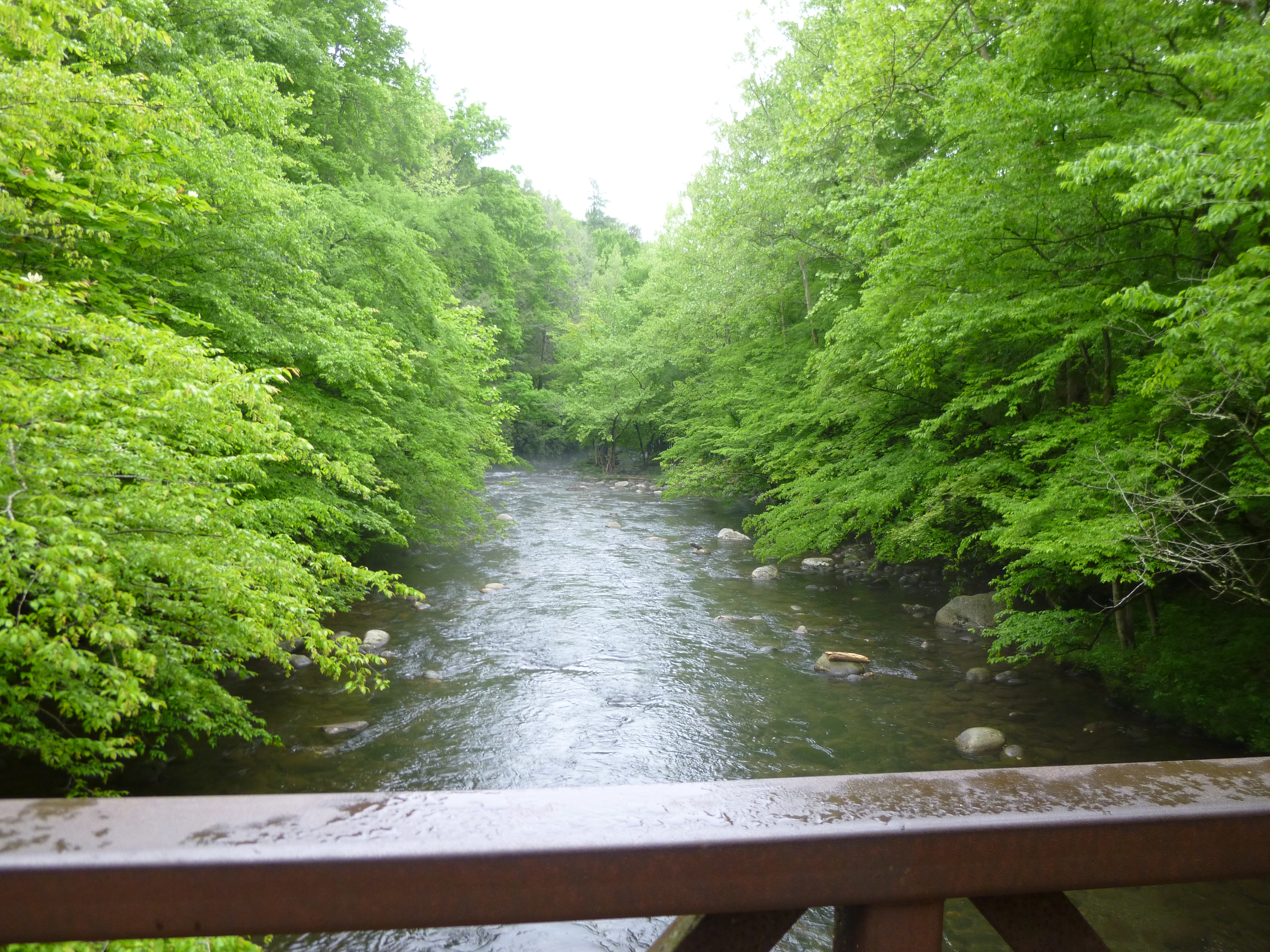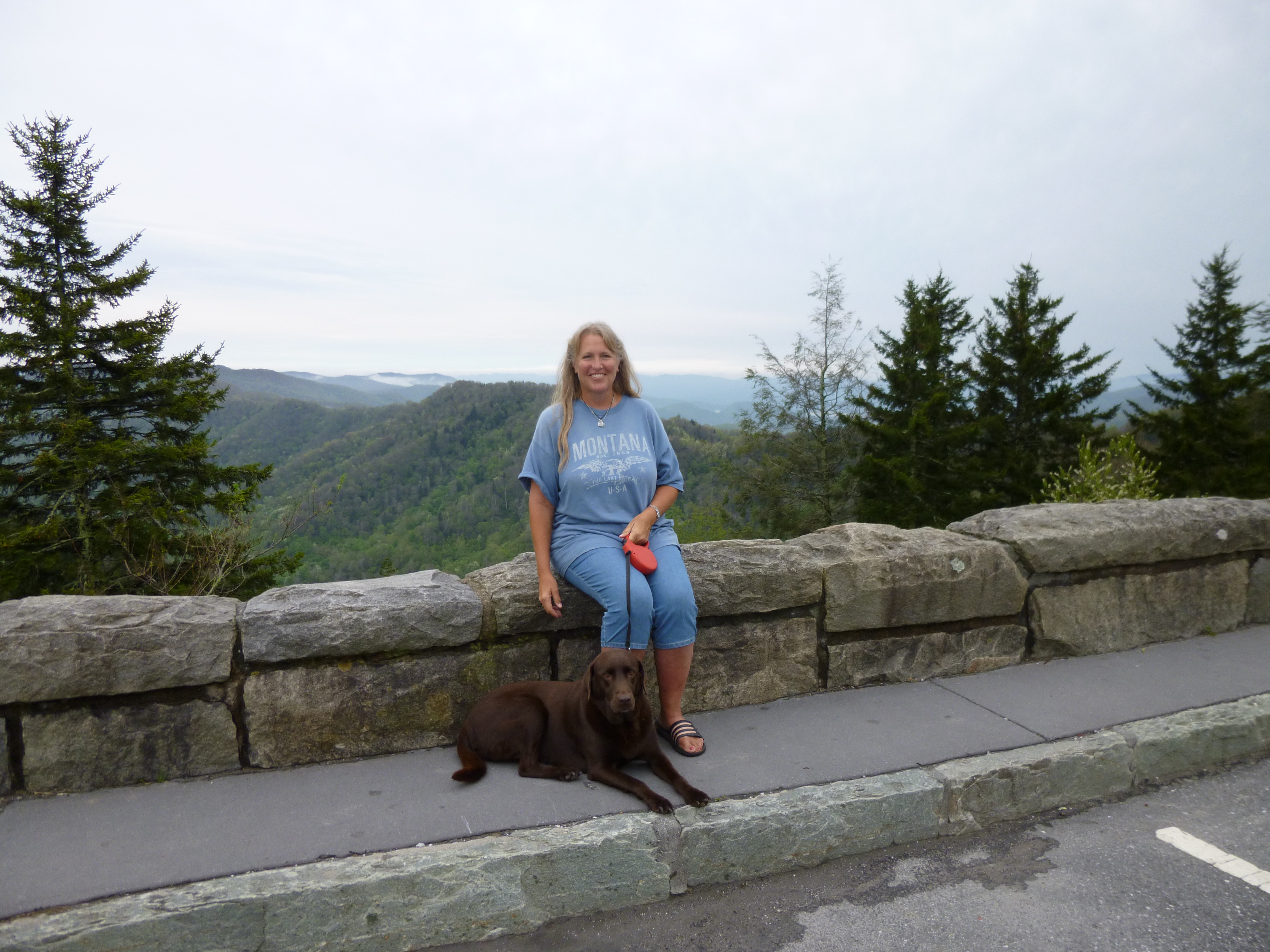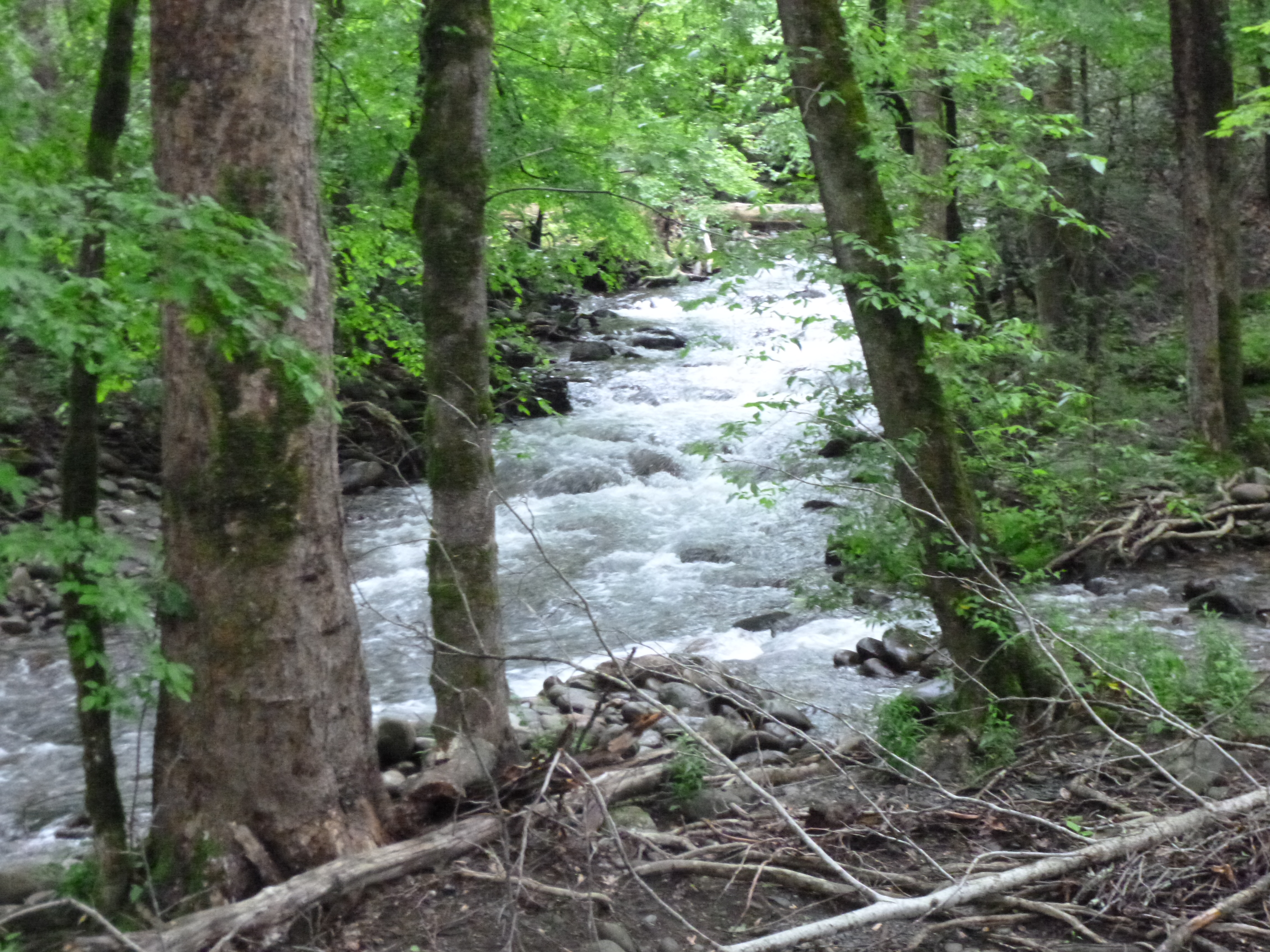 Then I drove into the national park and stopped by the visitor center. I showed my picture of yesterday’s snake to one of the rangers, and he identified it as a rat snake – they get up to 6 feet long, and are very, very harmless, but he agreed they can be a fright to stumble across! The 2 kinds of poisonous snakes in the area (copperheads and rattlesnakes) are very elusive, and that made me feel better. The Smoky Mountains are full of bears – I think they said there’s an average of 2 bears per square mile, and I’m guessing that’s the reason dogs are only allowed on one trail in the park. But that’s the trail we took and enjoyed a pretty 4 mile round-trip walk along a stream. And the trail was wide enough that I didn’t worry about hidden snakes, so I felt better about being in the woods than I did yesterday! I will indeed continue to walk in the woods – for now! I also have new admiration for the Civilian Conservation Corps from the 1930s. Not only did it provide jobs for thousands of people back then, but lots of the buildings and trails in the national parks, and campgrounds and roads were built because of them, and we continue to enjoy the results of their efforts to this day.