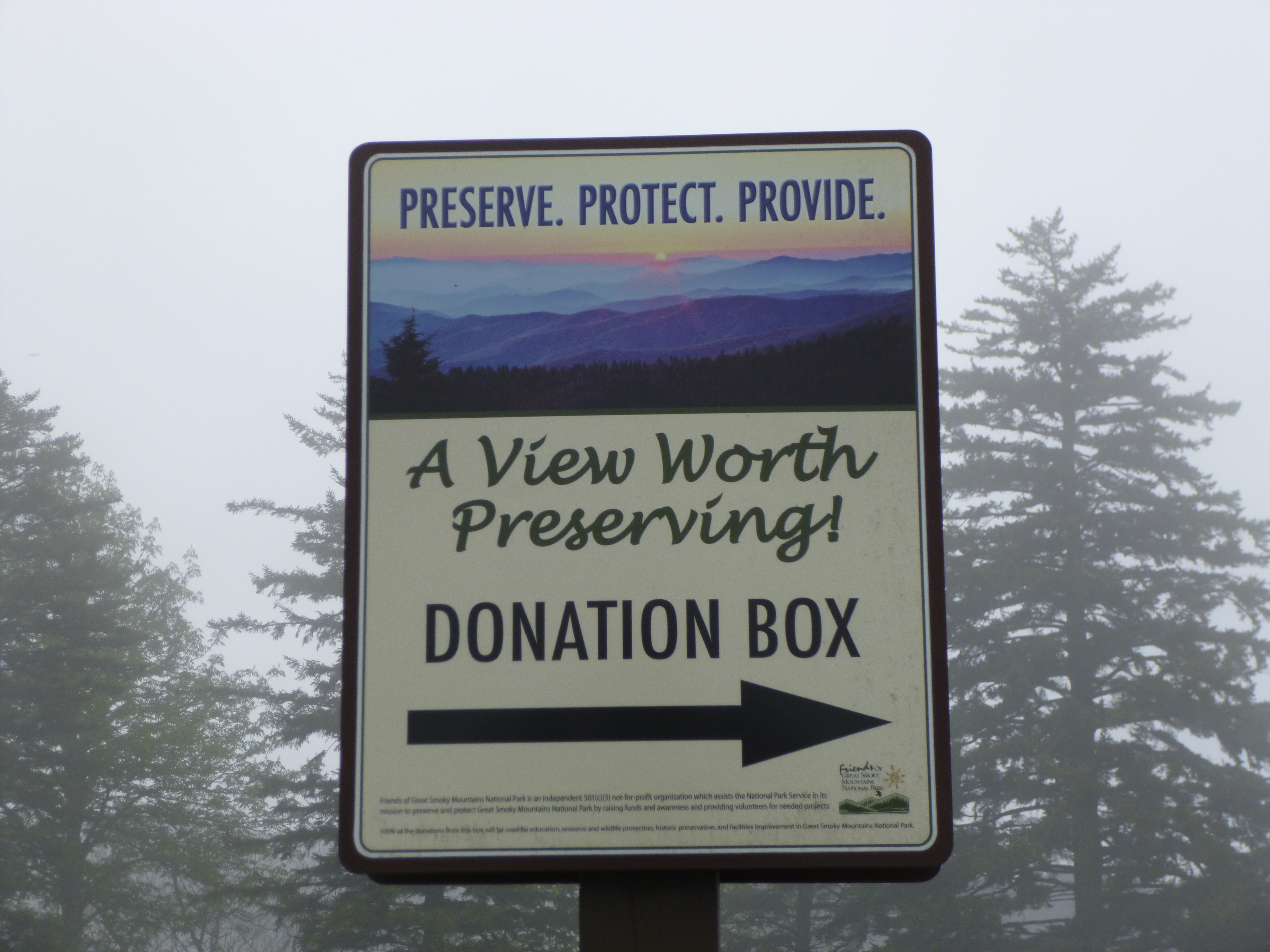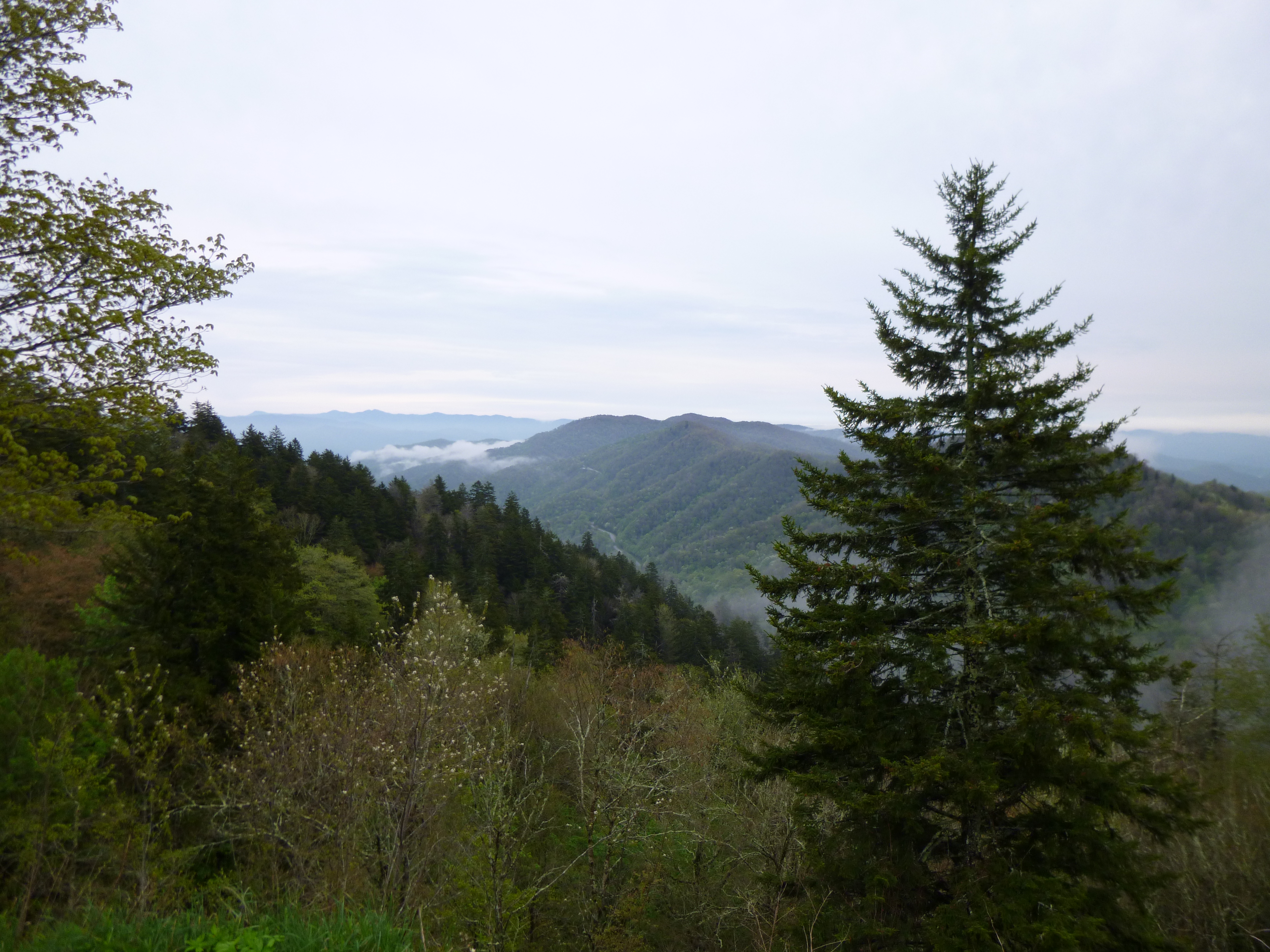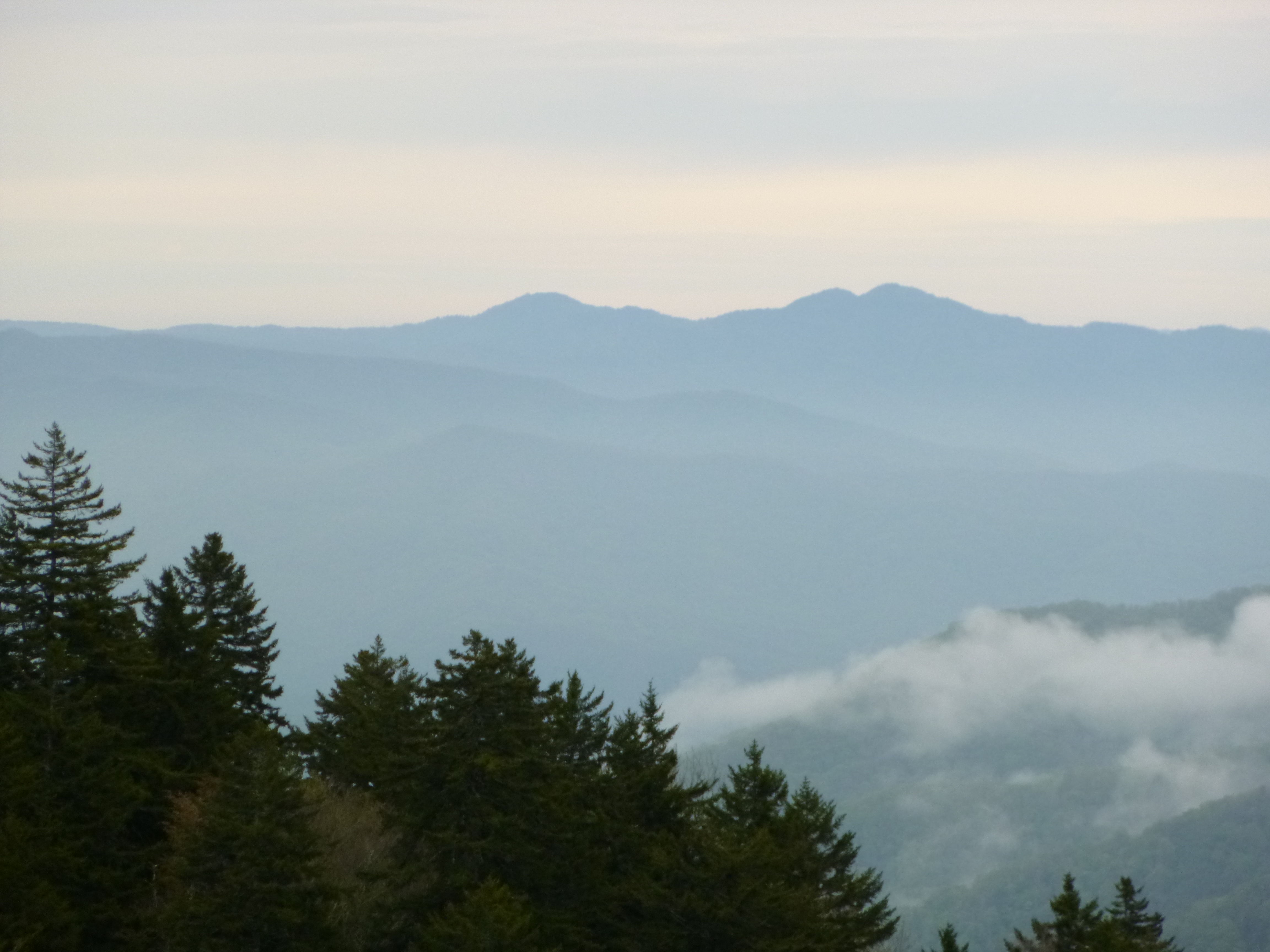 It was a pretty cloudy day, but when we were done with that hike, I wanted to drive through the park to the North Carolina border anyway, up to Newfound Gap. It took about a 1/2 hour to drive up there, going up the mountains most of the time. I encountered a bit of fog, and at one overlook, I was able to look down on a big cloud that had settled in the valley. It was really pretty to see it from above. I kept going, and was either driving through light fog or a cloud, and although visibility was reduced a little, it wasn’t too thick. I got to Newfound Gap at the TN/NC border where there was a big parking lot. I wandered around the area a little, and it was pretty, even in the fog. I just couldn’t really see any mountains! But I did notice a sign with a bear on it, explaining a bit about the park, and directing people to a donation box. There are no entry fees to get into the Smoky Mt National Park, and it’s one of the most visited national parks in the country. I decided to make a donation there – there was something very appealing about putting a donation into a box outdoors, high up in the mountains, in the fog, where it was still pretty despite the lack of a view. I didn’t figure I’d be in those kinds of circumstances again. So I wrote a note and a check and dropped it into the box, and poof! the fog began to lift! Within about 10 minutes, I could see the Smokies and get some pictures – to compare with the ones I took in the fog. Talk about coincidental timing! I was happy to be able to see the view, and then I also noticed the Appalachian Trail passed right through the parking lot, so I walked a little of it in both directions. It was early evening, and the trail was steep and muddy, so I didn’t walk on much of it, but it was fun to at least walk a little in both directions. I must say I wouldn’t want to be camping on a damp night near a muddy trail!