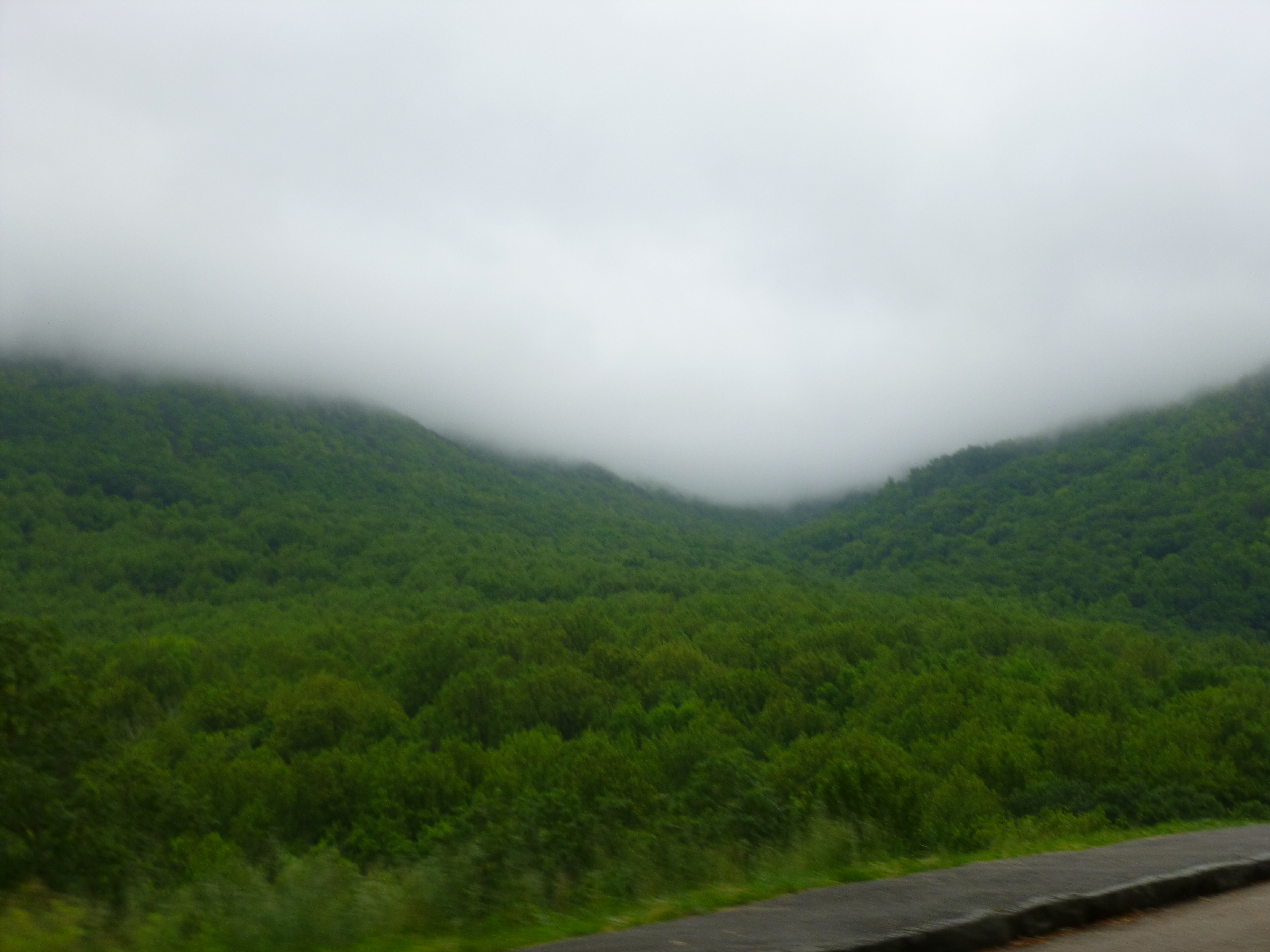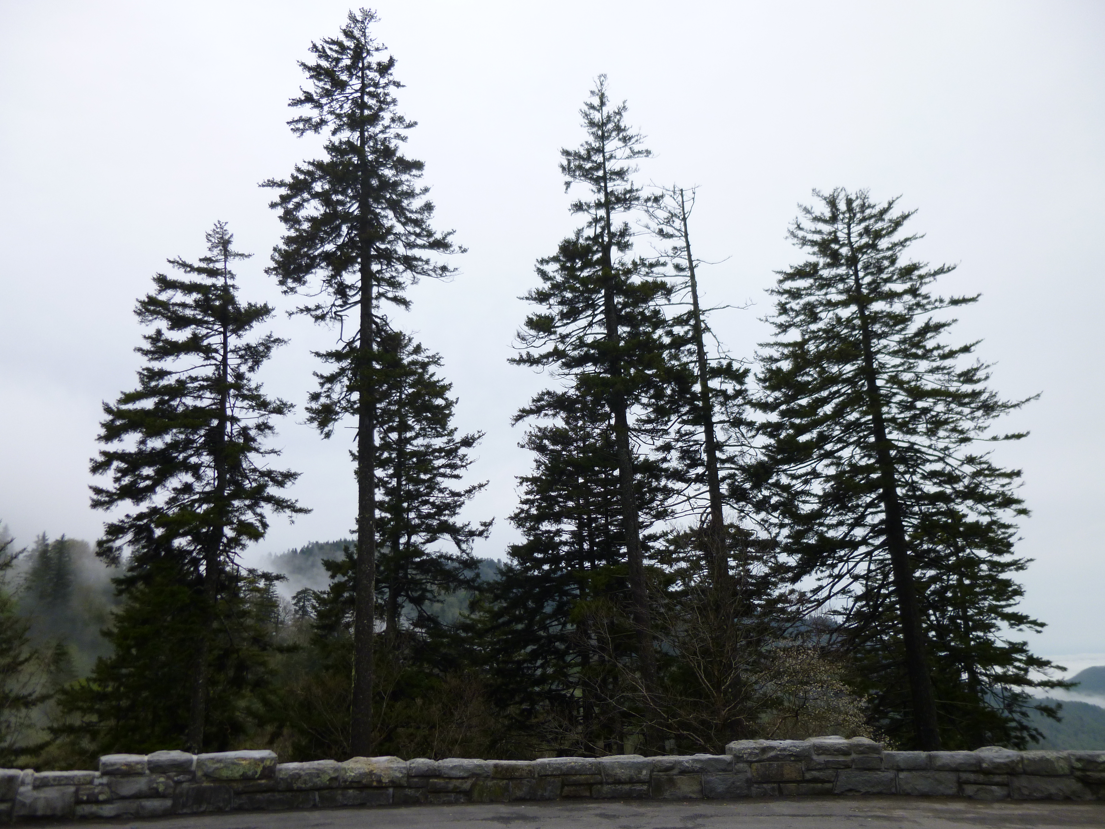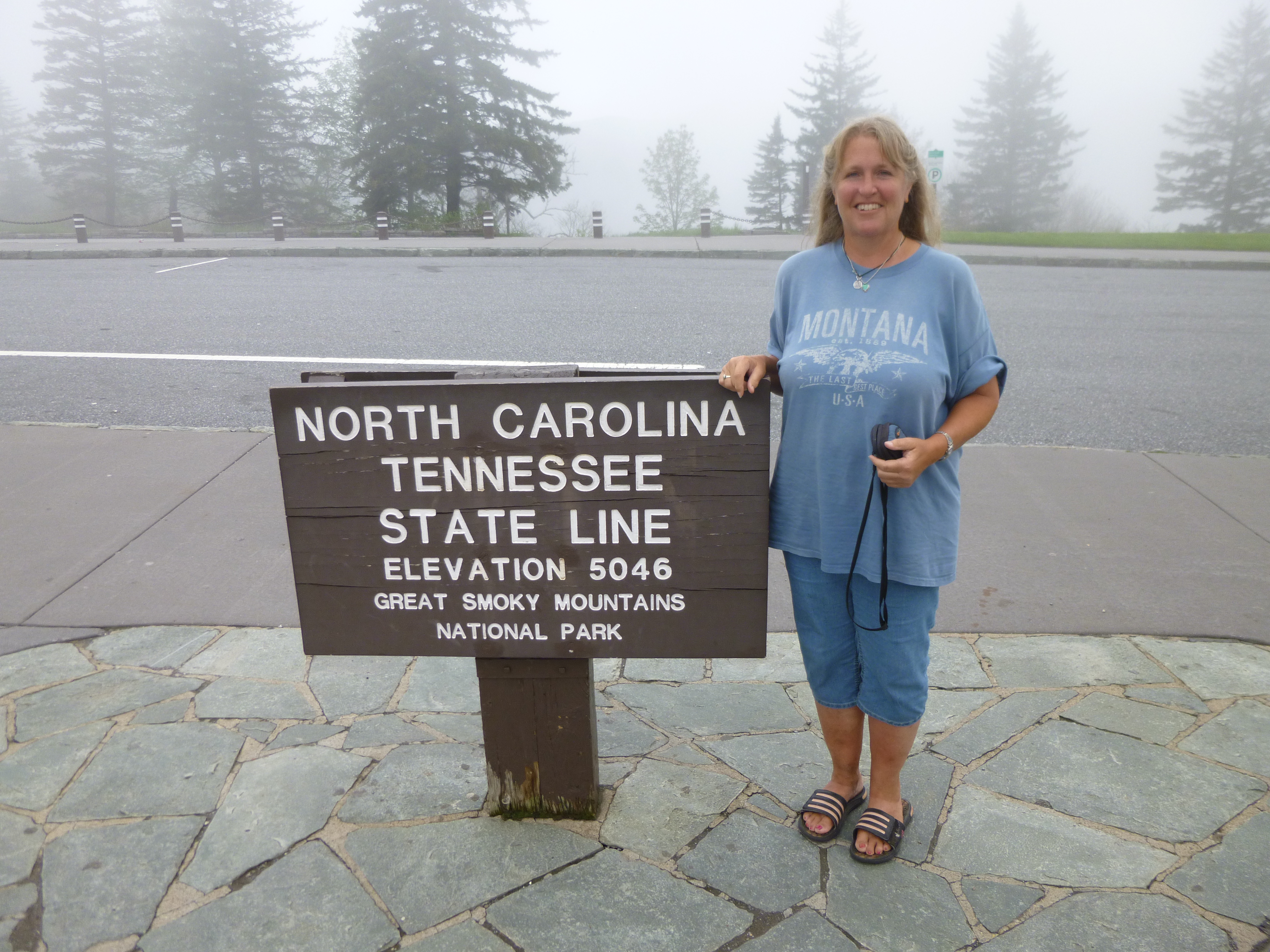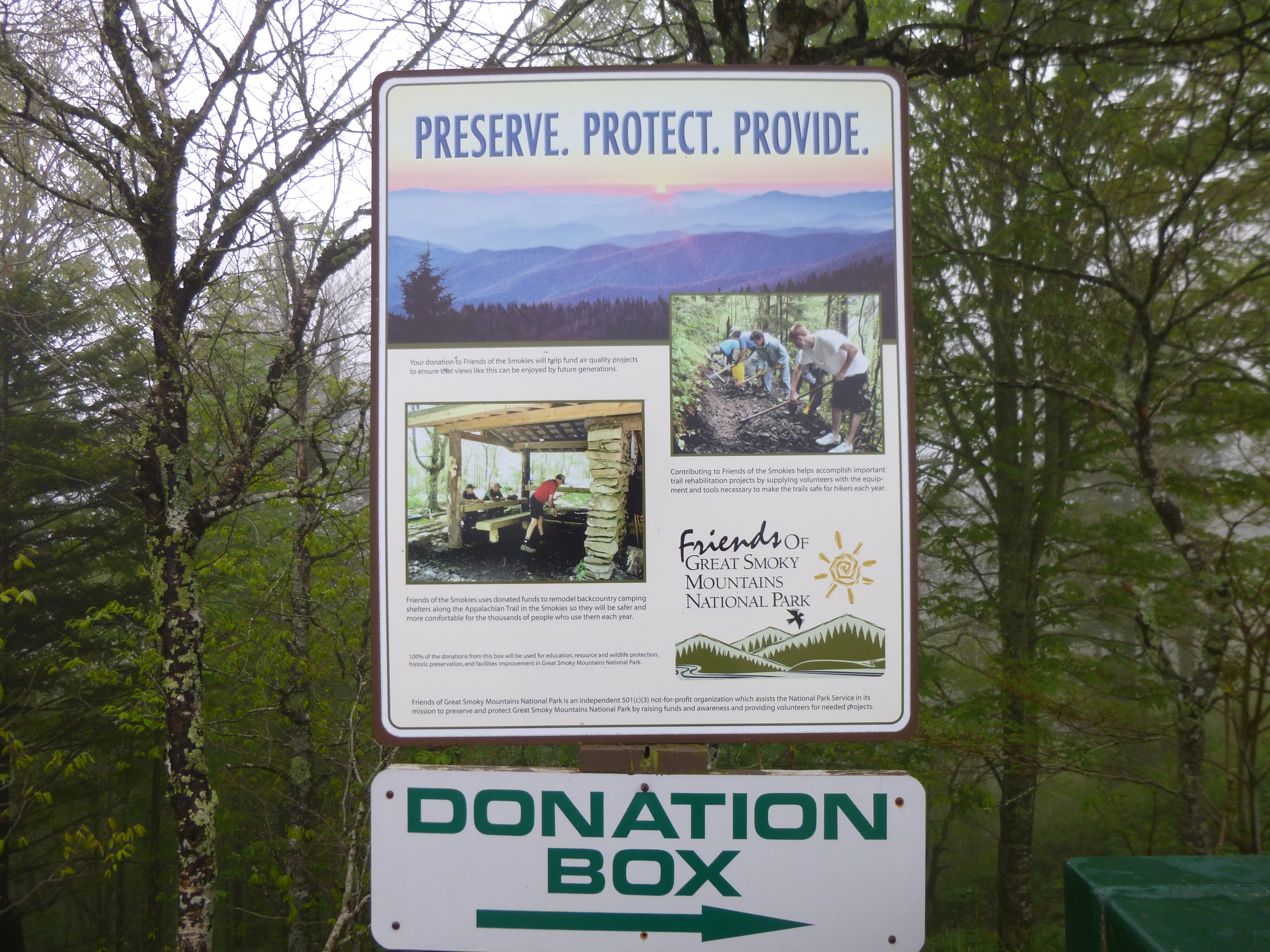 It was a pretty cloudy day, but when we were done with that hike, I wanted to drive through the park to the North Carolina border anyway, up to Newfound Gap. It took about a 1/2 hour to drive up there, going up the mountains most of the time. I encountered a bit of fog, and at one overlook, I was able to look down on a big cloud that had settled in the valley. It was really pretty to see it from above. I kept going, and was either driving through light fog or a cloud, and although visibility was reduced a little, it wasn’t too thick. I got to Newfound Gap at the TN/NC border where there was a big parking lot. I wandered around the area a little, and it was pretty, even in the fog. I just couldn’t really see any mountains! But I did notice a sign with a bear on it, explaining a bit about the park, and directing people to a donation box. There are no entry fees to get into the Smoky Mt National Park, and it’s one of the most visited national parks in the country. I decided to make a donation there – there was something very appealing about putting a donation into a box outdoors, high up in the mountains, in the fog, where it was still pretty despite the lack of a view. I didn’t figure I’d be in those kinds of circumstances again. So I wrote a note and a check and dropped it into the box, and poof! the fog began to lift! Within about 10 minutes, I could see the Smokies and get some pictures – to compare with the ones I took in the fog. Talk about coincidental timing! I was happy to be able to see the view, and then I also noticed the Appalachian Trail passed right through the parking lot, so I walked a little of it in both directions. It was early evening, and the trail was steep and muddy, so I didn’t walk on much of it, but it was fun to at least walk a little in both directions. I must say I wouldn’t want to be camping on a damp night near a muddy trail!