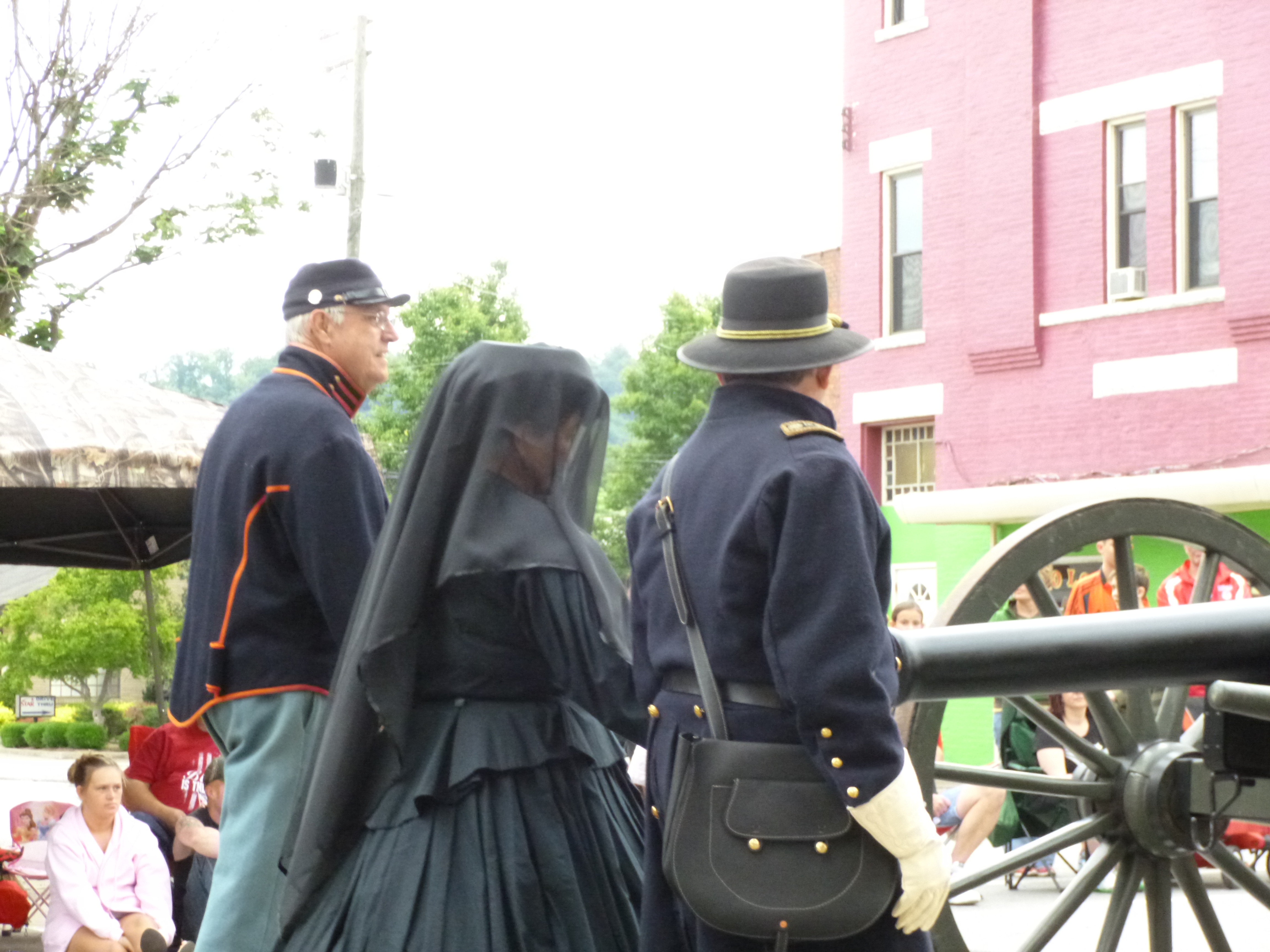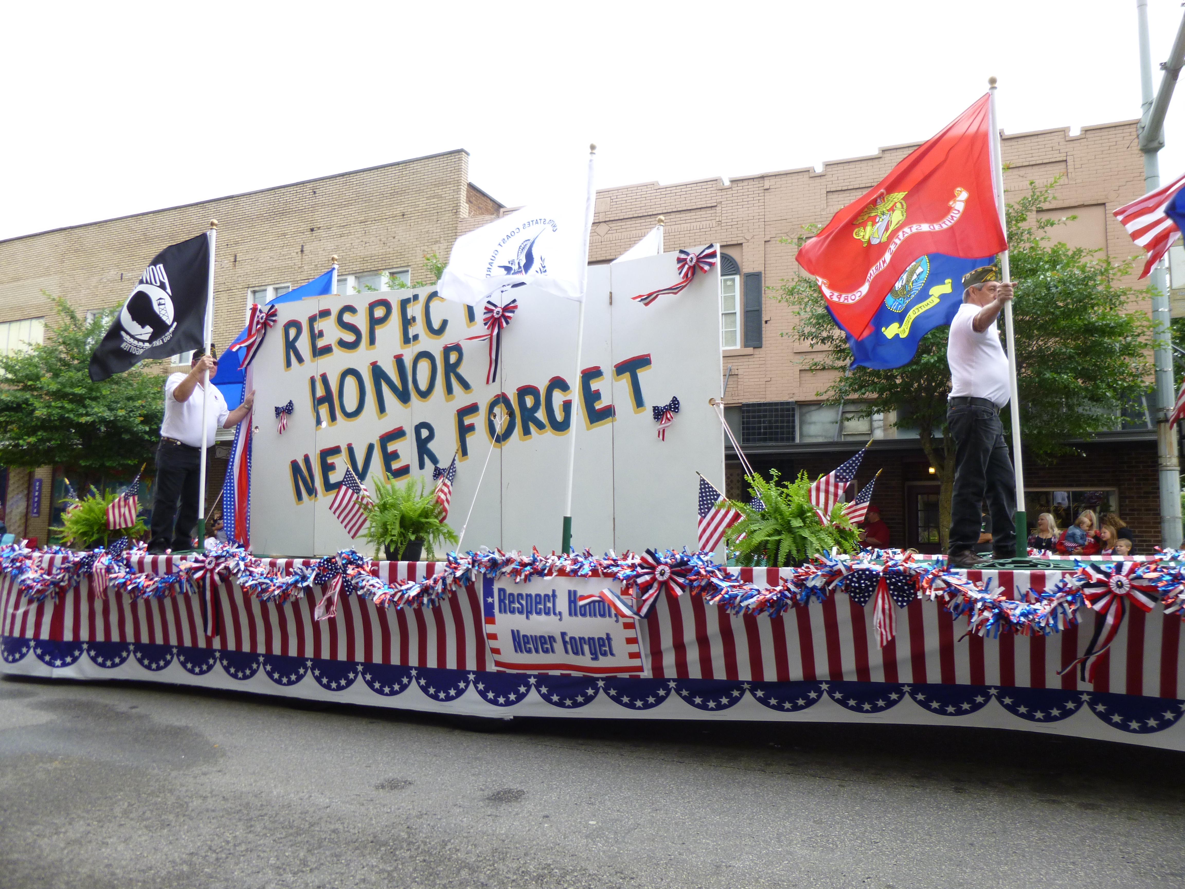 Then Tula and I settled into our spot to watch the parade – I even brought her dog bed out for her to lay on. With a 21-gun salute and a rendition of Taps, the parade began. And it was a full 2-hour parade with countless military and veterans organizations, firetrucks, bands, flags, church groups, scouts, karate, dance and gymnastic groups, community groups, old cars, and horses. Toward the end there was even a hillbilly section with old, old cars decorated with road kill and moonshine barrels, and the people dressed in overalls and straw hats. Kids got lots of candy, and I don’t think anyone could chew all the Double Bubble gum that was passed out! It was a fun parade to see.