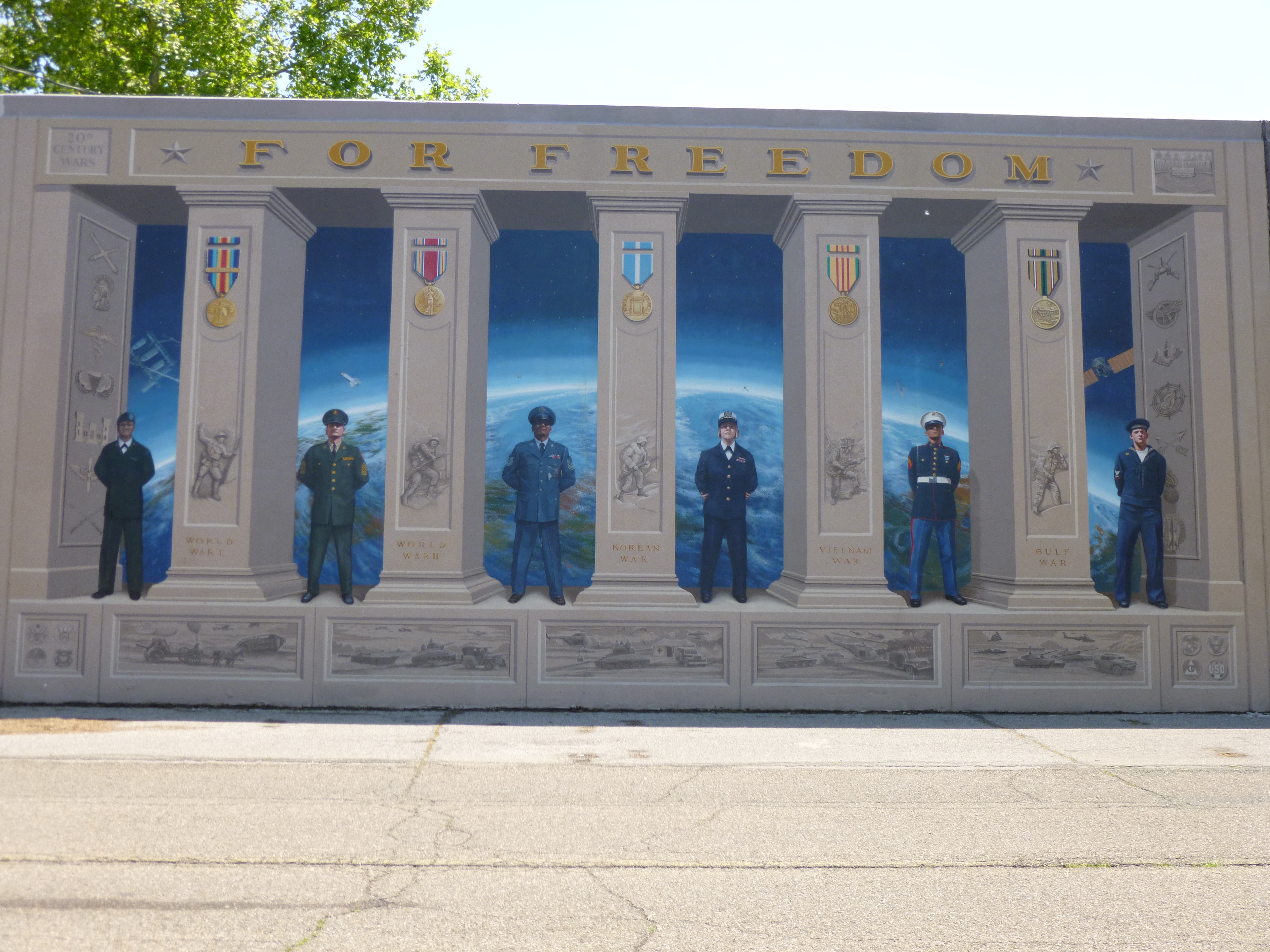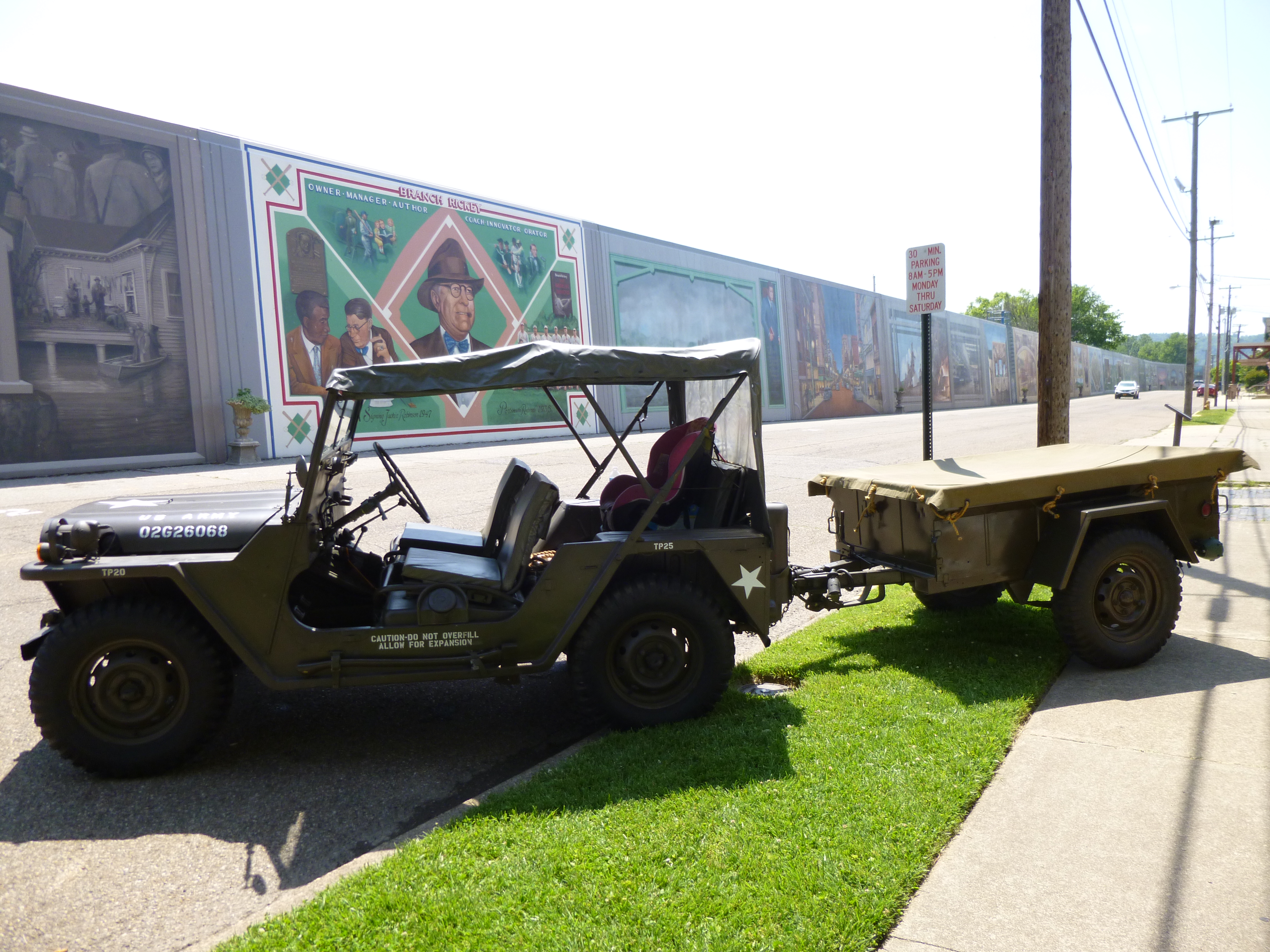Then it was time to start heading west again. But I only got about 1/2 hour or so up the road when it occurred to me I hadn’t yet bought Ohio postcards, which I send to various family members every week. I was in the town of Portsmouth, and stopped at a CVS to see if by any chance they had any. They didn’t, but the guy referred me to the visitor center and said they had a lot. I didn’t know if they’d be open on a holiday, but it was worth a try, and then I saw something I had forgotten about. I had been in Portsmouth before, maybe about 12 years ago, for a dance performance weekend with a bunch of kids from the studio. Taryn was young, and wasn’t performing, but she and the other younger dancers were also able to participate in a master class and watch the performance that some of our older studio kids were performing in. One of the things we all saw when we were down there were the flood wall murals, and when I saw those again, I knew Tula and I would have to get out and walk and admire them again. Portsmouth is right on the Ohio River, and there are 20′ high concrete flood walls along the riverbank, and an artist created a timeline of murals depicting the history of the town from prehistoric times to the present. They take up about 1/3 of a mile, and they’re all 20 feet tall, so it’s a very large, impressive work of art. I had to walk by twice to look at it all. But I hadn’t forgotten my quest for postcards, and I actually passed a little museum that was open and I asked the lady if they had any postcards, and she said the museum didn’t, but the shop next door did, so she simply went over and unlocked that shop and I was able to buy my postcards! And then I got to talking with her a bit more, and realized it was a small military museum that was open for the special weekend. I put Tula back in the van so I could go in and have a look at the museum, and it was a wonderful display of military memorabilia from WW1 on. Their son and grandson are both military people and avid collectors, and they have so much stuff they change the museum displays every year. There was a donation box since there was no entry fee, and although I had already sort of earmarked money for a donation earlier in the week, I hadn’t actually sent it yet, and I thought a donation that preserves military memories was a fitting Memorial Day donation! They were interested in my journey and pleased to be a part of it, and then the lady told me she and her husband graduated in 1956, and also got married in 1956, and that made the donation all the better! So all of this came from a simple stop at CVS for postcards – otherwise I would have driven right through Portsmouth! It’s so fun when things work out like that.