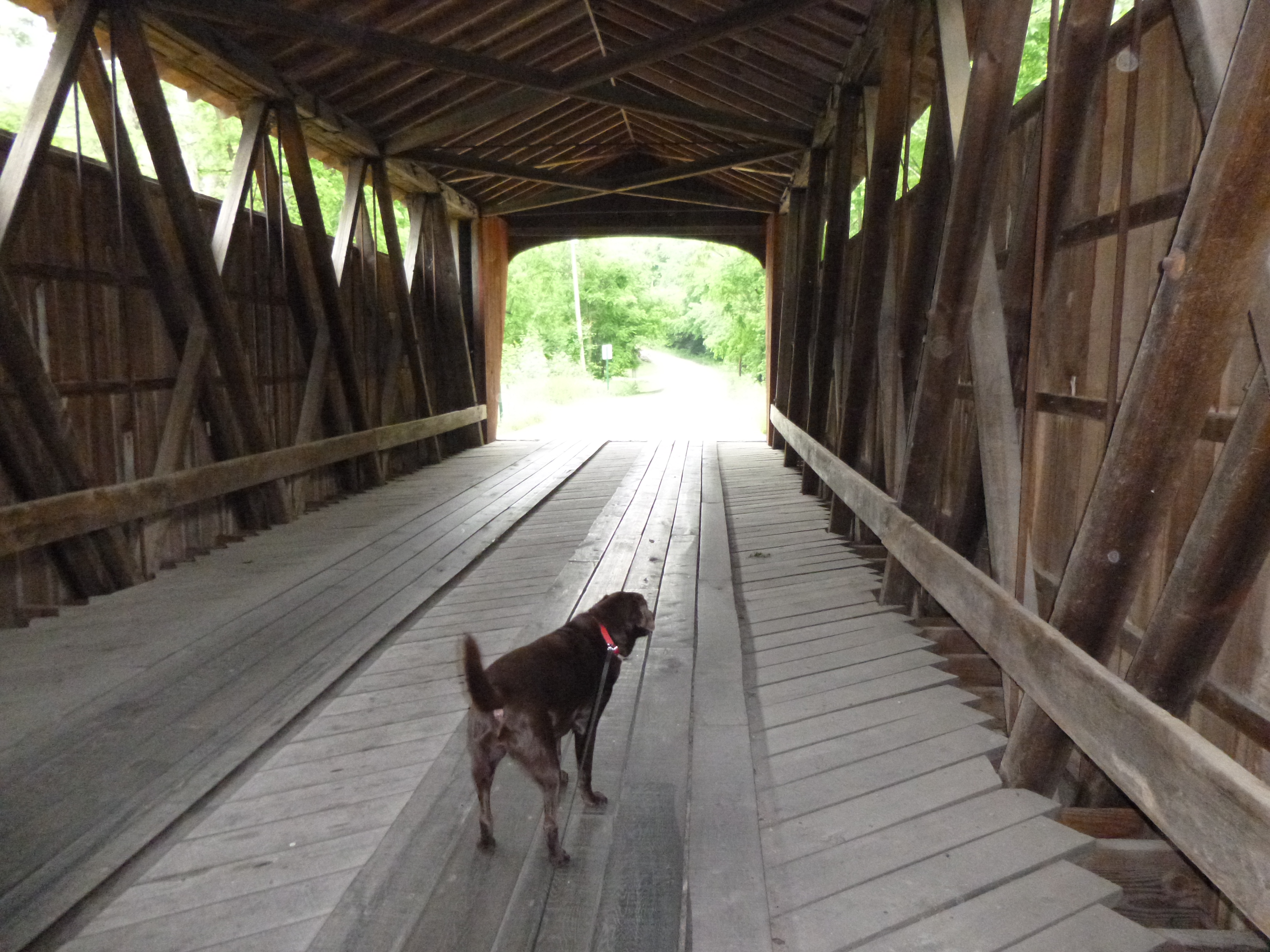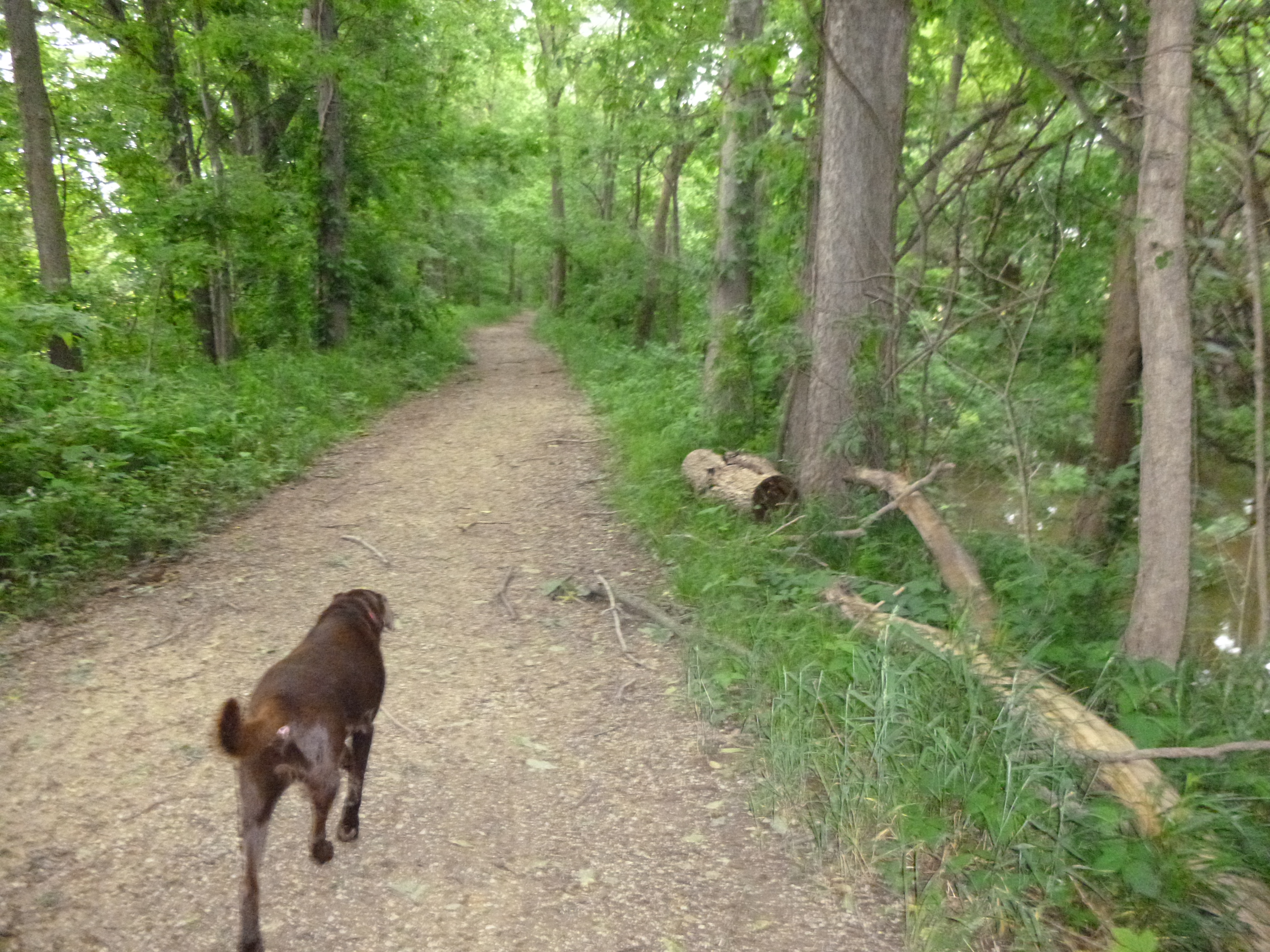 After the boat ride, I went in to see the museum, and enjoyed that. They had a donation box out for the park, and since I’ve enjoyed so many canal walks and towpaths, and really enjoy learning about all of that, I decided the Wabash and Canal Interpretive Center would be a good place for a donation today. The people there were interested in my journey, and a lady even came out of a back office when she heard me talking to say she had read about me in a newspaper. She also told me there was a small campground right behind the building, and that sounded like a tempting place to stay for the night, although I first had a lot of walking to do! So Tula and I set off along several towpaths, and a couple other trails, and she did a good part of the walking with me, but took a break in the middle section. We covered a little over 7 1/2 miles – sometimes it’s nice to have some extra miles stored up! We mostly walked along the canal, but part of the trail was by the river too. And Tula even walked across a suspension bridge, which she typically doesn’t like. This one wasn’t too bouncy, and she was hesitant to cross it the first time, but on the way back to the car it didn’t seem to bother her at all.