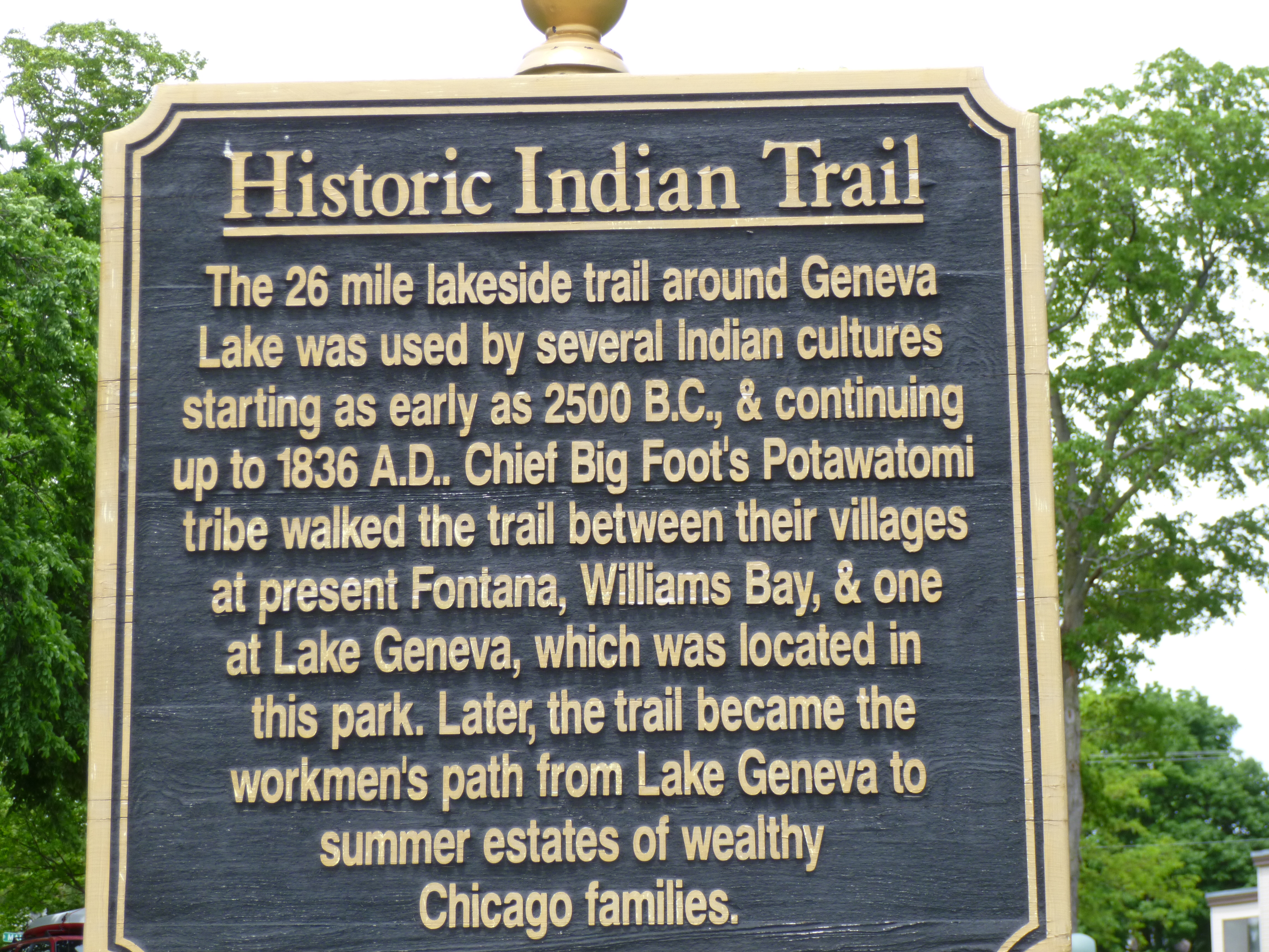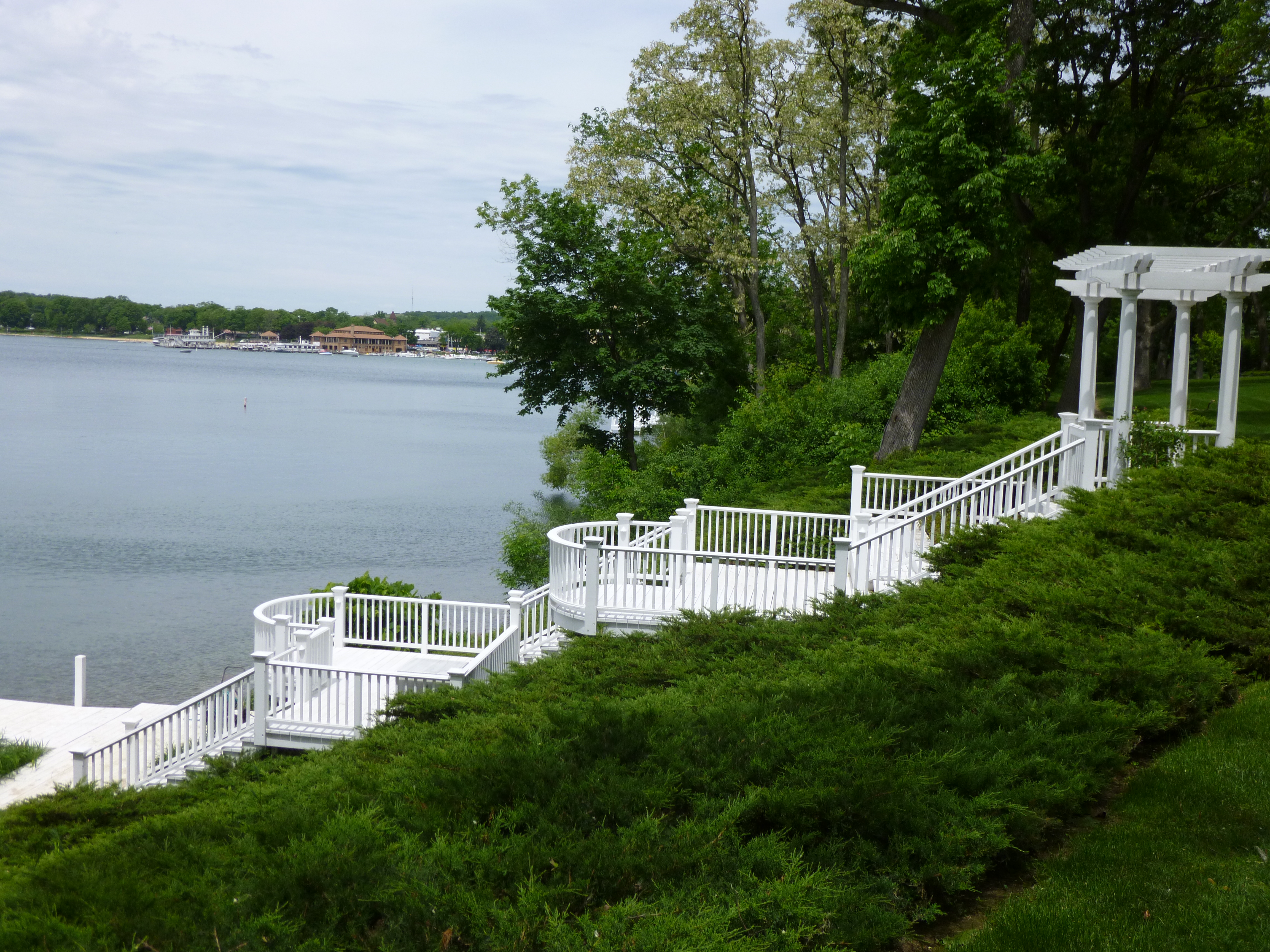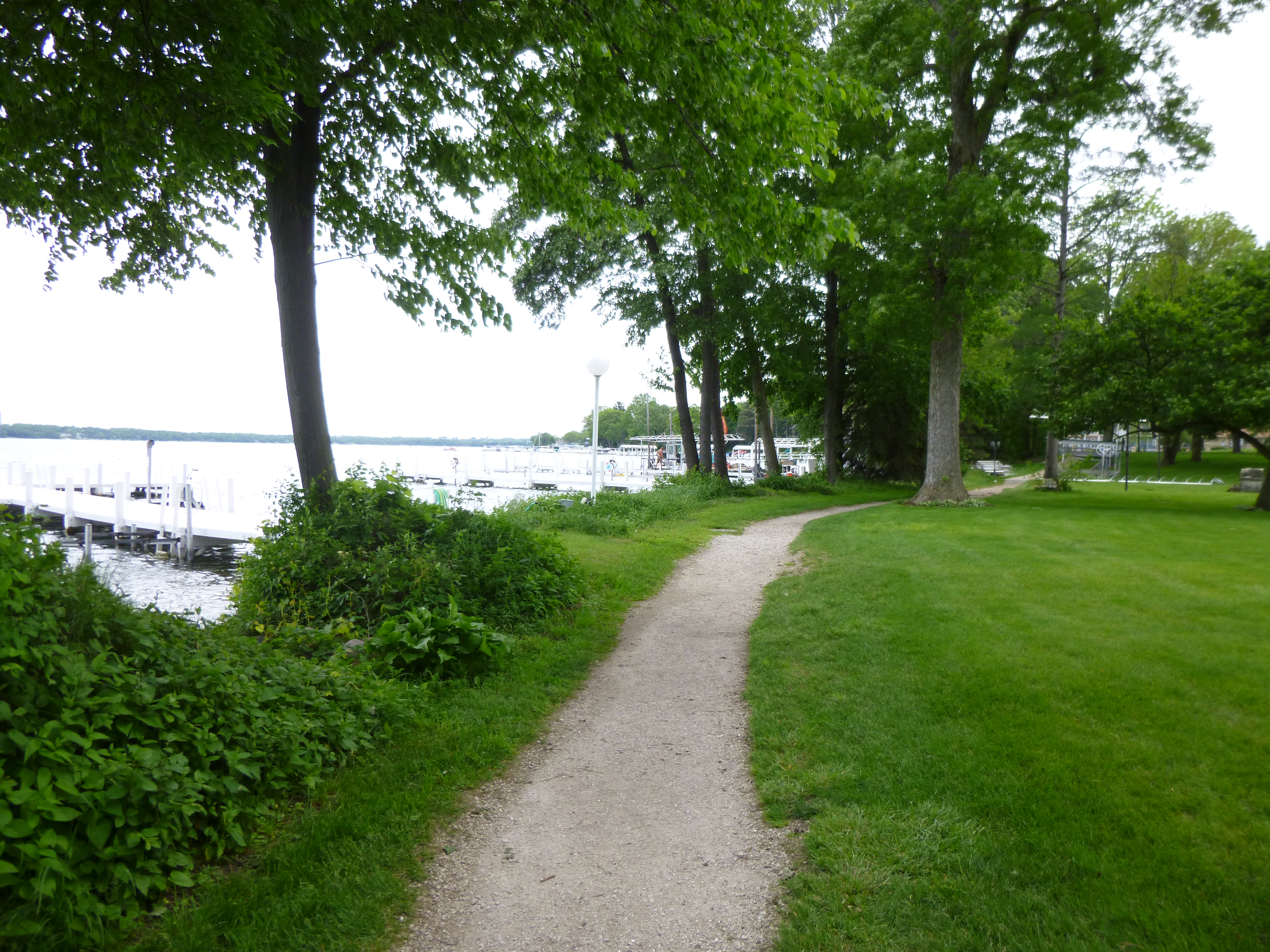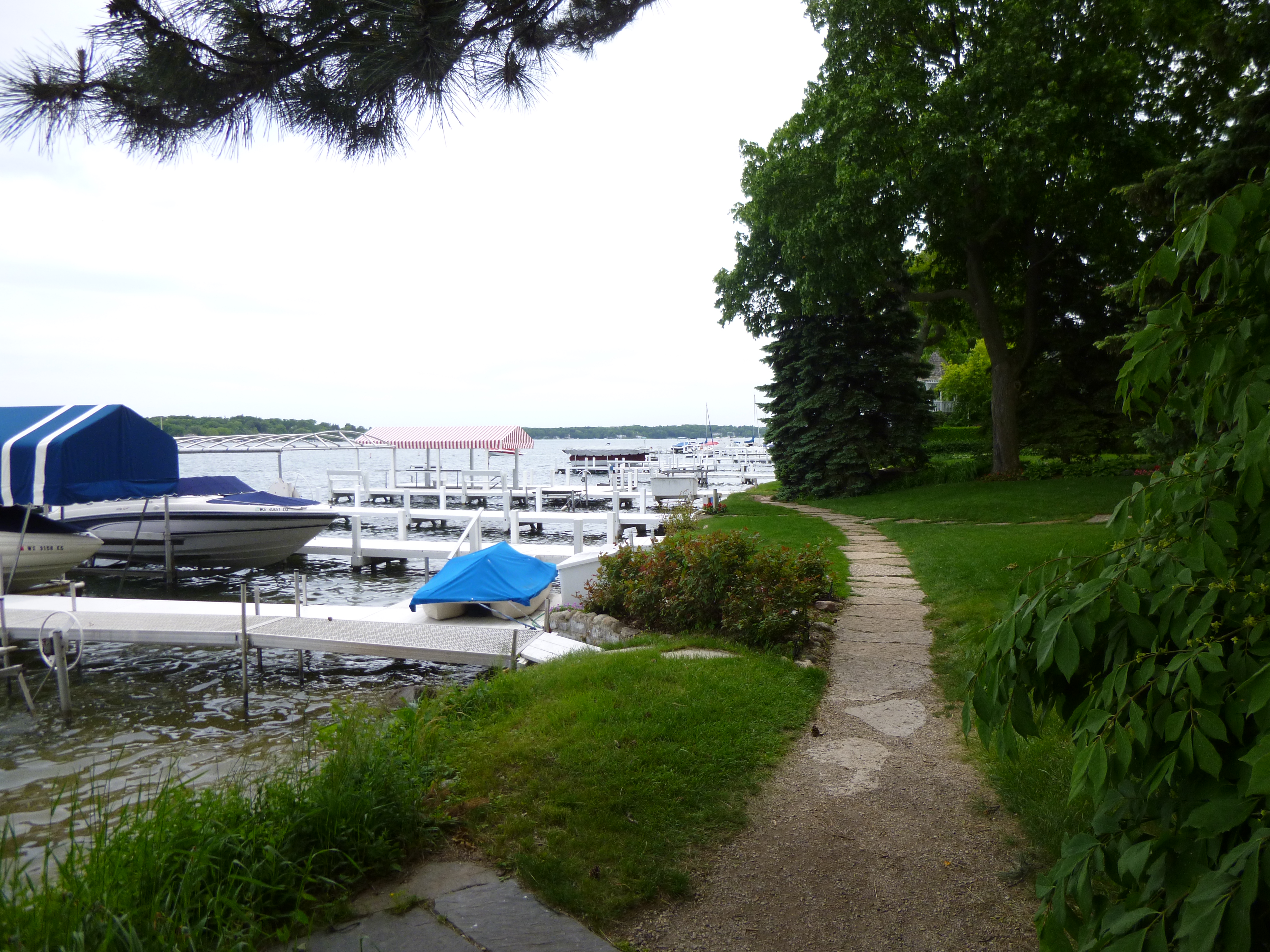 This morning I drove into Wisconsin – State #36! I had already picked out my donation spot for the day, and since I saw a grocery store nearly right away, I stopped and shopped for my donation, but more on that later. After shopping I drove to Lake Geneva – and it was a perfect summer day to enjoy a long walk in a summery lake community! Tula and I found the 26 mile Lakeshore Trail that circles the whole lake. It’s an old historic Indian trail – they used it from about 2500BC til around 1836. Then after the wealthy Chicago people started building summer homes on the lake, the workmen would use the path to get to the estates they were working on. And today it still remains a pedestrian trail around the lake – right through everyone’s backyard. I kind of wondered about that – the people own their homes and yards, and they own their docks and boats, but the trail (typically right down by the water) is open to the public at all times. I felt a bit as if I was trespassing, especially if the families were out in their yard, but other people were out walking, and I’m certainly much quieter than the many school groups I passed! I passed luxurious, elegant mansions set back on large landscaped lawns, and there were lots of flowers and it all smelled so good. The path changes from yard to yard – it could be concrete, asphalt, patio stones, brick, or just dirt. Most people had their docks and boats out, but a few were in the process of having them installed. There are apparently work boats – or platforms – with small cranes on them to help with the installation. And there’s a big public marina where the walk started. Tula and I covered 3 miles of lakefront walking, then I put her back in the car and headed in the other direction to get more than 2 more miles of walking in. This side of the lake still had very nice homes, but they weren’t quite as grand as the ones I had walked by earlier, and the lots were smaller. So I felt more like an intruder because the homes were much closer to the path. It would have been fun to walk all around the lake, but that wasn’t going to happen! At least the path is just a little footpath, and is not open to bikes or anything other than pedestrian traffic. And occasional signs remind people that we’re on private property and to stay on the path, pick up after pets, and don’t pick anything. It was a very scenic walk.