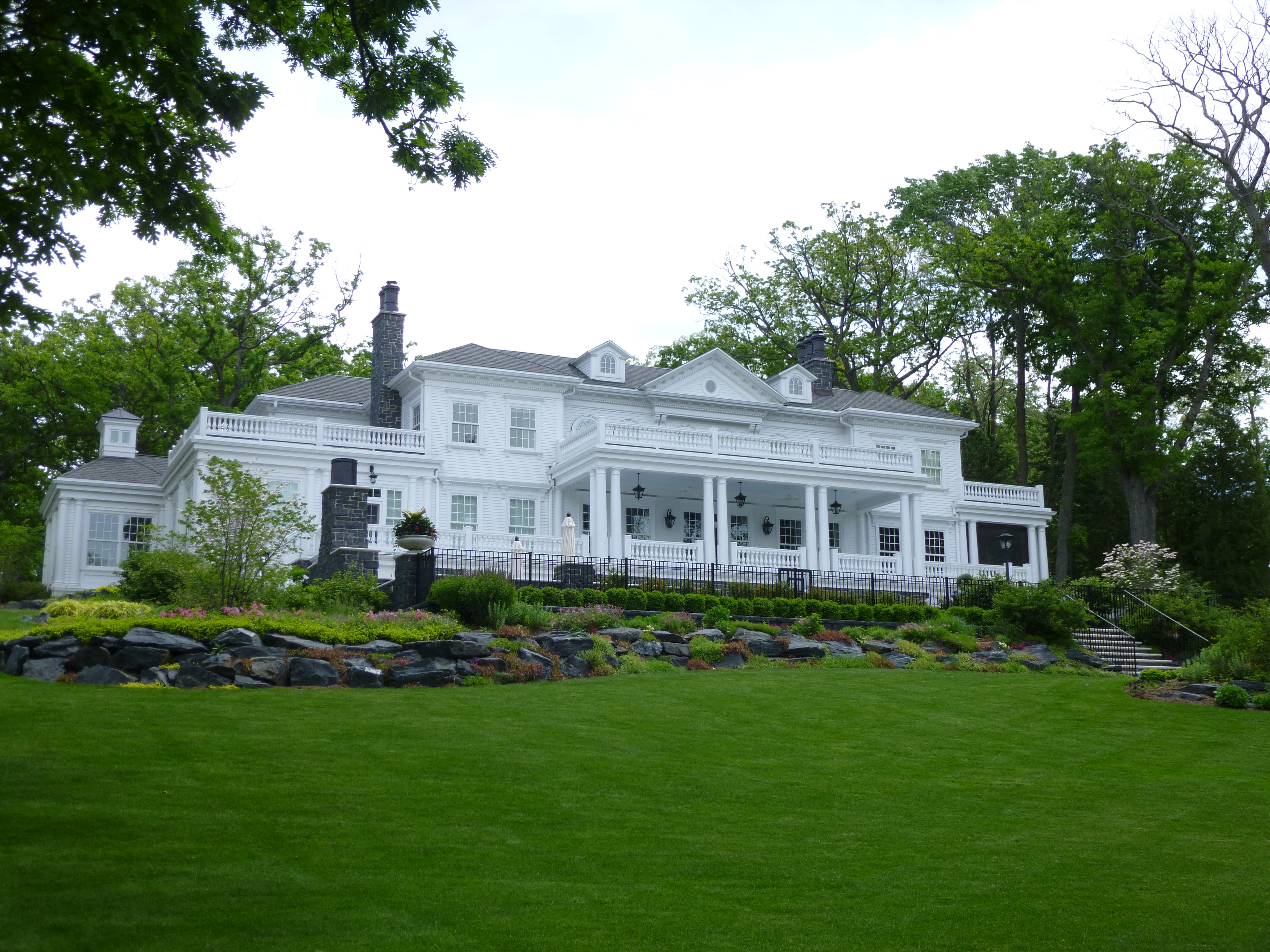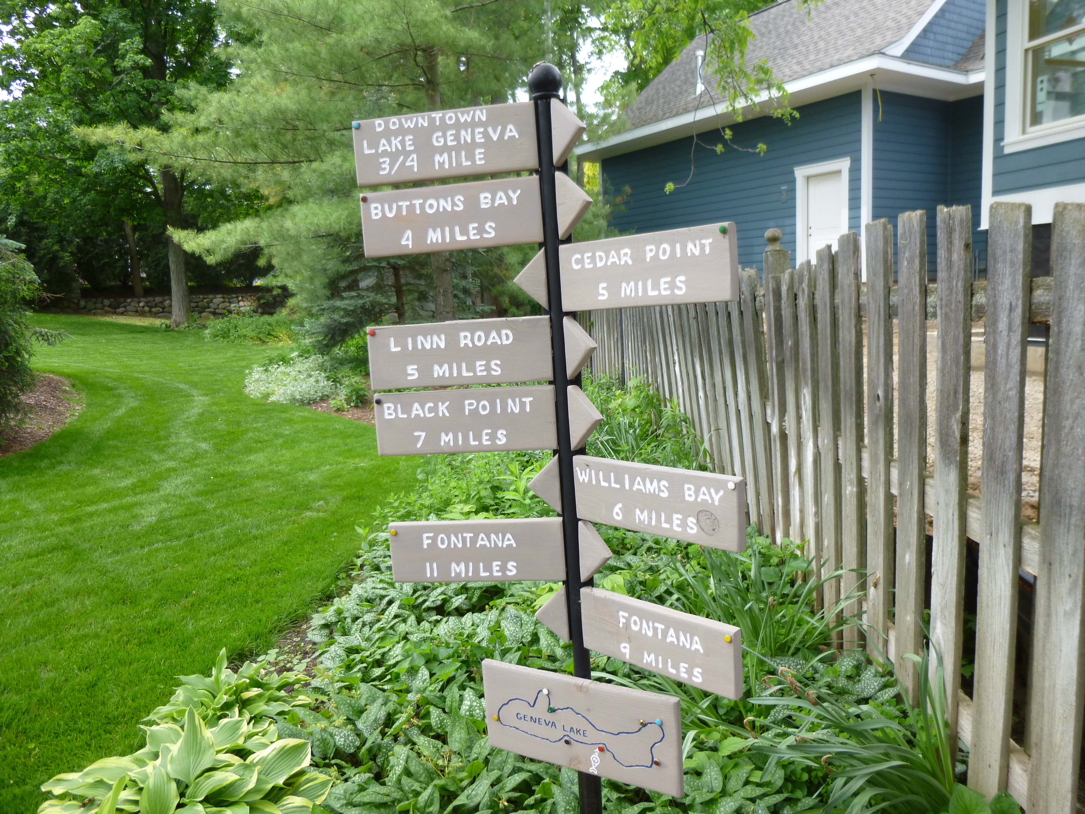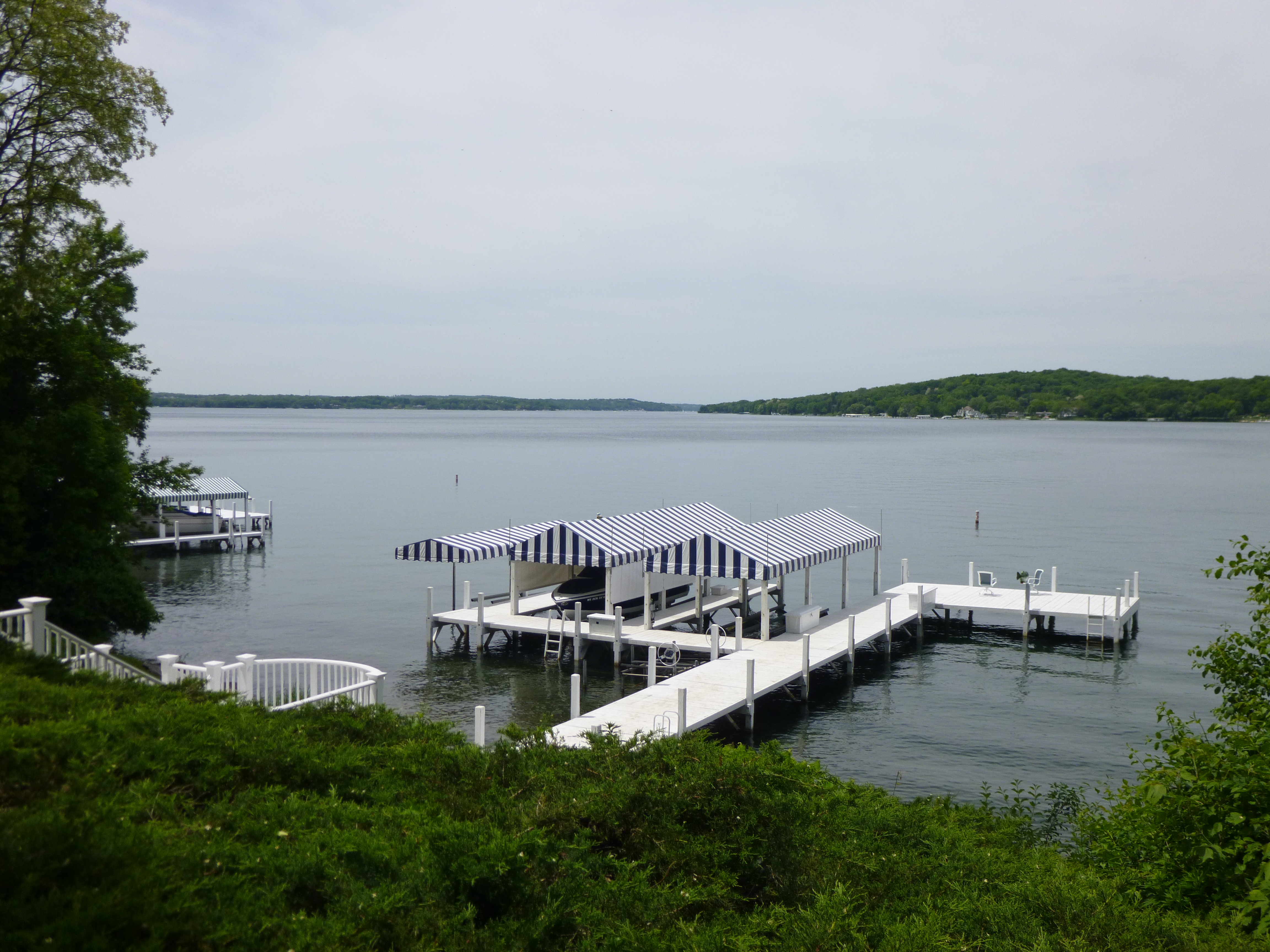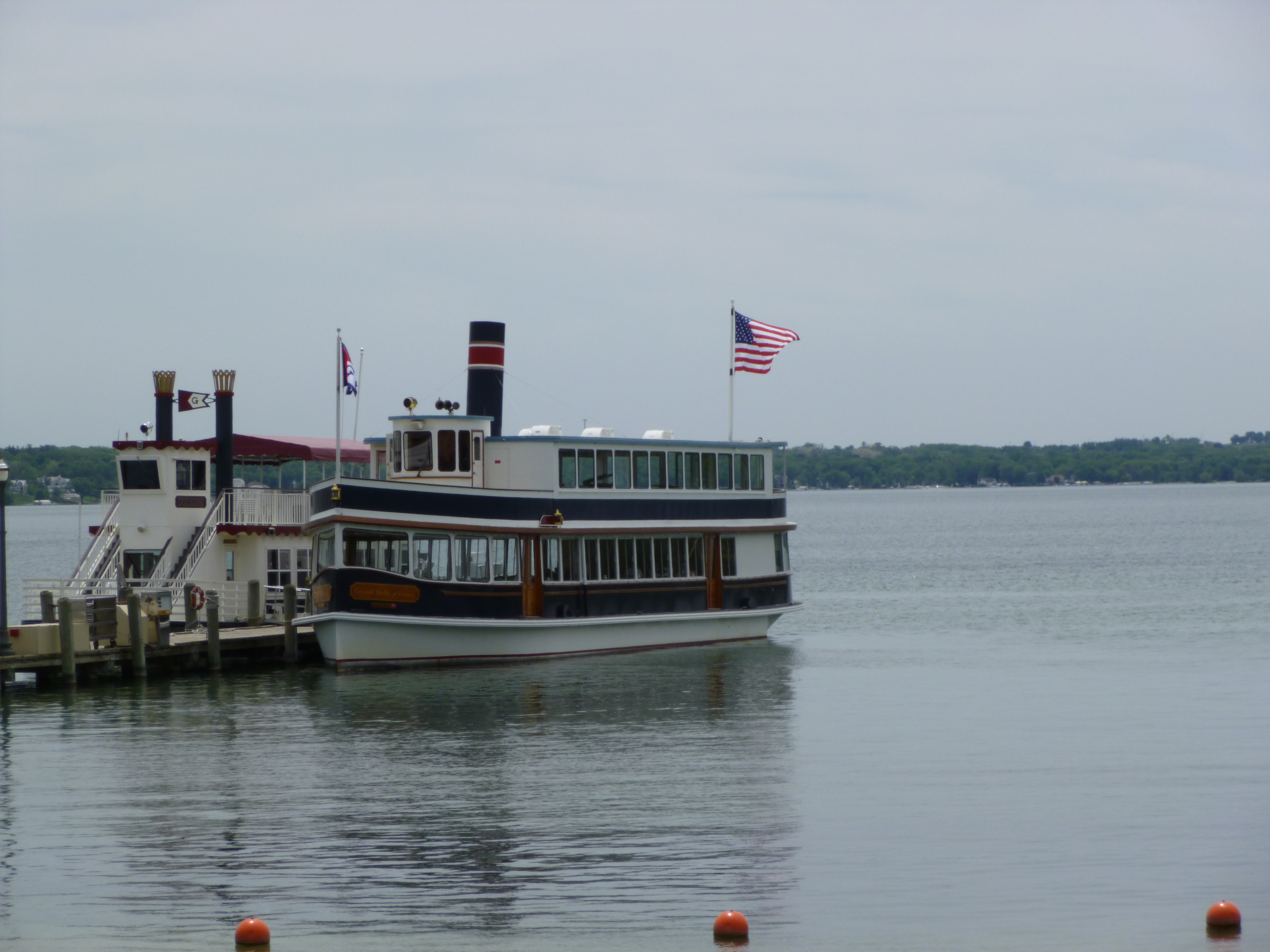 This morning I drove into Wisconsin – State #36! I had already picked out my donation spot for the day, and since I saw a grocery store nearly right away, I stopped and shopped for my donation, but more on that later. After shopping I drove to Lake Geneva – and it was a perfect summer day to enjoy a long walk in a summery lake community! Tula and I found the 26 mile Lakeshore Trail that circles the whole lake. It’s an old historic Indian trail – they used it from about 2500BC til around 1836. Then after the wealthy Chicago people started building summer homes on the lake, the workmen would use the path to get to the estates they were working on. And today it still remains a pedestrian trail around the lake – right through everyone’s backyard. I kind of wondered about that – the people own their homes and yards, and they own their docks and boats, but the trail (typically right down by the water) is open to the public at all times. I felt a bit as if I was trespassing, especially if the families were out in their yard, but other people were out walking, and I’m certainly much quieter than the many school groups I passed! I passed luxurious, elegant mansions set back on large landscaped lawns, and there were lots of flowers and it all smelled so good. The path changes from yard to yard – it could be concrete, asphalt, patio stones, brick, or just dirt. Most people had their docks and boats out, but a few were in the process of having them installed. There are apparently work boats – or platforms – with small cranes on them to help with the installation. And there’s a big public marina where the walk started. Tula and I covered 3 miles of lakefront walking, then I put her back in the car and headed in the other direction to get more than 2 more miles of walking in. This side of the lake still had very nice homes, but they weren’t quite as grand as the ones I had walked by earlier, and the lots were smaller. So I felt more like an intruder because the homes were much closer to the path. It would have been fun to walk all around the lake, but that wasn’t going to happen! At least the path is just a little footpath, and is not open to bikes or anything other than pedestrian traffic. And occasional signs remind people that we’re on private property and to stay on the path, pick up after pets, and don’t pick anything. It was a very scenic walk.