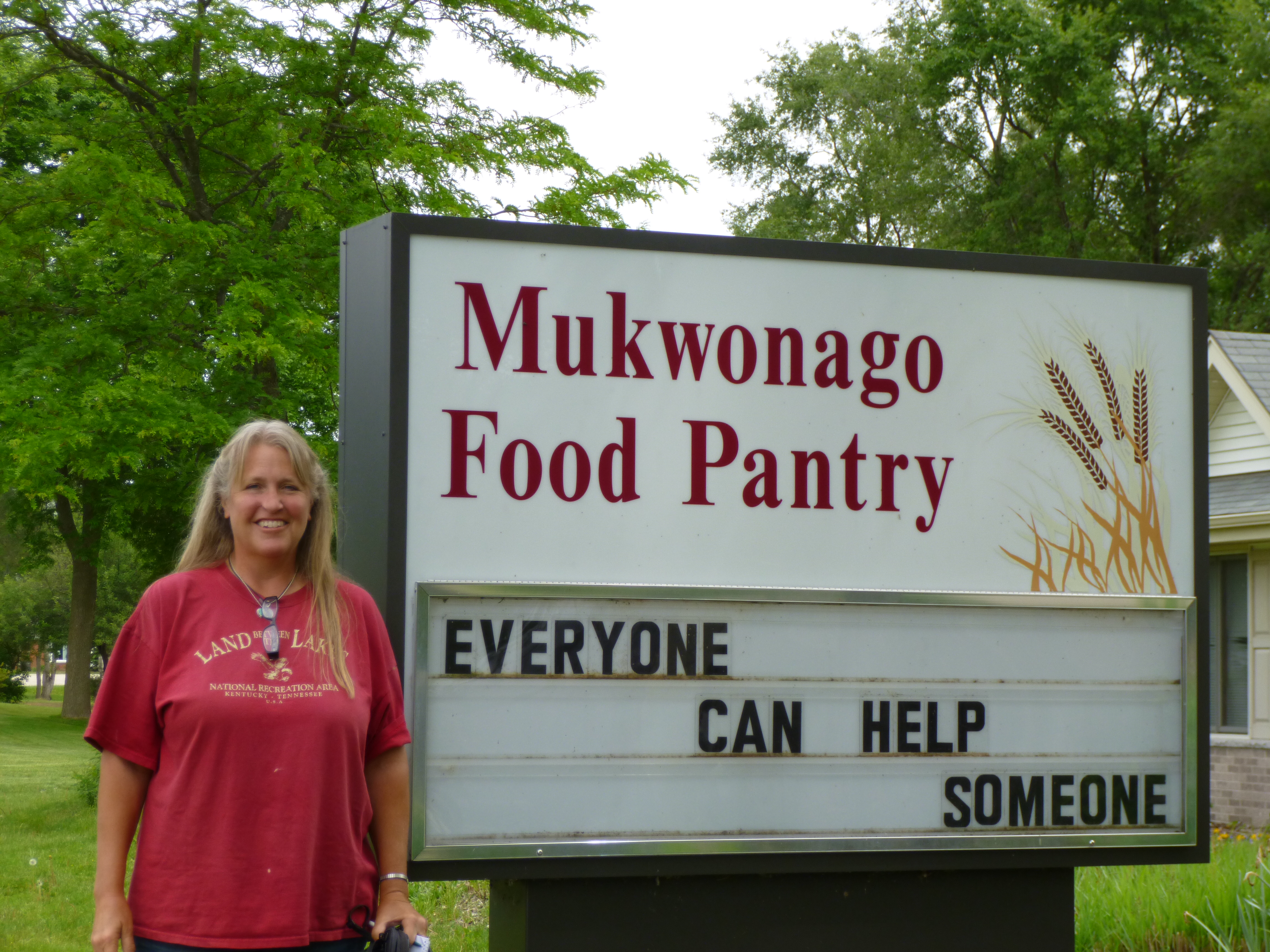 But after a couple hours of walking, I had to leave the lake to get up to the food pantry in Mukwonago that I’d chosen for the day. I liked the name of this place (it has something to do with bears) and it sounded like they had a nice program, so I had shopped for things from their wish list – laundry detergent, dryer sheets, dish soap, cereal and oatmeal, cans of ravioli, jelly and pasta. I found the food pantry, and met Cindy and Pat and we all chatted for a while. They were very interested in my journey and supportive of what I was doing. If ever I needed inspiration to continue on, talking with people like them would spur me on to finish – not that I’ve needed encouragement yet to keep going! This is going too fast and I don’t want it to end! Cindy and Pat told me about the many programs that are run through the Mukwonago Food Pantry program. They have their own building on a pretty lot, and in addition to the food pantry, they also have things like a backpack program for school kids, diabetes classes, a shelter, energy bill assistance, senior chair yoga classes, and vouchers for seniors to use at the farmer’s market. They’re also working on a community garden with raised beds so that seniors can also work in it. There are roughly 14,000 households in the areas that they serve, and about 5,000 come to them for some sort of occasional assistance. All in all, it sounds like a very busy place with a lot of things happening, and I’m happy I found them – it was a good stop!