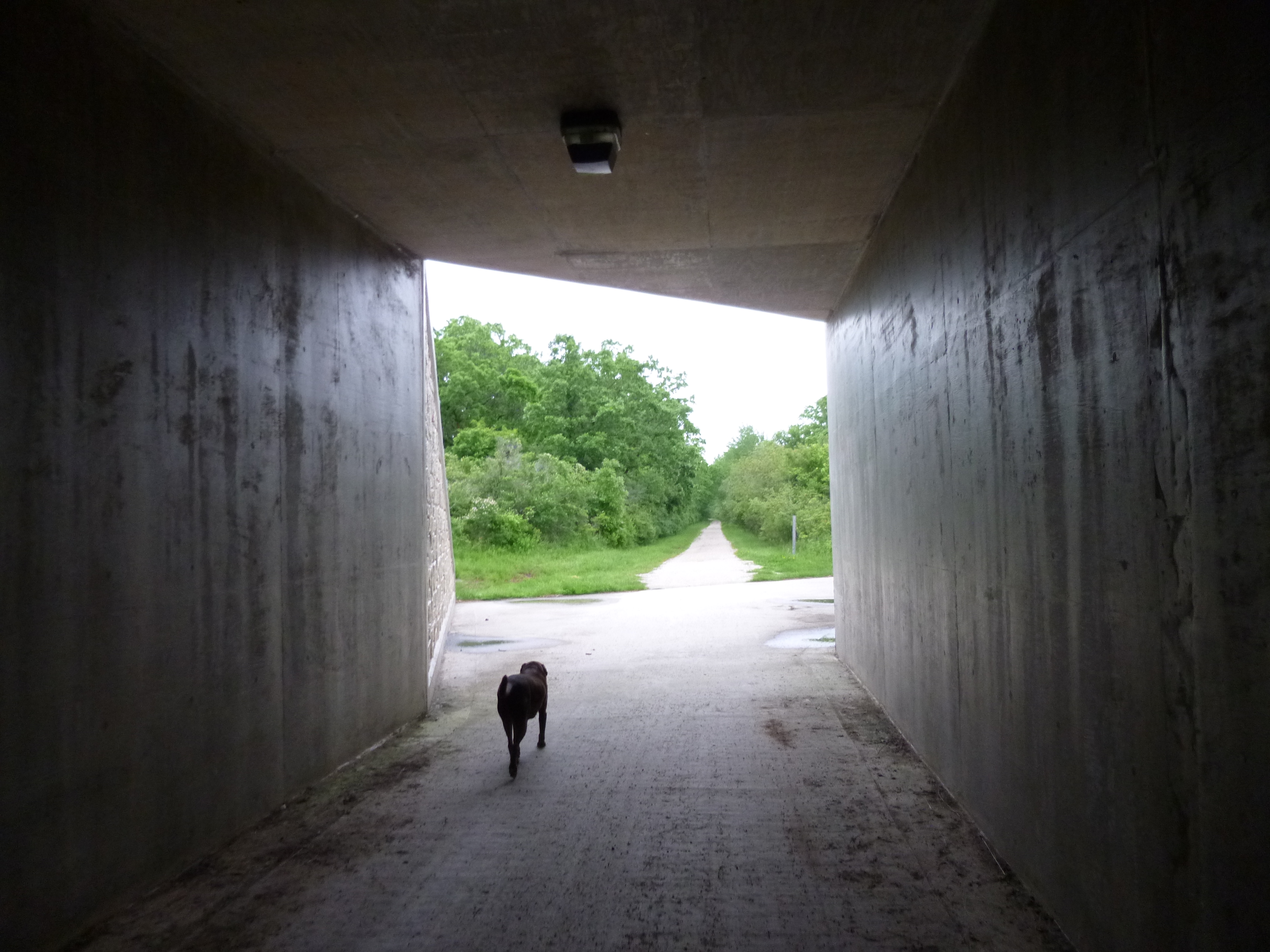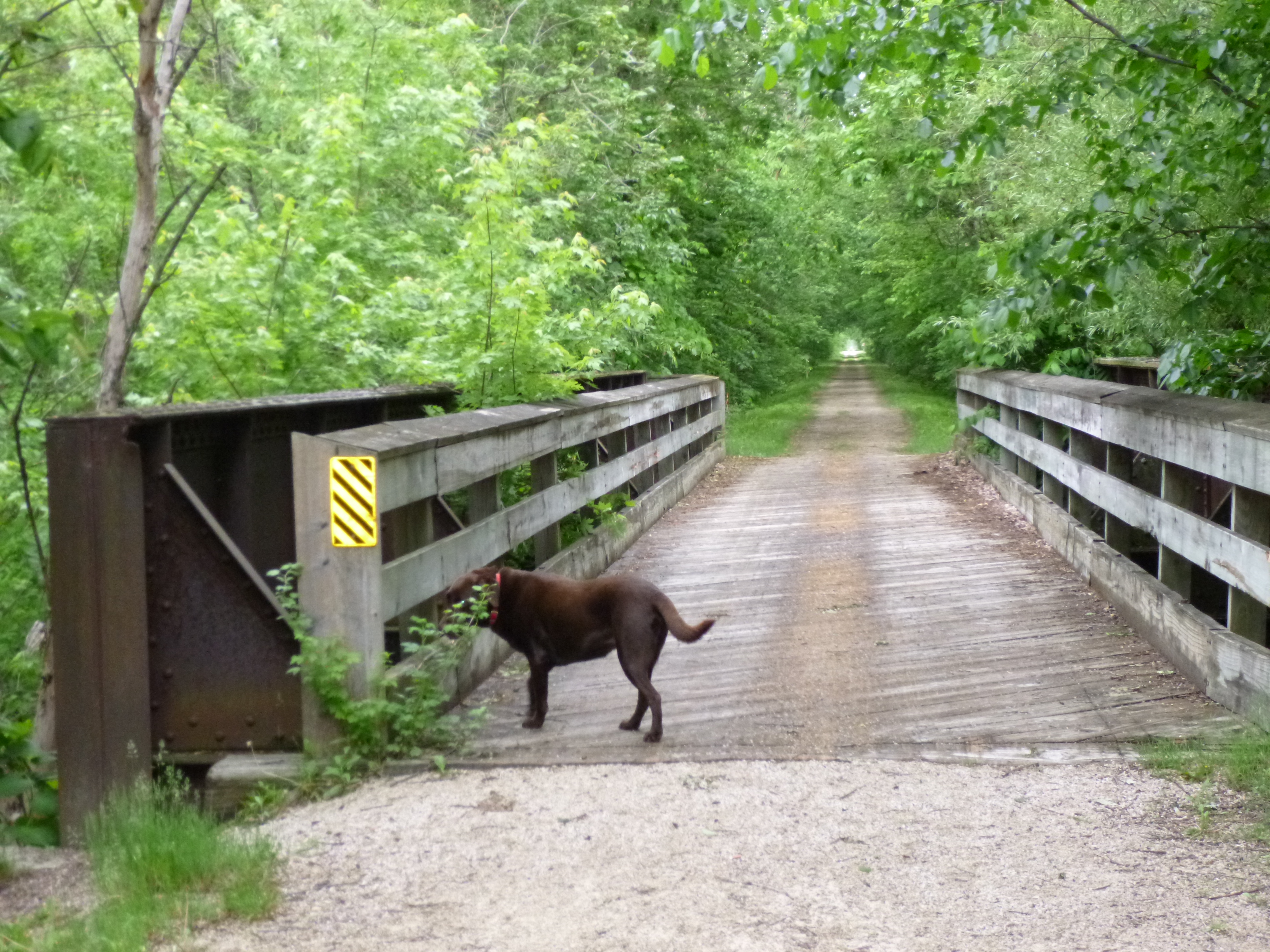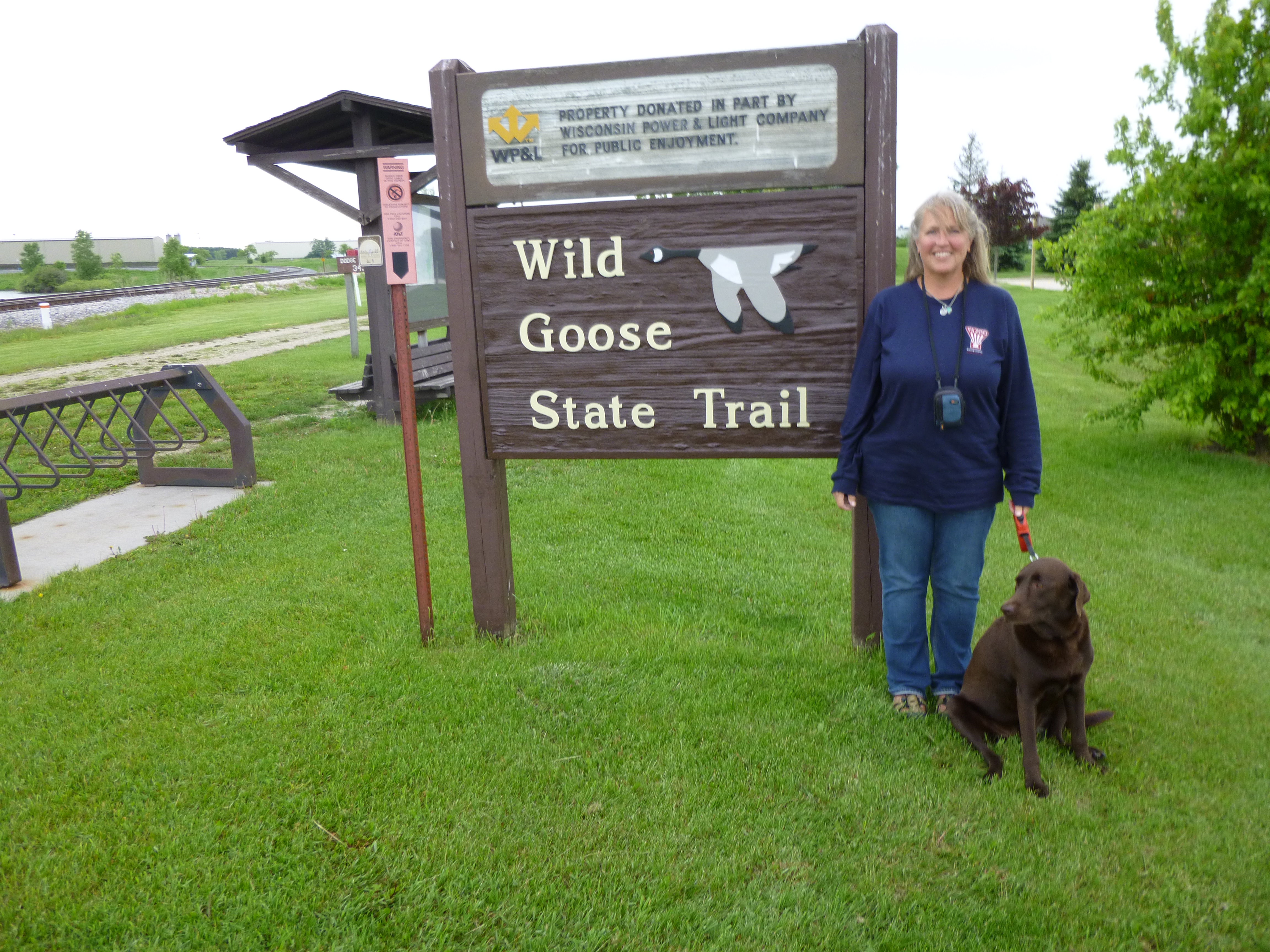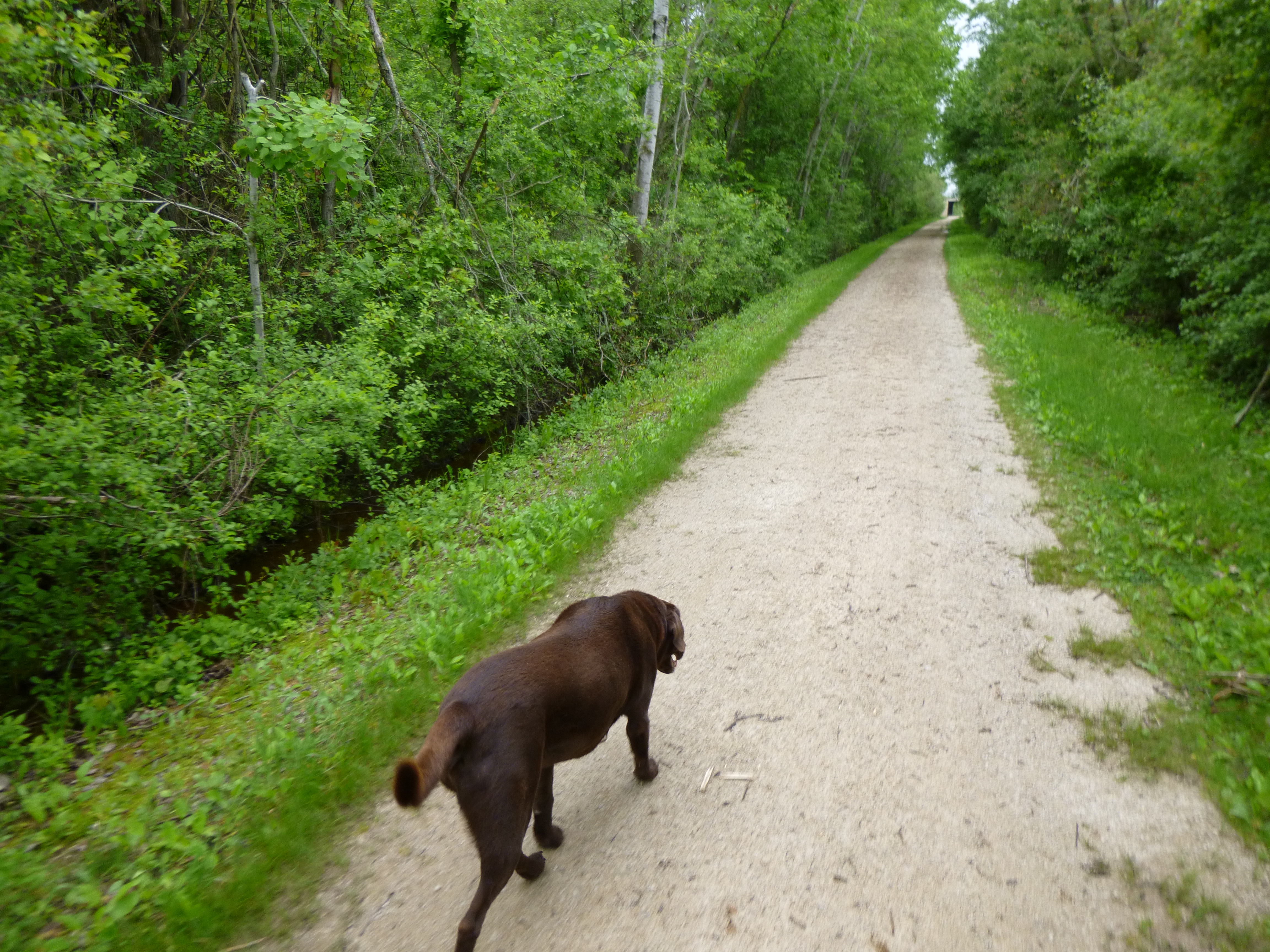 When we finished our tour, we walked for a mile and a half up and down a couple of the old historic streets in Fond du Lac, admiring some of the big old houses. Then we took a break for a bite to eat before heading outside of town to the Wild Goose Trail so I could get some more miles in. My mom walked a couple miles, but I had to go a little farther to get my miles in, so Tula and I walked 3 1/2 miles there – Tula seems to be responding well enough to her meds. It started sprinkling before we got back, but we were sheltered a bit by the trees so we didn’t get too wet.