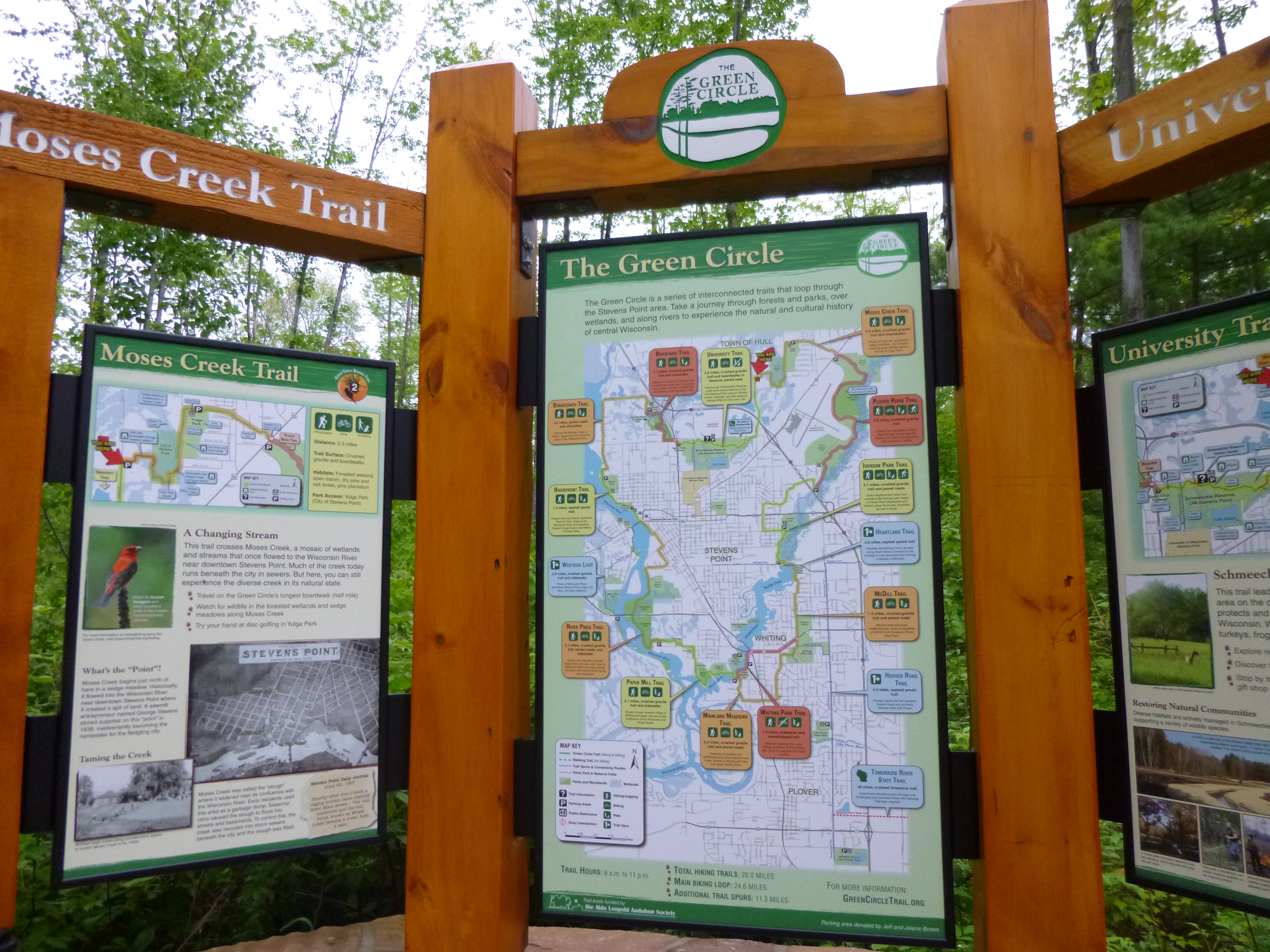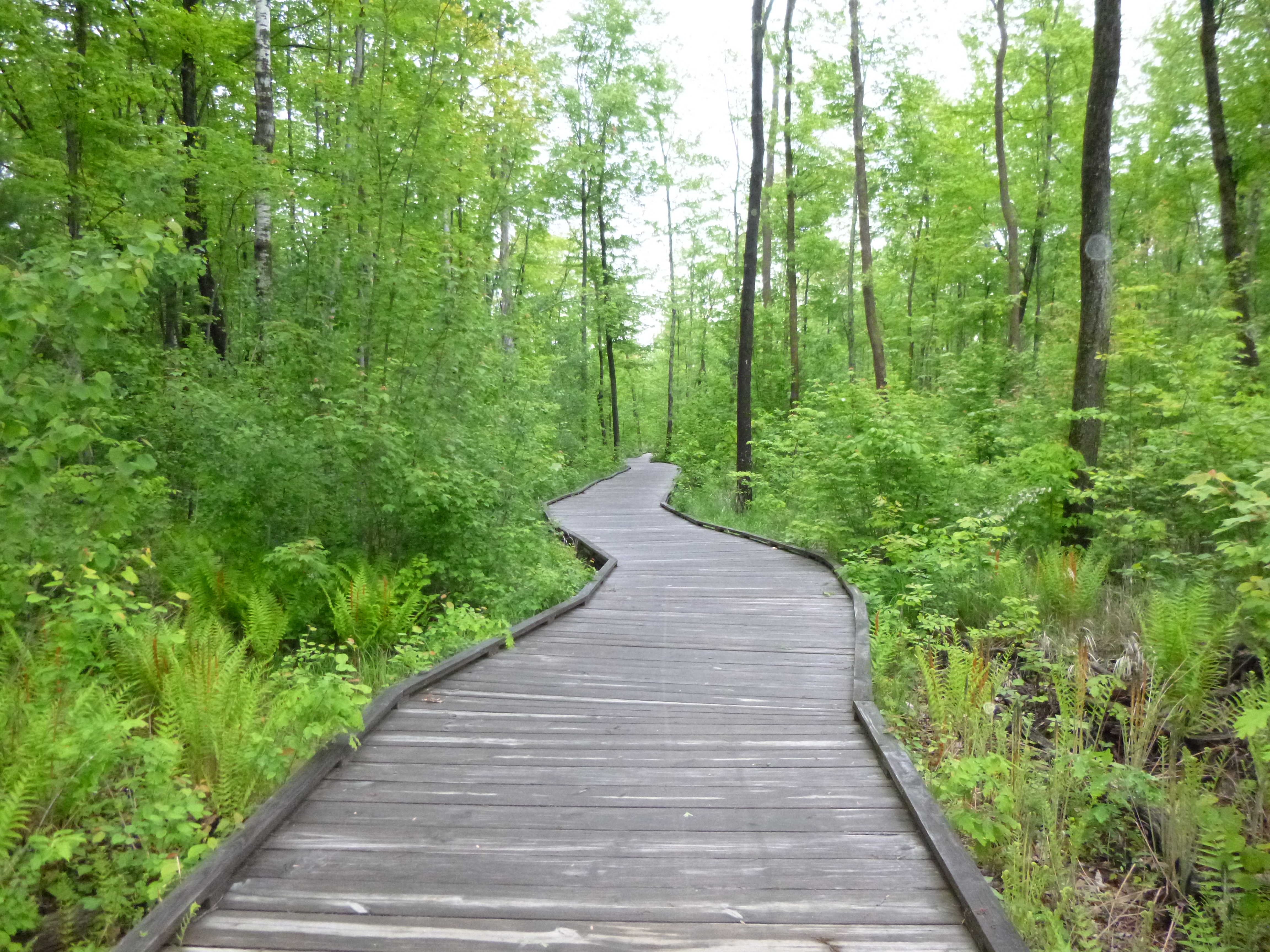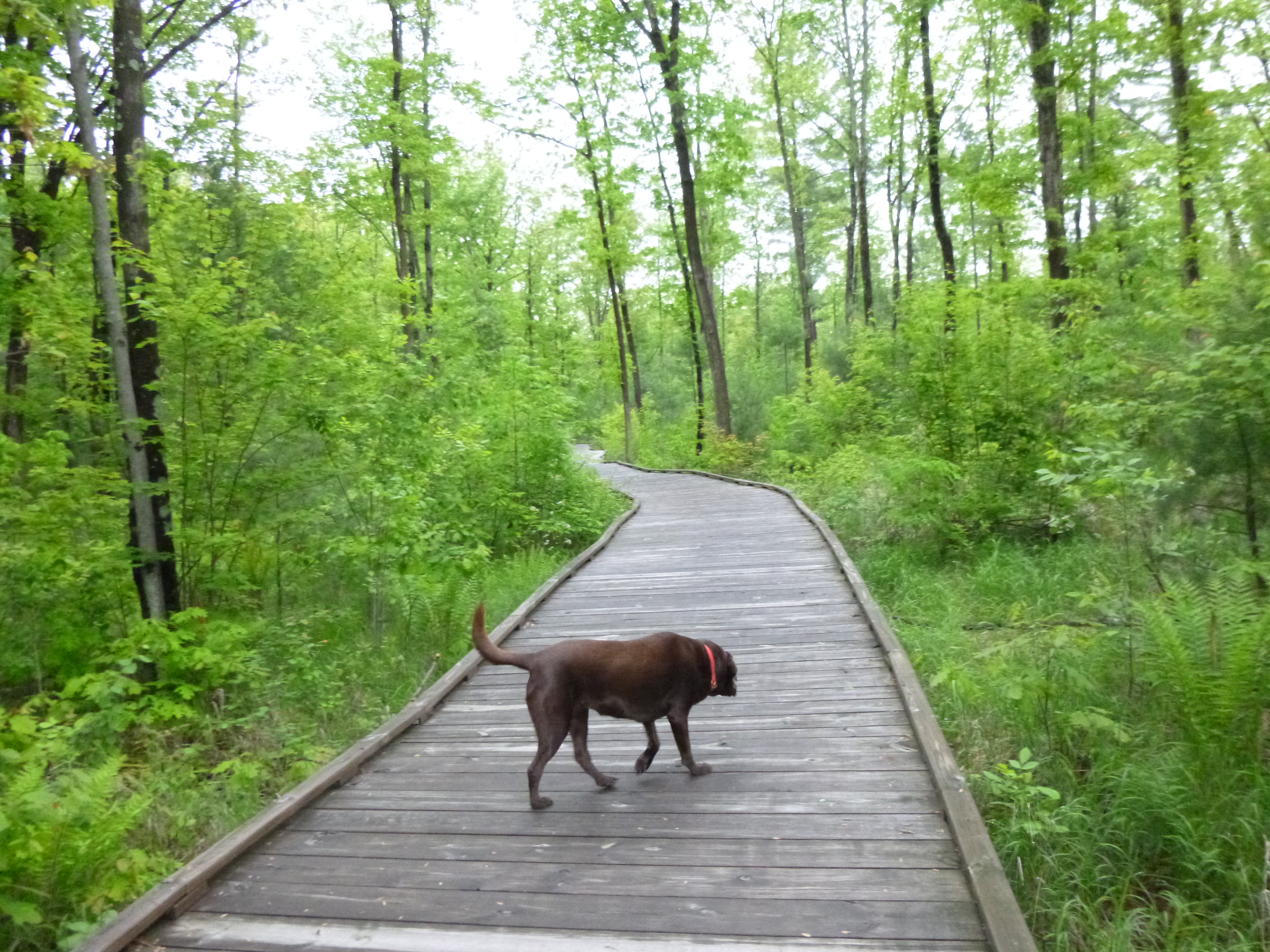From there we went to one of the access points of the Wau-king Bike Trail, which was built to honor the veterans at the King Veterans Home, so that was a fitting place to walk a few miles! I started off with a couple miles on my own, and along the way I did a phone interview with someone down in Mukwonago. Then my mom joined me for another 2 1/2 miles of walking. We had worked up an appetite by then, so we went out for a very late lunch, and then it was time to head north from Waupaca. I drove over to Stevens Point, where I was able to squeeze in for the last oil change appointment of the day – it’s always nice to get those details taken care of. There was another good walking trail there – the Green Circle Trail, and the lady at the oil change shop told me how to find it. I got there and discovered that particular part of the trail was in a wildlife refuge where dogs weren’t allowed, and I wanted to get Tula out so the ranger directed me to another parking lot a couple miles away, and Tula and I went on a beautiful 3+ mile walk through the woods. The first quarter mile or so was a nice boardwalk – they’re always fun to walk on.