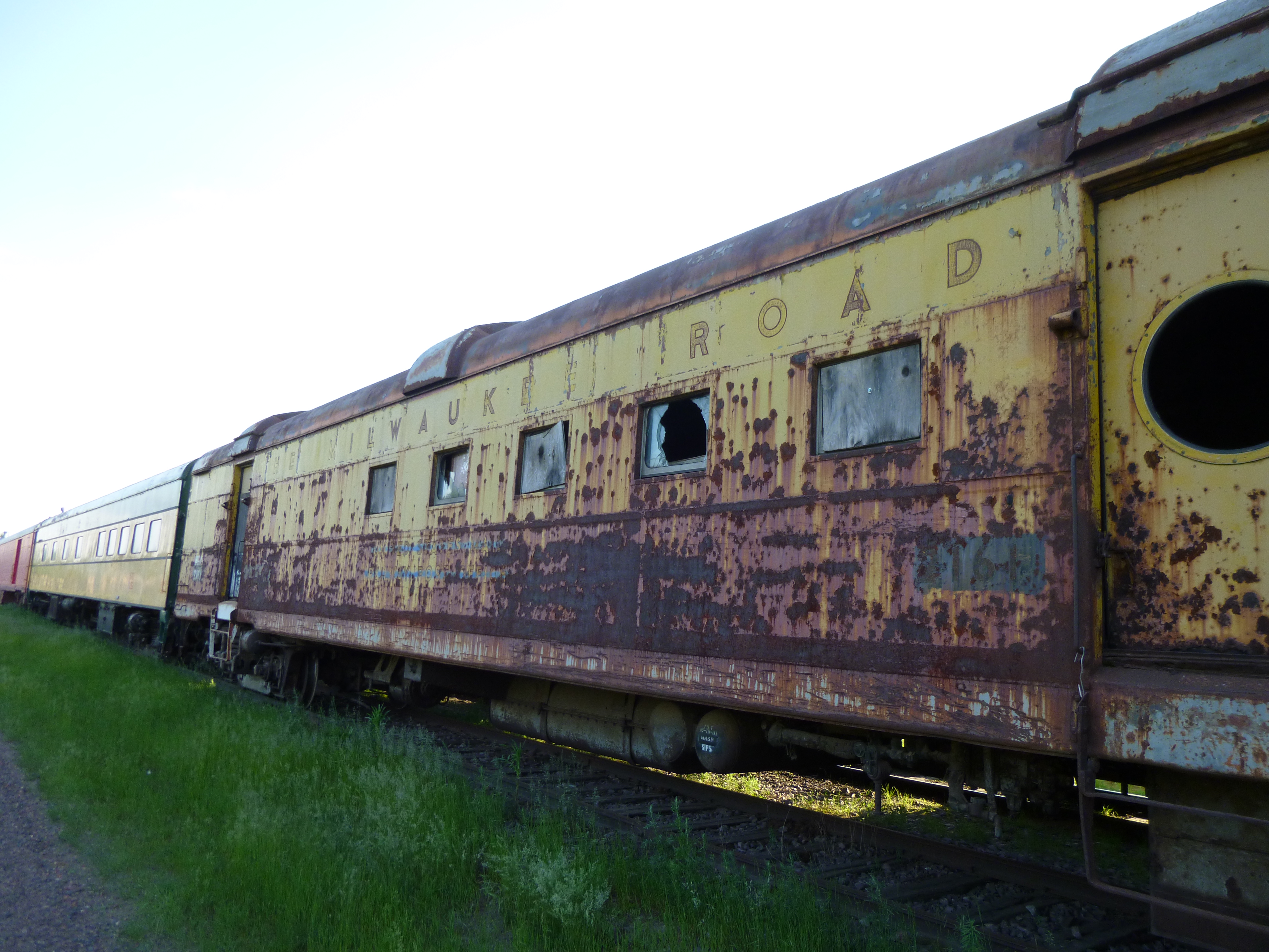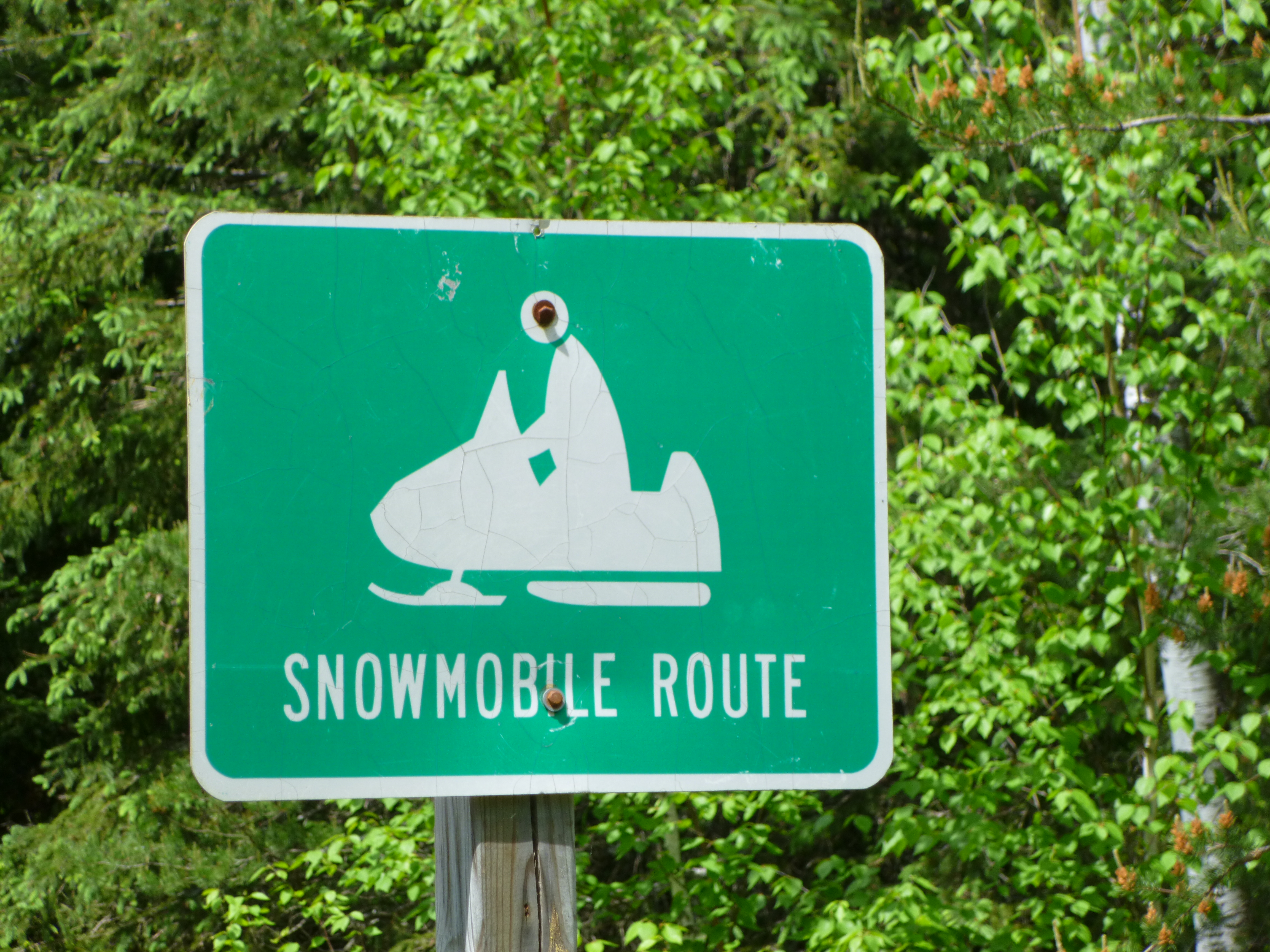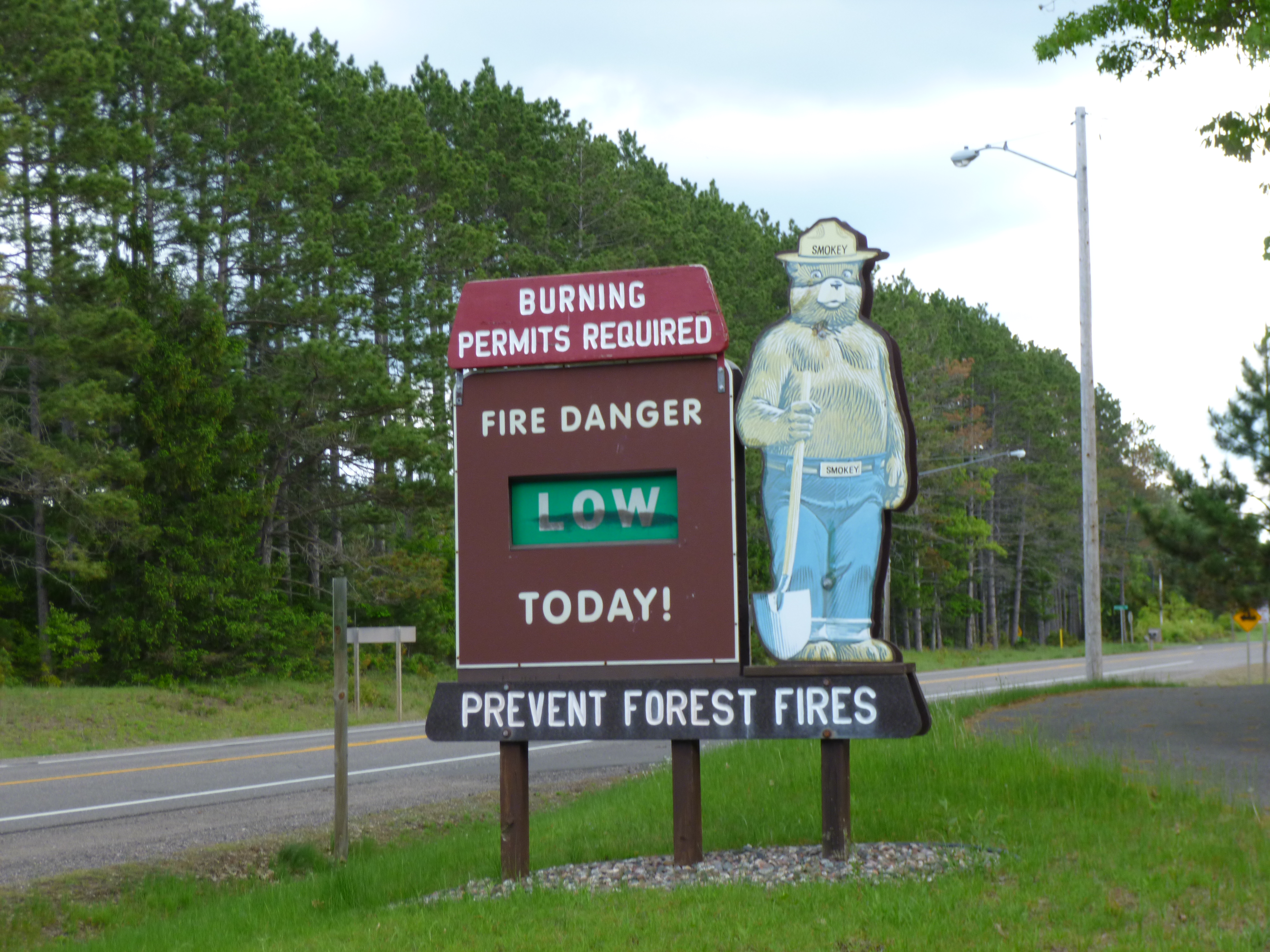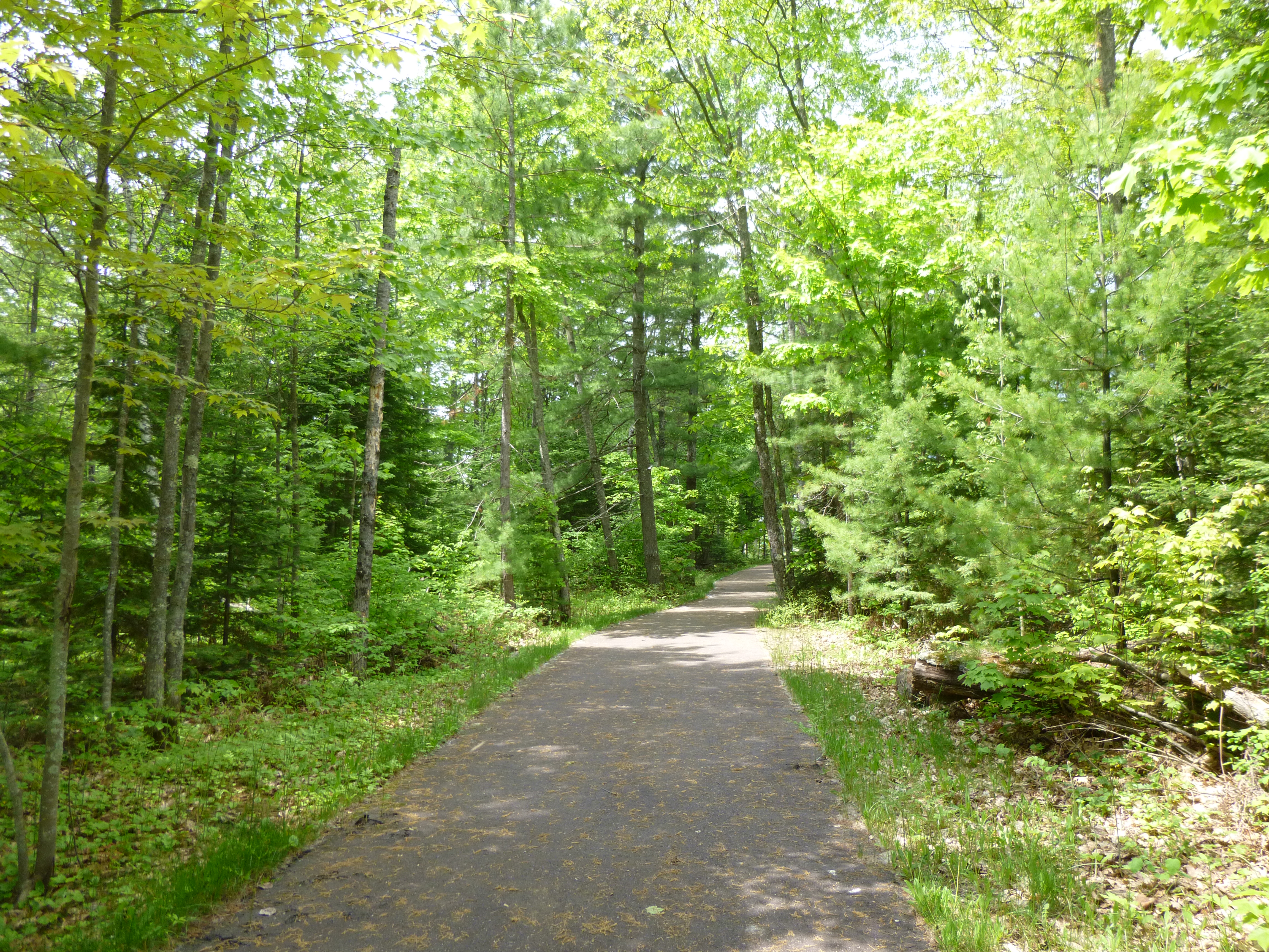 Then I continued on to Spooner. Lots of the towns up here were part of the lumber business, and I passed a paper mill and trucks and train cars full of wood, and piles of cut trees stacked up like toothpicks. I got out for a mile and a half of walking, and got caught up with Tara on the phone – it’s always good to hear the grandkids in the background! There was a big train yard in town (they do short scenic tours out into the countryside) and I walked along all the old cars and engines. That eventually led to the Wild Rivers snowmobile trail, which people use for walking and biking. I went back to get the van and drove it out too the parking lot near the trail, and Tula and I enjoyed a pretty 2 1/2 mile evening walk. She even spotted a deer along the trail and wanted to go make friends, but that didn’t happen! There were a few ATVs out on the trail, which I don’t normally see, but since this was a snowmobile trail, the ATVs are allowed in the summer. There were signs for snowmobile trails all over this part of the state – once on the trails, they have their own directional signs and little stop signs. There’s recreational opportunities all year ’round up here!