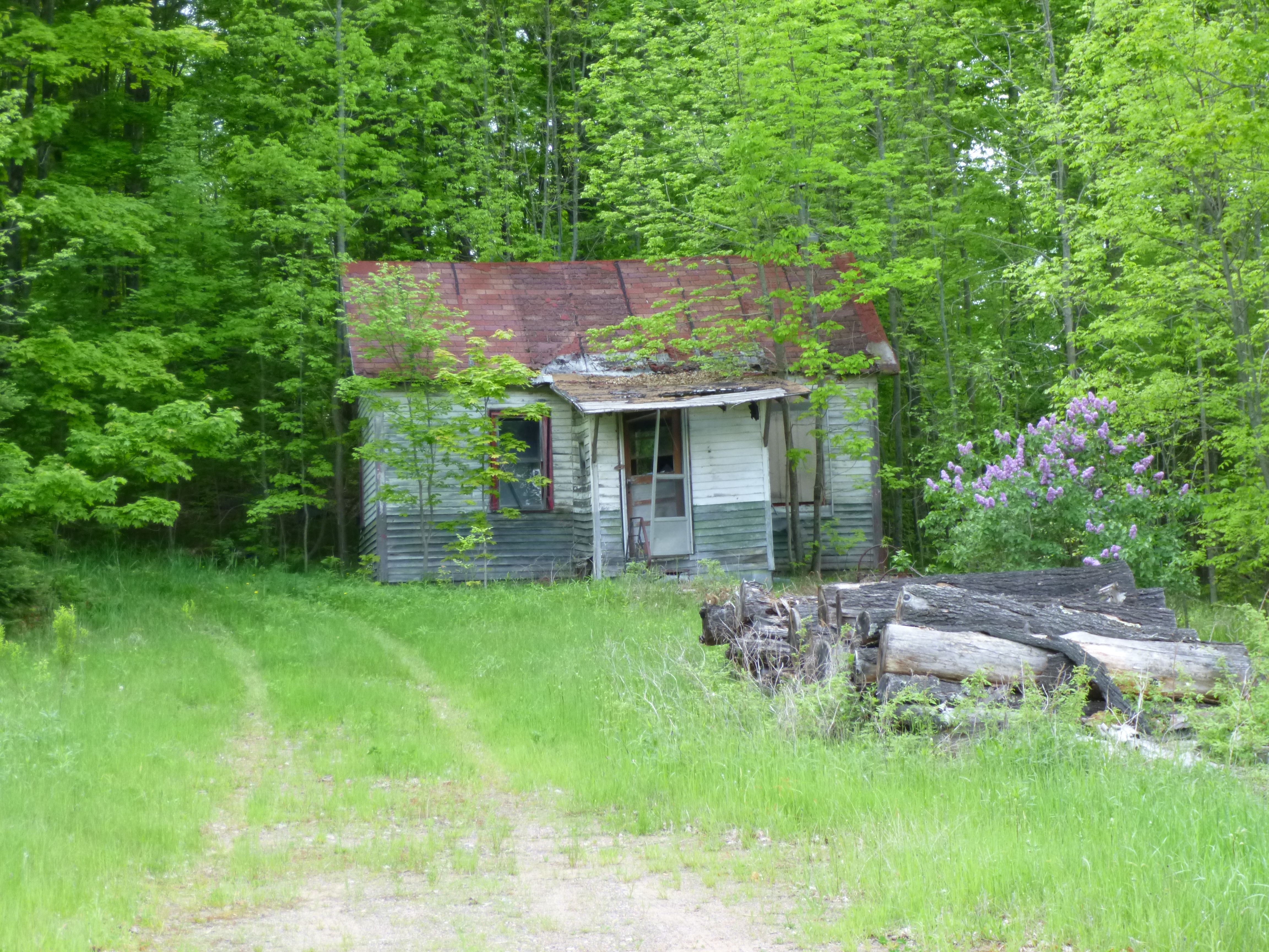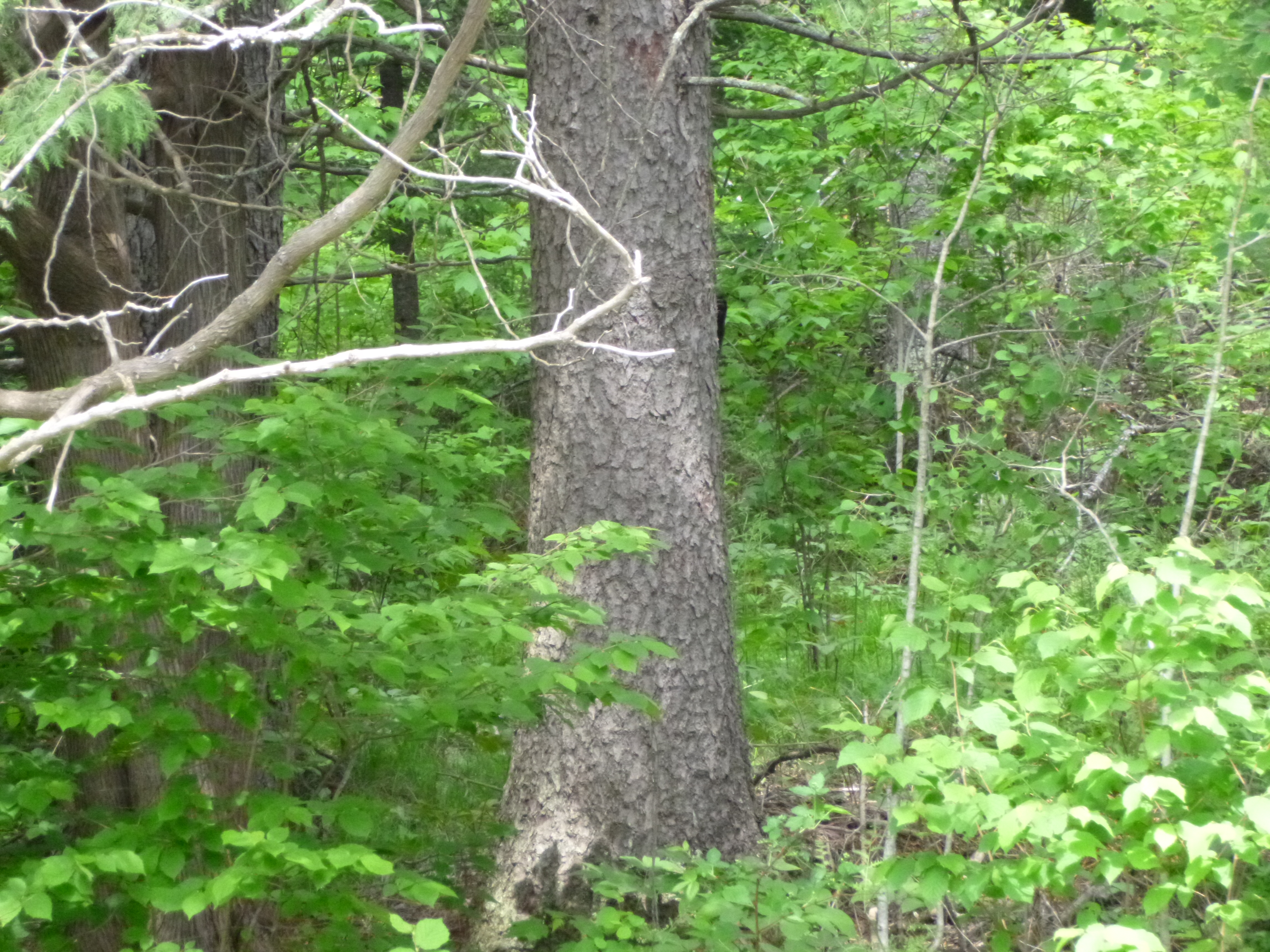 I finally left Minocqua and drove a little farther north to Manitowish Waters, where we did 2 1/2 miles of walking. Then I started heading west across the pretty countryside of northern Wisconsin. I passed a sign that said there was a covered bridge a few miles down a side road, so I turned off the main road and went to see the covered bridge. Apparently I missed yet another turnoff, and as I drove along I ended up seeing a big peacock by someone’s farm yard! I turned around and passed the peacock again, and saw a little sign I had missed directing me down a dirt road. I rounded a bend in the road and saw a big bear out in the middle of the road! As soon as it saw the van, she scurried off into the woods, and I drove up a little farther and put the window down in case I could hear or see anything else. There was a rustle in the tree by the road, and I looked up to see a bear cub looking down at me! I scrambled for my camera, but the cub was quick – it descended the tree down the back side and all I could see were paws on the side of the tree. (The photo I was able to get just shows a black smudge on the side of the tree, but when I zoom in I can see the paw and its claws). The cub landed on the ground, partly hidden by all the brush, and ran off after mama bear. It was fun to see them, and it made up for not seeing a loon yesterday! I abandoned any thoughts of walking there, and I wouldn’t have lasted long anyway – the mosquitoes were vicious and even in the short time I had the window down for a picture, a bunch of them got in the car.