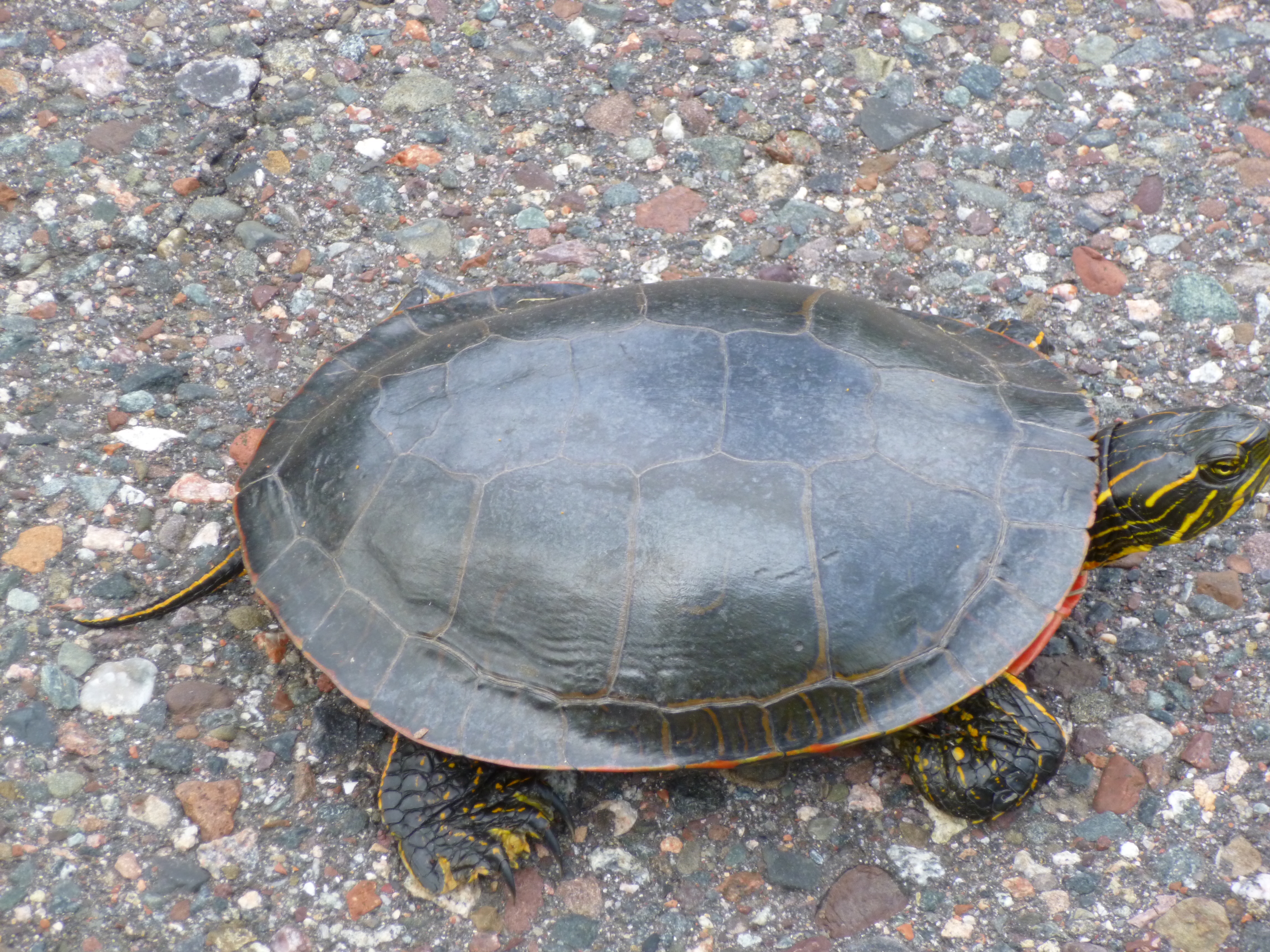 I continued on and saw the covered bridge – and was very happy I took the detour to see it, because it also led me to the peacock and the bears! I got back out on the main road and before I’d gone very far I came across a big turtle making its slow way across the street. I pulled over to make sure it would get all the way across, and the I saw cars in the distance so I picked it up and carried it the rest of the way across.