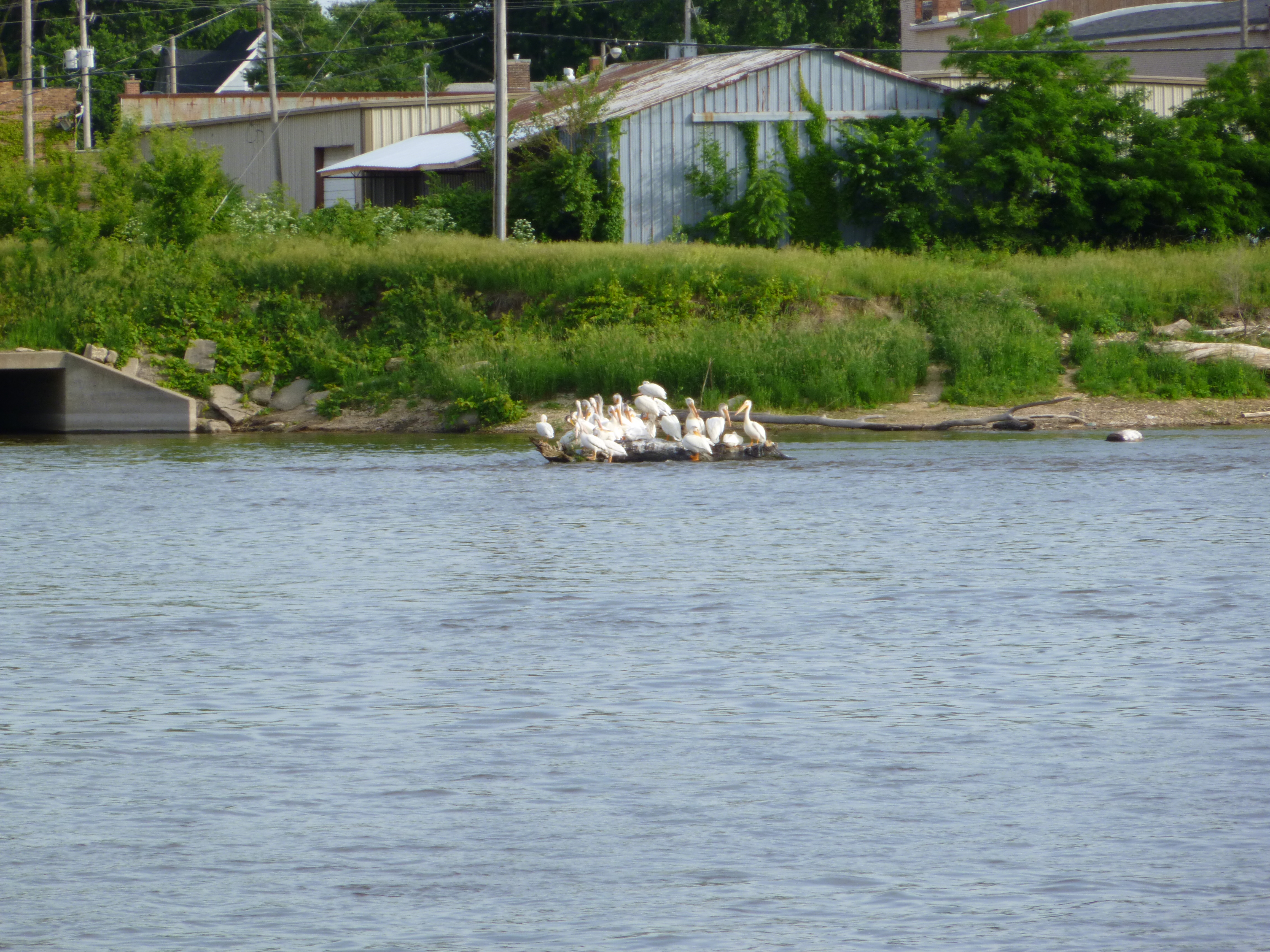 Then we did the short drive to Dixon, which is a very presidential town – Abraham Lincoln, Zachary Taylor and Jefferson Davis were all involved in the Black Hawk War here in their younger days (I had never heard of that war – the conflict involved the pioneers digging up ancient Indian burial grounds for their farmland – yikes), plus this is where Ronald Reagan grew up. So Tula and I did a little walking around town, and we walked past Reagan’s boyhood home. Tula didn’t seem to want to walk much (her energy levels still aren’t back to normal, and I’m not pushing her) and I just wasn’t enjoying this town as much as Oregon. Then I drove across the river, and came upon a pretty riverside path. I was going to leave Tula in the car, but she really seemed to want to come along, and she was full of energy and chasing squirrels for a couple miles – I can’t quite figure it out! I did one other short walk in the opposite direction along the river, and watched a couple kids pull in a big carp – lots of people were out fishing. And pelicans were fishing in the river too – i passed one big rock in the rover that had about 20 pelocans huddled on it. Altogether I did over 9 1/2 miles, so I have a little extra for a day when I might need it.
