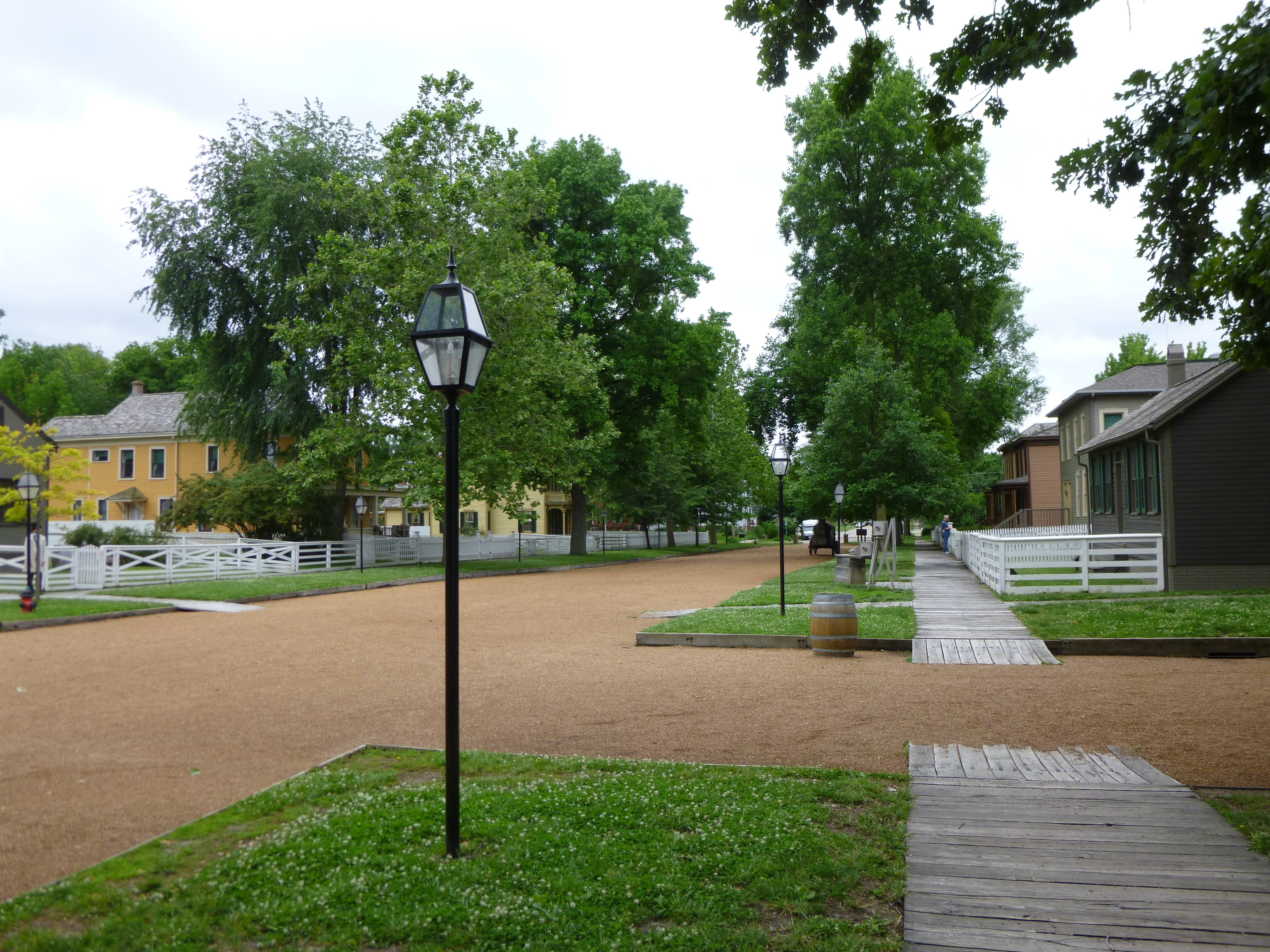 Since it seemed like it was a day for Lincoln (which is kind of hard to avoid in Illinois!) I decided to head up to New Salem, where Lincoln lived and worked for a while in his younger years. I think he had a half-interest in a general store, and he also tried his hand at guiding a flatboat down the river, but it became stuck. Unlike the genteel brick and wood homes in Springfield, the New Salem site was full of log cabins and a more primitive lifestyle. Tula and I walked through the whole New Salem site. The barrel shop smelled so good, and there were wood shavings all over the floor. There was also someone making some legs for a piece of furniture, and a shelf of dyes for coloring different fibers. The general stores were “stocked” and it was fun to take a look inside the cabins. These buildings were in the woods, and the mosquitoes were kind of bad – I’m not often bothered by them, but they were getting to be a bother today, and one of the volunteers told me they’re just going to bad all summer because of all the extra water.
