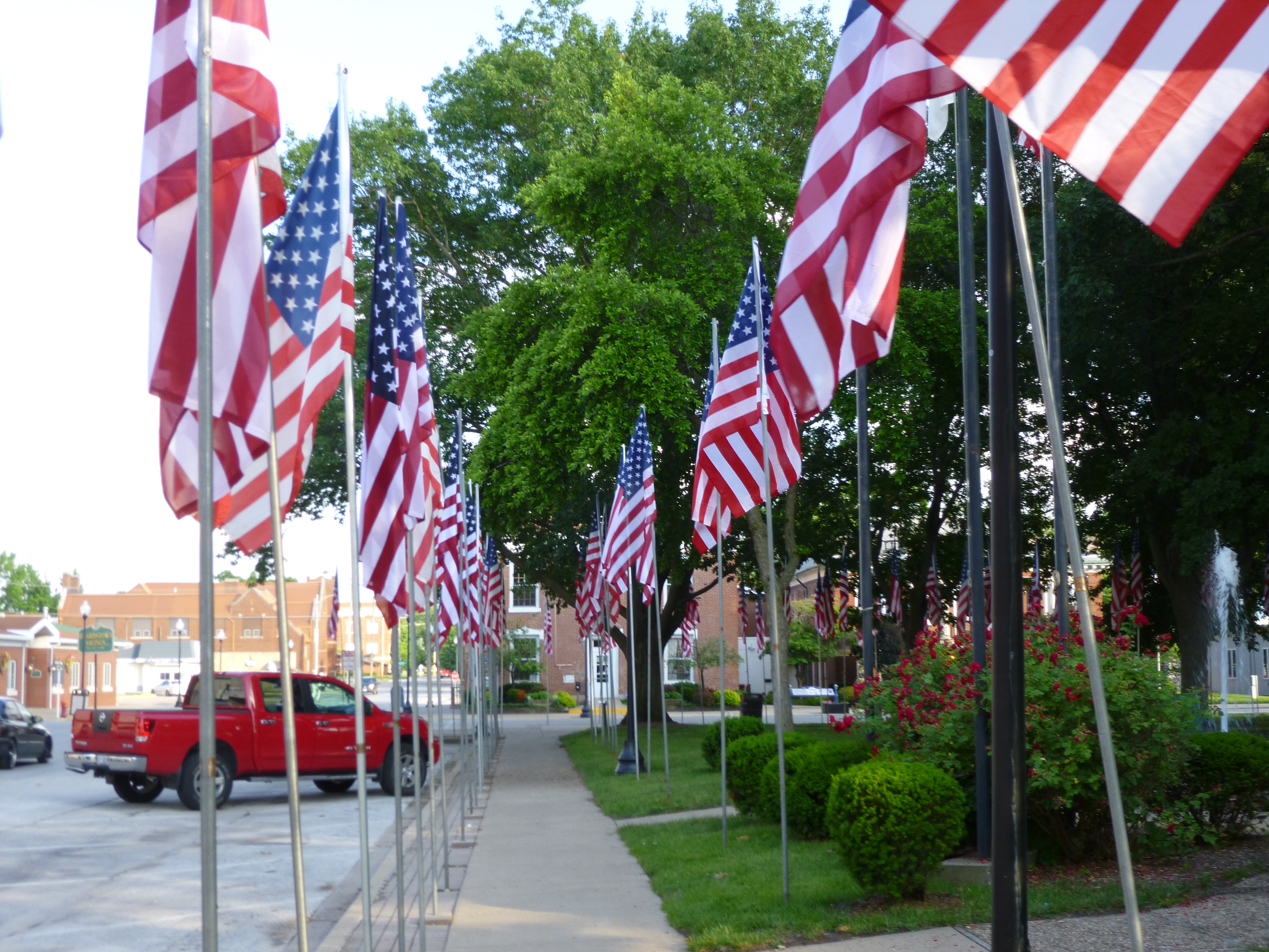 From New Salem I began to head west across Illinois. I stopped in Beardstown, which was on the Illinois River, and did another mile and a half of walking. Their town square was lined with hundreds of American flags, and Tula and I walked from there out into some neighborhoods and then down by the river, although there was just a short riverwalk along the top of the floodwall.
