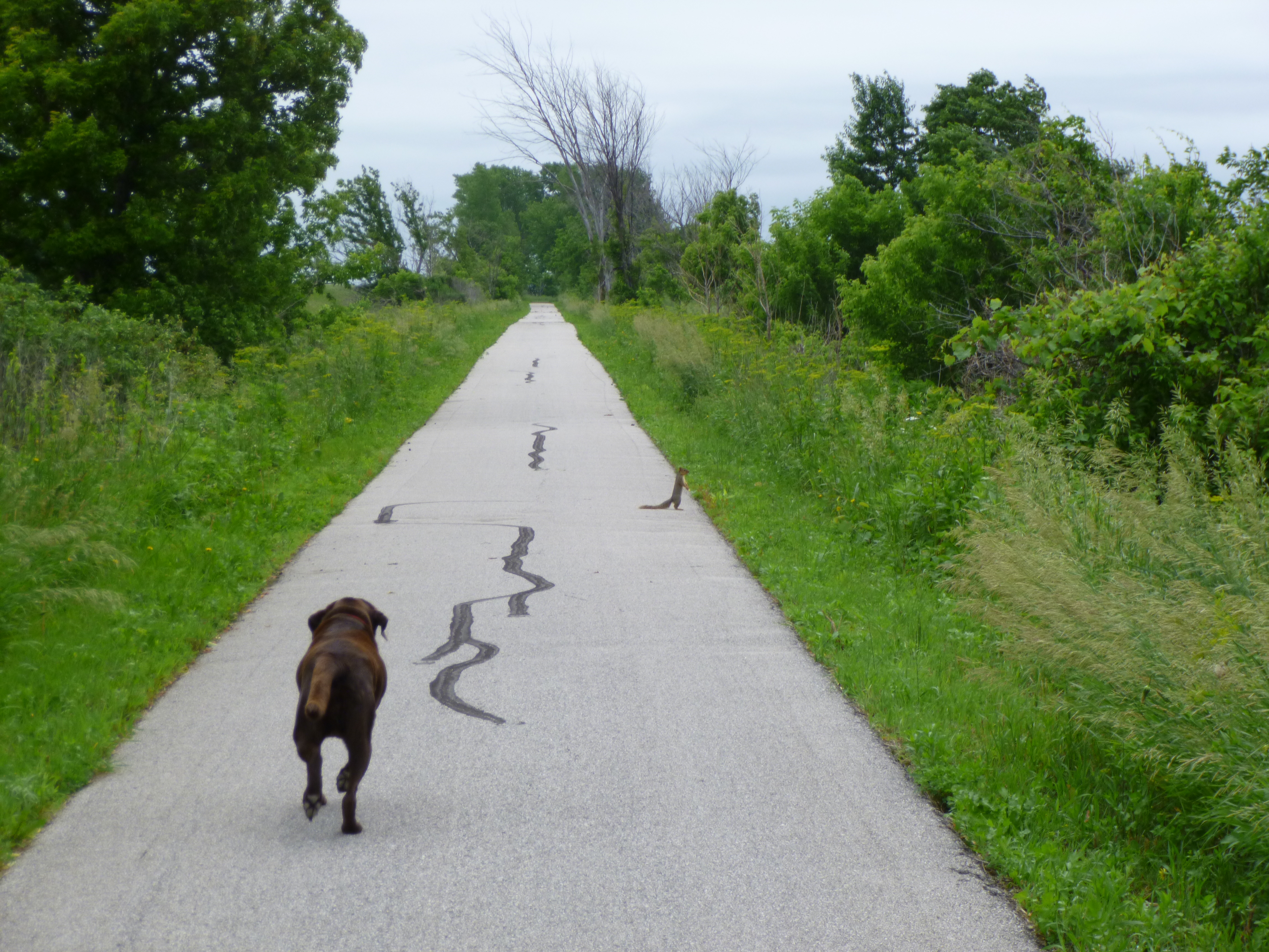 I had stayed in a neighboring town last night since it was significantly less expensive than staying in Decorah. On my way back into town, I saw the Prairie Farmer Recreation Trail, and Tula and I got out for a couple miles of walking. The trail mostly went along farmland, which used to be prairie. Tula discovered prairie dogs are as tempting to chase as squirrels, and seemed a bit bewildered when one vanished into the ground instead of up a tree! (There’s a picture and her and the prairie dog below.) When we were done with that walk, I finished driving back into Decorah and did a little more walking in town and even popped into a few shops. I found some more lefse, and even a dish of rommegrot to put in the cooler for a little treat later. Then I found another pretty neighborhood to walk in, so I was up to 3 1/2 miles for the day.