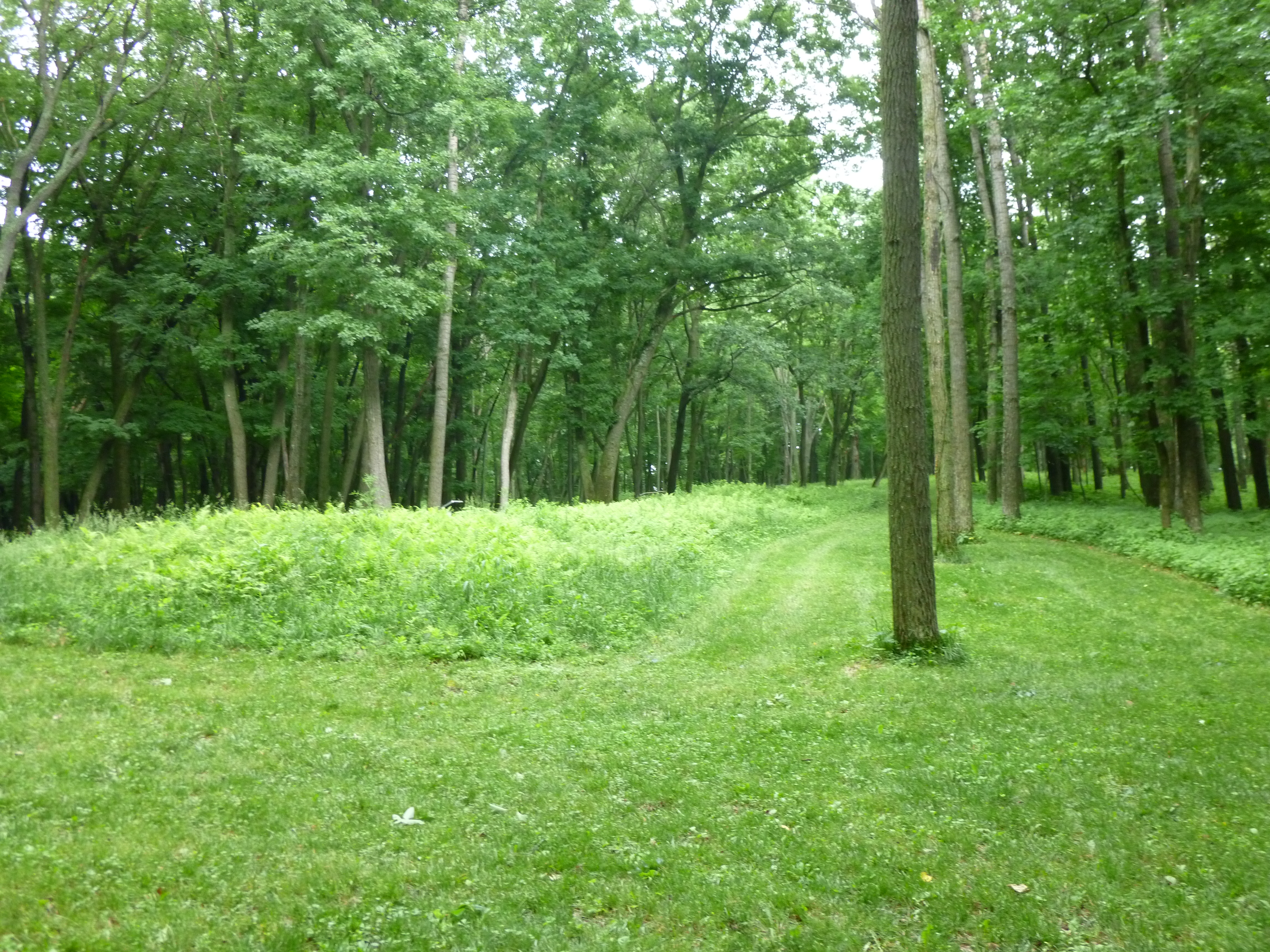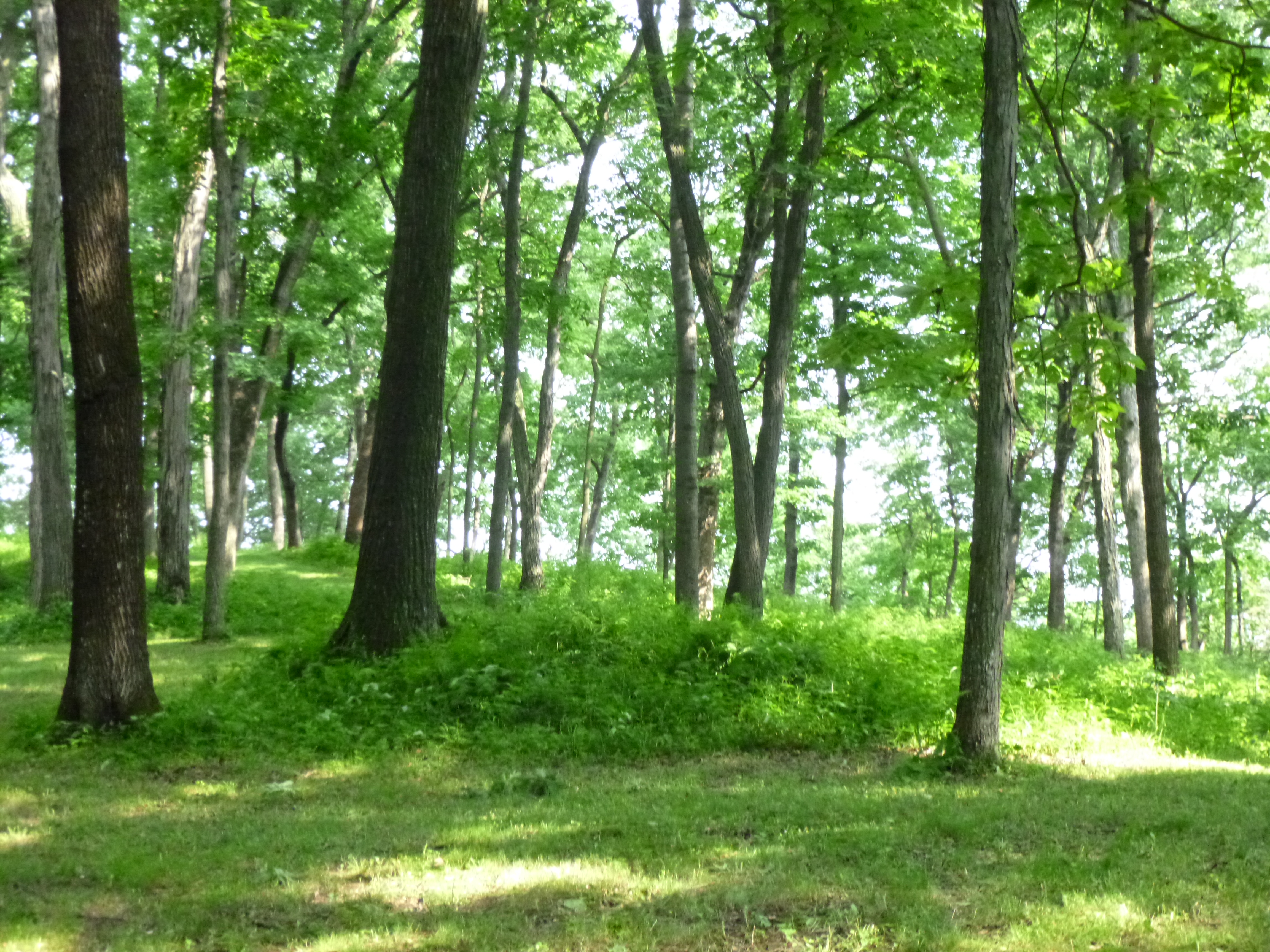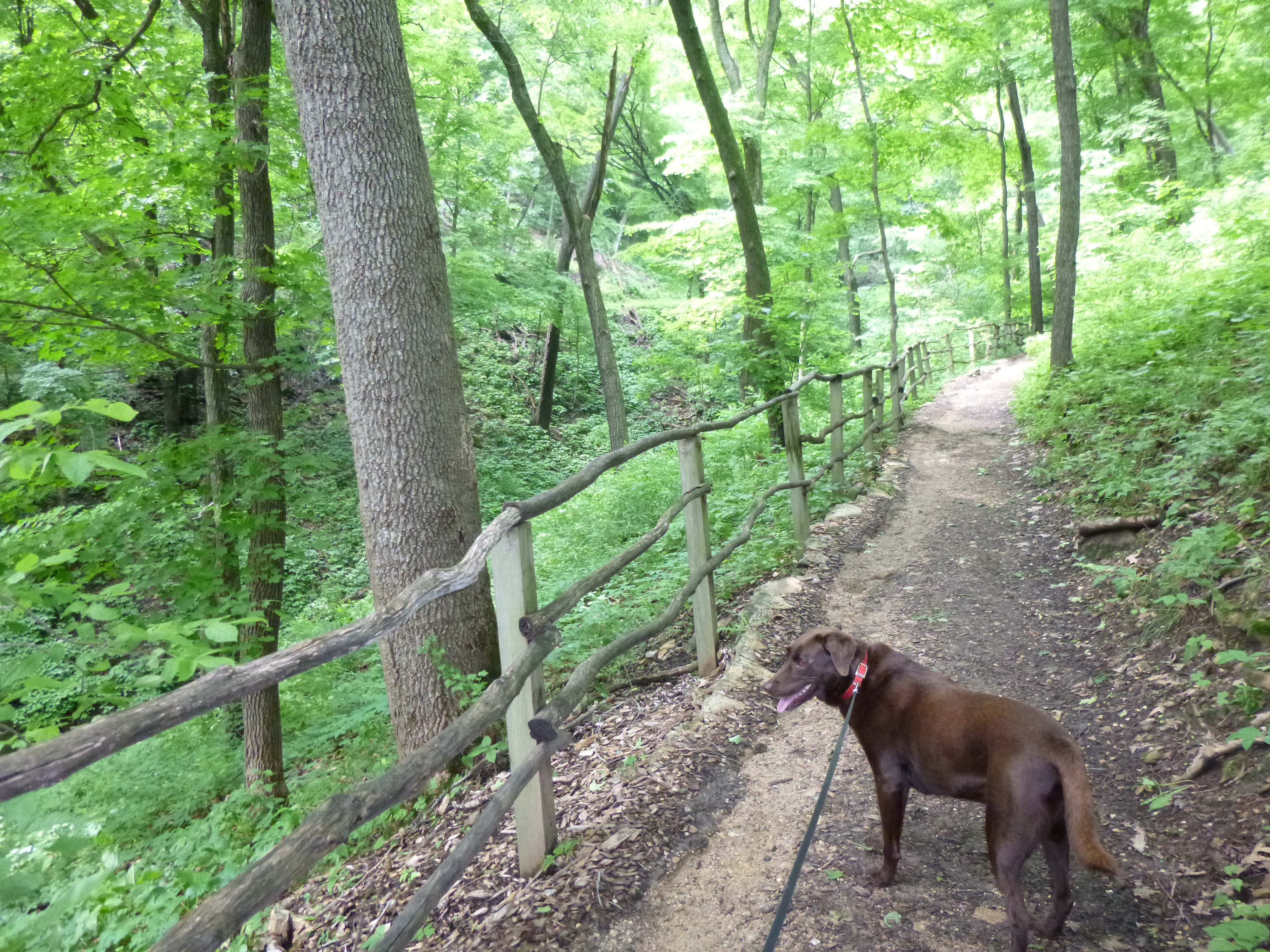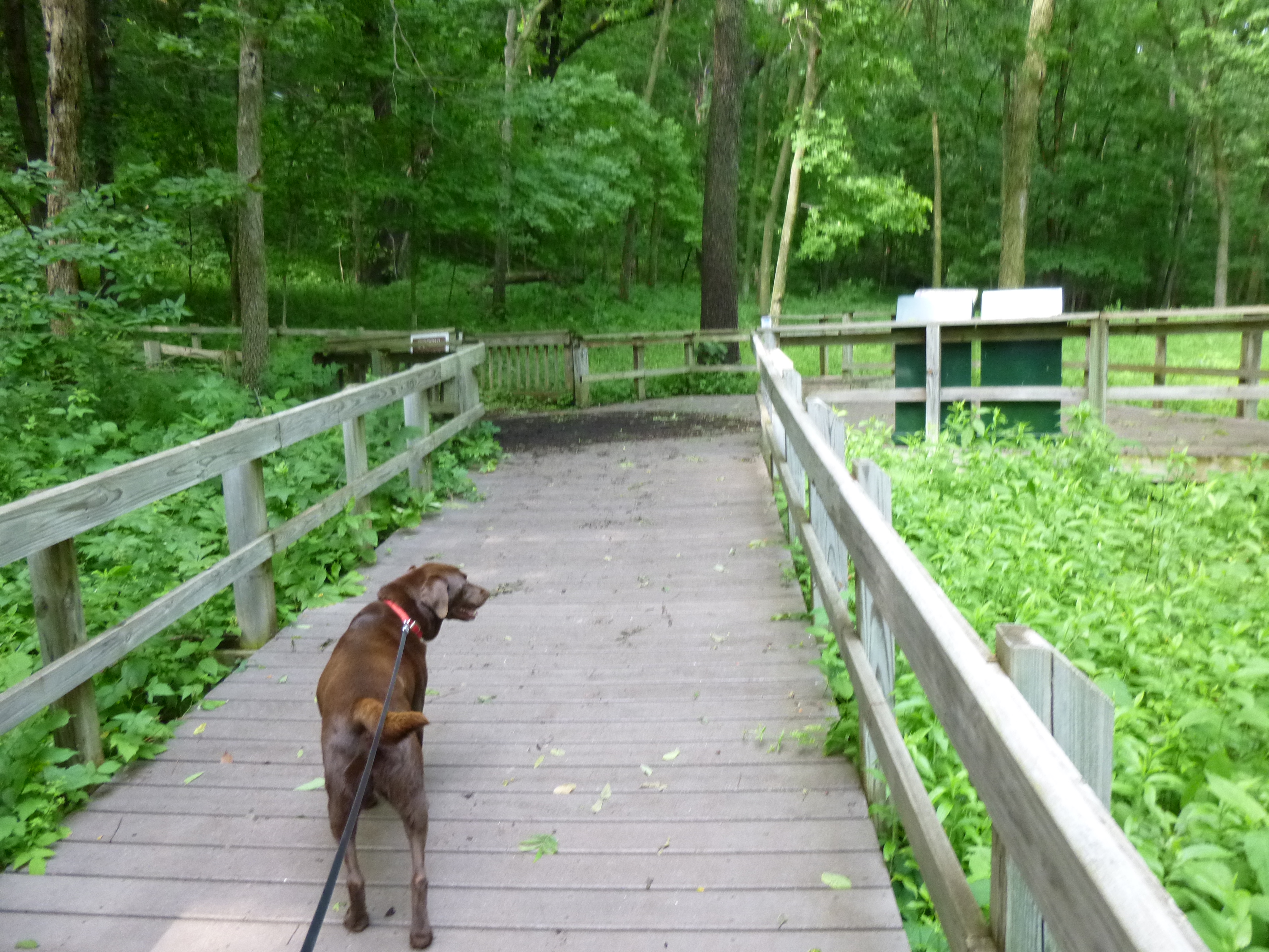 Since I’m a national park fan, my destination today was the Effigy Mounds National Monument, which was along the bluffs of the Mississippi River. There are about 200 mounds in the area, which is where Native Americans and some of their artifacts were buried 1000-2500 years ago. Many of the mounds are in shapes of birds or bears, and some are so big it was almost like they were meant to be seen from above. This is similar to the Hopewell Mounds that I visited in Ohio, where different layers of the mounds contained different things. I went into the visitor center and watched the video about the place, then Tula and I set out for a walk where we would see the small bear and large bear mounds, and a lot of round ones. We had to take a kind of steep switchback trail up to the top of the bluffs, and then we began to see the different mounds. Before the mounds were discovered, I’m sure if I had just been hiking out in the woods, I would never have known there was anything unusual about the ground – I would have just thought it was part of the rolling hills of the terrain. It’s a good thing I’m not an archeologist! The rangers keep the grass cut around the mounds, but they don’t take the lawn mowers onto them. These mounds were not very high, and the difference in grass height made it easy to see the shapes. The consensus is that the Native Americans respected the birds and bears, and that’s why the mounds were made in those shapes. I also had a beautiful view of the Mississippi River from the bluffs, and it was a really pretty hike. It was a hot muggy day, but we were in the shade of the woods, and Tula did well too.