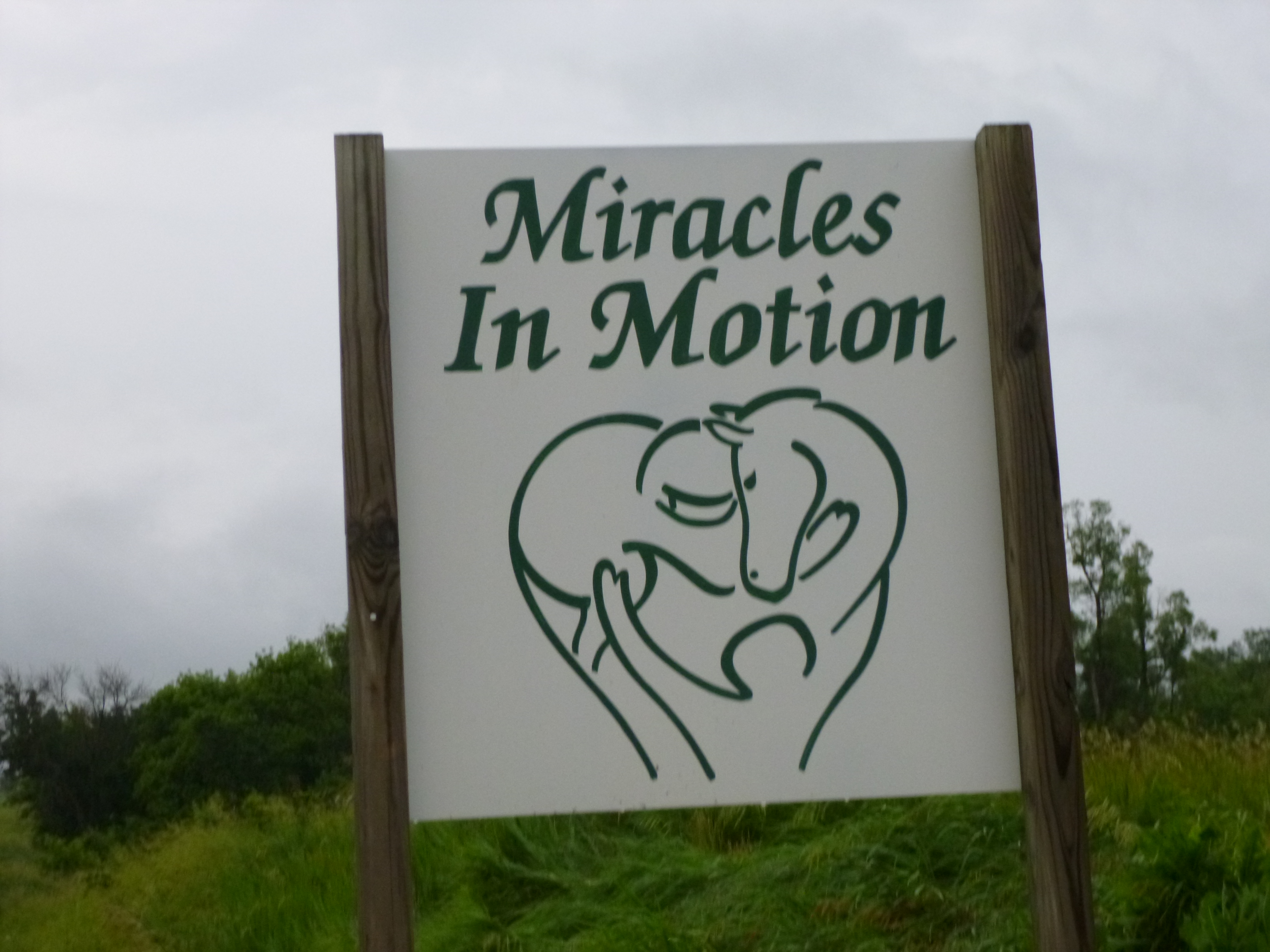 It was another soggy morning when I got up, but I loaded up the van during a lull in the rain, and headed over to the little town of Swisher, where I was going to visit the Miracles in Motion stable and watch some classes. I had talked with Cheryl, their community outreach person, late last week, and she told me the times of the classes this morning. I wasn’t sure if the classes would be happening in the rainy weather, but they weren’t too far away so I drove out there anyway. And everything was going on as usual. Cheryl met me, and I watched the class in progress. The morning classes were hippotherapy classes, which meant that either an occupational therapist or a physical therapist was conducting therapy while the kids were on horseback. One of the therapists, who has been working with people for 30 years, said hippotherapy is one of the strongest forms of therapy, because in addition to doing therapy exercises, the kids are also unwittingly using back and abdominal muscles while sitting on the horse, and the physical act of sitting on a horse is beneficial to working hip joints and other areas. So it was interesting to watch the kids and their therapists doing their exercises with rings or balls or other teaching aids, all while sitting on a walking horse that was being led around by one person, with a sidewalker on each side. Plus the regular riding instructor was there. So each rider had the horse walker, 2 sidewalkers, a therapist, and the riding instructor overseeing things. They only have 2 horse/riders out at a time while conducting hippotherapy sessions. And I saw part of 3 sessions. Sometimes the tack had to be changed, and sometimes there’s a change of horse – all depending on the need of the rider. The kids I saw were mostly using a bareback pad to sit on, and they did their exercises while riding facing forward, then facing backward, and even sitting sideways – all of that uses different muscles and different kinds of balance. The kids I saw were pretty young, and could just be lifted up and down off the horse, but they do have a lift to help with adult-size riders. Cheryl also showed me around the barn so I saw the stalls and the very-organized tack room, and met their little miniature horses, who often act as ambassadors for the barn. They have 18 horses there, and they need to be “bomb-proof” – so calm that nothing fazes them. And they were certainly calm! The riders would play catch with their therapist, and the balls didn’t bother them, and a thunderstorm passed through while I was there, and that didn’t seem to bother anyone either. The parents I talked to said their kids love their horse sessions, and some had seen a difference after just one session. One boy dreamed about his horse before his class. They have a wait list of people who would like to participate in their different activities. In addition to the hippotherapy sessions, they also have “Leg Up” classes for disadvantaged kids to have a chance to experience horse care and other opportunities, and regular therapeutic riding classes also. Those would all be happening later today. And they also have a therapeutic cart and driving program as well, which made me think of my old pony and cart! There’s a nice outdoor arena too (we were in the indoor arena of course because of the rain) and they would love to be able to get the place heated eventually so they could conduct classes all year round. They can’t do anything in the winters because it’s simply too cold. There’s also a sensory trail outside, with different objects the kids can reach out to feel – including hanging pool “noodles” to walk through. Miracles in Motion has been around for 25 years, and they started with borrowed horses in a borrowed space, and through sheer hard work, the program has grown into what it is today. They currently have about 180 dedicated volunteers and work with about 170 students a year. I was happy to find them to make my donation-of-the-day. Everyone I met was really nice π
