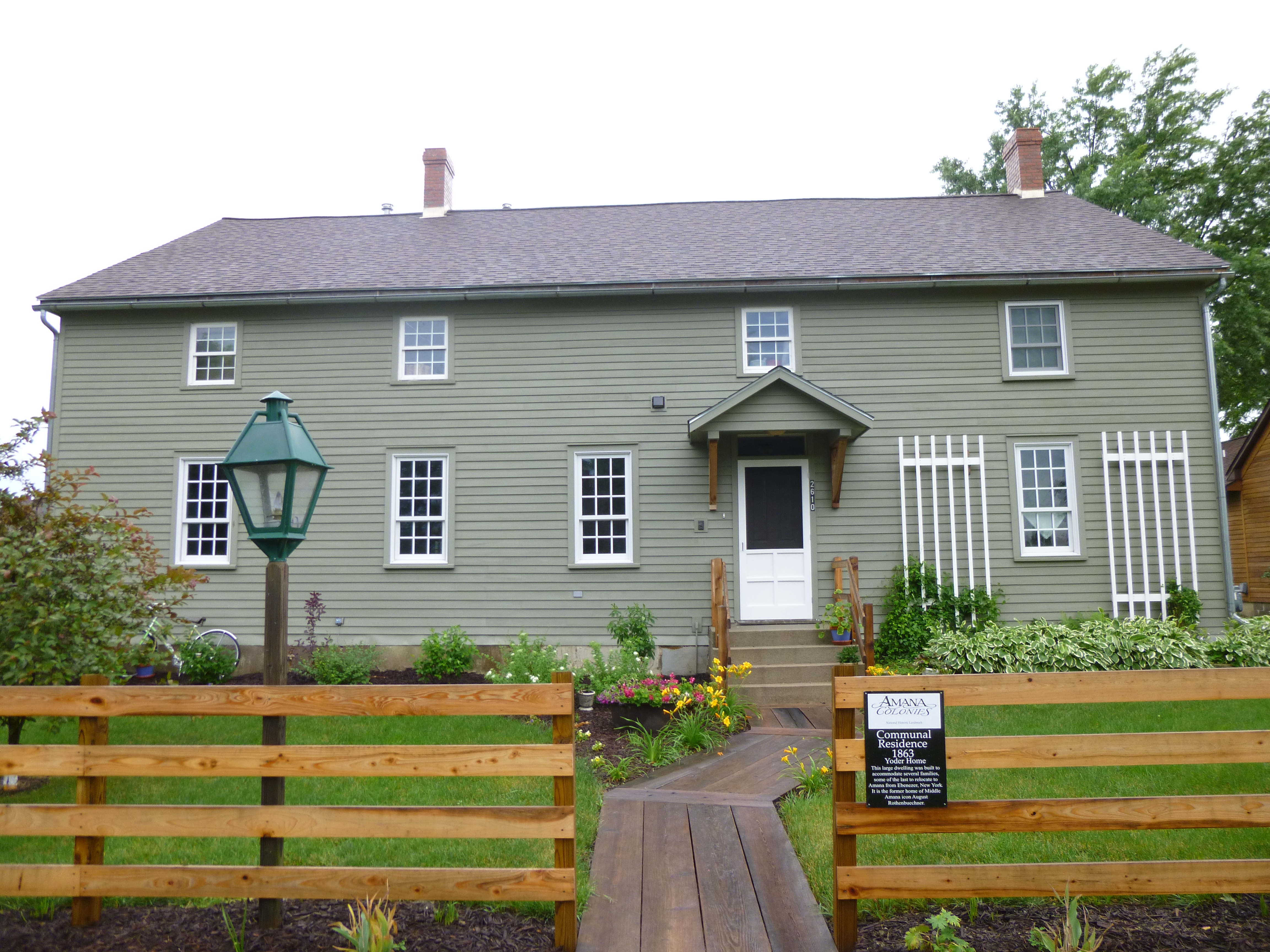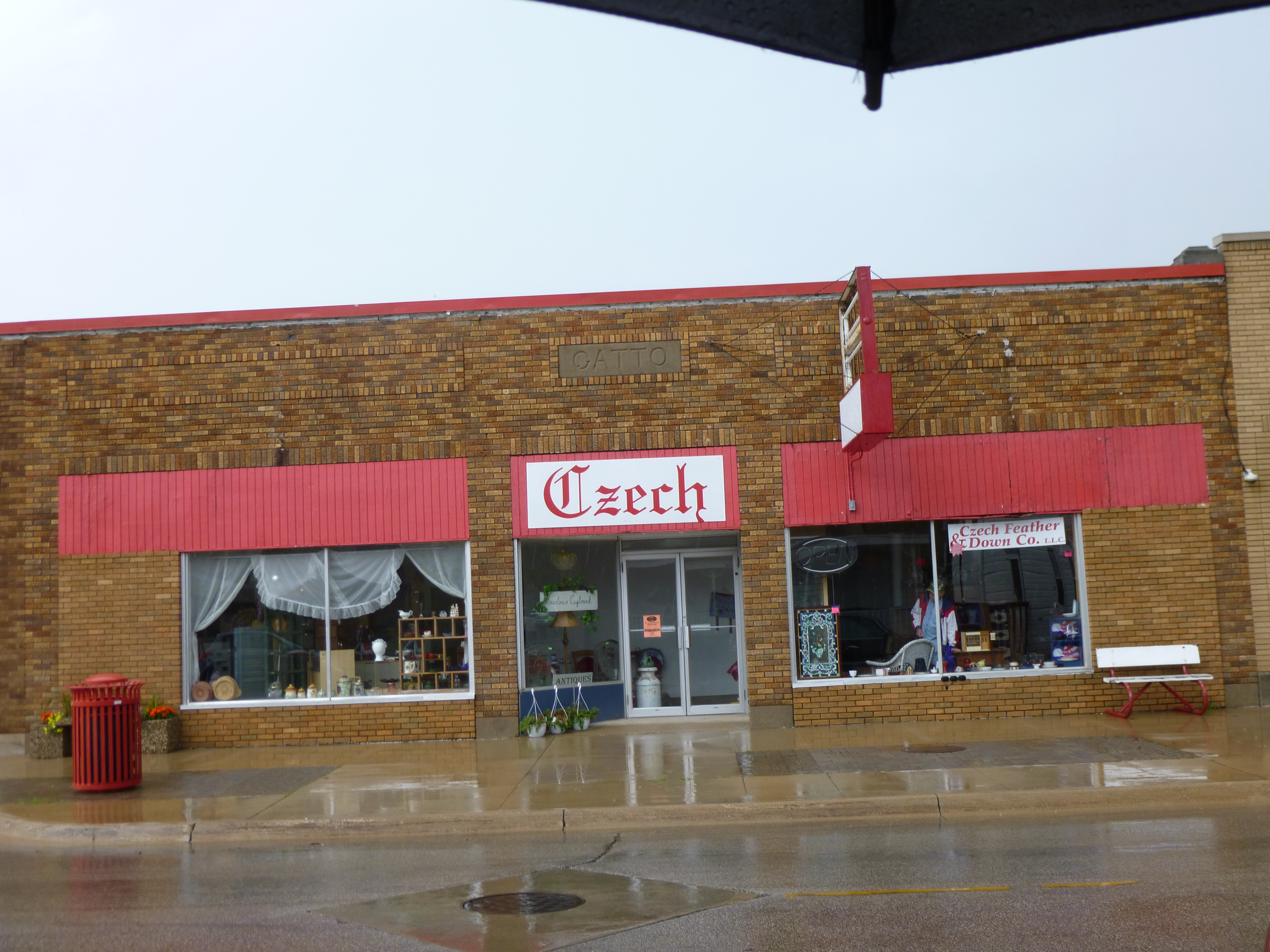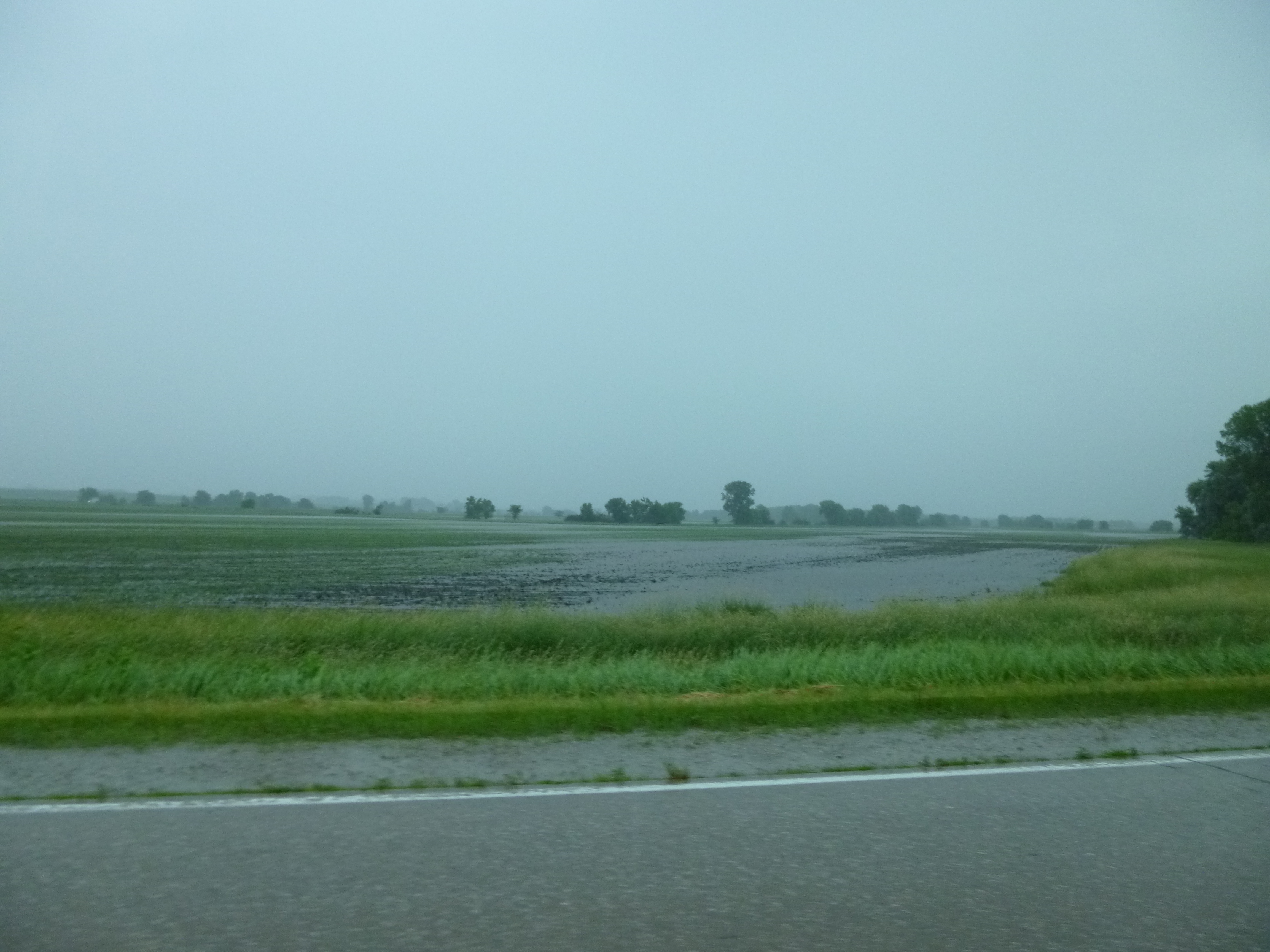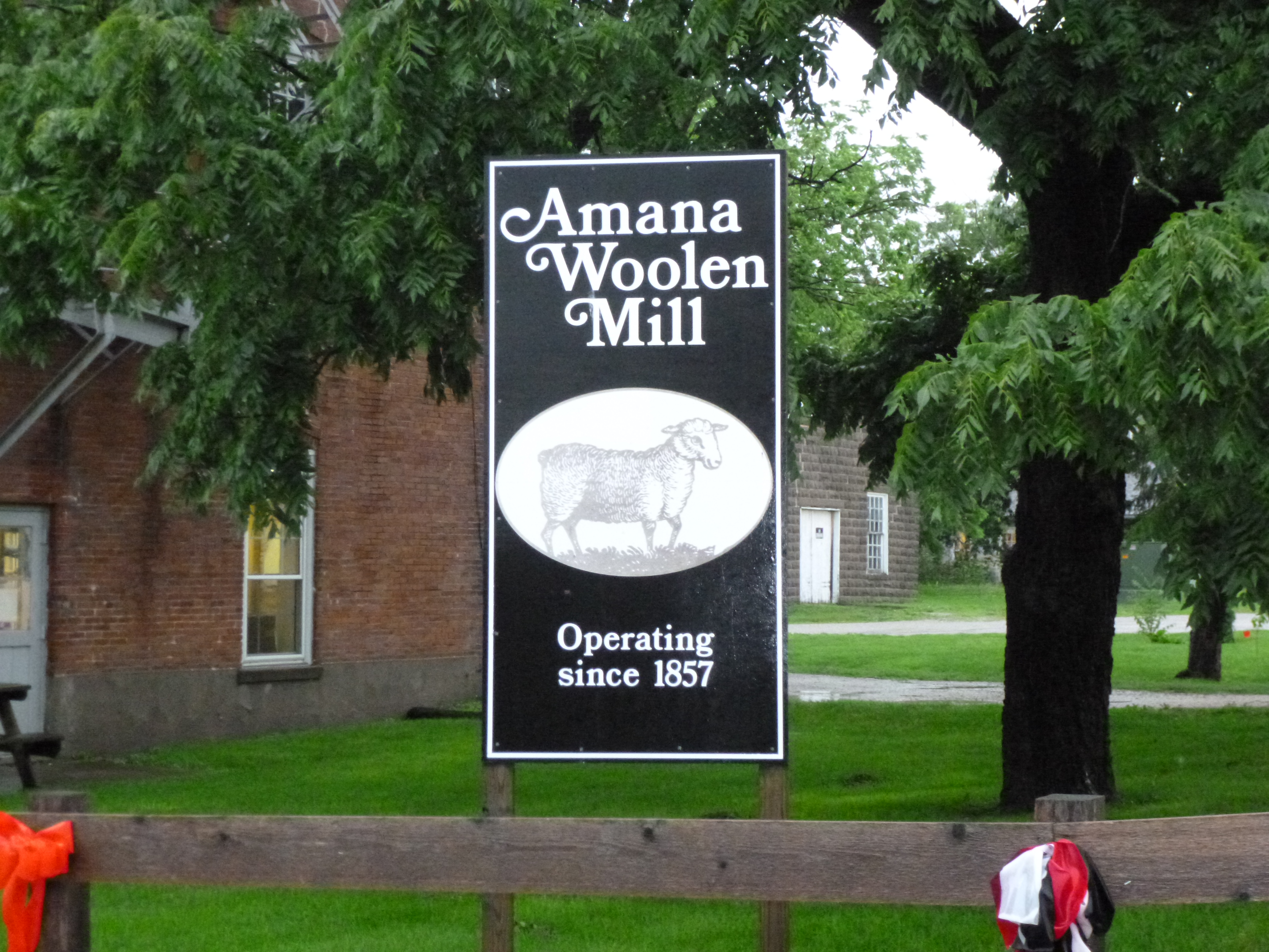 I had spent a couple hours at Miracles in Motion, and it was time to get some walking done. I headed back into Cedar Rapids to the Czech Village part of town, and was only to get about a mile and a quarter of walking in before it started to rain again. So I decided to get in the car and start driving to the Amana Colony villages. But I had to stop along the way at one point because it was raining so hard I couldn’t see a thing. Other motorists pulled over too, and we all waited for the deluge to let up a bit. The farm fields were already so wet that they ended up with pond-sized puddles on them. I got to Amana and did some walking with an umbrella – by then the strong weather had moved off, but it was still wet. In fact, I heard that there were tornado warnings in some neighboring vicinities, but all of that was moving off. I went inside a couple shops in the biggest of the Amana villages, and especially enjoyed the woolen mill, where they weave a lot of blankets and stuff right on the property. The Amana people lived in large homes – several families in each home, but the houses didn’t have kitchens or dining rooms, because food preparation and eating took place in communal buildings. Back in 1932 they voted to move away from the communal sort of lifestyle. I also visited a couple of the other smaller Amana villages, and found a pretty walkway by a lake where I could get Tula out too, so I was able to do almost 4 miles of walking in those different areas despite the weather.