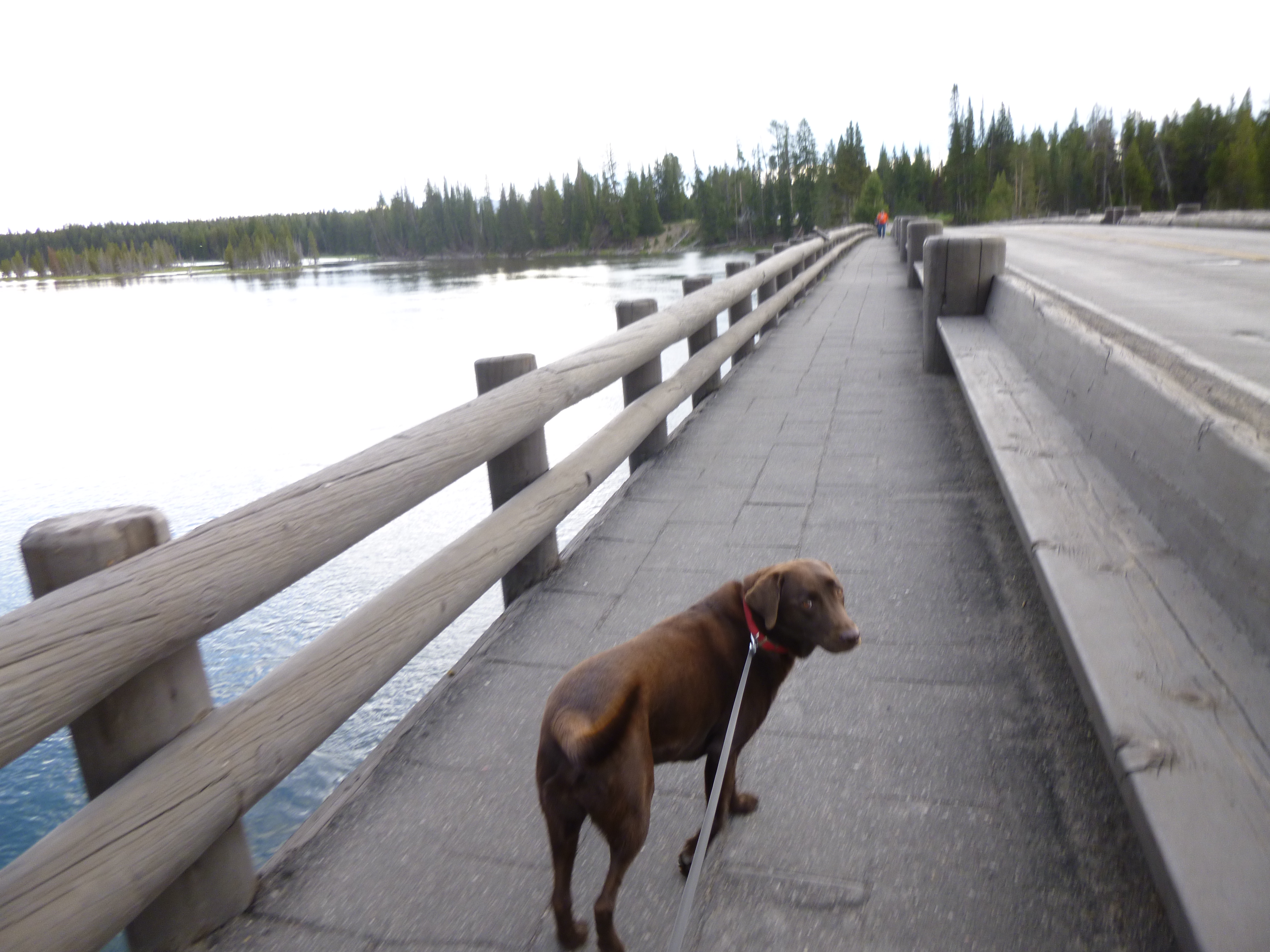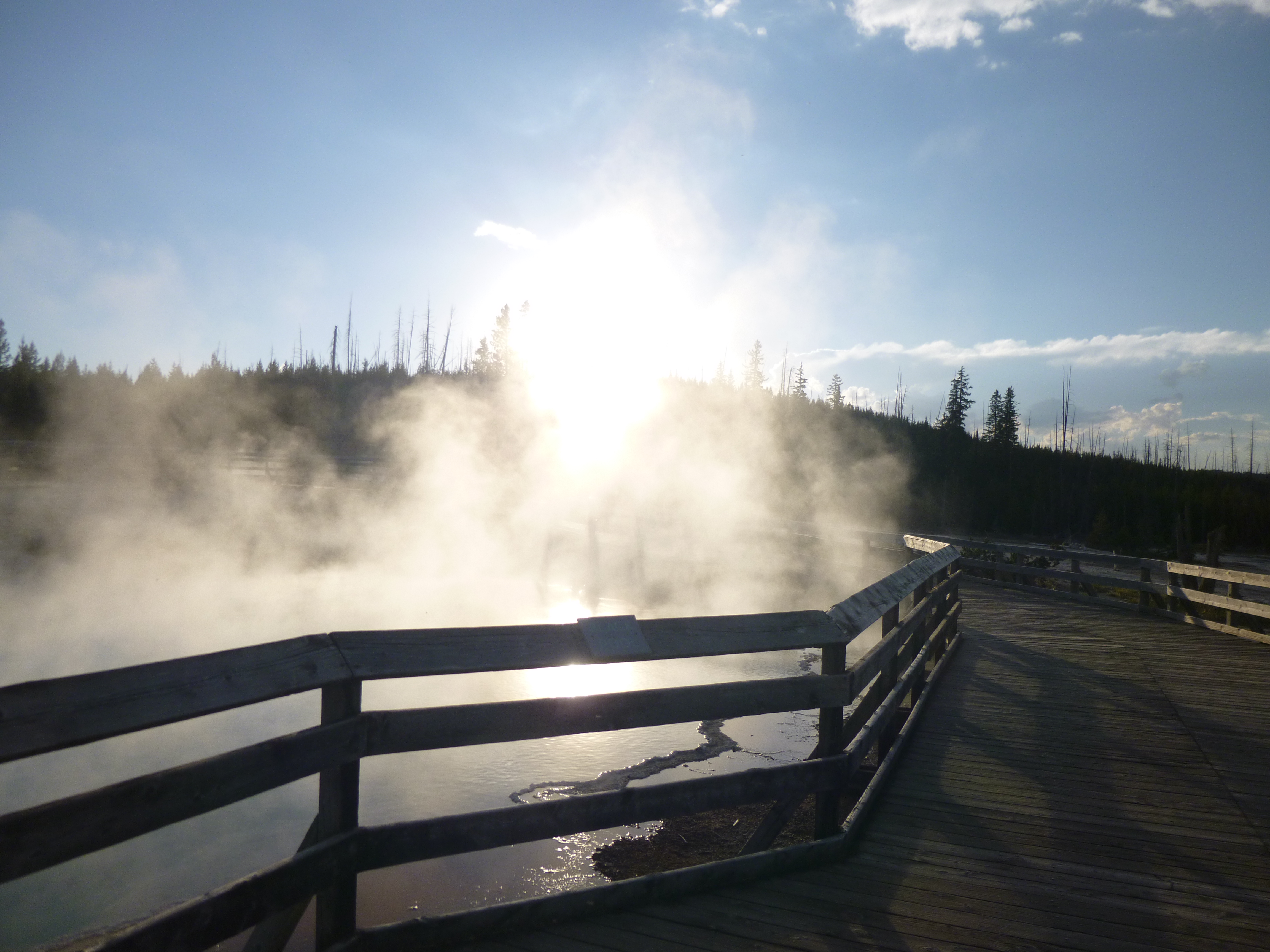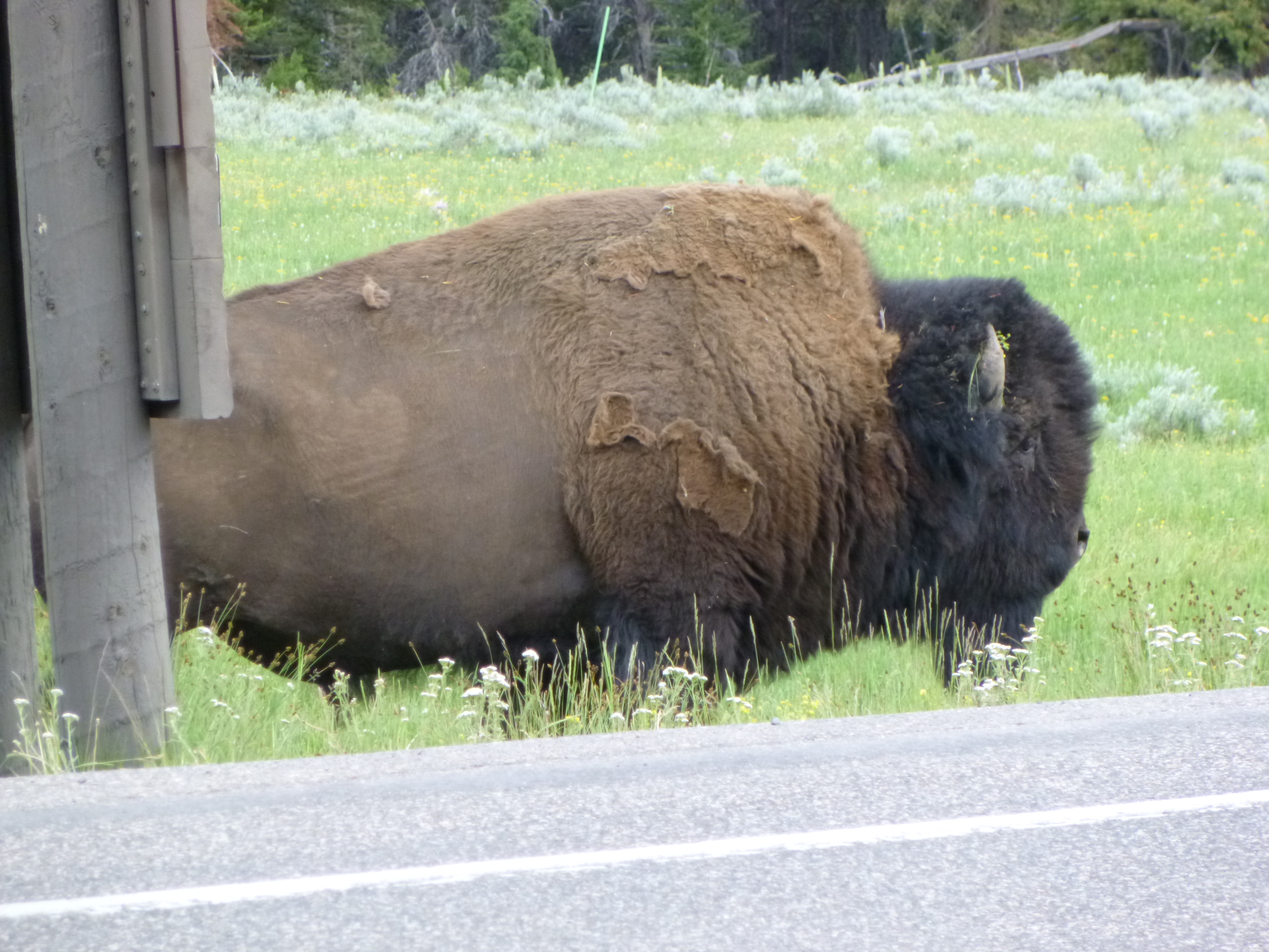 When I was done at Cody Cupboard, I had to take care of some things at the post office. Then I thought I better check into the possibility of reserving a campsite in Yellowstone. I already knew that campgrounds in the Grand Tetons were handled on a first-come, first serve basis – they do not take reservations. But Yellowstone did, and I called to see if their were any campsites open anywhere, and it didn’t matter which campground it was at. Because of the bears, tent camping isn’t allowed at all of the campgrounds – just certain ones. I was lucky enough to be able to reserve a campsite in Yellowstone – only about 14 miles from Old Faithful, and then I didn’t have to be rushing anywhere. I was relieved because all of the motel rooms in the towns near the park are ridiculously expensive, and out of my budget range. So I continued west toward Yellowstone, and on the way I saw a sign for another wayfarer’s chapel up on the side of the mountain, so I went to look at that one too, but I liked the one I saw yesterday better. And then I was in Yellowstone! The first thing that was apparent on this side of the park was the result of old forest fires – there were acres and acres of charred trees. I asked a ranger about the fires, and there haven’t been any major ones since 2006. Because of all the wildlife, dogs are only allowed on paved roads and sidewalks in both Yellowstone and Grand Tetons – they cannot go on any of the trails, and that makes perfectly good sense. And that was fine with me because I wasn’t going to be going deep into the woods on any trails by myself in bear country anyway! The first place we came to was called Storm Point, and I got out for a mile walk. It was open meadow by a lake, and as I was walking on the path toward toward the lake, I noticed a buffalo down getting a drink. He then walked right toward the trail and crossed it – I retreated and gave him plenty of space. I wasn’t sure if I was going to take that walk or not, but then he moved far enough away from the trail that I felt comfortable. It was a magnificent animal to watch. I then followed the trail down to a bigger lake, and when I came back there were at least 25 people looking at the buffalo – on my way down to the lake it had just been me. Then we stopped at Fishing Bridge, where there was a small visitor center and across the street was a rustic store, gift shop, gas pumps, and a small lodge sort of place. There were some sidewalks, and I was able to get Tula out for a mile and a half there, and we were also able to walk over the actual fishing bridge although fishing is no longer allowed in that particular area. I went into the gift store and the ice cream counter was doing a brisk business, and it did sound really good, so I had to try the buffalo chip ice cream (chocolate with caramel and nuts). We continued driving in the park passed a couple more buffalo and a couple elk, and saw some small steaming holes in the ground.
