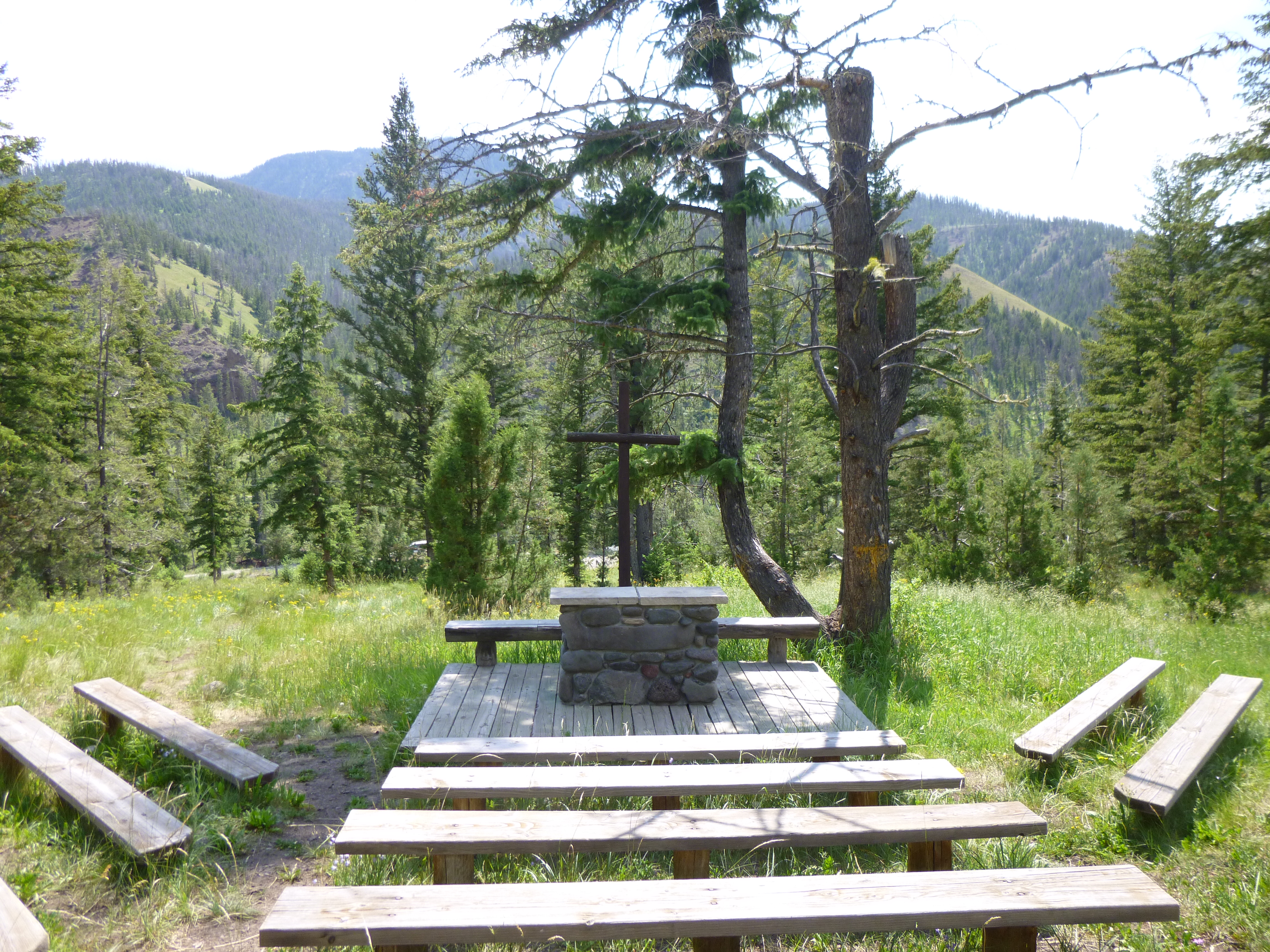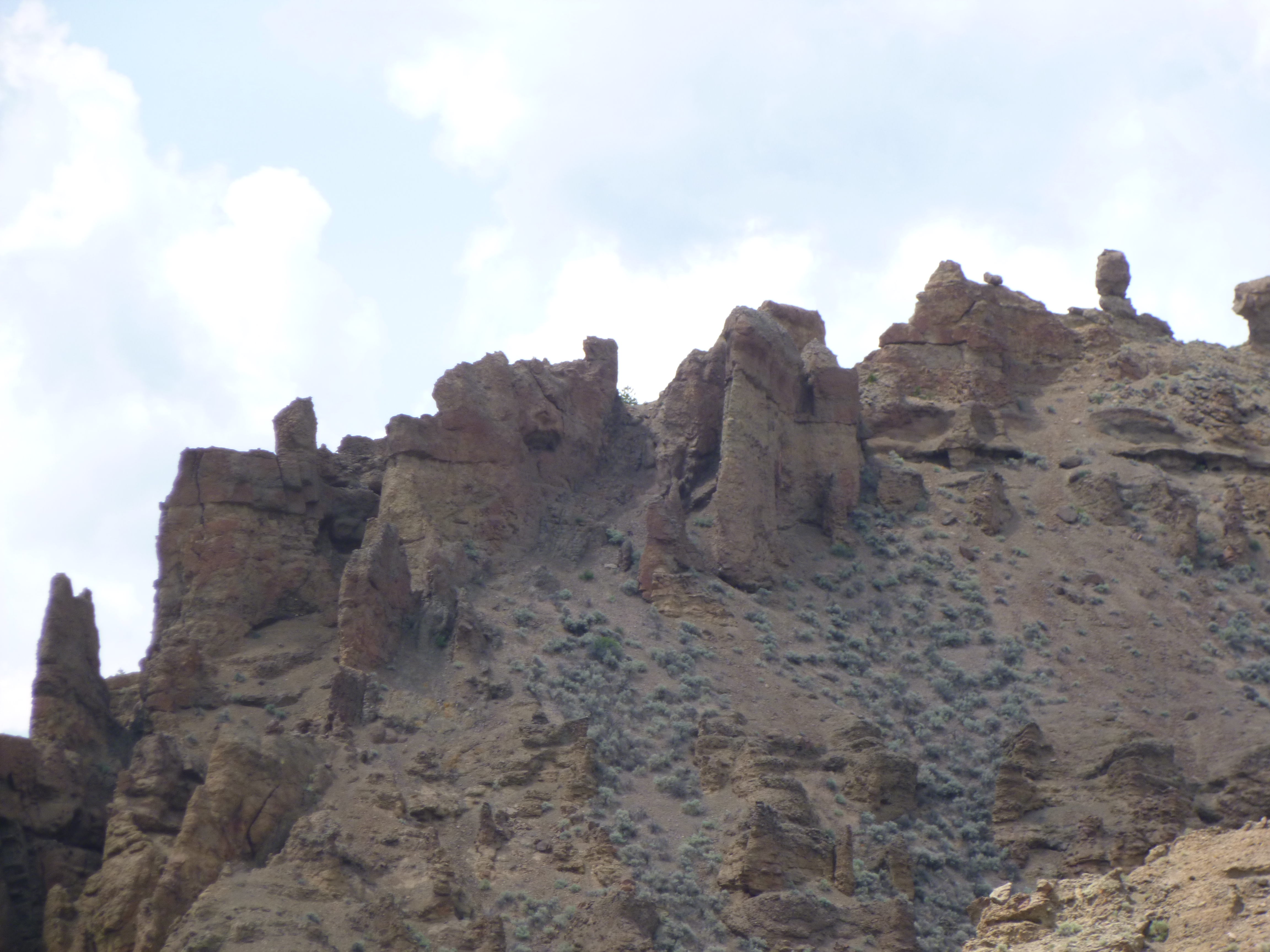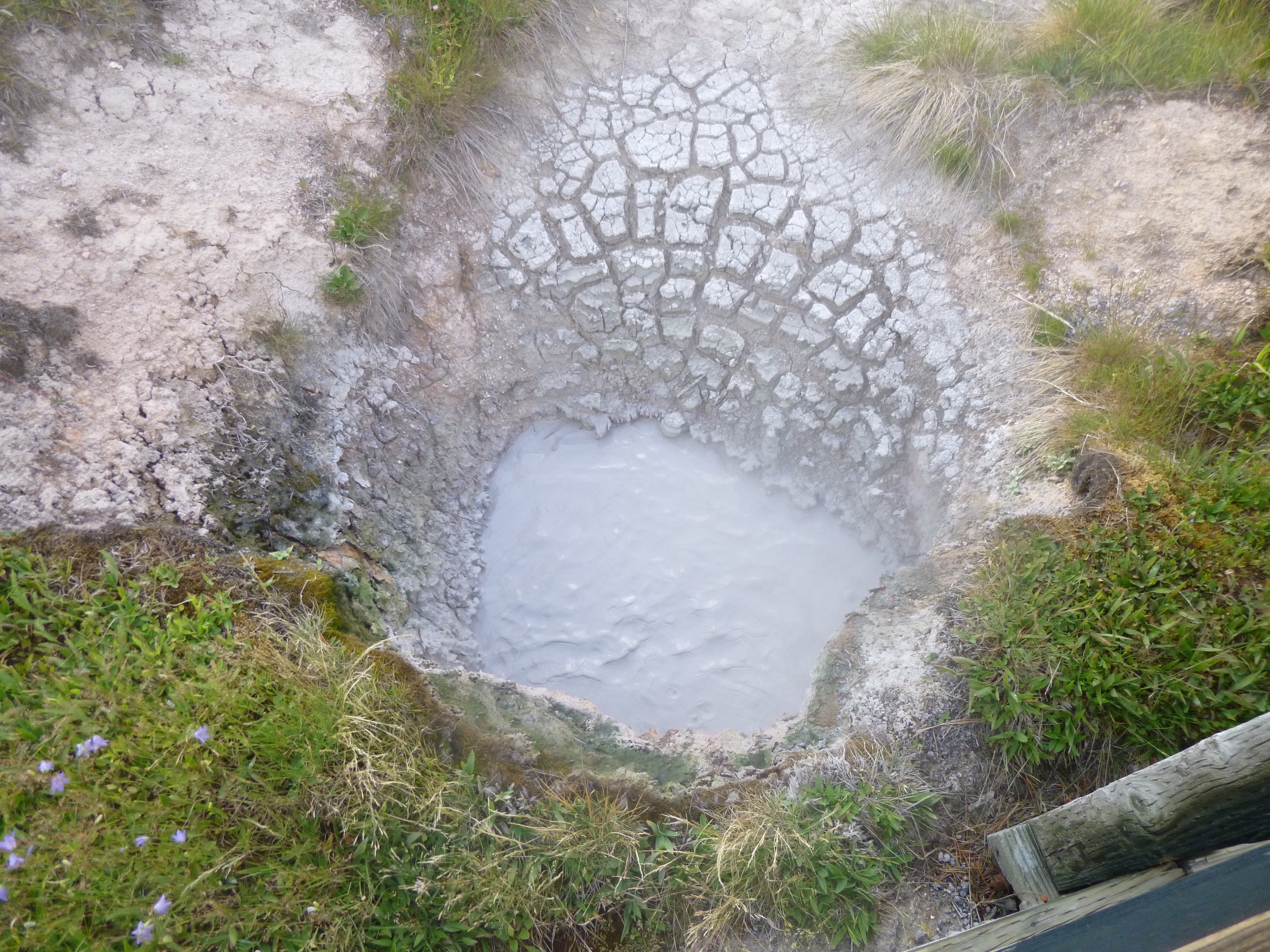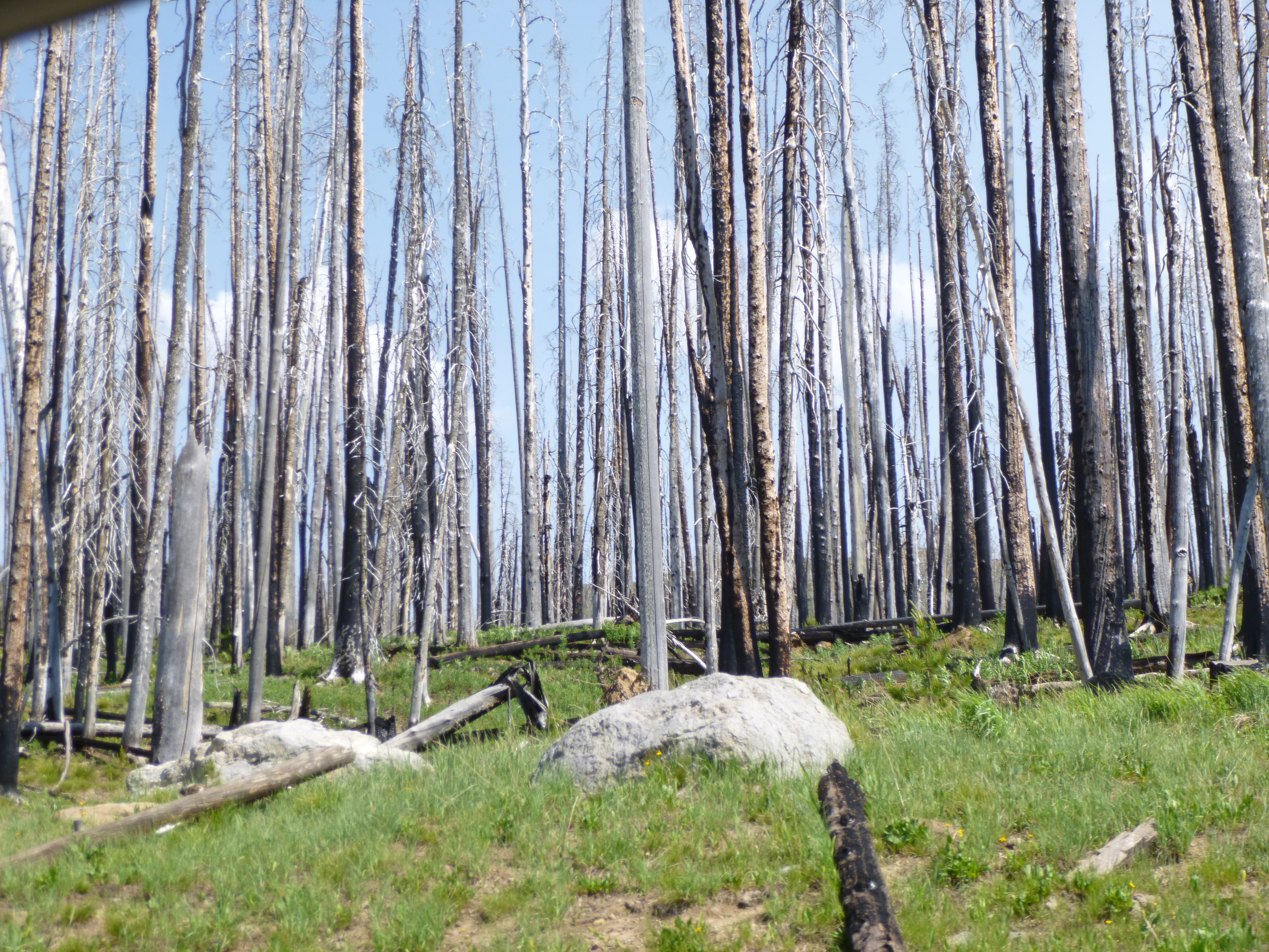 When I was done at Cody Cupboard, I had to take care of some things at the post office. Then I thought I better check into the possibility of reserving a campsite in Yellowstone. I already knew that campgrounds in the Grand Tetons were handled on a first-come, first serve basis – they do not take reservations. But Yellowstone did, and I called to see if their were any campsites open anywhere, and it didn’t matter which campground it was at. Because of the bears, tent camping isn’t allowed at all of the campgrounds – just certain ones. I was lucky enough to be able to reserve a campsite in Yellowstone – only about 14 miles from Old Faithful, and then I didn’t have to be rushing anywhere. I was relieved because all of the motel rooms in the towns near the park are ridiculously expensive, and out of my budget range. So I continued west toward Yellowstone, and on the way I saw a sign for another wayfarer’s chapel up on the side of the mountain, so I went to look at that one too, but I liked the one I saw yesterday better. And then I was in Yellowstone! The first thing that was apparent on this side of the park was the result of old forest fires – there were acres and acres of charred trees. I asked a ranger about the fires, and there haven’t been any major ones since 2006. Because of all the wildlife, dogs are only allowed on paved roads and sidewalks in both Yellowstone and Grand Tetons – they cannot go on any of the trails, and that makes perfectly good sense. And that was fine with me because I wasn’t going to be going deep into the woods on any trails by myself in bear country anyway! The first place we came to was called Storm Point, and I got out for a mile walk. It was open meadow by a lake, and as I was walking on the path toward toward the lake, I noticed a buffalo down getting a drink. He then walked right toward the trail and crossed it – I retreated and gave him plenty of space. I wasn’t sure if I was going to take that walk or not, but then he moved far enough away from the trail that I felt comfortable. It was a magnificent animal to watch. I then followed the trail down to a bigger lake, and when I came back there were at least 25 people looking at the buffalo – on my way down to the lake it had just been me. Then we stopped at Fishing Bridge, where there was a small visitor center and across the street was a rustic store, gift shop, gas pumps, and a small lodge sort of place. There were some sidewalks, and I was able to get Tula out for a mile and a half there, and we were also able to walk over the actual fishing bridge although fishing is no longer allowed in that particular area. I went into the gift store and the ice cream counter was doing a brisk business, and it did sound really good, so I had to try the buffalo chip ice cream (chocolate with caramel and nuts). We continued driving in the park passed a couple more buffalo and a couple elk, and saw some small steaming holes in the ground.