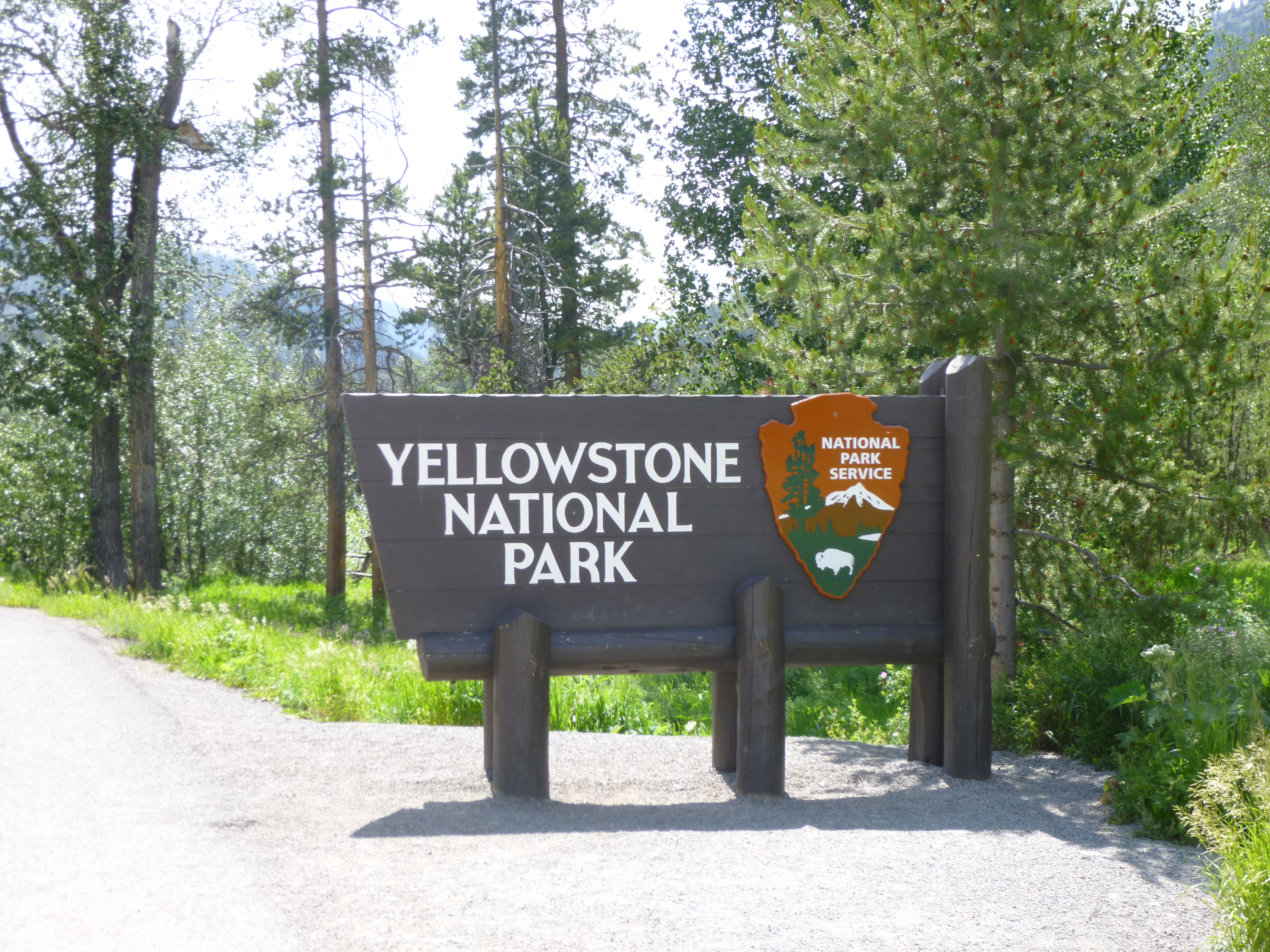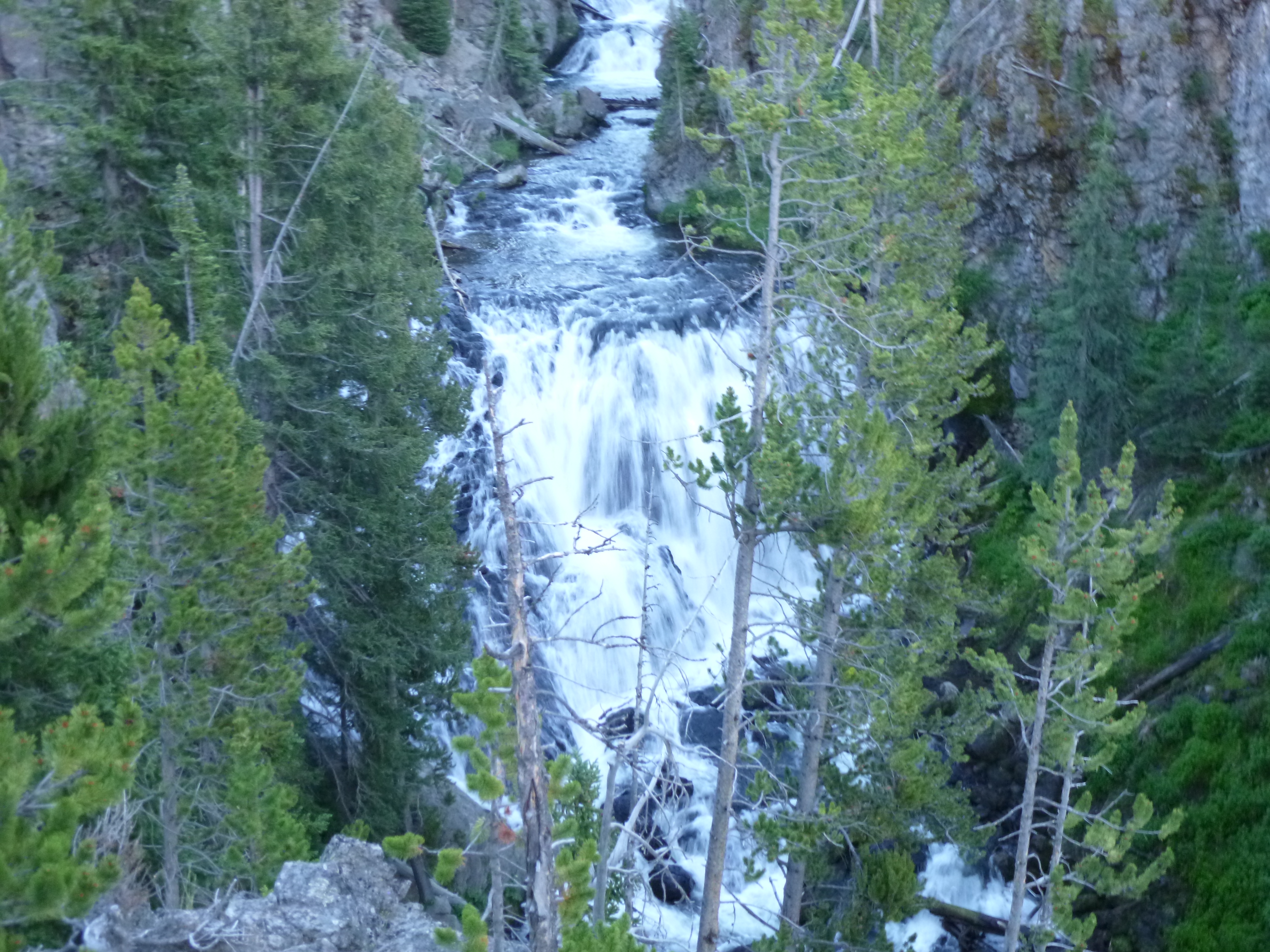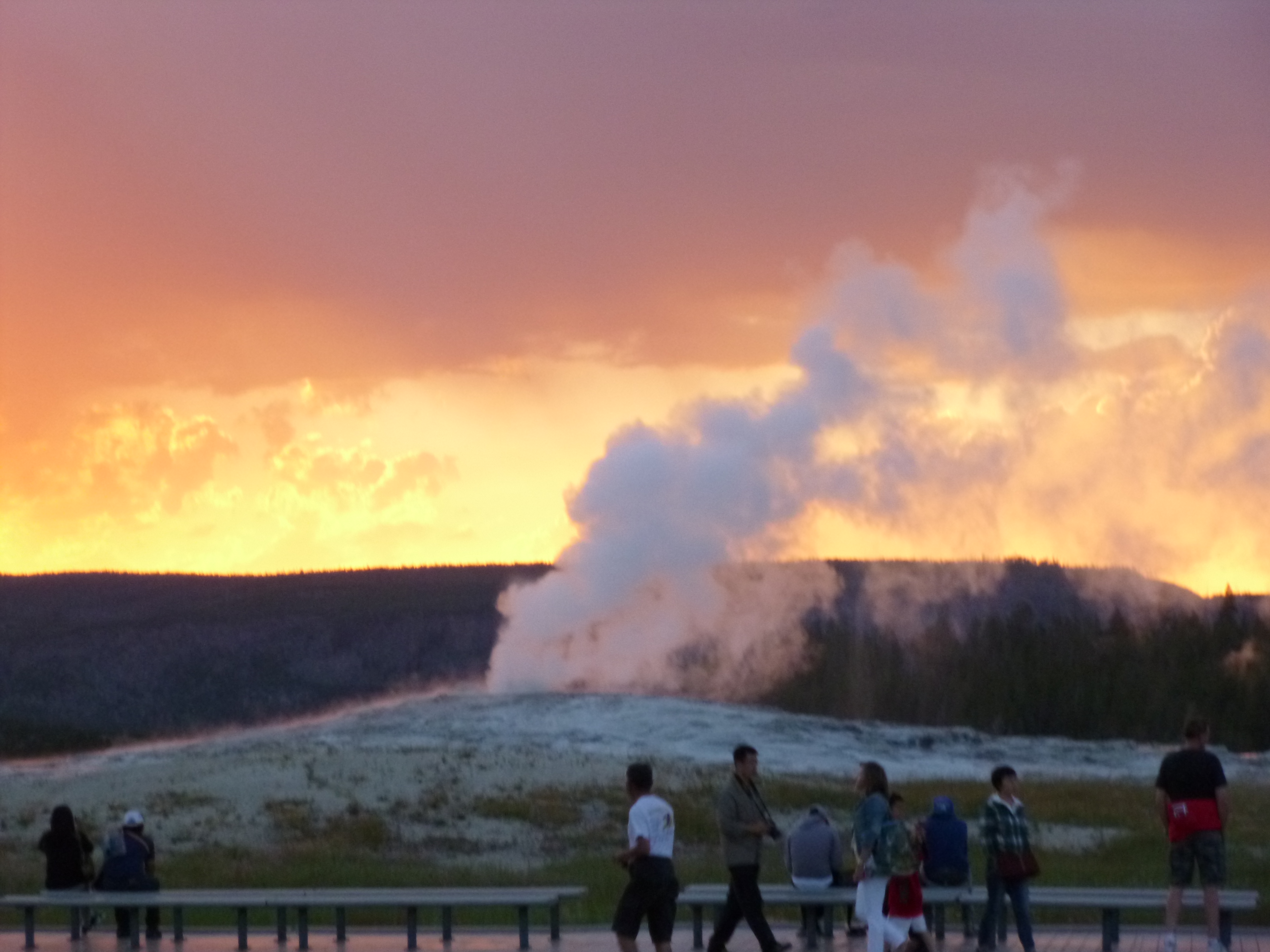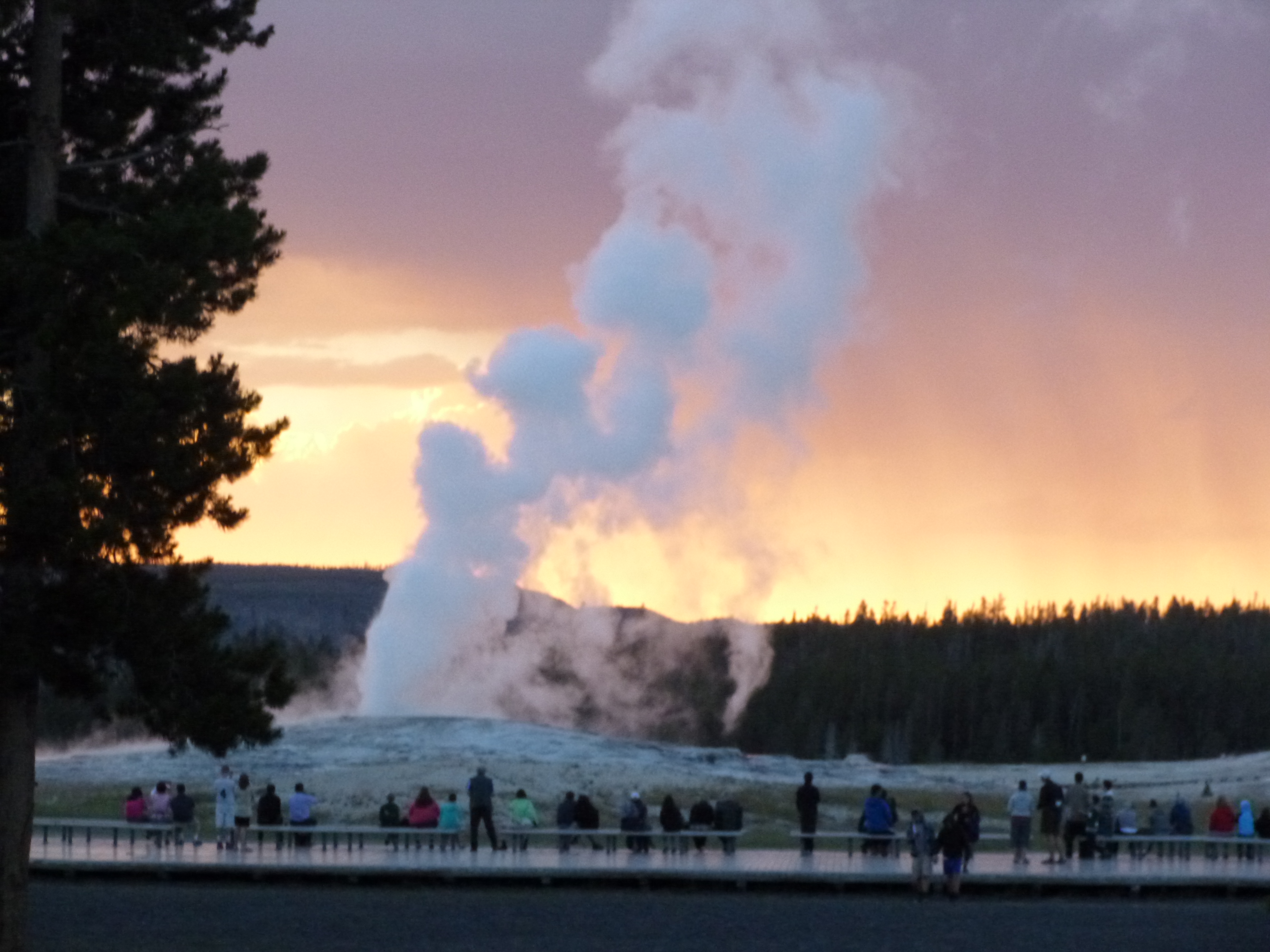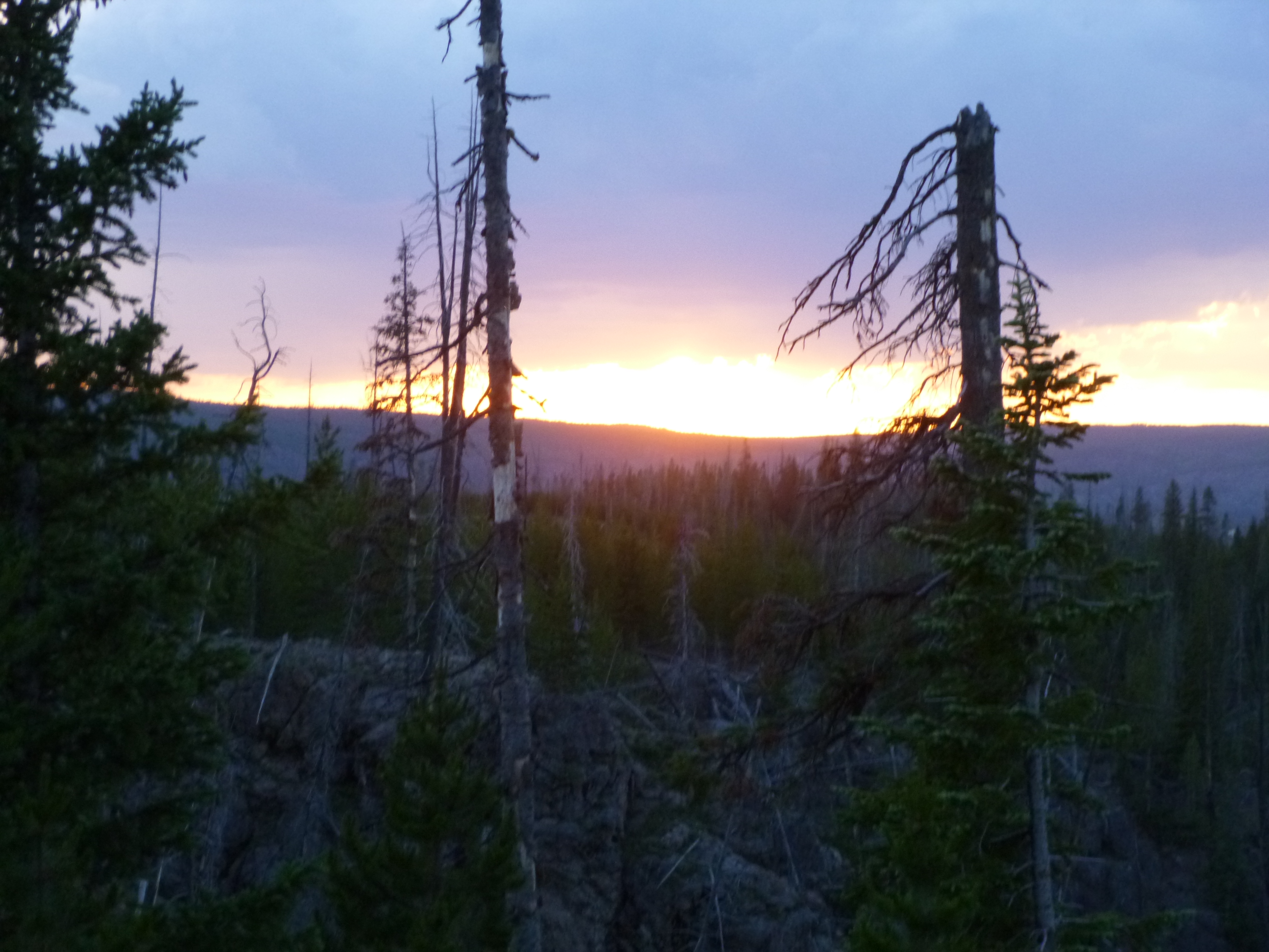 Once I had walked all around those boardwalks, I headed for Old Faithful since I had to pass near it to get to my campground. People swarm to Old Faithful, so there are extra lanes in the roads, extra signs and huge parking lots. Old Faithful erupts about every 90 minutes, and I had no idea where in the cycle I arrived. The sun had just set and the sky was really pretty, and parking wasn’t bad since it was almost 9pm so I hurried over, and saw Old Faithful just as it was erupting. I had a good view even though I was still walking over there. The eruption of water was really pretty against the colors in the sky. I watched the geyser settle back down, and then figured I better finish the drive to my campground so I could get set up before it was totally dark. Yellowstone is a really big park, and even though I’d already been in the park for hours, I still had about 1/2 hour of driving to do. I got there just as they were closing up the office (they would have just left a map out for me and other stragglers) and they went over the bear precautions – primarily about keeping all food, and anything with a scent, locked up in a car or a bear box.