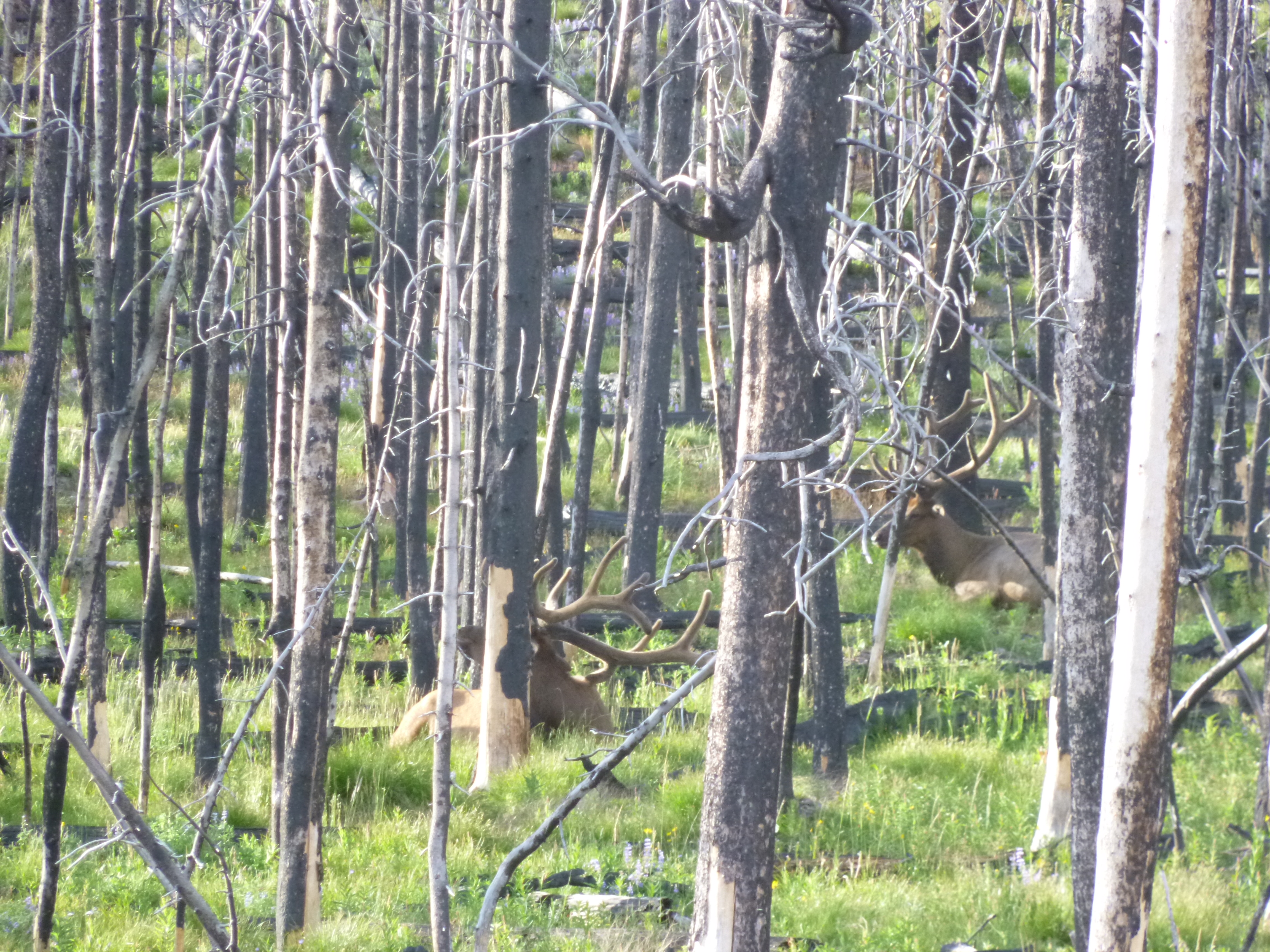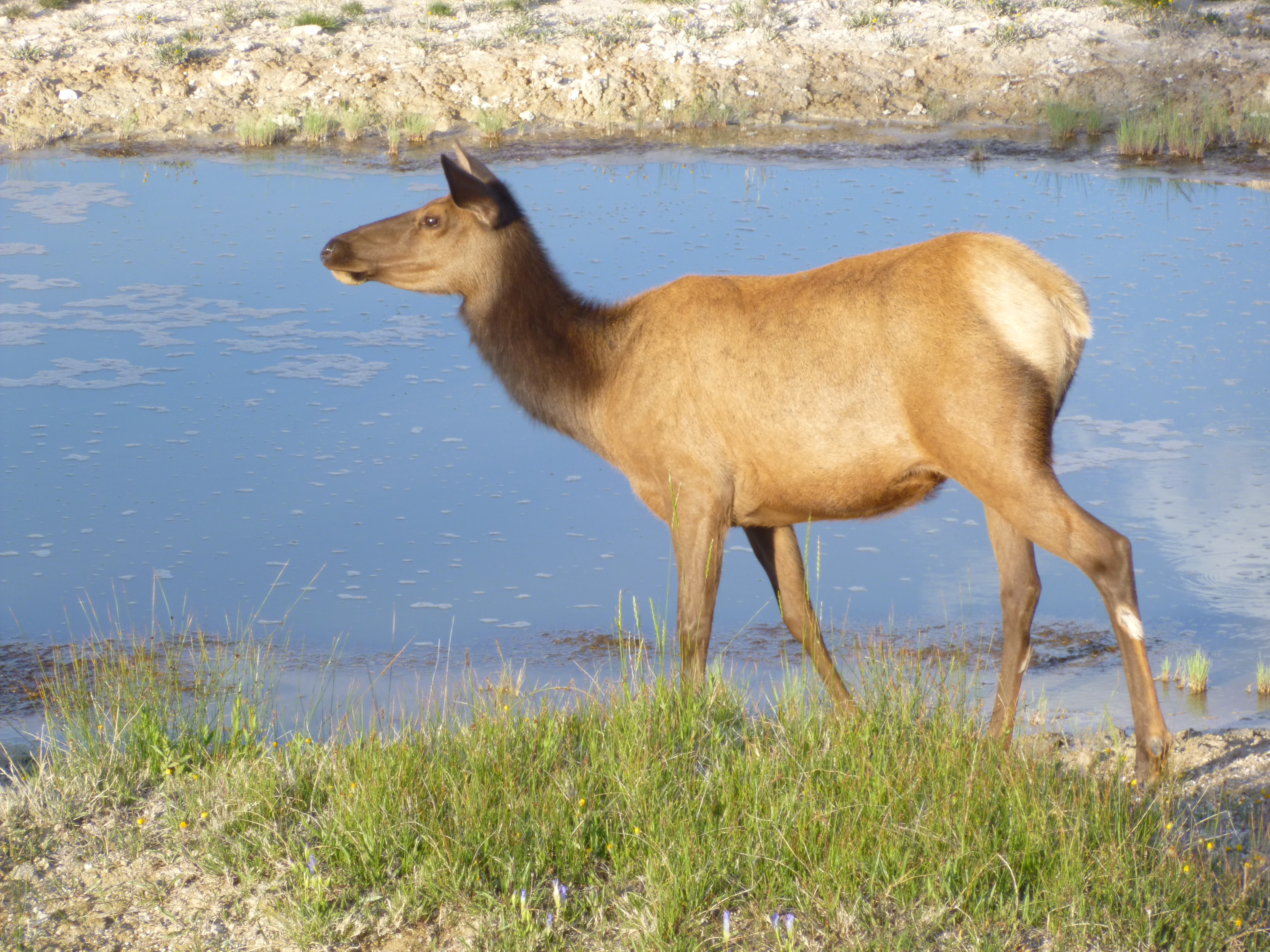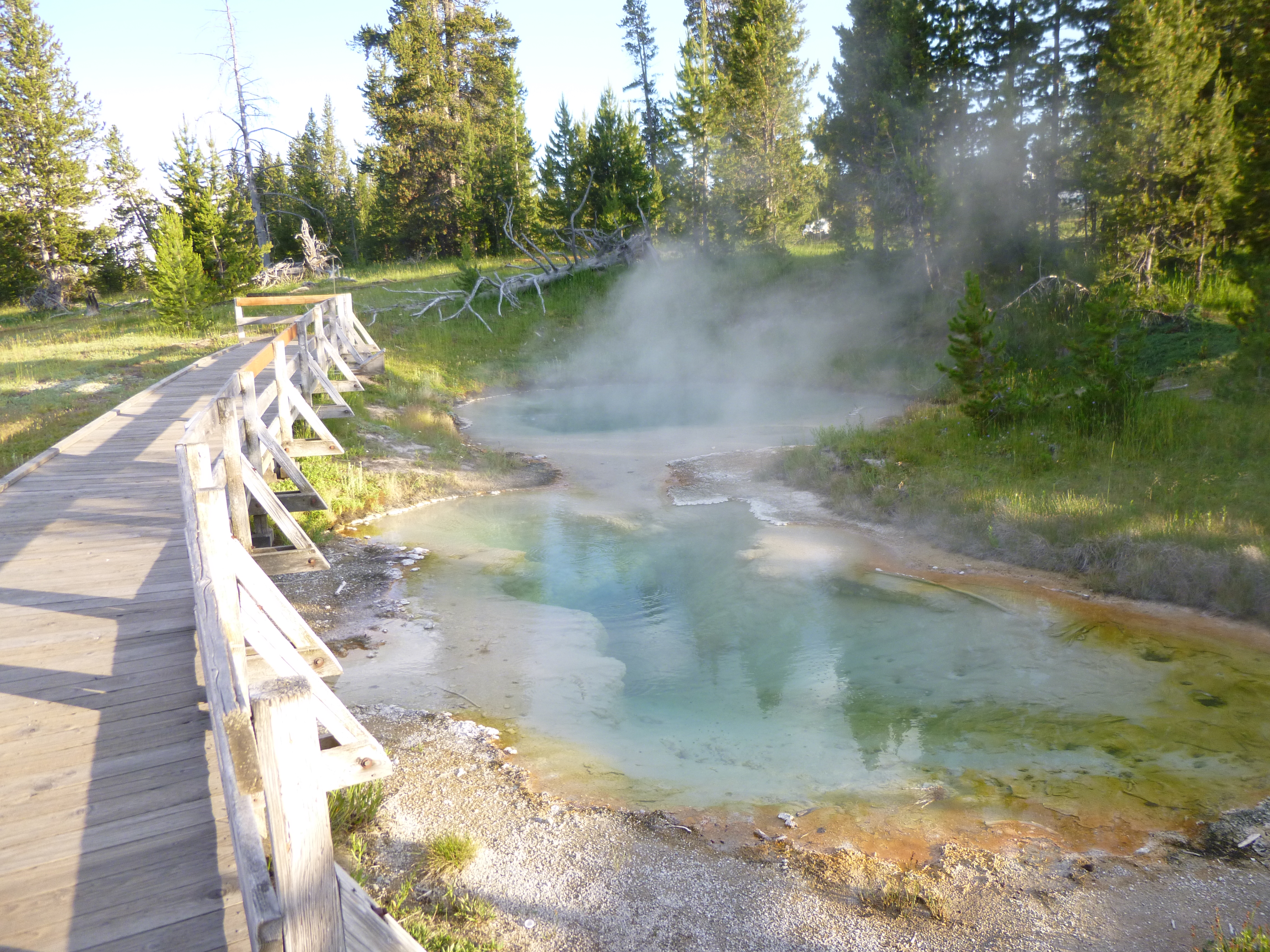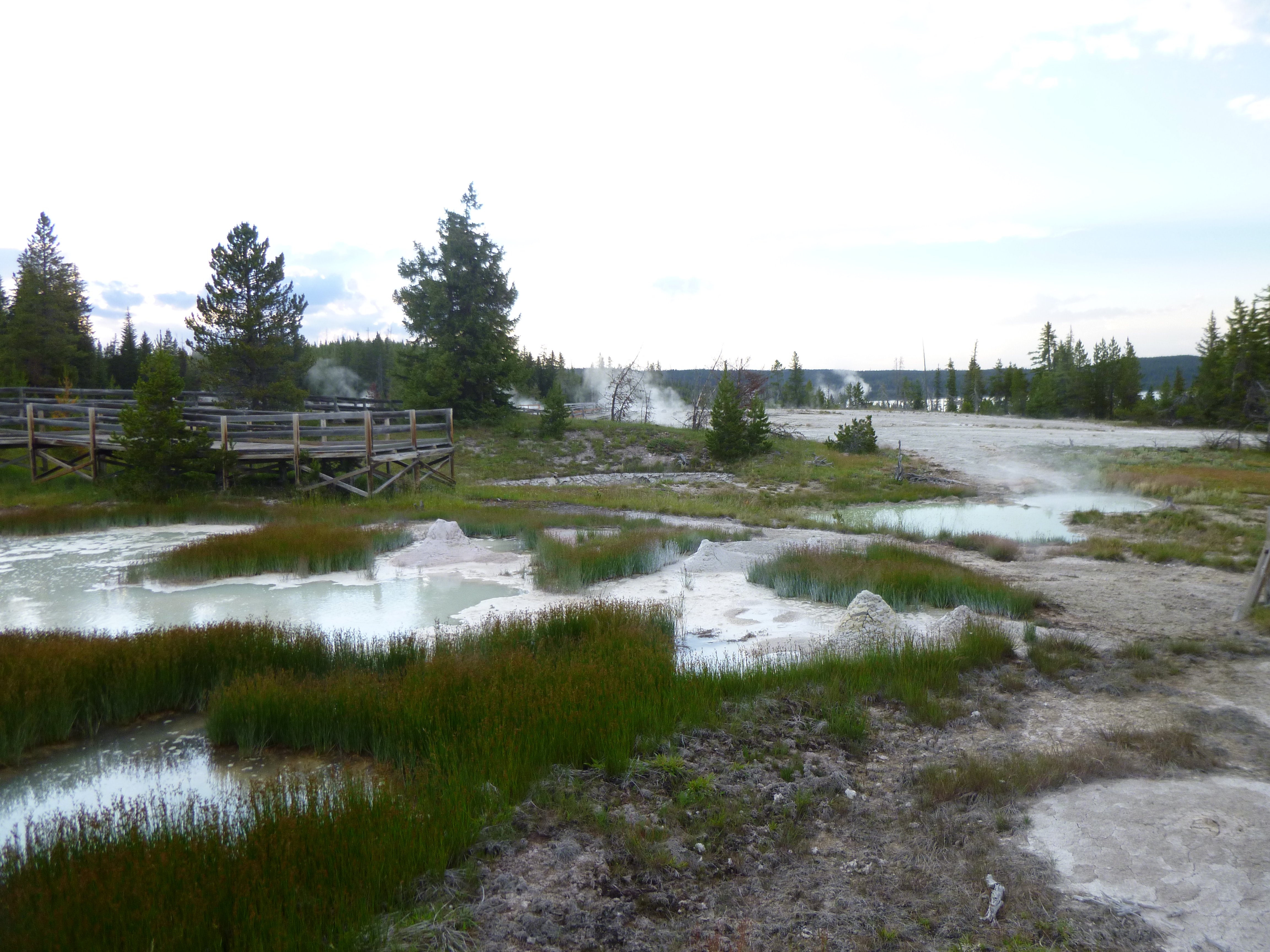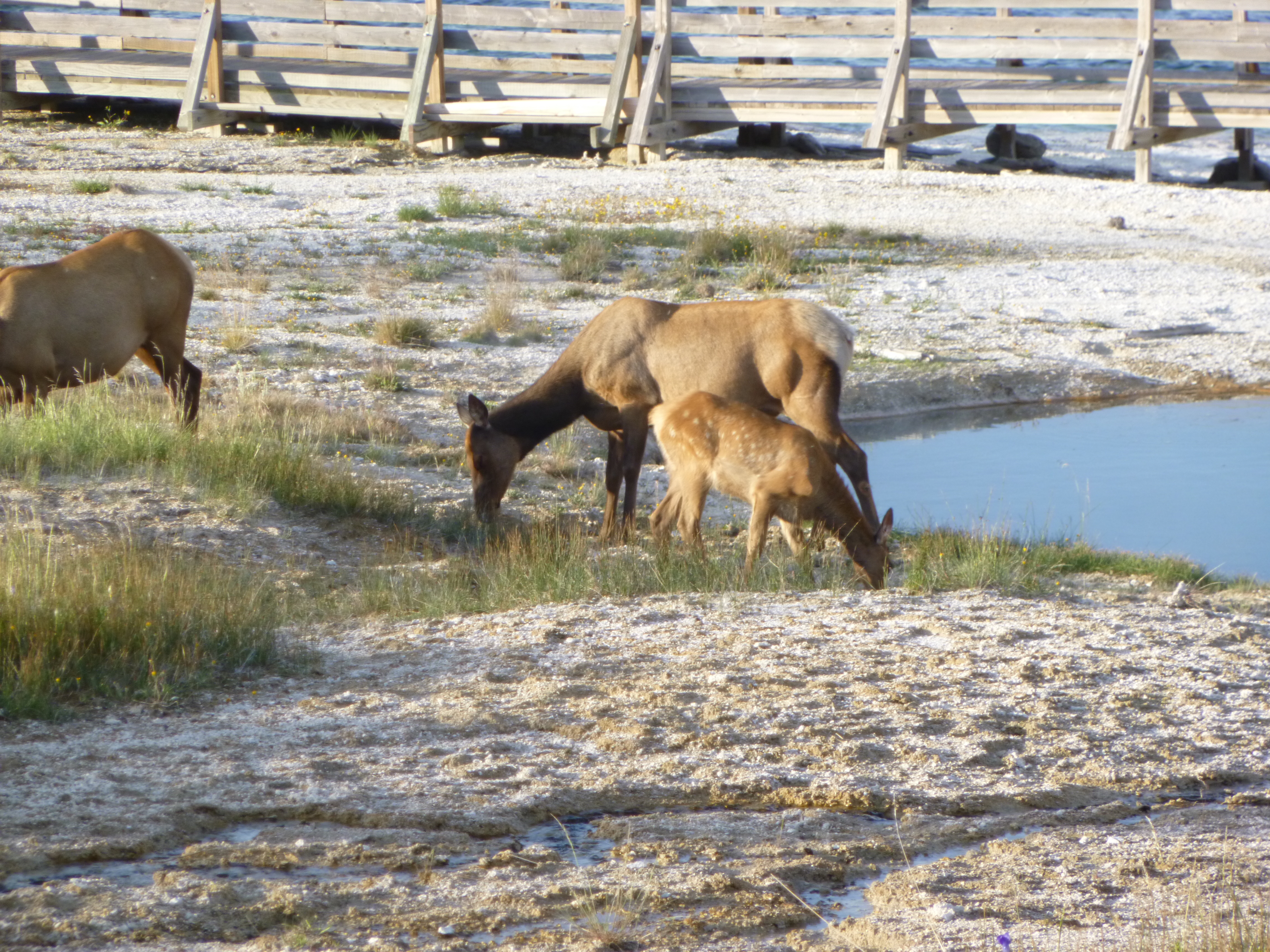 I drove on to the West Thumb area of the park, and there were some long boardwalks around some of the fragile ground, and there were more steaming holes and mud pots and bubbling mud, and so many weird things it seems like a different planet. It was evening time by now, and a beautiful time of day to be out walking around, and I had plenty of company even though it was getting later in the day. Everywhere I looked the ground was steaming. Elk can apparently walk on that terrain without breaking through the thin crust, and I got good close-up looks at mama elk and their calves. The babies had some spots on them like a baby deer.