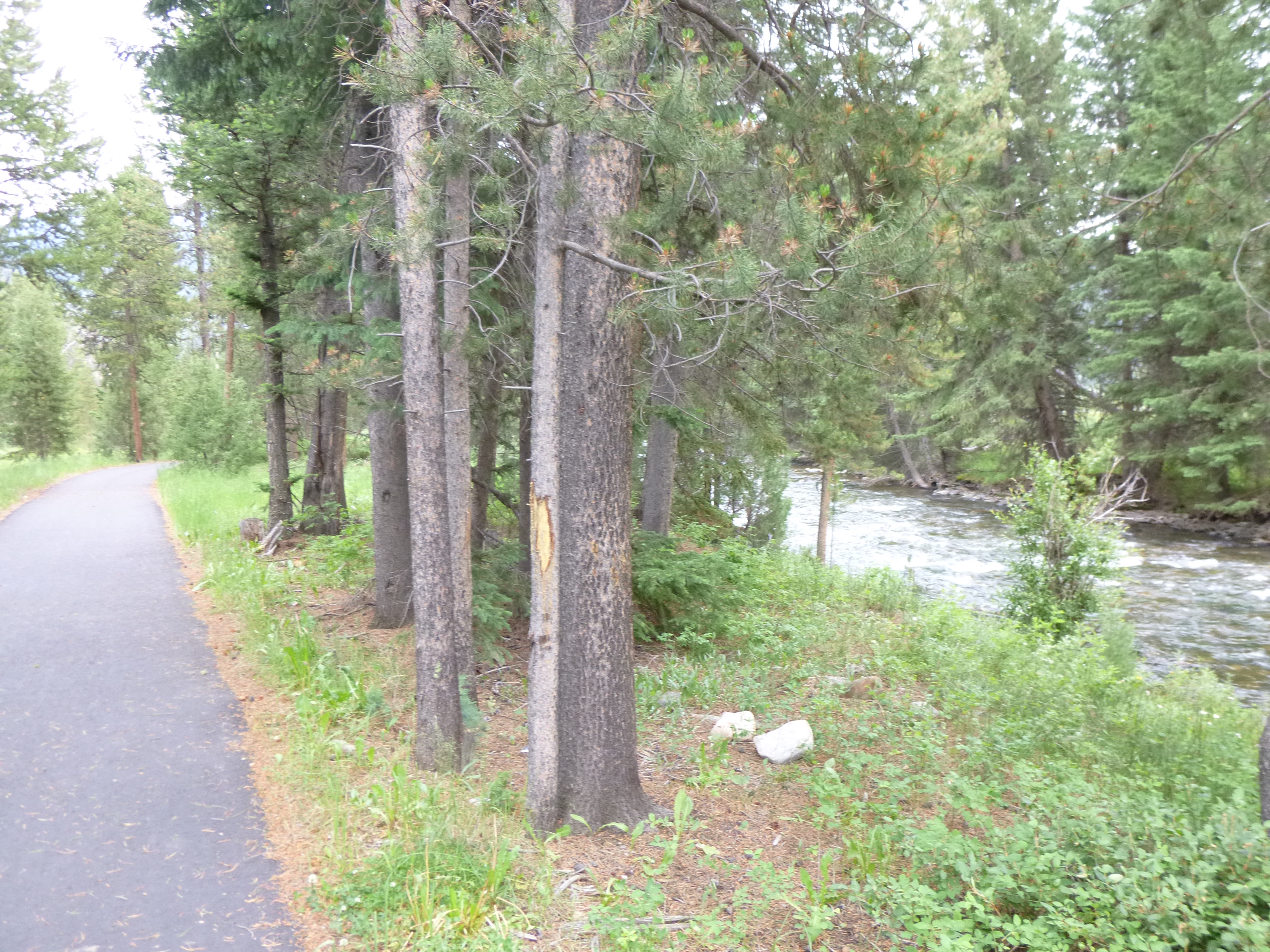 Then we found our campground at the state park, and I chose out a pretty site – they had quite a few people, but weren’t full yet since it wasn’t the weekend. Tula and I took a long walk around the place, and down to the Madison River – I was startled to look down the bank to see a beaver swimming by! I think that’s the first beaver I’ve seen in the wild. Tula was very, very intrigued by this swimming rodent, and she hopped down the bank, and I had to literally haul her back up – I don’t think that would have been a good encounter. But she sat and just gazed at it while it swam away – it made me wonder what was going through her mind! We got back to our campsite, and a couple people stopped by who had also been out for a walk. They were Jeannie and Al, and we chatted for a bit, and discovered we’re all national park fans (they have a son who is a park ranger) and they’re on an extended trip, and they were intrigued with my journey, and they even invited me to stop by their home in Washington, although I think I’ll be in Washington before they return from their travels. It was fun to talk with them and hear about some other national park places. A good end to a good day!