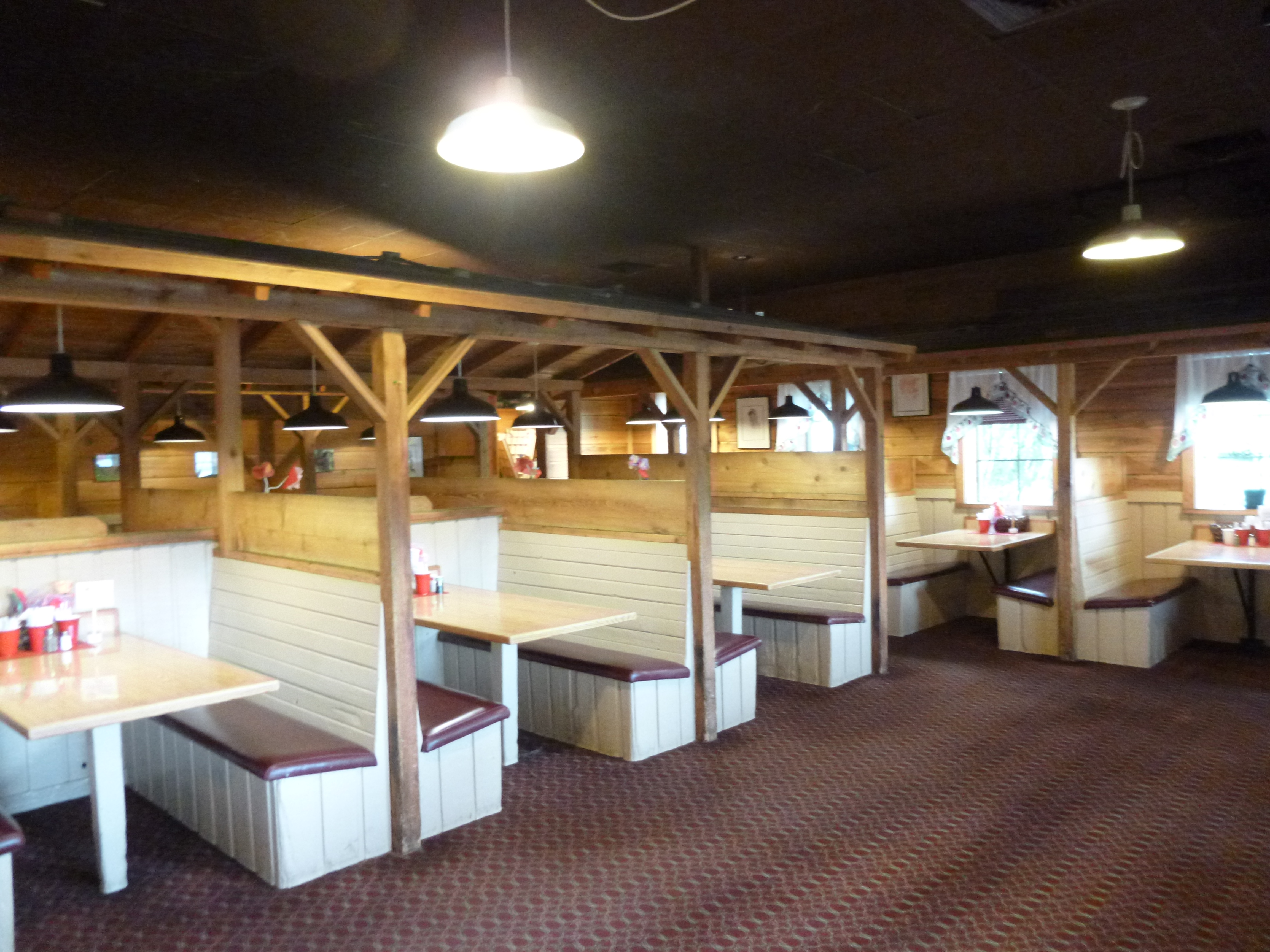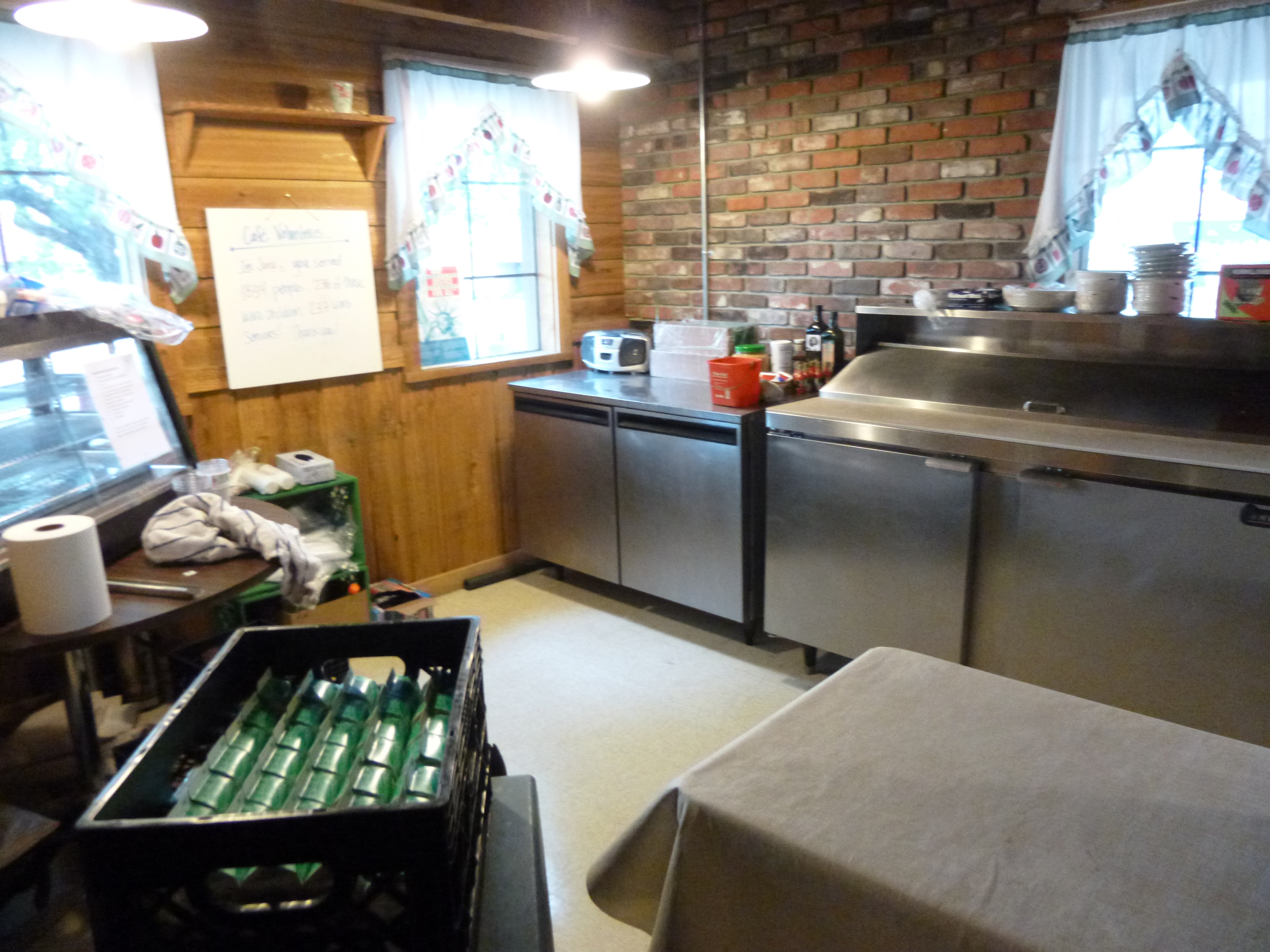 I had some other phone calls to make – I reserved a campsite at Three Forks State Park, and talked to someone at the Headwaters Food Pantry to see what they needed, and made a vet appointment for tomorrow for a blood test to check Tula’s Lyme disease levels. Then I found the Community Cafe, and Tula and I got out for a mile of walking in that neighborhood before I went inside to see what that was all about. I arrived right when Megan, the volunteer coordinator, was going to talk to a relatively new crew of volunteers (different churches in the area send over volunteers to help with the dinner) and most of my questions were answered when she was telling them how things worked. One would never, ever guess that this is a soup kitchen, and that’s how they want it to be! The Community Cafe has only been open for a little over a year (although the food bank has been around for many years), and they acquired an old restaurant/shop that used to be called the Frontier Pie Company, which sat empty for 7-8 years. So there’s a frontier motif with a lot of wood in the dining area and it’s just charming. They get homeless people in for dinner, but they also get senior citizens on fixed incomes, and families with children who occasionally can use a free meal. Megan had 7 volunteers tonight, which was plenty – one would be the hostess to greet and seat the guests, 3 would be servers (taking their orders – some want a full meal and some only want part of it, and getting either milk or water for them), and 3 would be “scoopers” – putting together the requested plates of food. The food is all prepared over at the Food Bank and brought over, but there’s a huge kitchen area in the restaurant which they are working on. They’re really excited to have a kitchen on the premises, because then they’ll also be able to offer things like cooking classes. An electrician was busy at work in there when I peeked in. Tonight they were serving a turkey dinner – kind of like Christmas in July! It’s difficult to predict how many people they will feed, but they always plan for at least 100, and they were starting off with 130 turkey slices and accompaniments today. If they begin to run short of food, Megan gets creative and if they have an especially large crowd and have to resort to sandwiches, that’s what they do. People are allowed to have seconds if they want, but they do try to keep track of the numbers of meals served. I expect their guests all enjoy visiting – it’s definitely a pleasant restaurant-like experience.