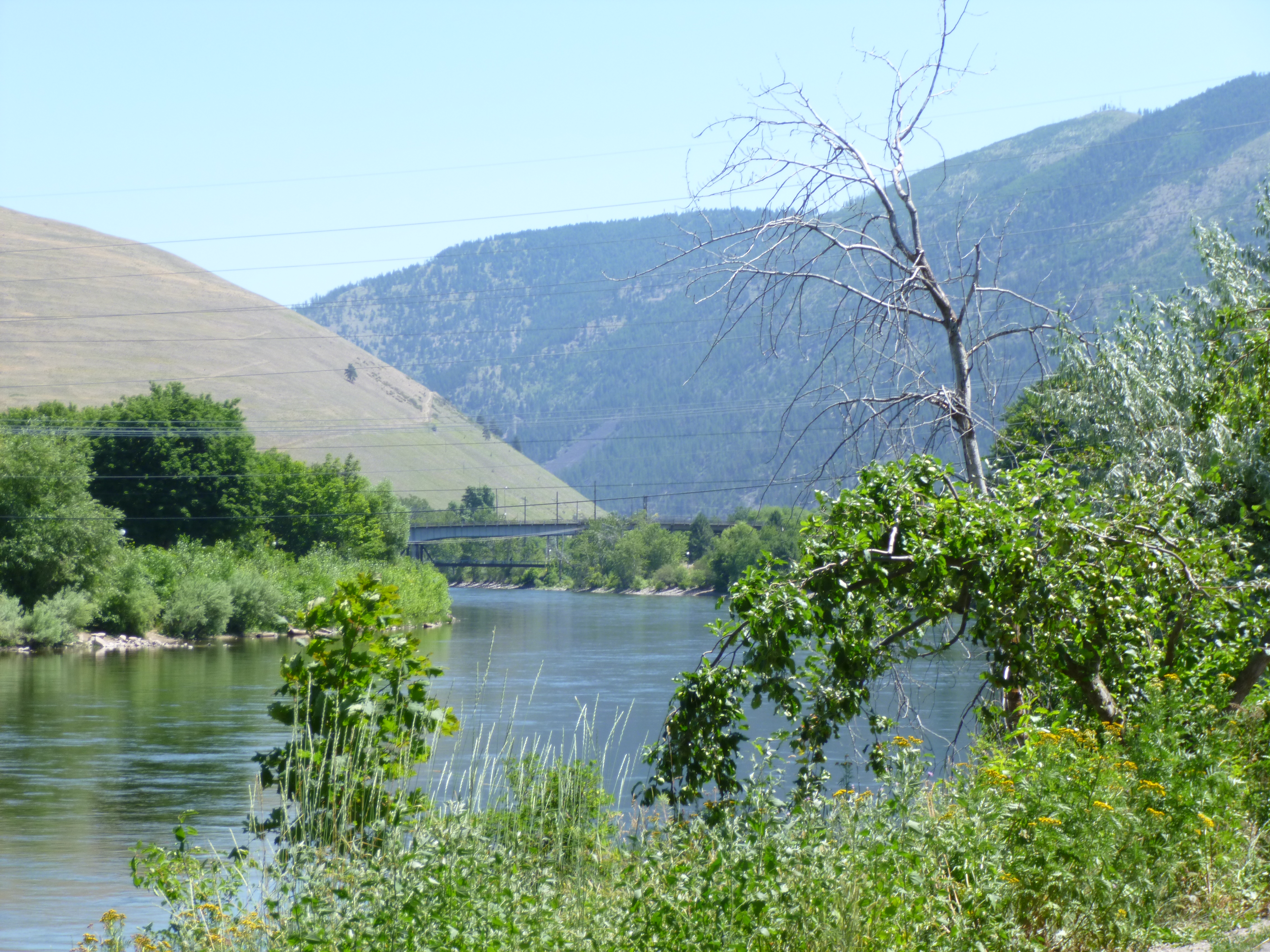 There was another bike trail on the other side of the river from where I was last night, and it was longer, so I headed over there this morning, and got 4 miles of walking done. The trail started out as a paved, well-traveled trail that went by the University of Montana (strange for me to see a different U-M – seems like University of Michigan should be the only U-M!), then the farther I went into the mountains it became a dirt trail, and I enjoyed seeing the different houses and things along the river.