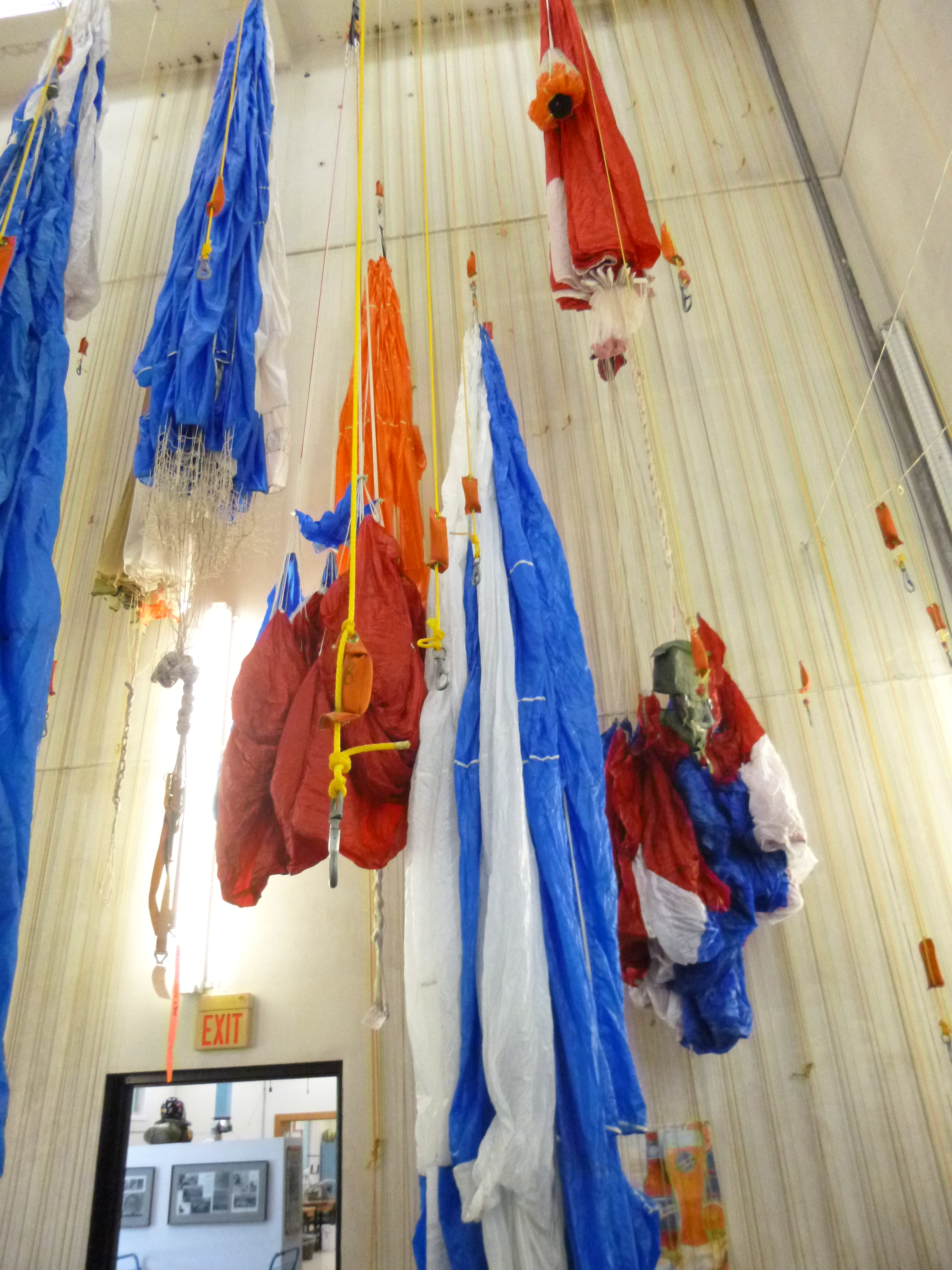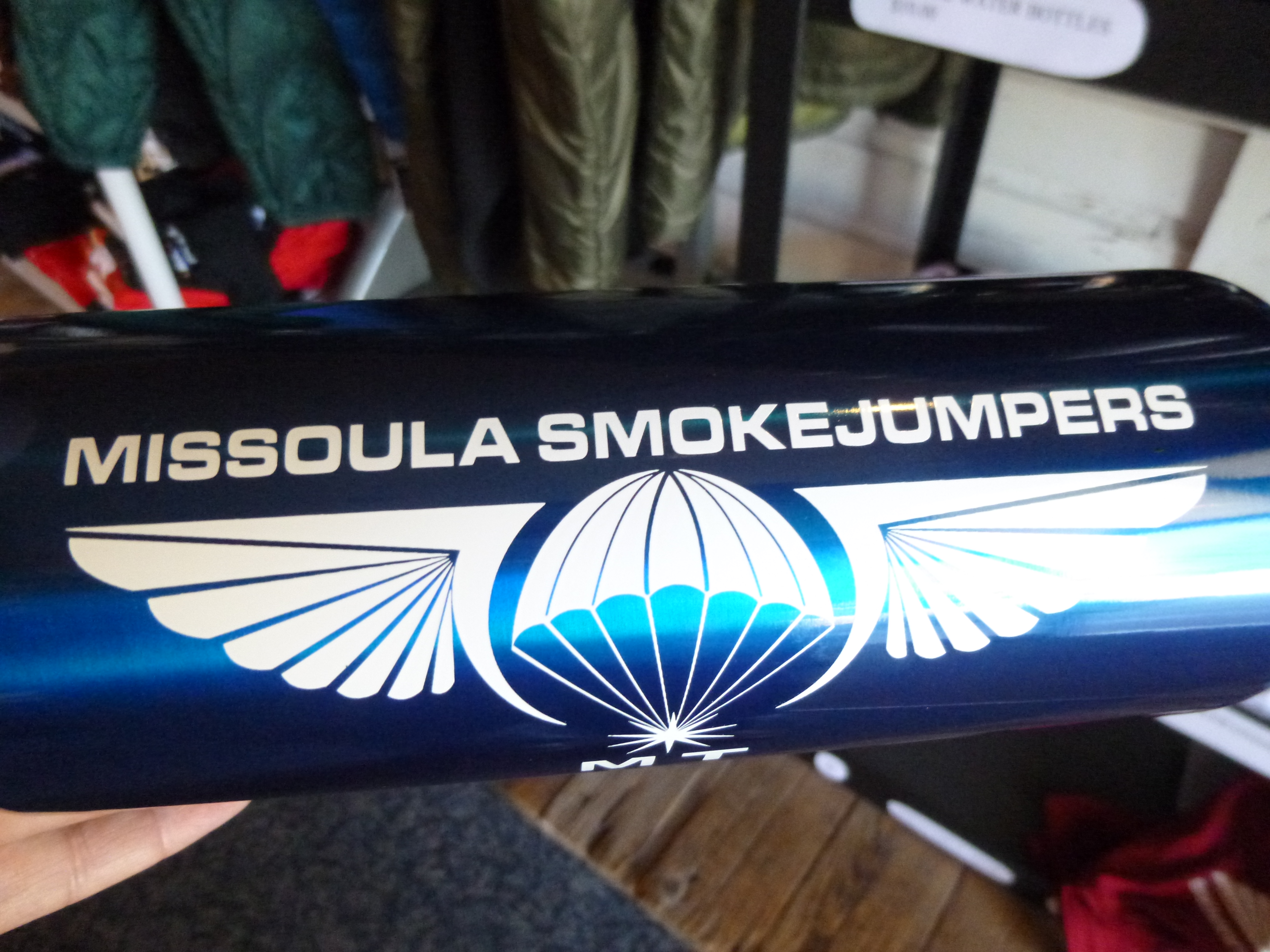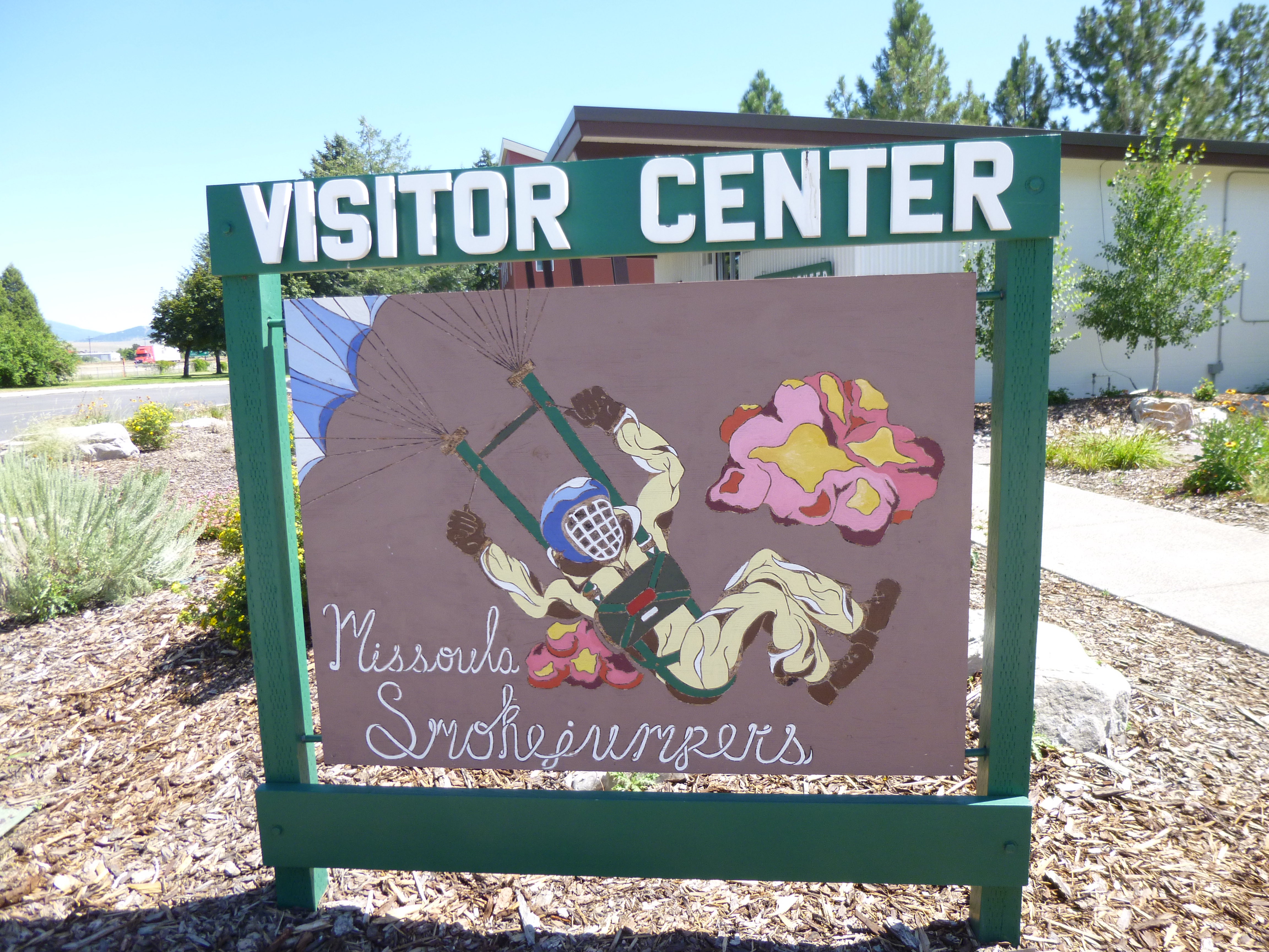 Once I walked Tula, we continued on for another hour or so to Missoula. My first destination there was to visit the Smokejumpers Base – I knew they had tours on Sunday, and I arrived just as the 3:00 tour was starting. I have been on this tour once before and it’s fascinating. Becoming a smokejumper is a demanding and competitive quest. Women can go through the training, but they are held to the exact same standards as the men, as it should be for everyone’s safety. Smokejumpers have to weigh between 120-200# (200# is the maximum weight the parachute can carry on its descent) and they go through a grueling training regimen. All of them have to have several years of firefighting experience, and some of the applicants are former military paratroopers. They have to be able to carry 80-85# packs, and all of them have to learn how to sew, since they make and repair a lot of their own gear. There are really long tables in the chute packing room, and only certified packers can pack the chutes. All of the parachutes are hung up and inspected for rips and tears after every jump, but there are not as many repairs needed as one might think. When a call comes in, they only have a matter of minutes to get fully suited up and head out to the smokejumper plane, which is always full of provisions and is ready to go. The smokejumper base is located right by the Missoula airport, and the smokejumping plane (which looks different from other planes – a different tail and wings attached at the top of the plane for faster takeoff) gets top priority for takeoff – other takeoffs and landings are temporarily delayed until the smokejumper plane is in the air. The spotter (also a smokejumper but not jumping on the current mission) selects the “safe zone” and it’s his/her responsibility to tap each of the jumpers on the shoulder at the exact moment they need to go. The jumpers go out in pairs, and their food, tools and gear is all packaged in pairs, and is dropped on the next pass around. The jumpers land (and if they accidentally land in a tree, they have to know how to climb down), then gather up their gear, establish their safe zone and get to work. They never know how long they’ll be out on a job, and if more food or provisions are needed in a couple days, a plane will come by again and drop more supplies. Once a fire is successfully out, they have to pack up all their gear (the 80# or so) and hike out to some road where they can be picked up – it might be a 2 mile hike, or it might be a 30 mile hike – hence the long training hikes in full gear. There were only 4 smokejumpers on base today – the rest of them were out on other missions. There is a dormitory at the base, and everyone has assigned lockers for their gear, and they use a buddy system to make sure all the gear is put on and fastened correctly. They are not particularly well paid – starting at $14/15 dollars and hour – they do it because they love what they do, and also partly for the thrill of it – it is said they might all be just a little bit crazy! I made a donation here to the Smokejumpers Wellfare Fund – there was one fund for them, and another for maintenance of the visitor center, but I wanted mine to go toward injured smokejumpers and their families. They’re brave and courageous people!