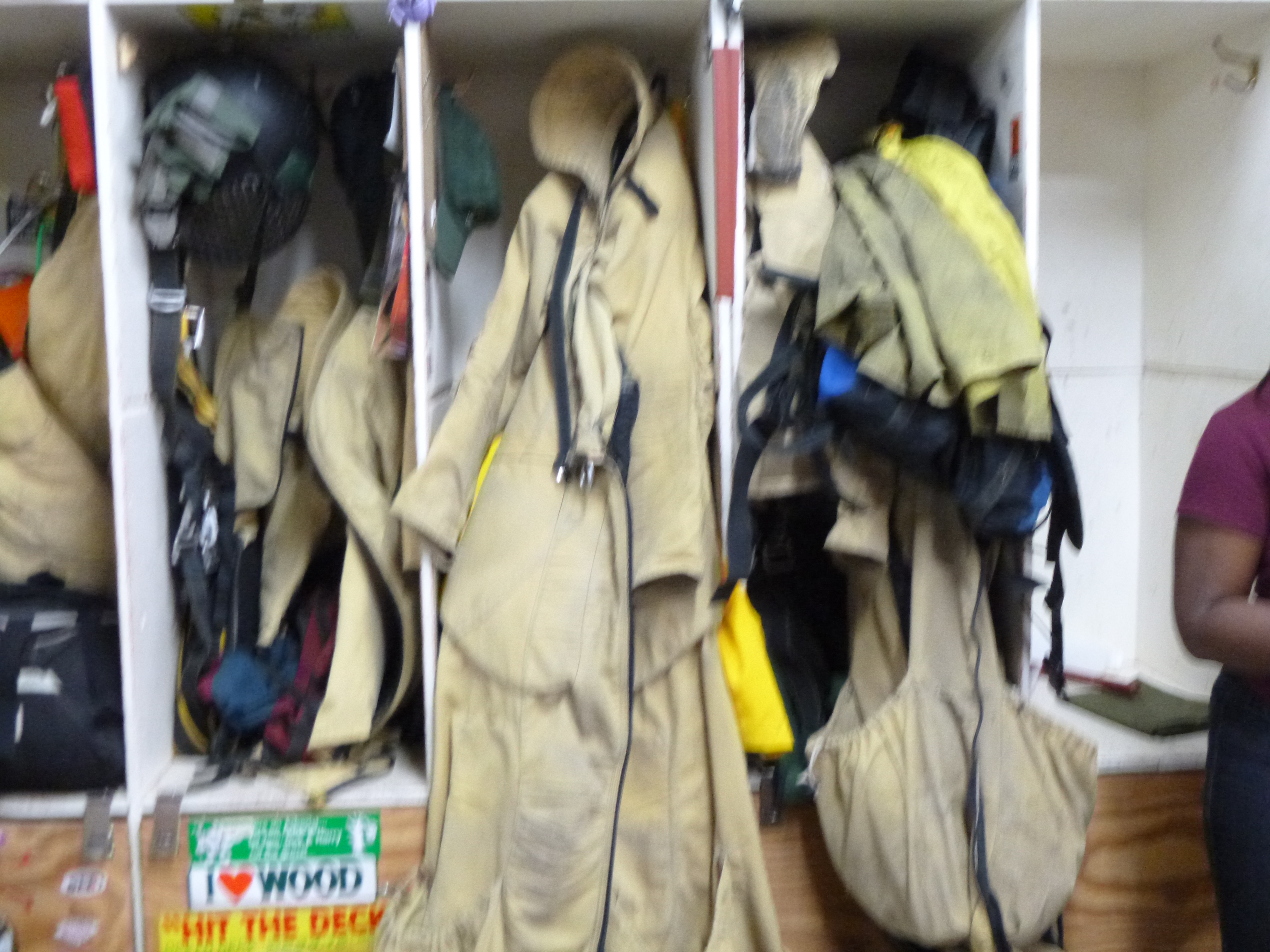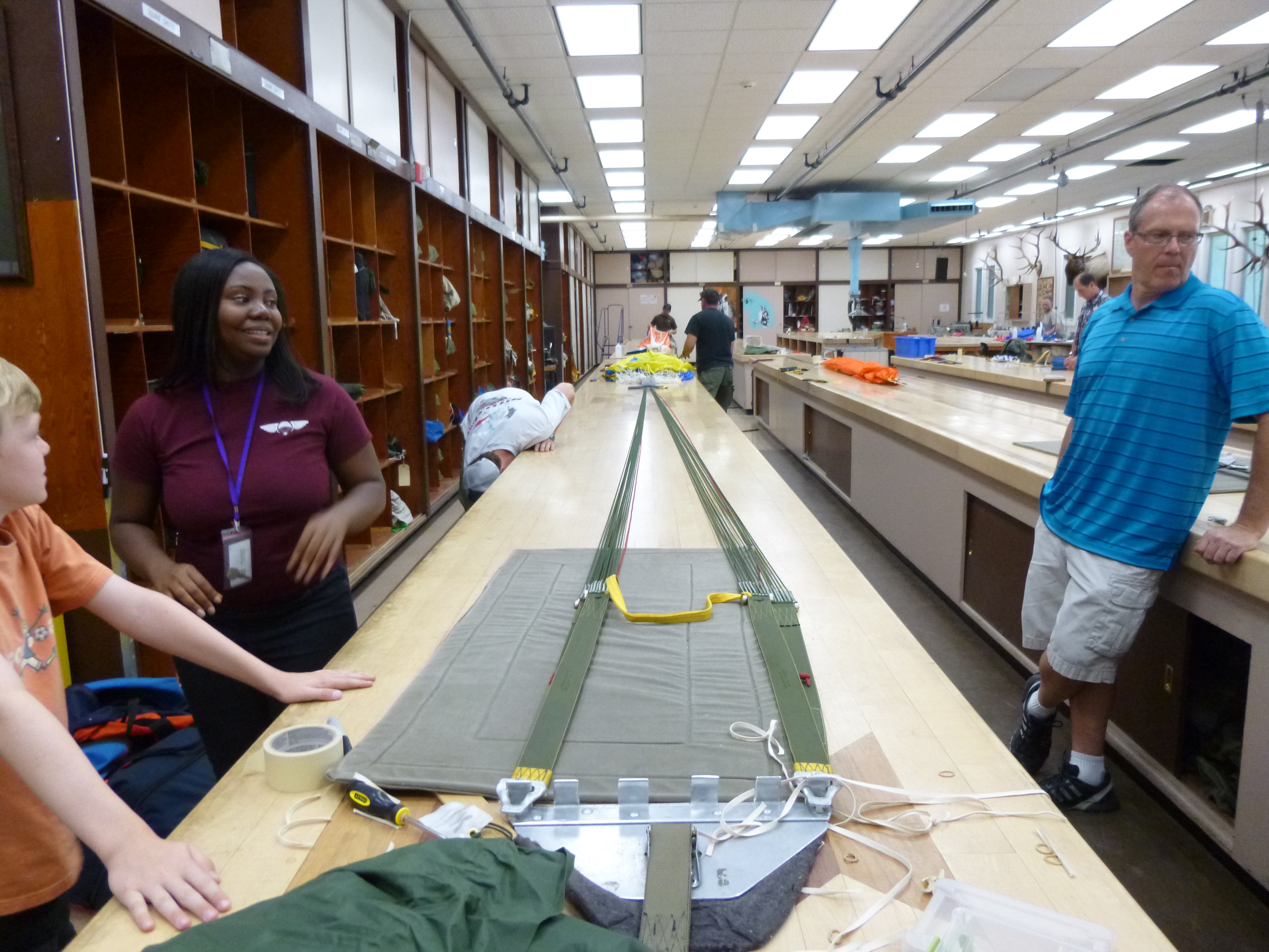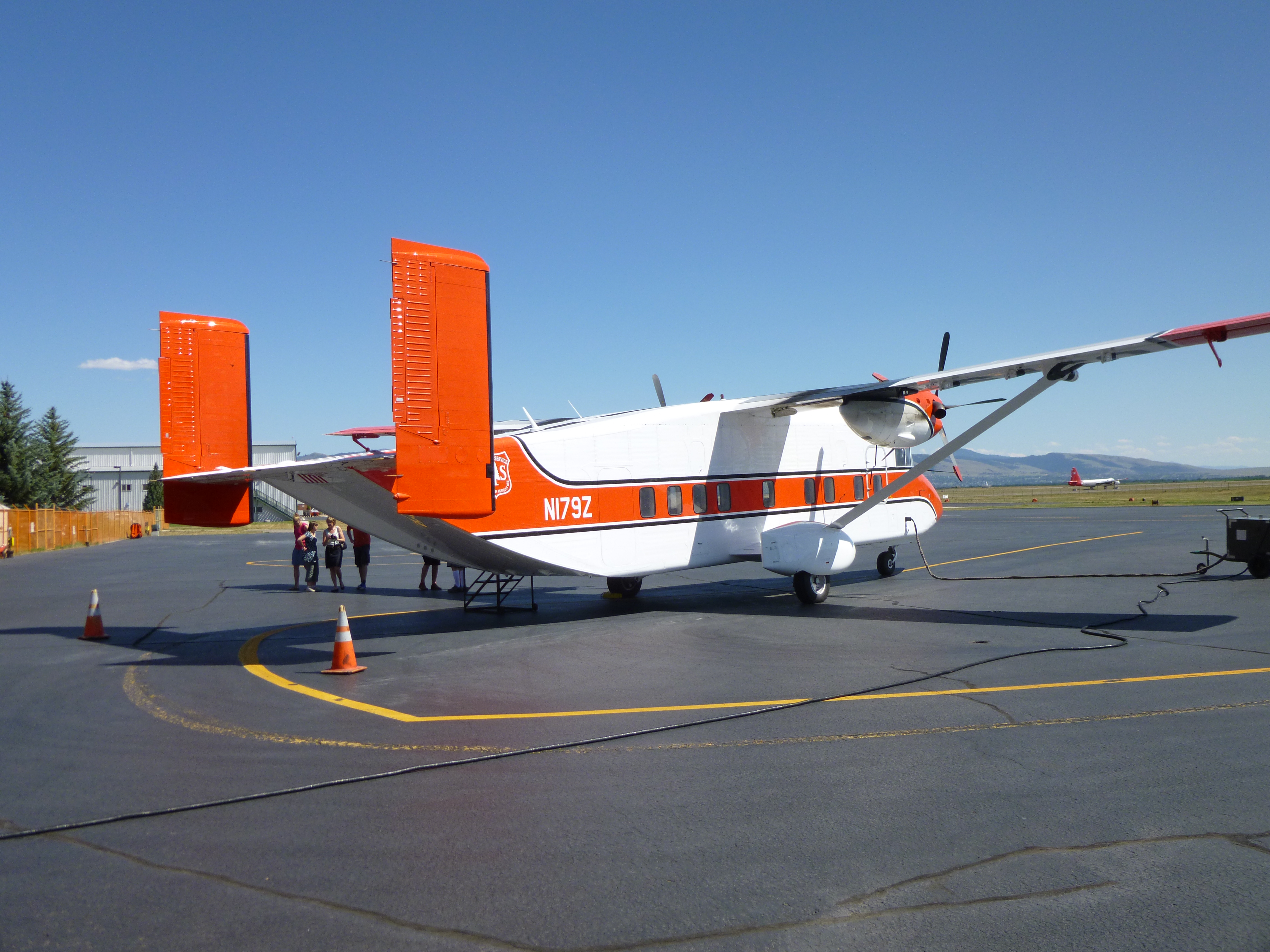 Once I walked Tula, we continued on for another hour or so to Missoula. My first destination there was to visit the Smokejumpers Base – I knew they had tours on Sunday, and I arrived just as the 3:00 tour was starting. I have been on this tour once before and it’s fascinating. Becoming a smokejumper is a demanding and competitive quest. Women can go through the training, but they are held to the exact same standards as the men, as it should be for everyone’s safety. Smokejumpers have to weigh between 120-200# (200# is the maximum weight the parachute can carry on its descent) and they go through a grueling training regimen. All of them have to have several years of firefighting experience, and some of the applicants are former military paratroopers. They have to be able to carry 80-85# packs, and all of them have to learn how to sew, since they make and repair a lot of their own gear. There are really long tables in the chute packing room, and only certified packers can pack the chutes. All of the parachutes are hung up and inspected for rips and tears after every jump, but there are not as many repairs needed as one might think. When a call comes in, they only have a matter of minutes to get fully suited up and head out to the smokejumper plane, which is always full of provisions and is ready to go. The smokejumper base is located right by the Missoula airport, and the smokejumping plane (which looks different from other planes – a different tail and wings attached at the top of the plane for faster takeoff) gets top priority for takeoff – other takeoffs and landings are temporarily delayed until the smokejumper plane is in the air. The spotter (also a smokejumper but not jumping on the current mission) selects the “safe zone” and it’s his/her responsibility to tap each of the jumpers on the shoulder at the exact moment they need to go. The jumpers go out in pairs, and their food, tools and gear is all packaged in pairs, and is dropped on the next pass around. The jumpers land (and if they accidentally land in a tree, they have to know how to climb down), then gather up their gear, establish their safe zone and get to work. They never know how long they’ll be out on a job, and if more food or provisions are needed in a couple days, a plane will come by again and drop more supplies. Once a fire is successfully out, they have to pack up all their gear (the 80# or so) and hike out to some road where they can be picked up – it might be a 2 mile hike, or it might be a 30 mile hike – hence the long training hikes in full gear. There were only 4 smokejumpers on base today – the rest of them were out on other missions. There is a dormitory at the base, and everyone has assigned lockers for their gear, and they use a buddy system to make sure all the gear is put on and fastened correctly. They are not particularly well paid – starting at $14/15 dollars and hour – they do it because they love what they do, and also partly for the thrill of it – it is said they might all be just a little bit crazy! I made a donation here to the Smokejumpers Wellfare Fund – there was one fund for them, and another for maintenance of the visitor center, but I wanted mine to go toward injured smokejumpers and their families. They’re brave and courageous people!