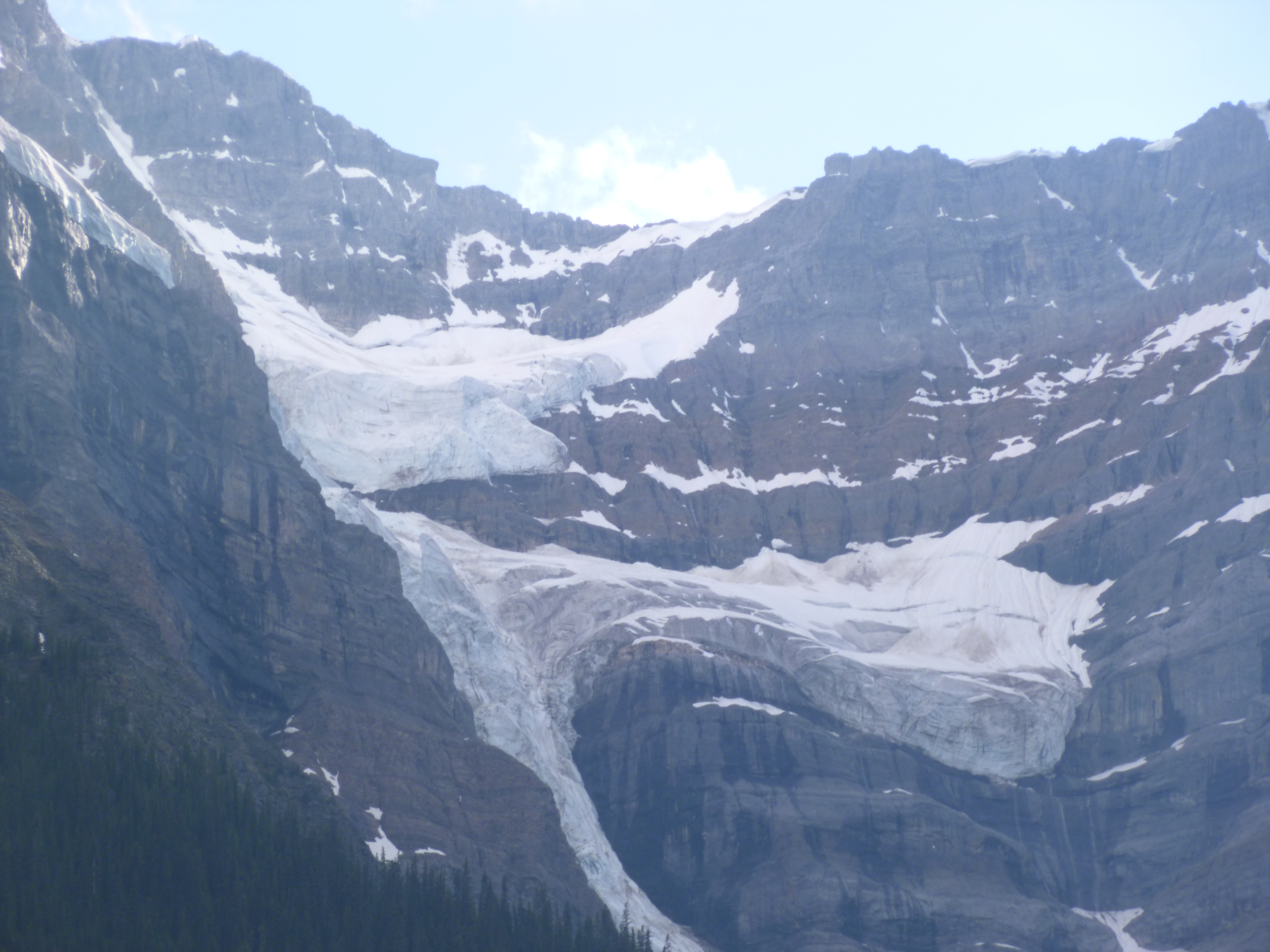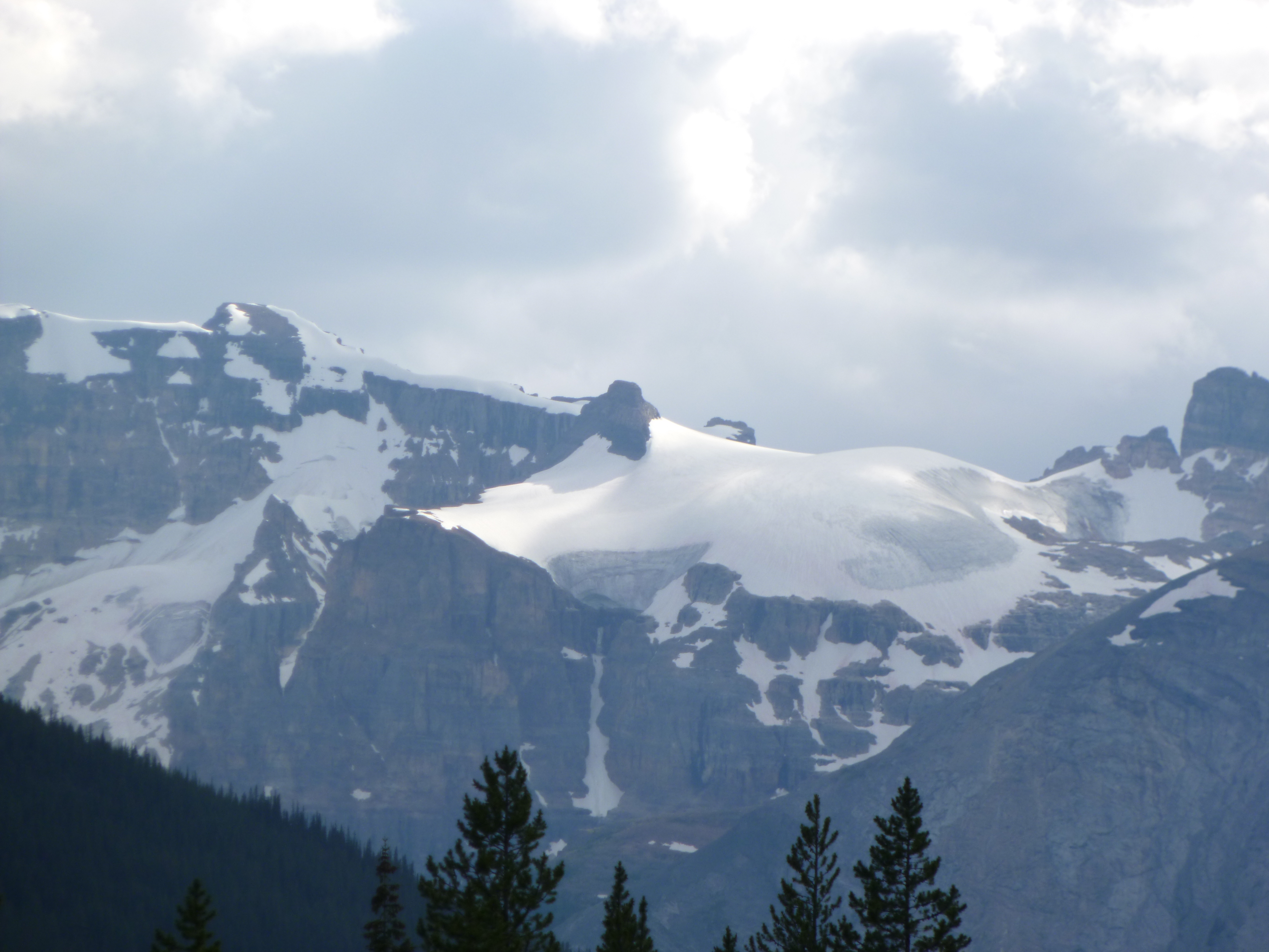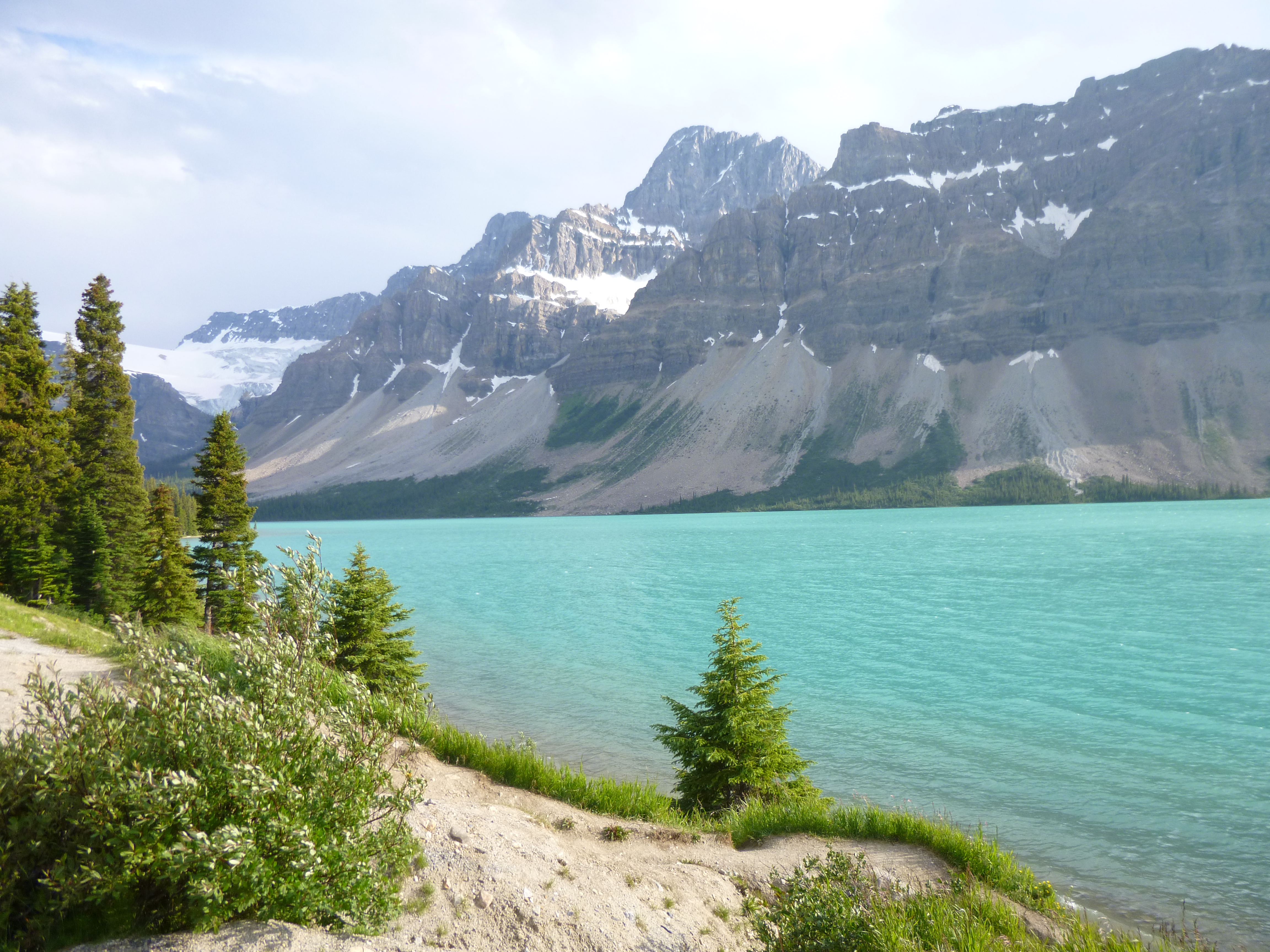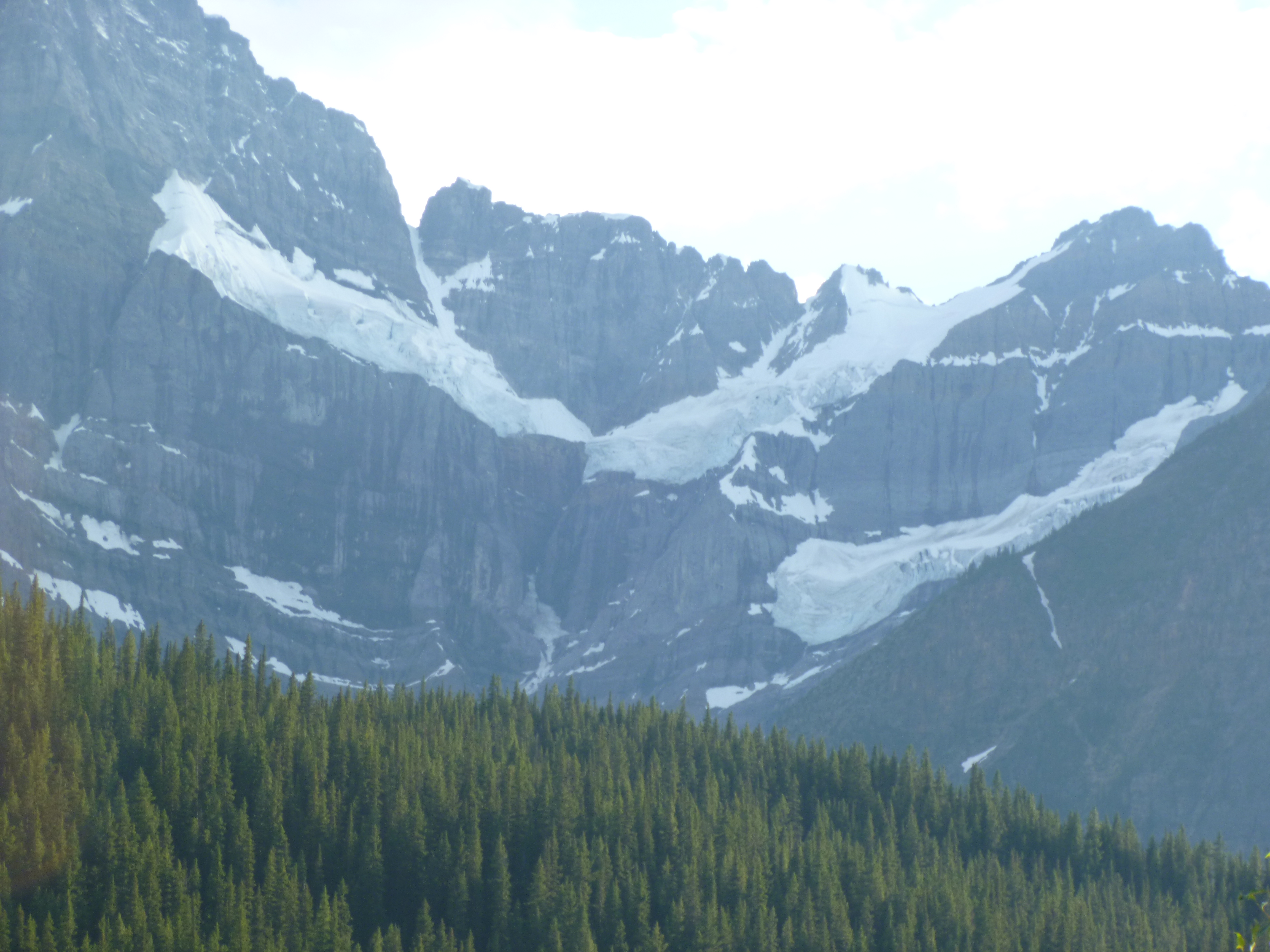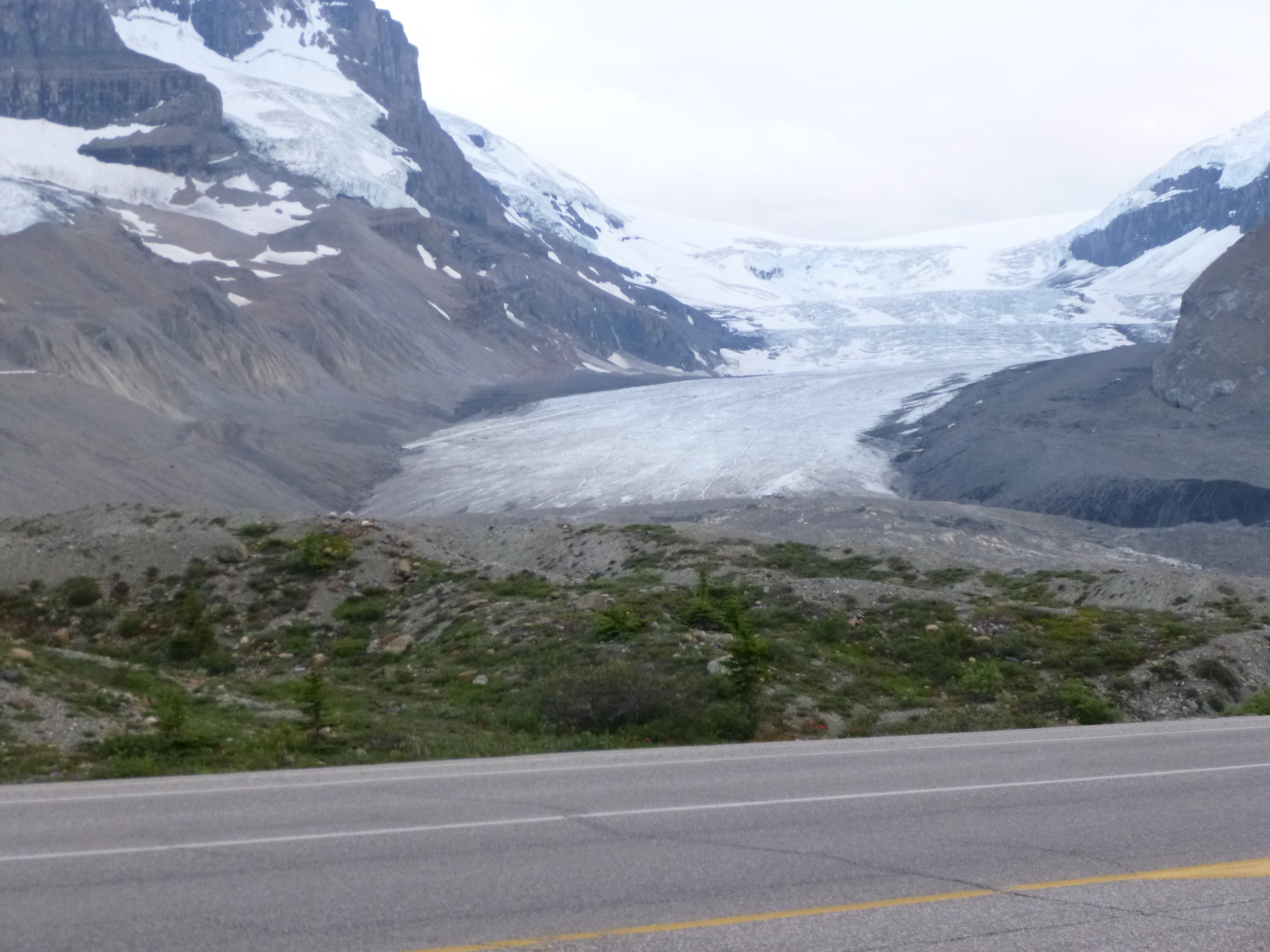 The last time I drove to Alaska, I came through Canada’s national parks from north to south as I drove back to Michigan. This time I wanted to drive through them from south to north. It was no accident I finished my Montana week where I did – I really wanted the excuse to drive through these parks again. And they did not disappoint. The Canadian Rockies are spectacular! Like I did in Glacier, I ended up making lots of stops and getting out to enjoy the views. They’re trying to reduce wildlife collisions and there were several “wild animal bridges” with lots of grass and trees (and some fencing to guide them onto the bridges instead of crossing the highway.) I’m curious how successful that is. There was lots of snow in the higher elevations and countless glaciers high up in the mountains. And then there were lakes here and there and the water was such a pretty icy blue-green color. Even after hours of driving in such splendor, it never gets old. Words and photos can’t do justice to the scenery. I felt lucky to be able to enjoy so much of it. As evening wore on, a bear crossed the road in front of me, and I slowed down and stopped as it climbed the hill next to the van, snacking on some grasses and shrub branches. Other cars then stopped and the bear ambled away into the hills.