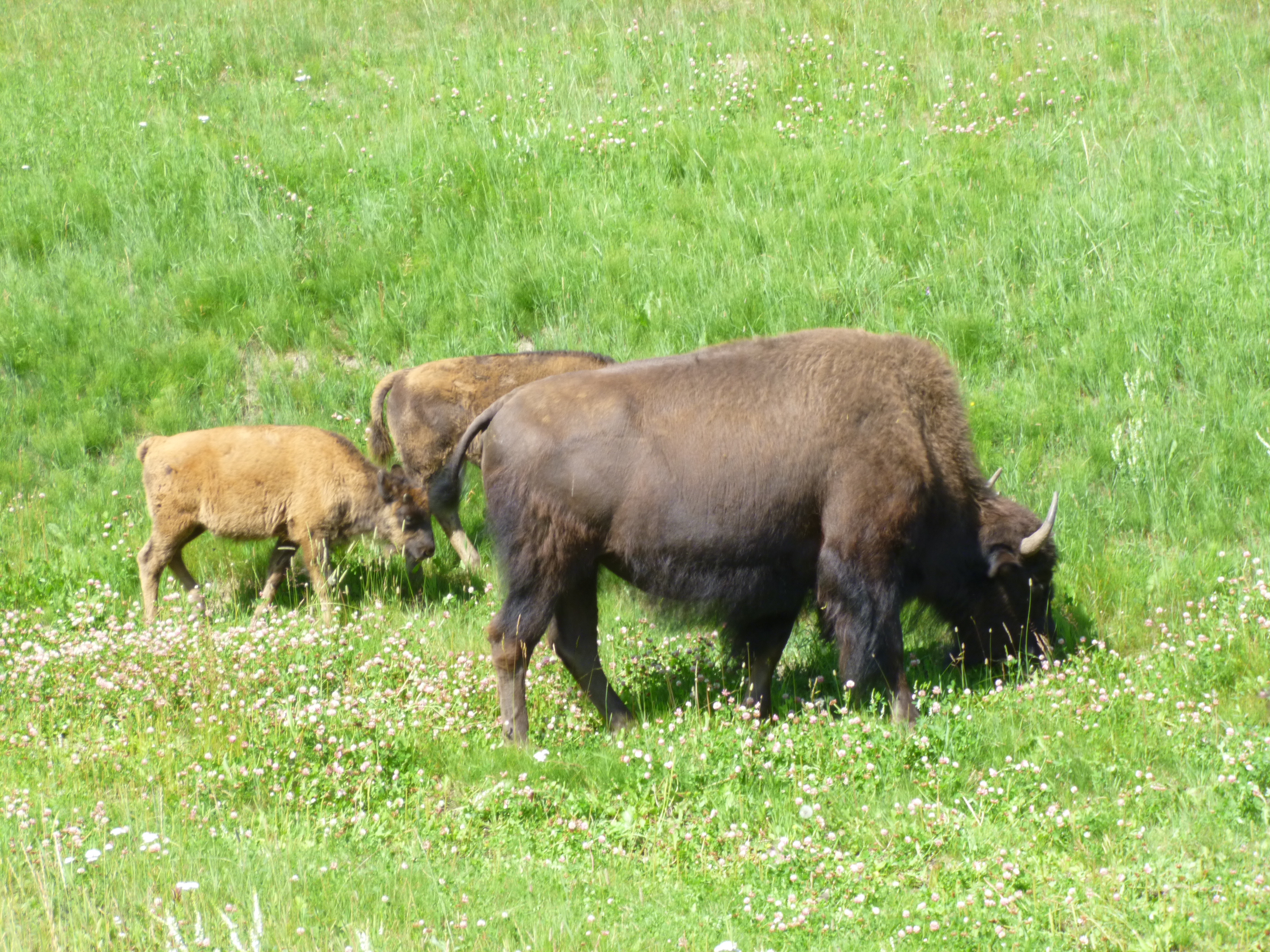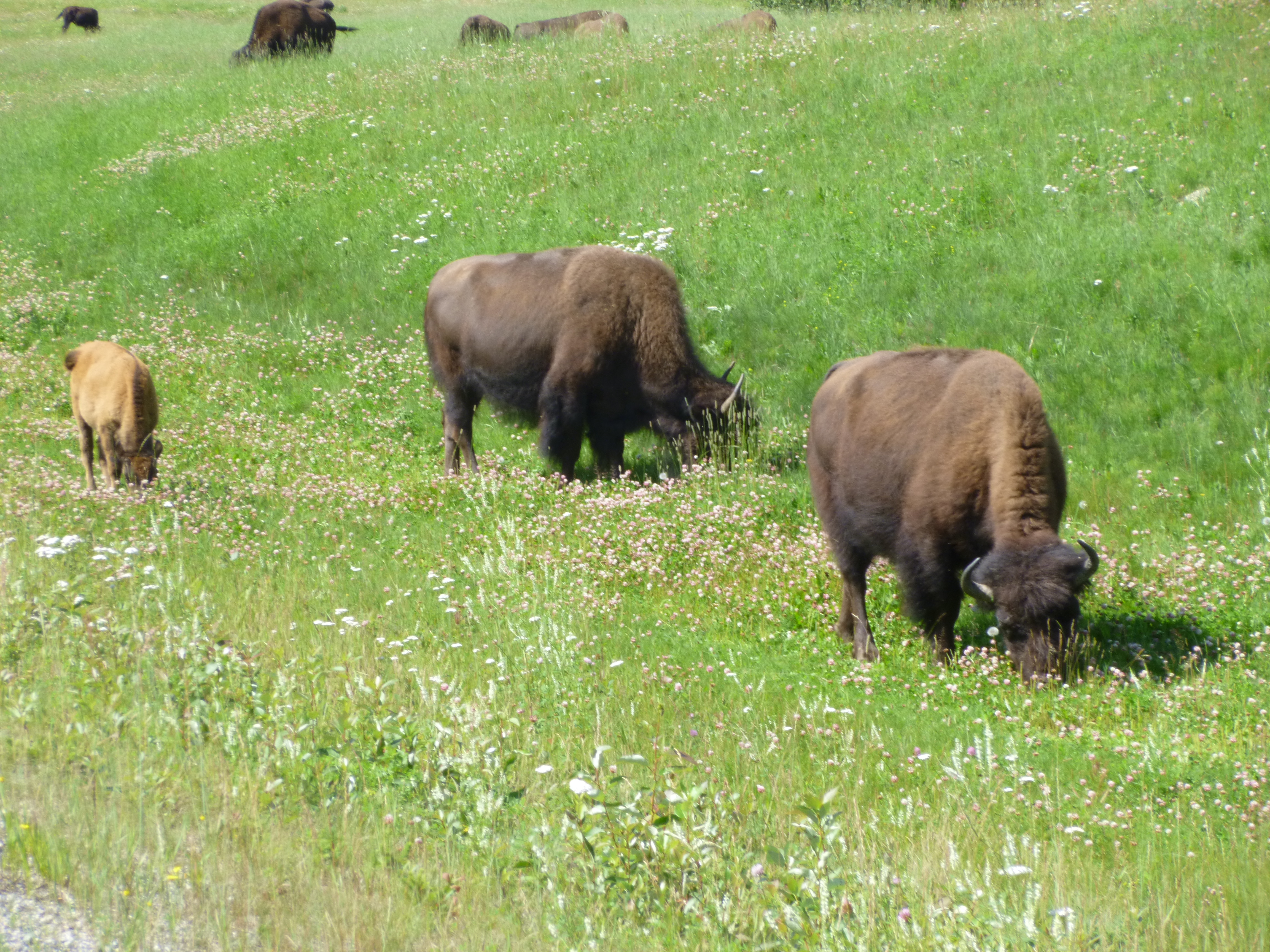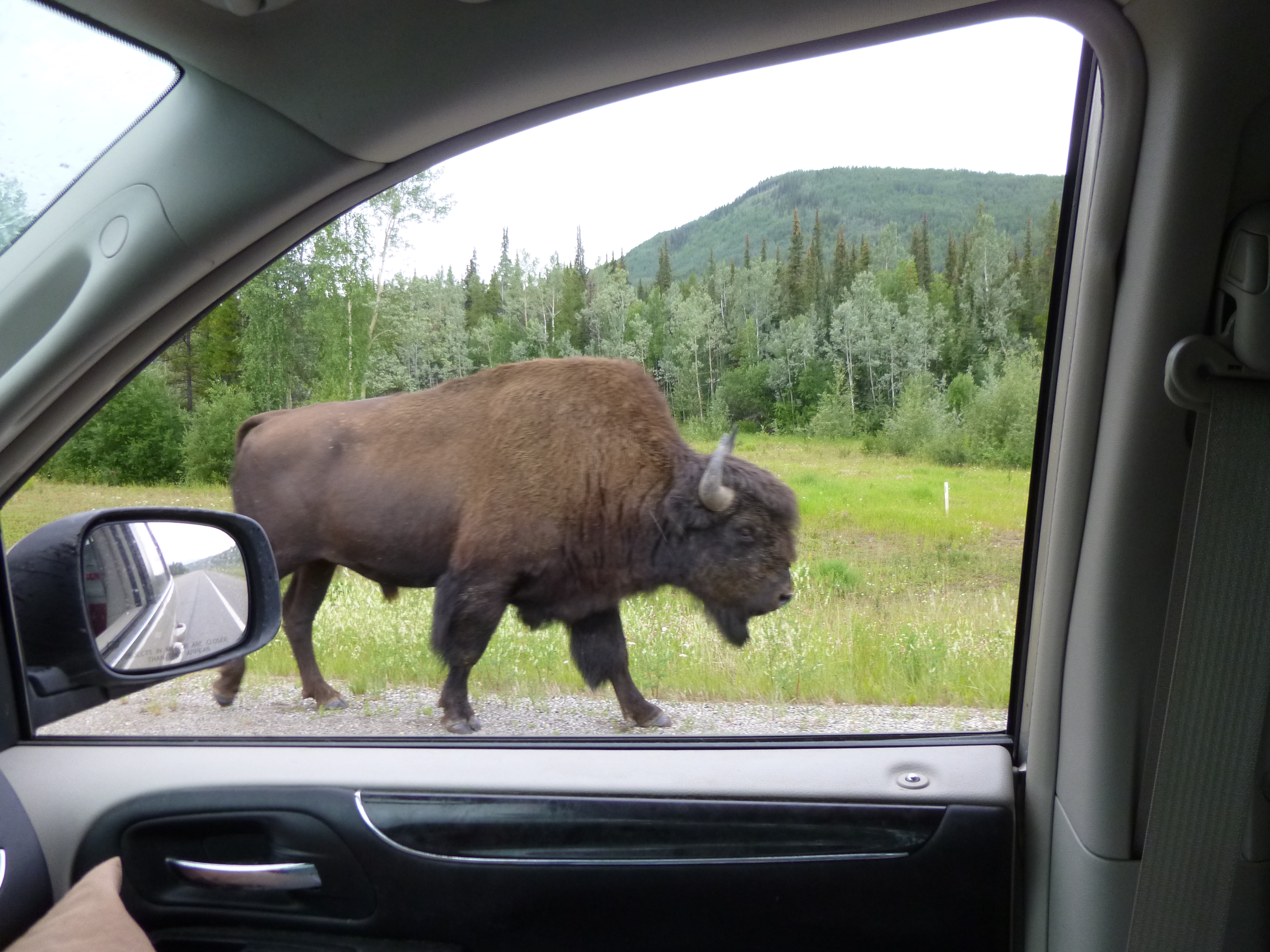 Most of the driving this afternoon was the 500 miles between Fort Nelson and Watson Lake. There was very little civilization between the 2 towns – just wide open space, some mountains and forests, and meadows. I was surprised to see signs cautioning motorists about the buffalo – I had no idea they were this far north. And sure enough, I passed several big herds of them – I like the little cinnamon-colored babies. They don’t pay any attention to traffic of course, and one baby was on the wrong side of the road from its mama, and it made kind of a funny little noise between a grunt and a moo. There were a couple herds of them, and a number of loners miles apart, just laying in the grasses and meadows by the road. At one point, I passed 2 buffalo just kind of plodding along the shoulder, looking like a couple of weary hitch-hikers.
