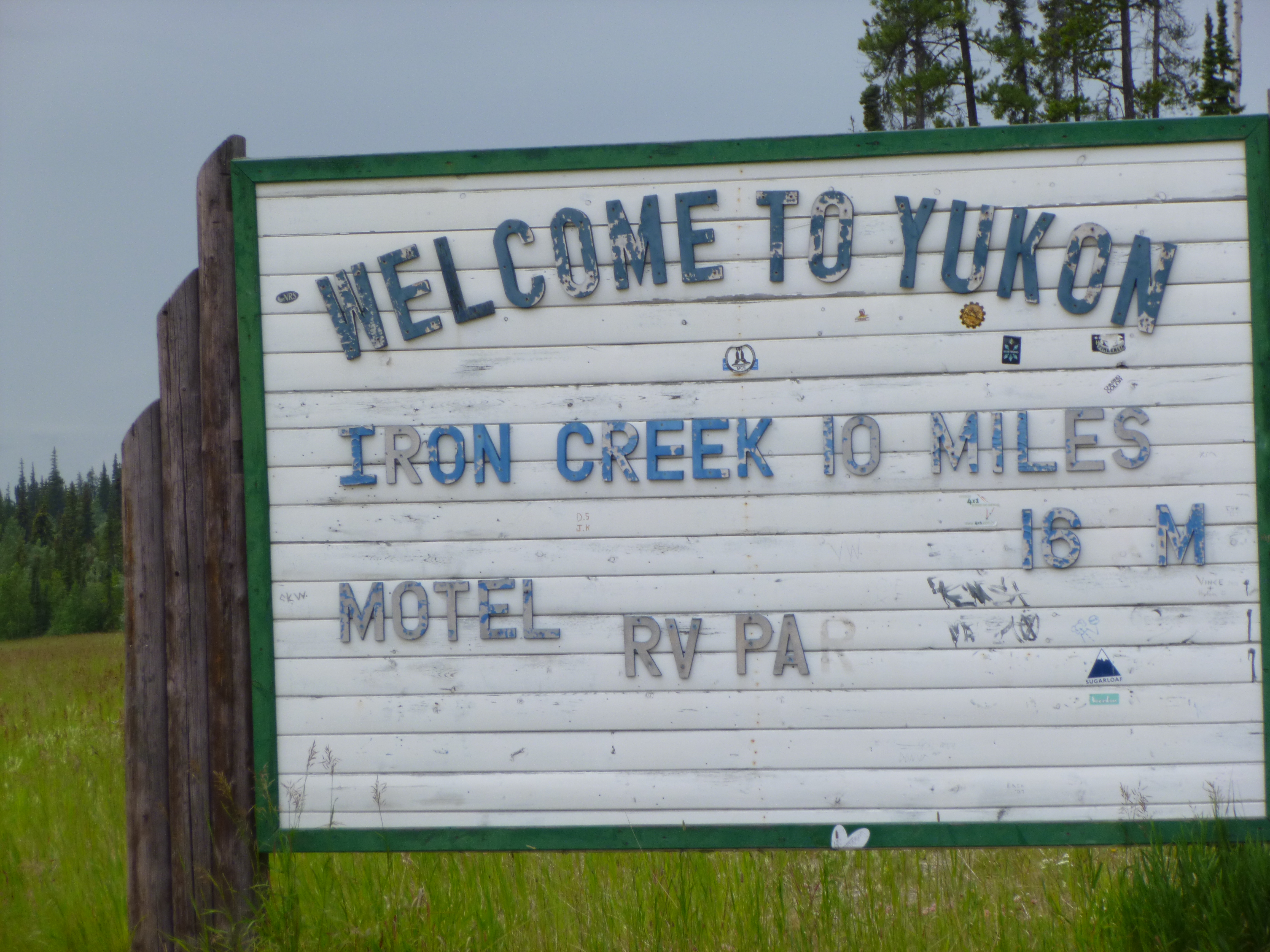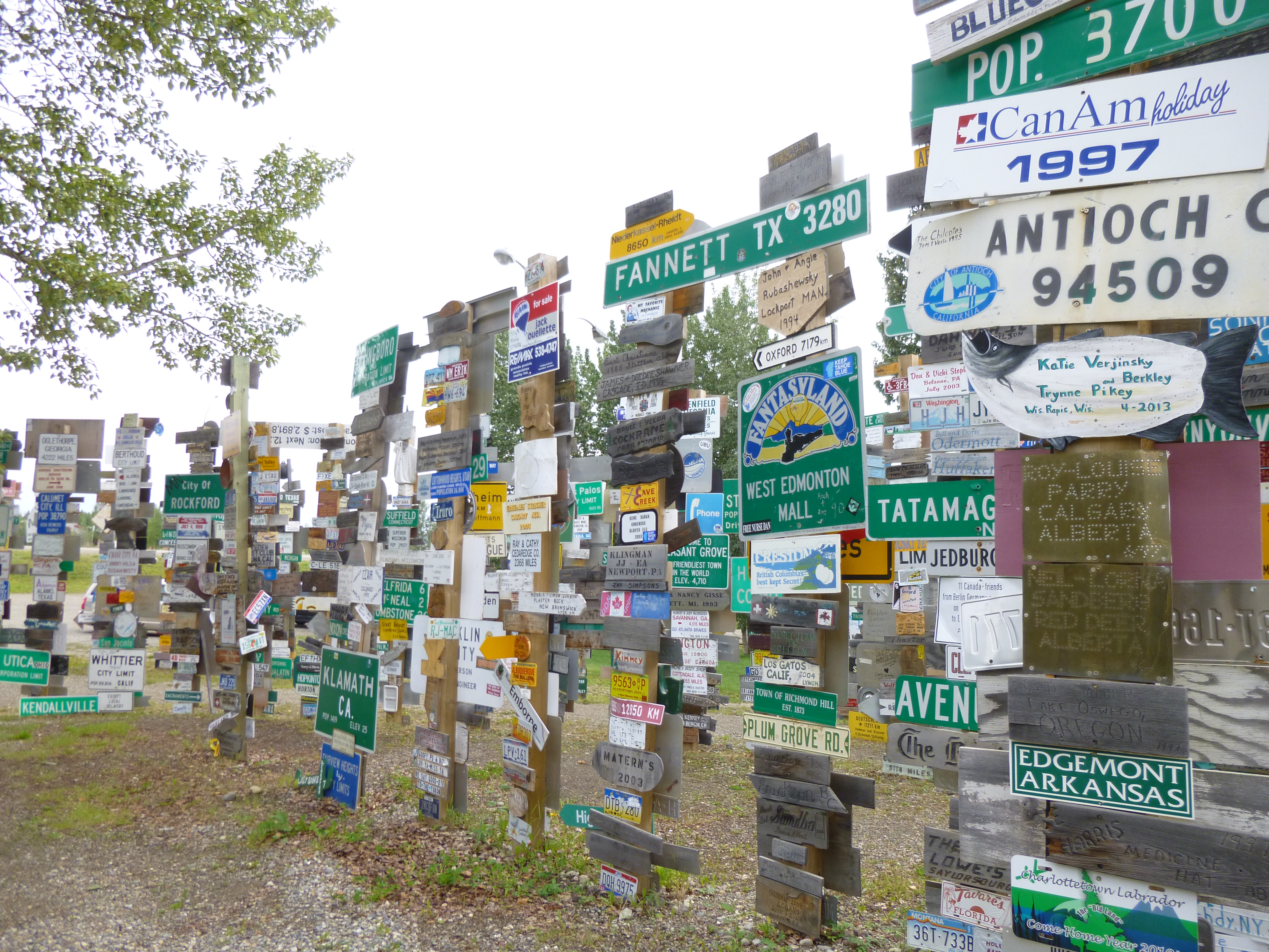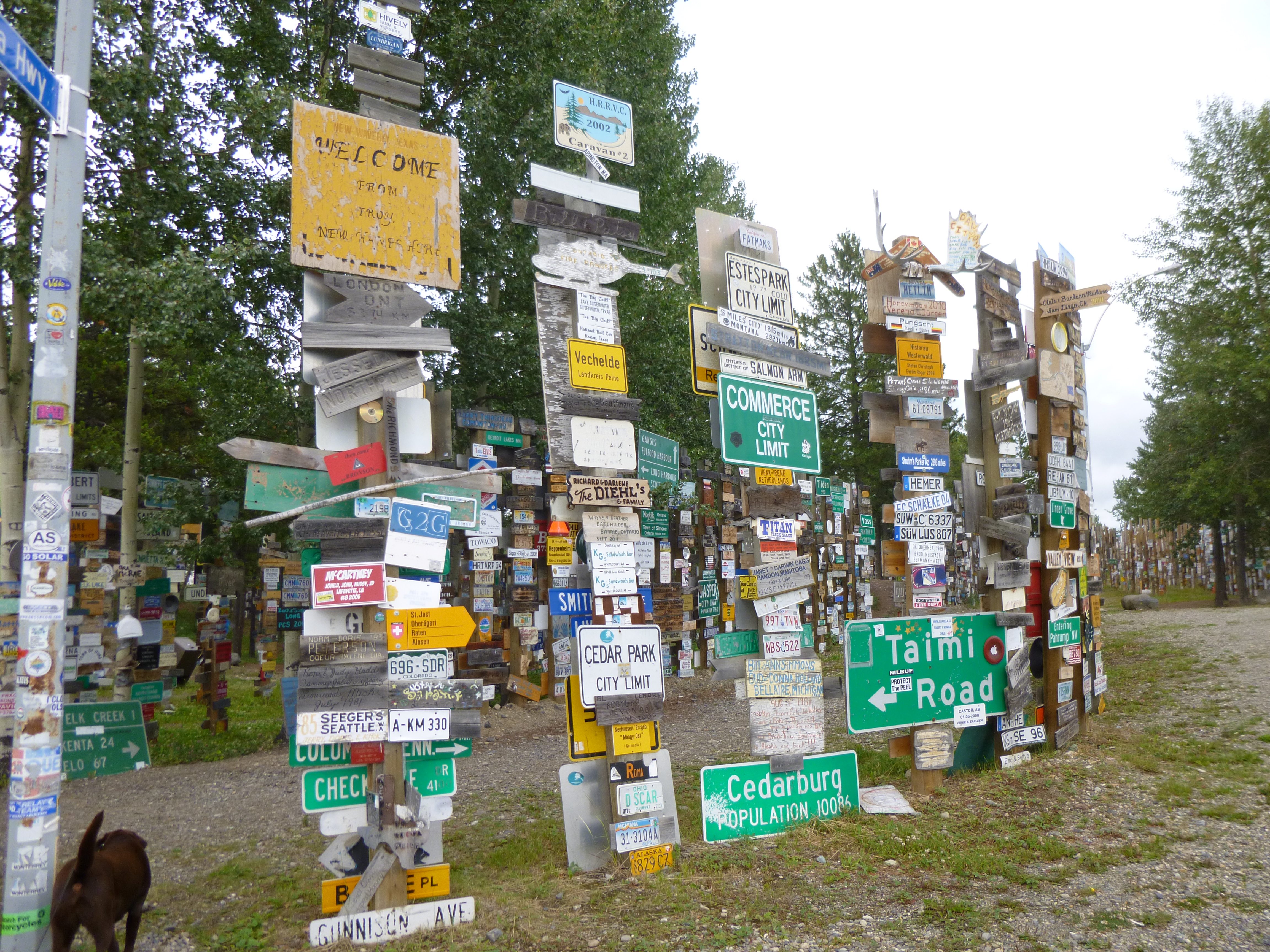 I crossed into the Yukon, and got into Lake Watson in the early evening. There’s a “signpost forest” there – which is made of dozens and dozens of posts holding up street signs and city signs from all over the world. It was kind of fun to walk up and down the rows and see some of the far-flung places that people had brought signs from. It’s funny how something like that gets started – it looks like it’s been around for a long time, and people still add to it.