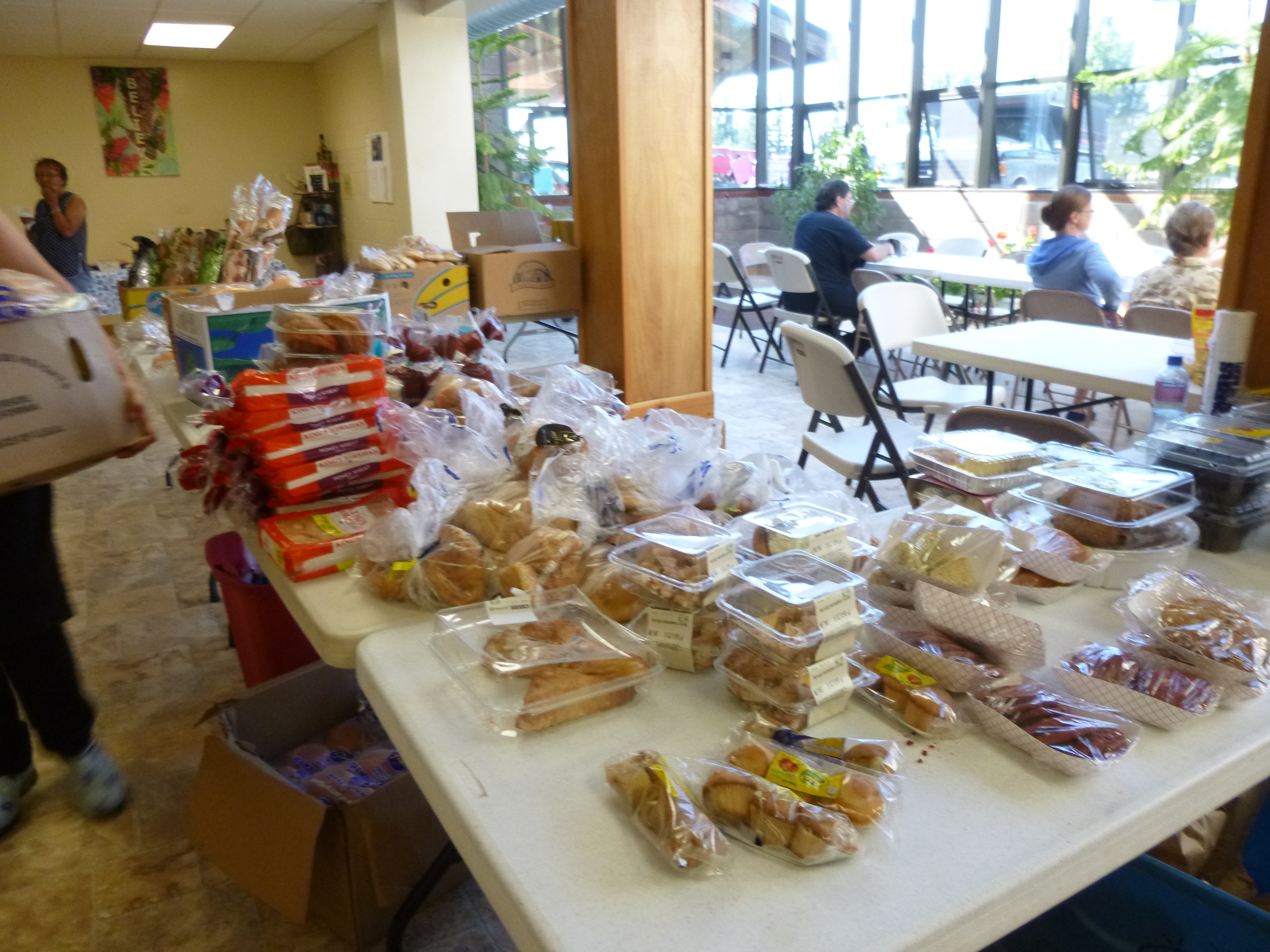 The Homer food pantry is open every Monday, and it seems to be fairly well known in the community. In addition to the big garden up by the approach to the town, lots of people plant an extra row in their gardens so they can donate extra produce to the food pantry. And this time of year, there is tons of good, fresh produce. I arrived at the food pantry shortly before they were due to open for the afternoon. There were a lot of volunteers getting all the different tables set up, and there was even a little lunch for all the people who brought in food, or who would be helping all afternoon. The produce table was practically sagging with the garden bounty that people had brought in – everything from bushels of potatoes to fresh tomatoes and greens of all kinds. Alaskan gardens are very prolific! There was also non-perishable foods, and a bread/dessert table with food donated from local stores, and everything necessary to help needy families get through the next week. It’s a really nice set-up in a church basement, and they’re able to help a lot of people. They also are able to make home deliveries for people who can’t get out and about.