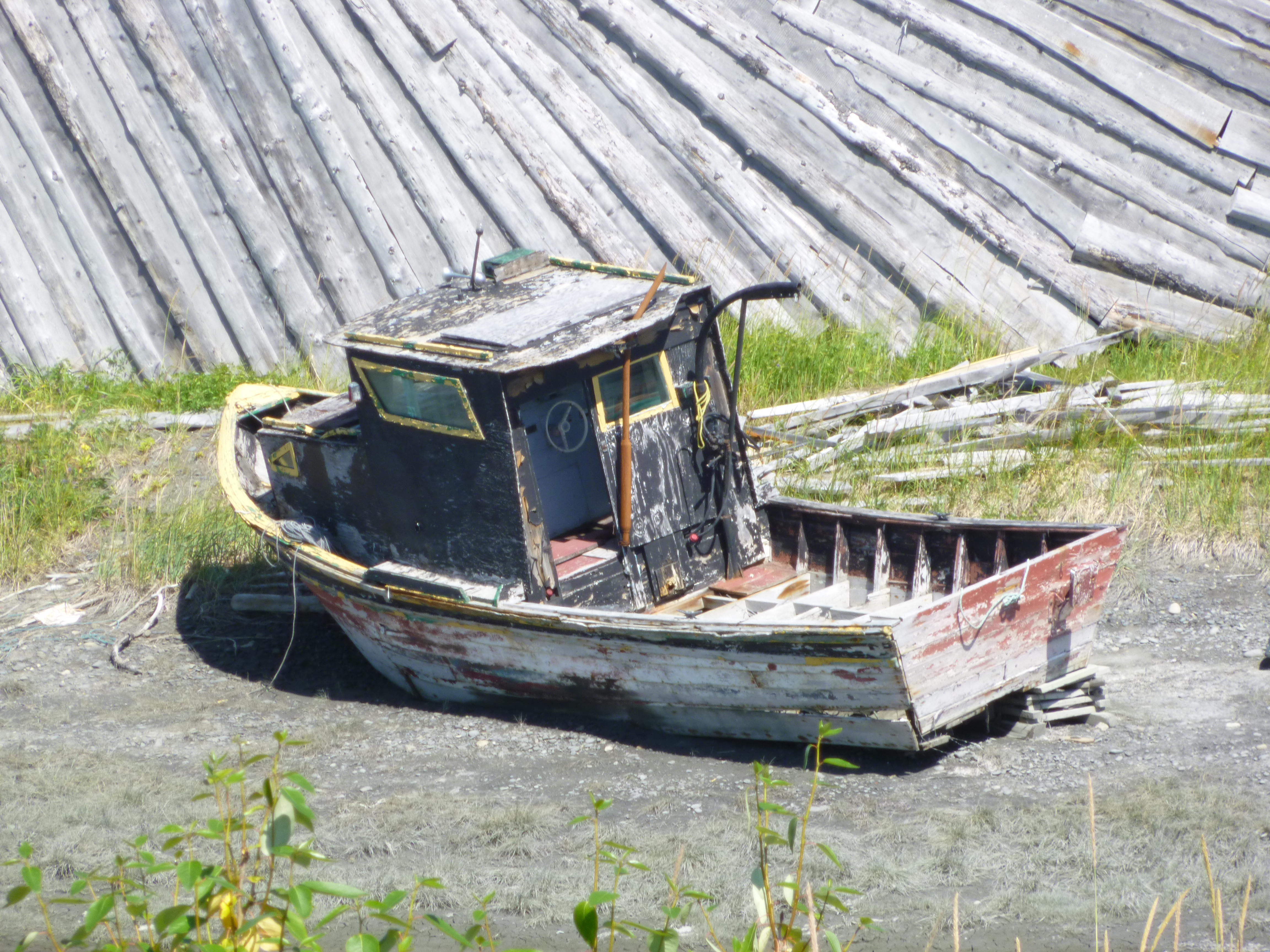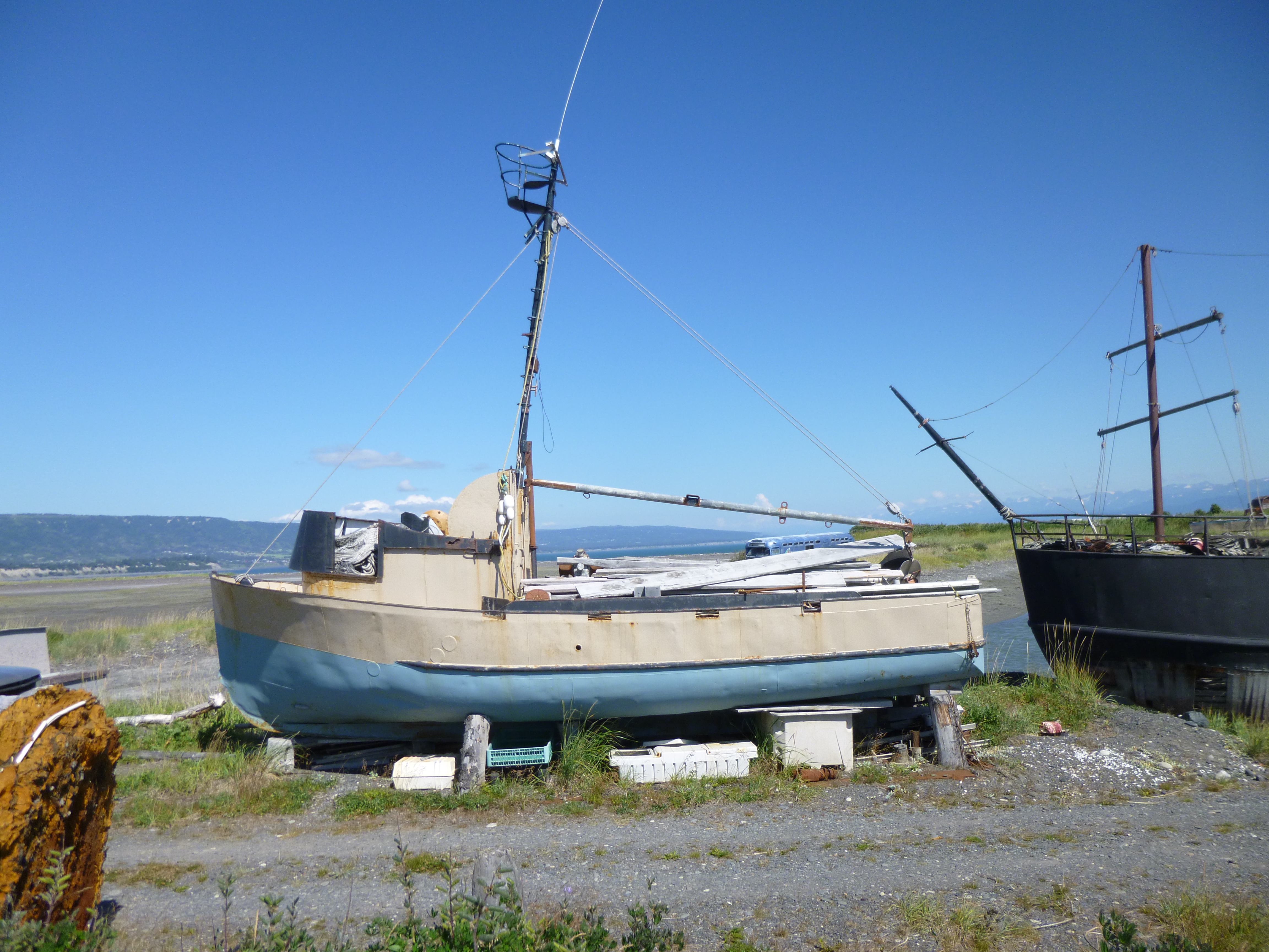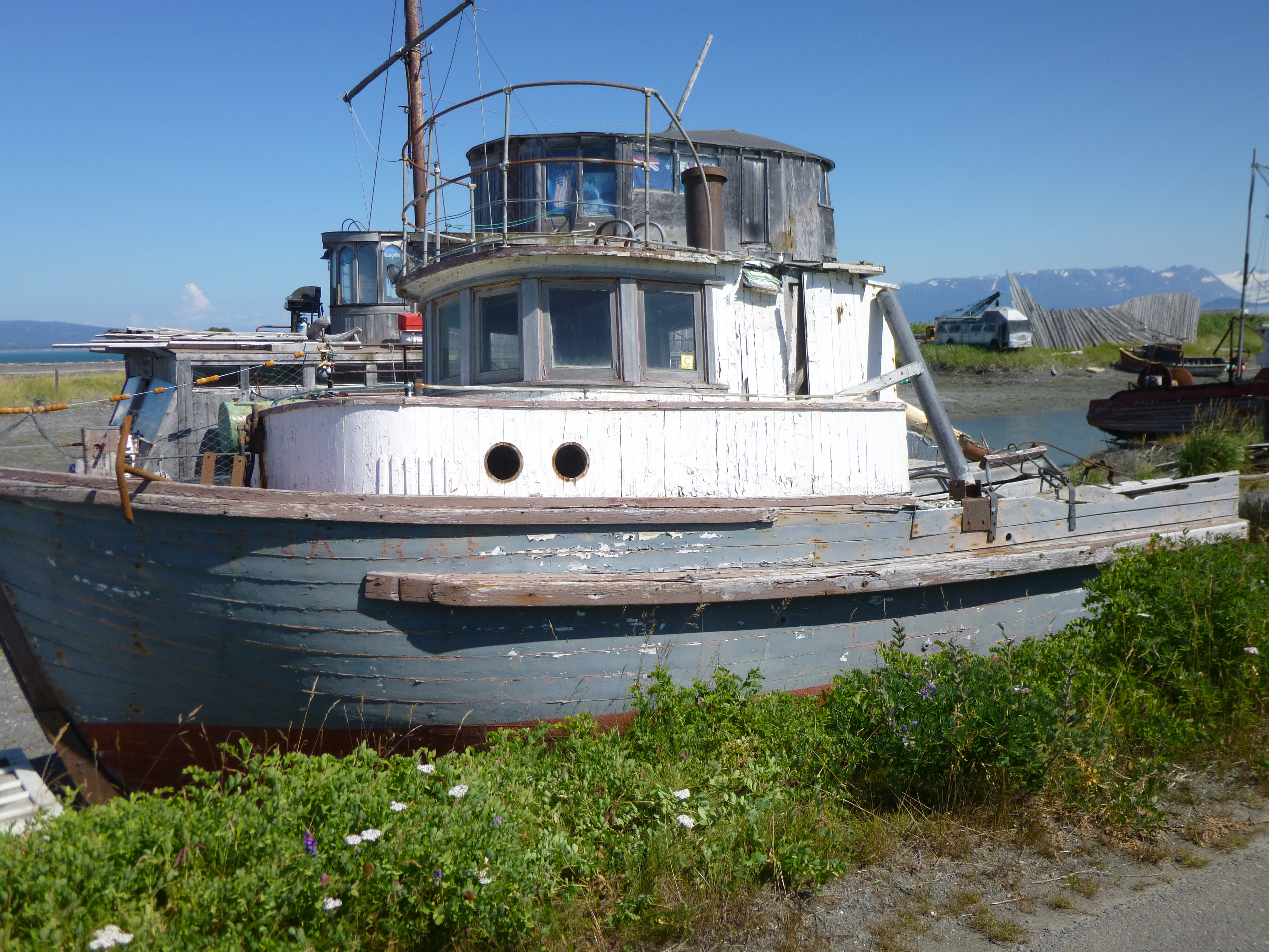 Then Tula and I were off again along the spit for some walking. I walked along the whole “spit” area, passing more sea planes tied up at docks, and taking off. I’m not sure if they’re mostly for sight-seeing tours, or if they’re simply a convenient mode of transportation in this far-flung town. And I passed an old boat graveyard – a bunch of derelict old boats that would have fascinating tales to tell if only they could talk. We covered 4 miles along the water, and then we went to the little town, and watched some more fishing boats coming and going, and did another mile and a half of walking. Tula waited for me in the car during one of the walks, and she has discovered her new pillow really does support her weight and has a comfortable new place to sleep in the van – a spoiled dog! I enjoyed some halibut chowder – the lady only had a half-serving left, and then was sold out, and that was a perfect amount.
