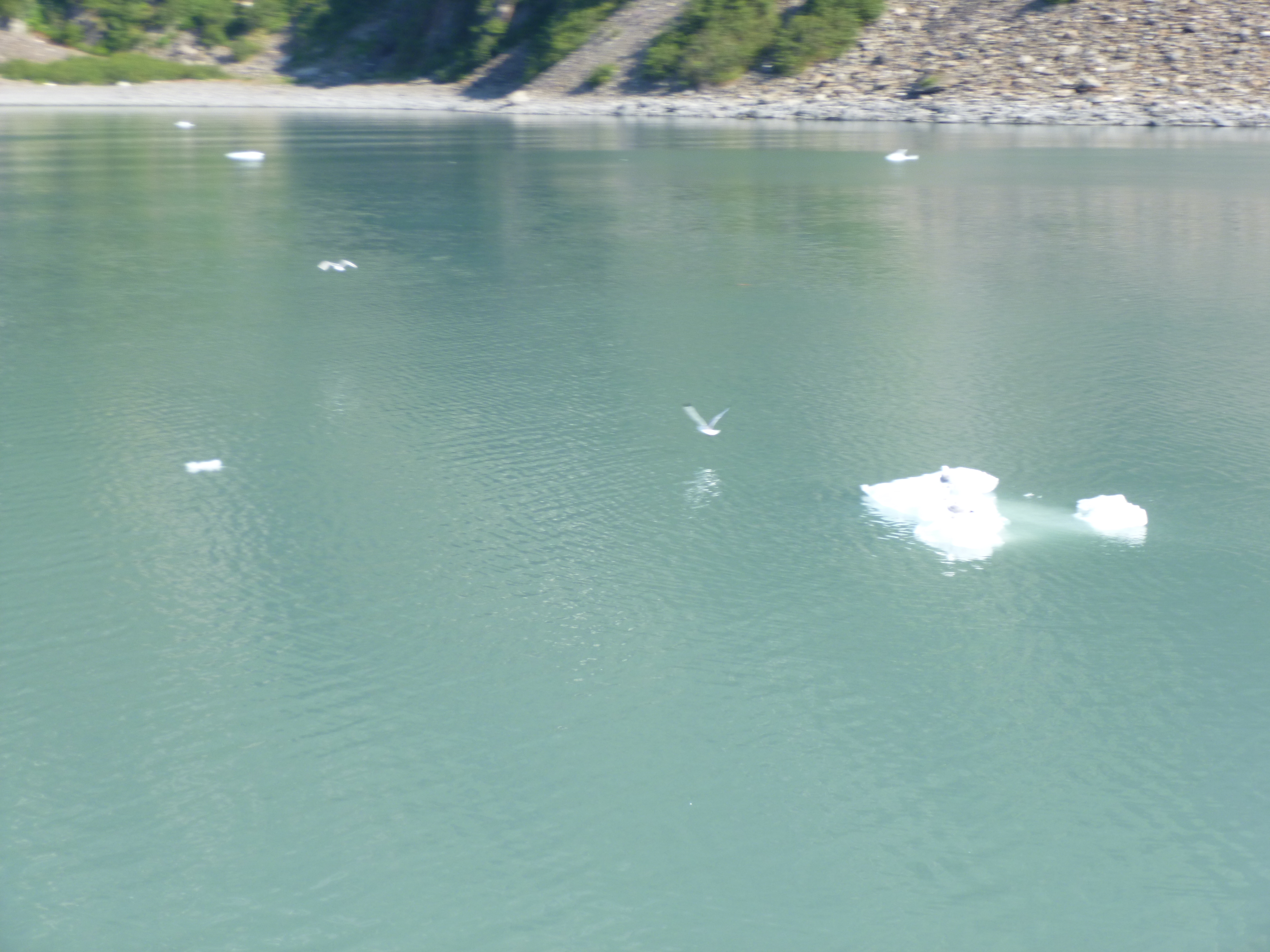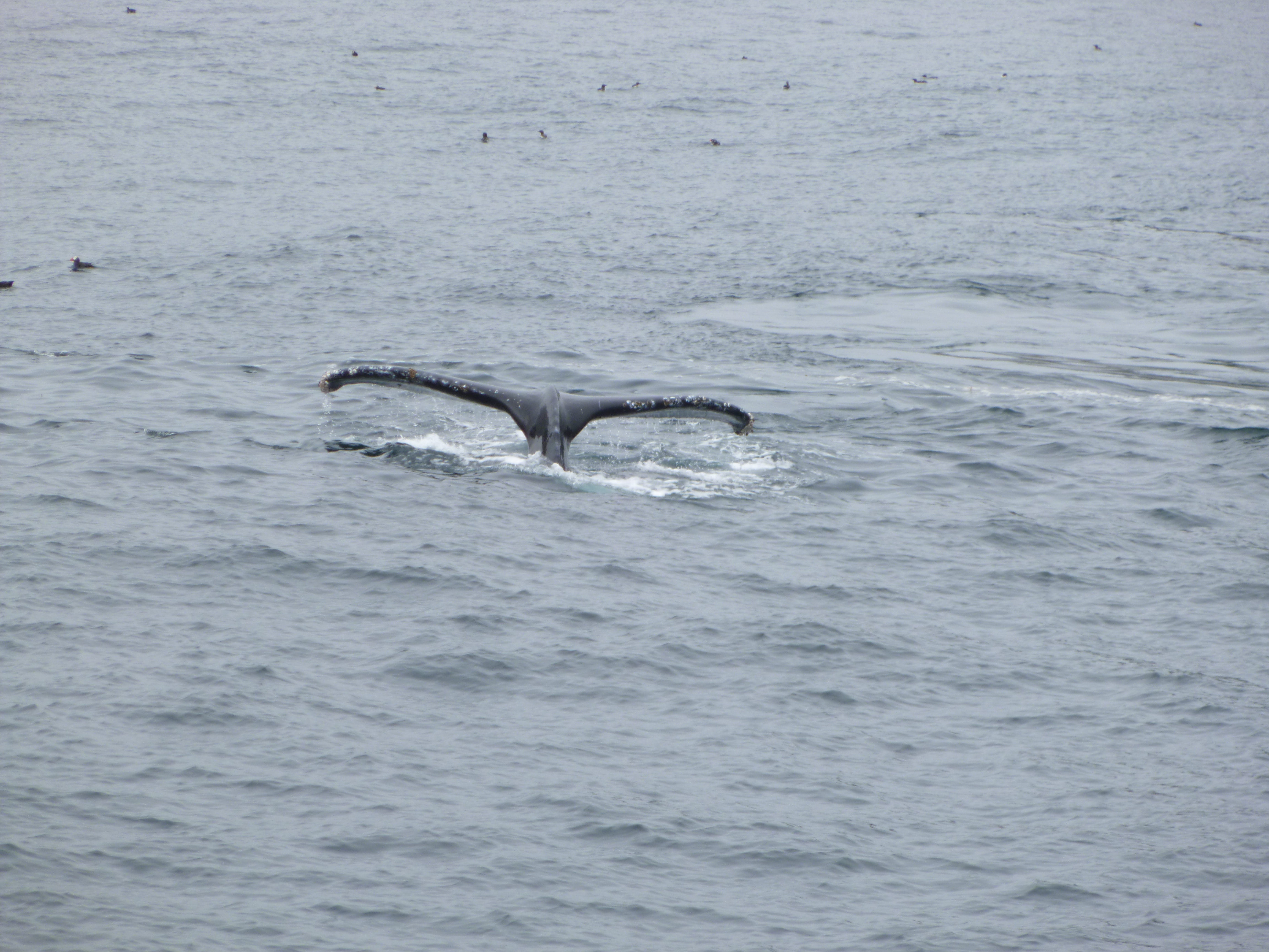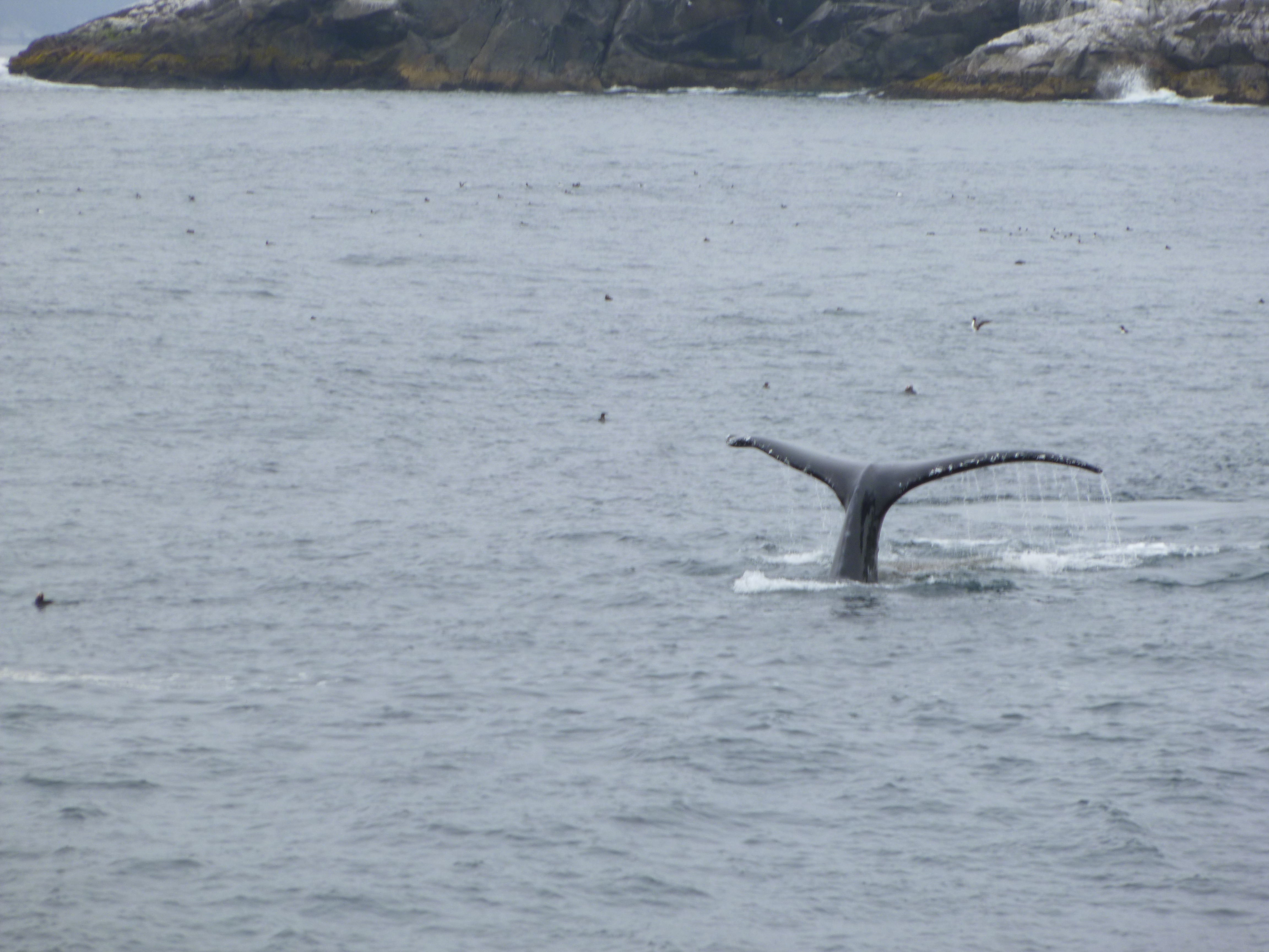 We left the harbor in fog that was just beginning to rise. The first thing we saw were a couple sea otters, and then some harbor seals – the captain said there are a lot of them around. And then some Dall’s porpoises appeared – they’re very speedy swimmers, and look like miniature Orca whales with their black and white markings. They can swim at speeds up to 30 knots, and the boat was moving along pretty good at 22-24 knots, so those little porpoises can sure cover some ground! The captain said whole groups of these porpoises sometimes follow the boat for a ways, but these ones seemed to be on another mission, so they vanished pretty quickly. And then we came across something they don’t see very often – a huge, thick group of clear jellyfish – so many of them that the color of the water was noticeably lighter where they were all clustered together. That was kind of unusual. We made our way farther and farther out – and passed a bunch of rocks where sea lions were sunning themselves. And then we saw a couple humpback whales and they surfaced a couple times, blowing water out of their spouts, and then with a flip of their tails they dove deep and we moved on. We were passing snow covered mountains, and we could see glaciers up in the far reaches of them. We passed by several fjords where some of the glaciers were getting closer to the water, and then we turned into one of the fjords. We began to see ice chunks in the water, and the closer we got to the glacier, the more ice-choked the water got. And then we were there – right up close by a magnificent glacier. The morning sun was beginning to warm things up a bit, and there was a lot of cracking noise, and rumblings, and pieces falling off and splashing into the water, and everything was kind of echoing. The captain simply turned the engines off and we listened to the glacier “talk” and watched the shifting ice. It was almost magical. A couple really big sheets of ice cracked off with booming sounds, and they made big splashes and the resulting waves rocked the boat. It’s a very unstable world up on that glacier! The crew used a net to haul in a big piece of glacier ice, and passed that around for whoever wanted to see it – it’s very clear ice. Then we started to head back and began to see hundreds and hundreds of sea birds floating in groups on the water – gulls, tufted puffins, cormorants, and sheerwaters – they’re all called “whale birds” because they feed on the exact same food that the whales do, despite the enormous size differences. And if all these birds have found a good feeding place that’s a sign for the whales that there’s also good feeding for them. (And these flocks of sea birds were good indicators for the whale hunters of the past too – otherwise how do you find a whale in the big ocean?) So we slowed down, and sure enough, there were whales all over the place – some nearby, and some out in the distance. I began to lose count of how many we saw – there would be 6-8 spouts off in the distance, and then a couple would surface near the boat, and it was hard to know where to look! There was also a bit of a bad smell in the air, and it was from all the whales expelling their fishy breath – as the captain said, if we consumed tons of anchovies and stuff and never brushed our teeth, our breath would be pretty bad too! The whales were absolutely gorging themselves in the rich feeding grounds. So we saw lots of humpbacks, singly or in pairs, and their movement looked so fluid and effortless. They seem to surface 5-6 times, and then they do a deep dive with their tail in the air, and then they’re usually down for a good 10 minutes. A couple of them were rolling around and sticking their side fins in the air, almost like they were waving. It was an awesome tour, and they gave us a light lunch, and it was a wonderful way to wrap up my Alaska visit.