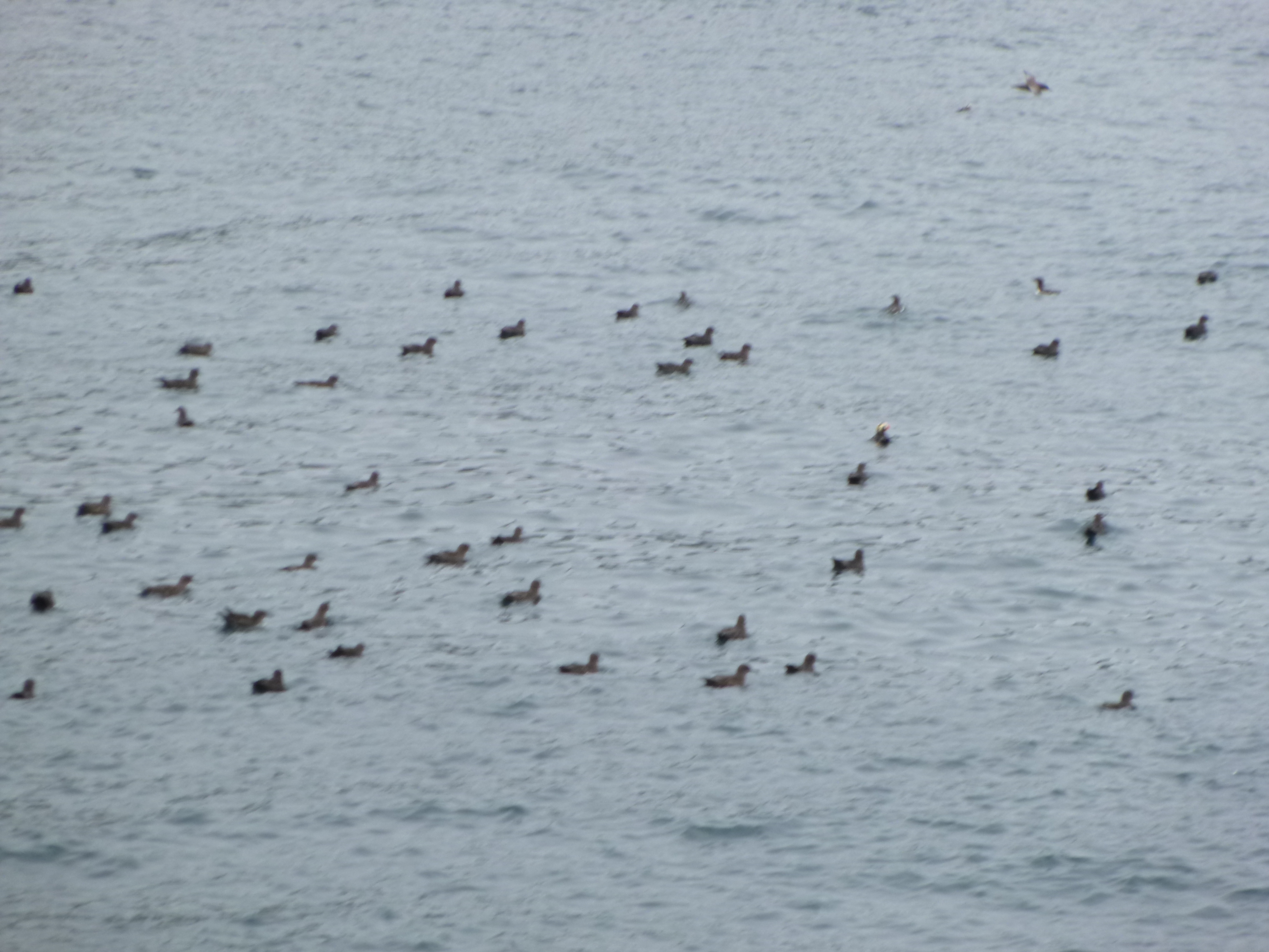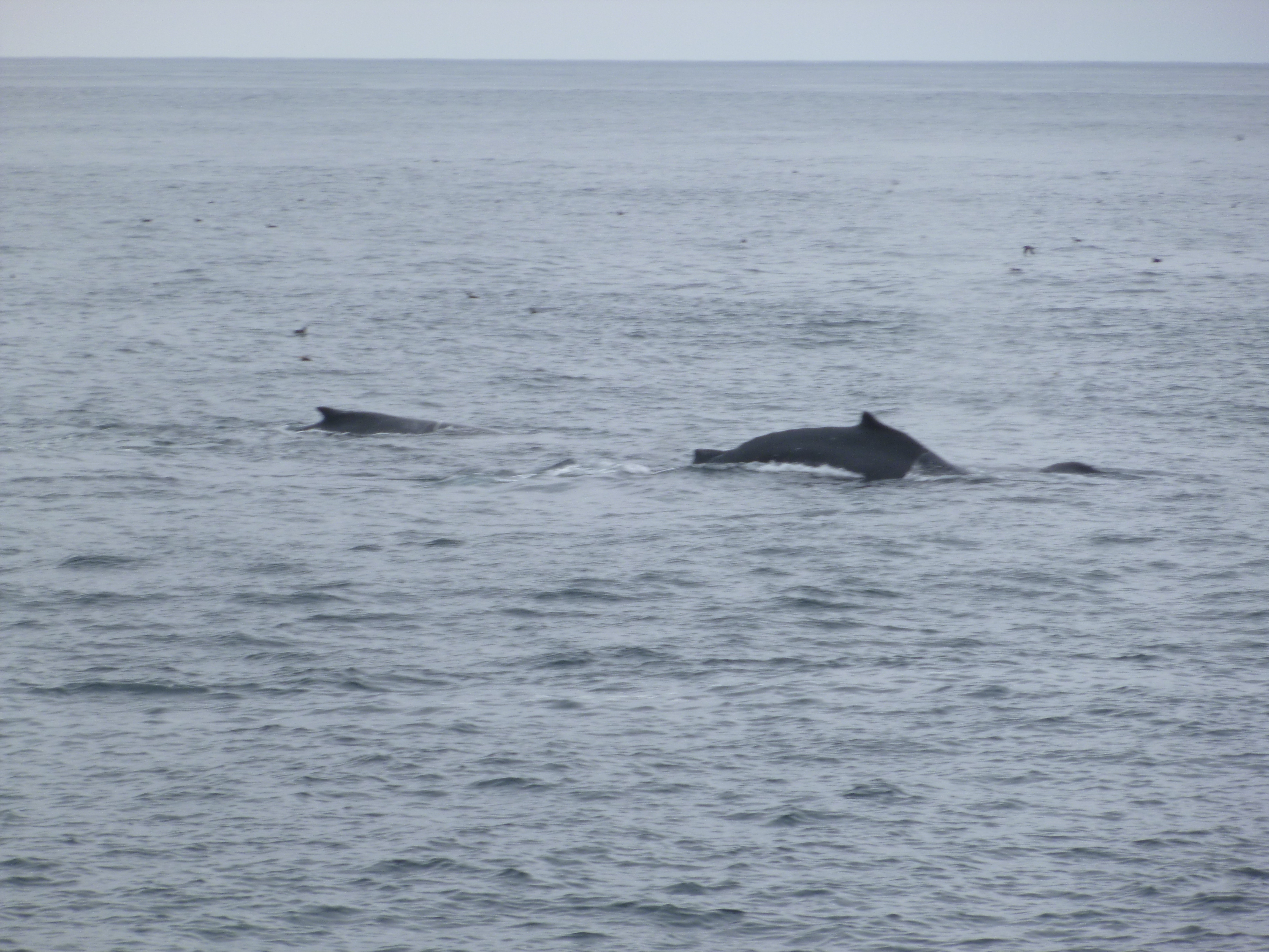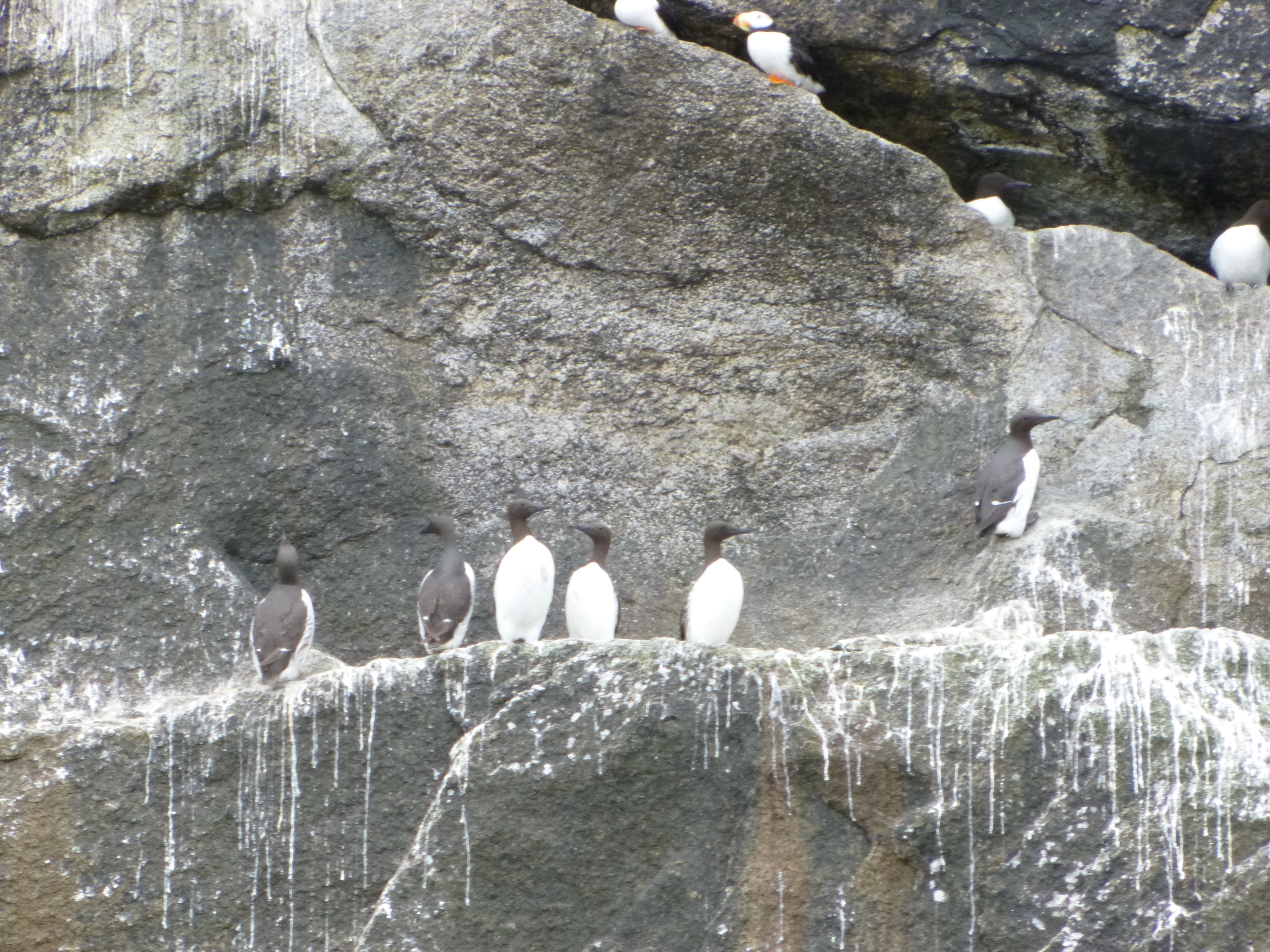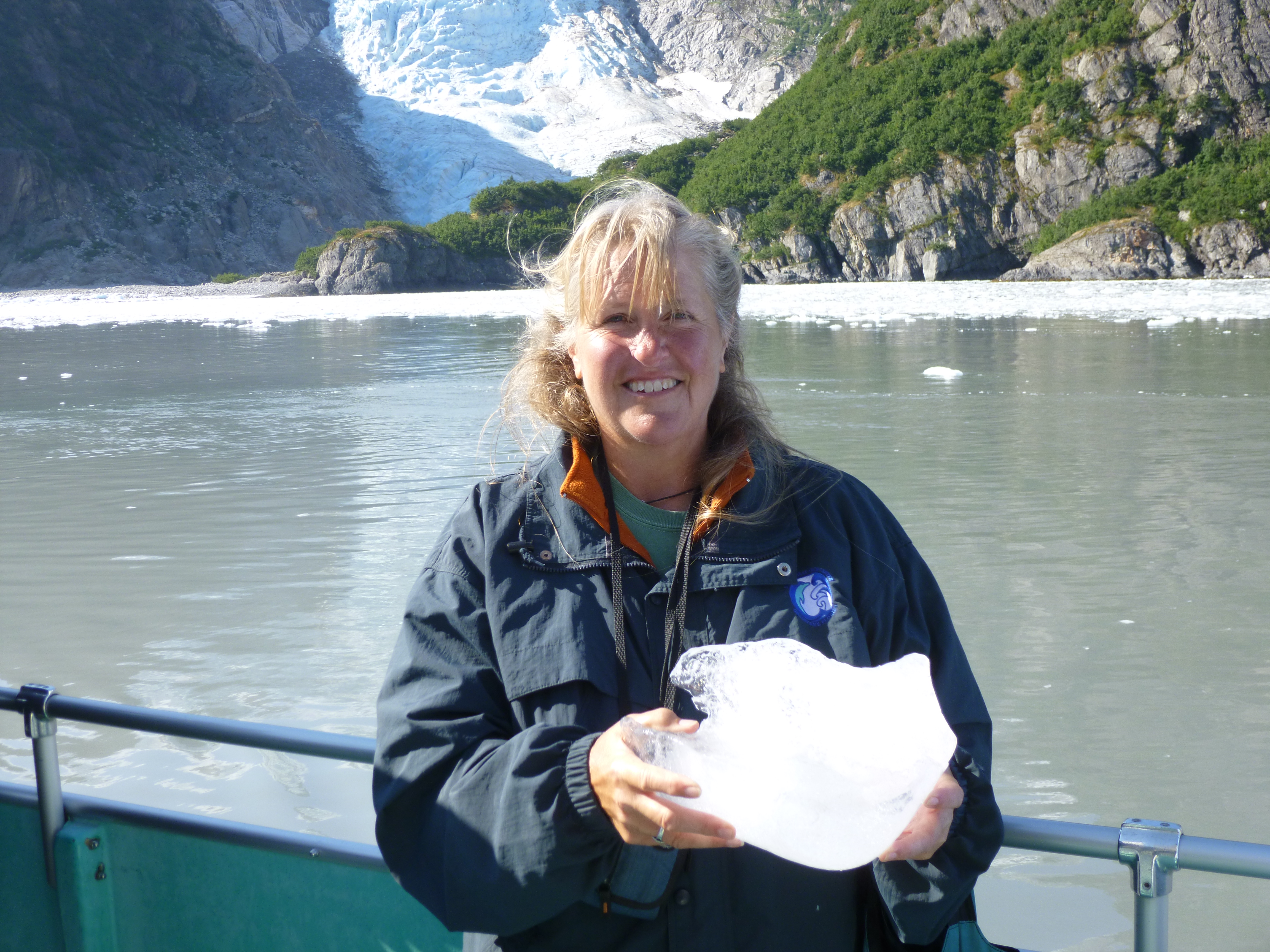 We left the harbor in fog that was just beginning to rise. The first thing we saw were a couple sea otters, and then some harbor seals – the captain said there are a lot of them around. And then some Dall’s porpoises appeared – they’re very speedy swimmers, and look like miniature Orca whales with their black and white markings. They can swim at speeds up to 30 knots, and the boat was moving along pretty good at 22-24 knots, so those little porpoises can sure cover some ground! The captain said whole groups of these porpoises sometimes follow the boat for a ways, but these ones seemed to be on another mission, so they vanished pretty quickly. And then we came across something they don’t see very often – a huge, thick group of clear jellyfish – so many of them that the color of the water was noticeably lighter where they were all clustered together. That was kind of unusual. We made our way farther and farther out – and passed a bunch of rocks where sea lions were sunning themselves. And then we saw a couple humpback whales and they surfaced a couple times, blowing water out of their spouts, and then with a flip of their tails they dove deep and we moved on. We were passing snow covered mountains, and we could see glaciers up in the far reaches of them. We passed by several fjords where some of the glaciers were getting closer to the water, and then we turned into one of the fjords. We began to see ice chunks in the water, and the closer we got to the glacier, the more ice-choked the water got. And then we were there – right up close by a magnificent glacier. The morning sun was beginning to warm things up a bit, and there was a lot of cracking noise, and rumblings, and pieces falling off and splashing into the water, and everything was kind of echoing. The captain simply turned the engines off and we listened to the glacier “talk” and watched the shifting ice. It was almost magical. A couple really big sheets of ice cracked off with booming sounds, and they made big splashes and the resulting waves rocked the boat. It’s a very unstable world up on that glacier! The crew used a net to haul in a big piece of glacier ice, and passed that around for whoever wanted to see it – it’s very clear ice. Then we started to head back and began to see hundreds and hundreds of sea birds floating in groups on the water – gulls, tufted puffins, cormorants, and sheerwaters – they’re all called “whale birds” because they feed on the exact same food that the whales do, despite the enormous size differences. And if all these birds have found a good feeding place that’s a sign for the whales that there’s also good feeding for them. (And these flocks of sea birds were good indicators for the whale hunters of the past too – otherwise how do you find a whale in the big ocean?) So we slowed down, and sure enough, there were whales all over the place – some nearby, and some out in the distance. I began to lose count of how many we saw – there would be 6-8 spouts off in the distance, and then a couple would surface near the boat, and it was hard to know where to look! There was also a bit of a bad smell in the air, and it was from all the whales expelling their fishy breath – as the captain said, if we consumed tons of anchovies and stuff and never brushed our teeth, our breath would be pretty bad too! The whales were absolutely gorging themselves in the rich feeding grounds. So we saw lots of humpbacks, singly or in pairs, and their movement looked so fluid and effortless. They seem to surface 5-6 times, and then they do a deep dive with their tail in the air, and then they’re usually down for a good 10 minutes. A couple of them were rolling around and sticking their side fins in the air, almost like they were waving. It was an awesome tour, and they gave us a light lunch, and it was a wonderful way to wrap up my Alaska visit.