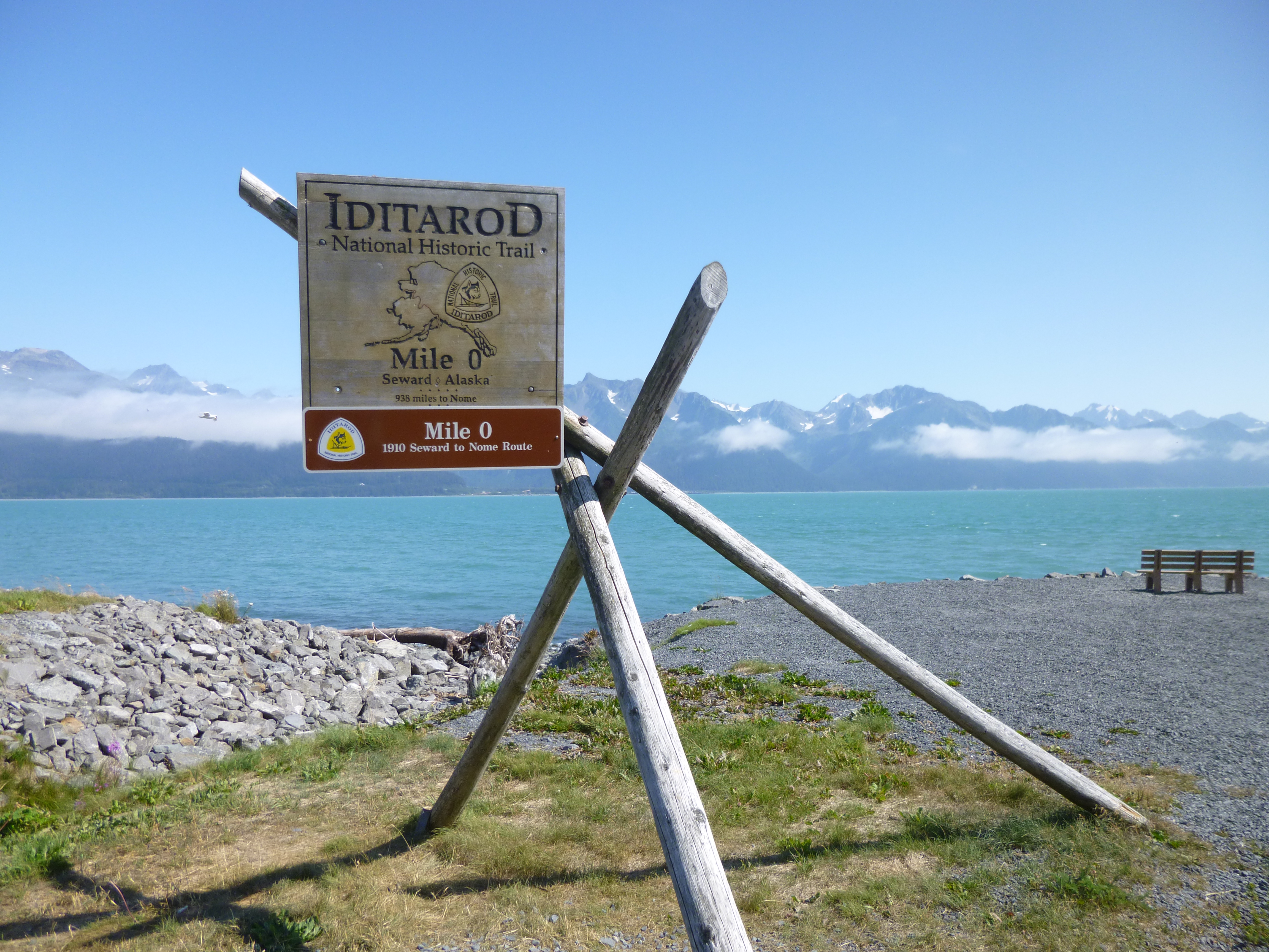 Tula was ready for a walk when we got back, so we enjoyed a mile or so on a boardwalk by a river just outside of Seward, and then went into the town itself, where I found the memorial marking the start of the original Iditarod sled dog run, which happened one winter in a desperate attempt to quickly get some medication all the way up to Nome. Seward is a fun little town with a lot of character and a lot to see. We walked for a while on the bike path along the sea, starting at the Mile 0 marker for the Iditarod race, and then continued all through town. By then we had a good 3 miles of walking done. I didn’t make a donation today, because all of the Alaska donations are done.