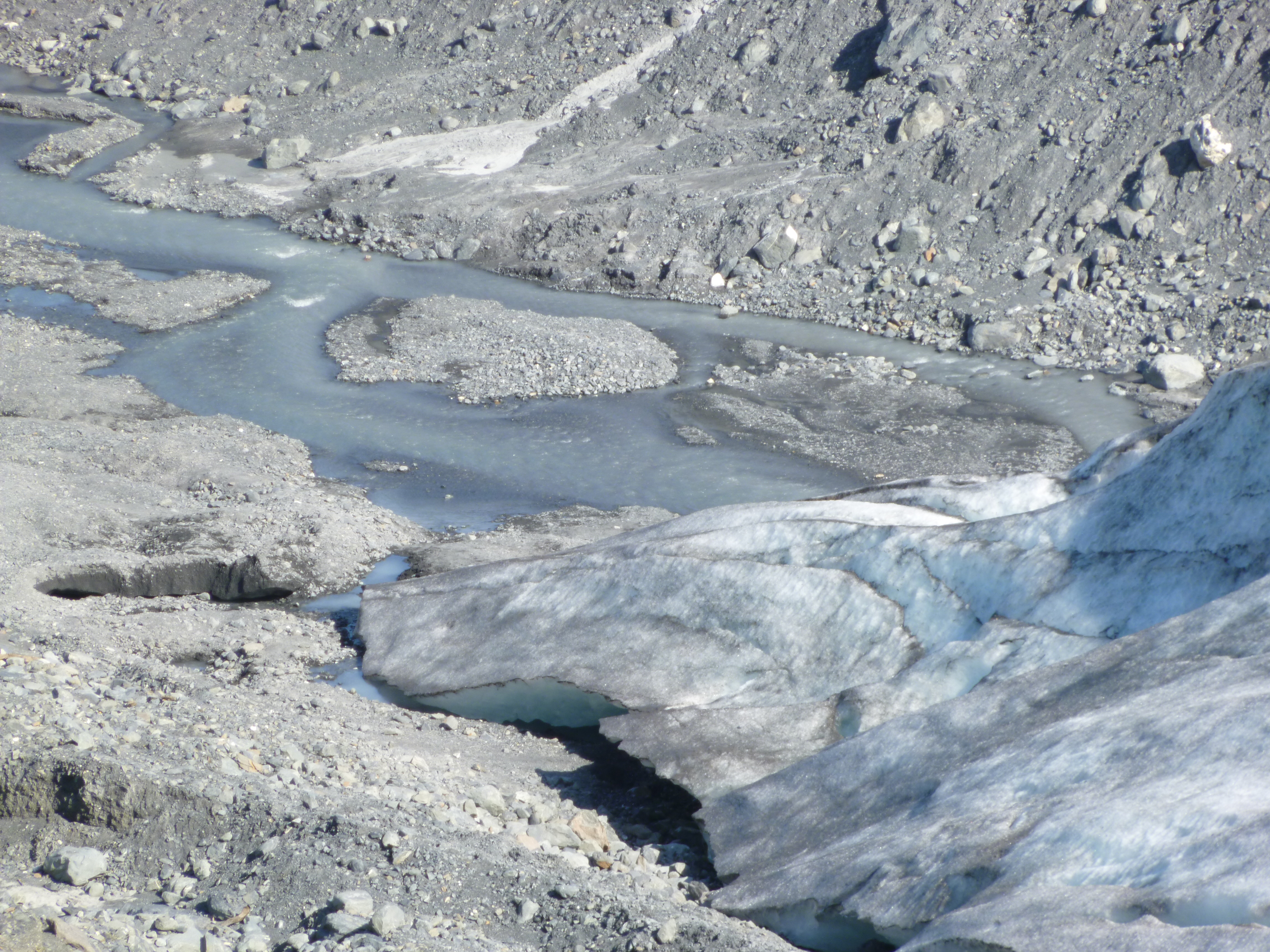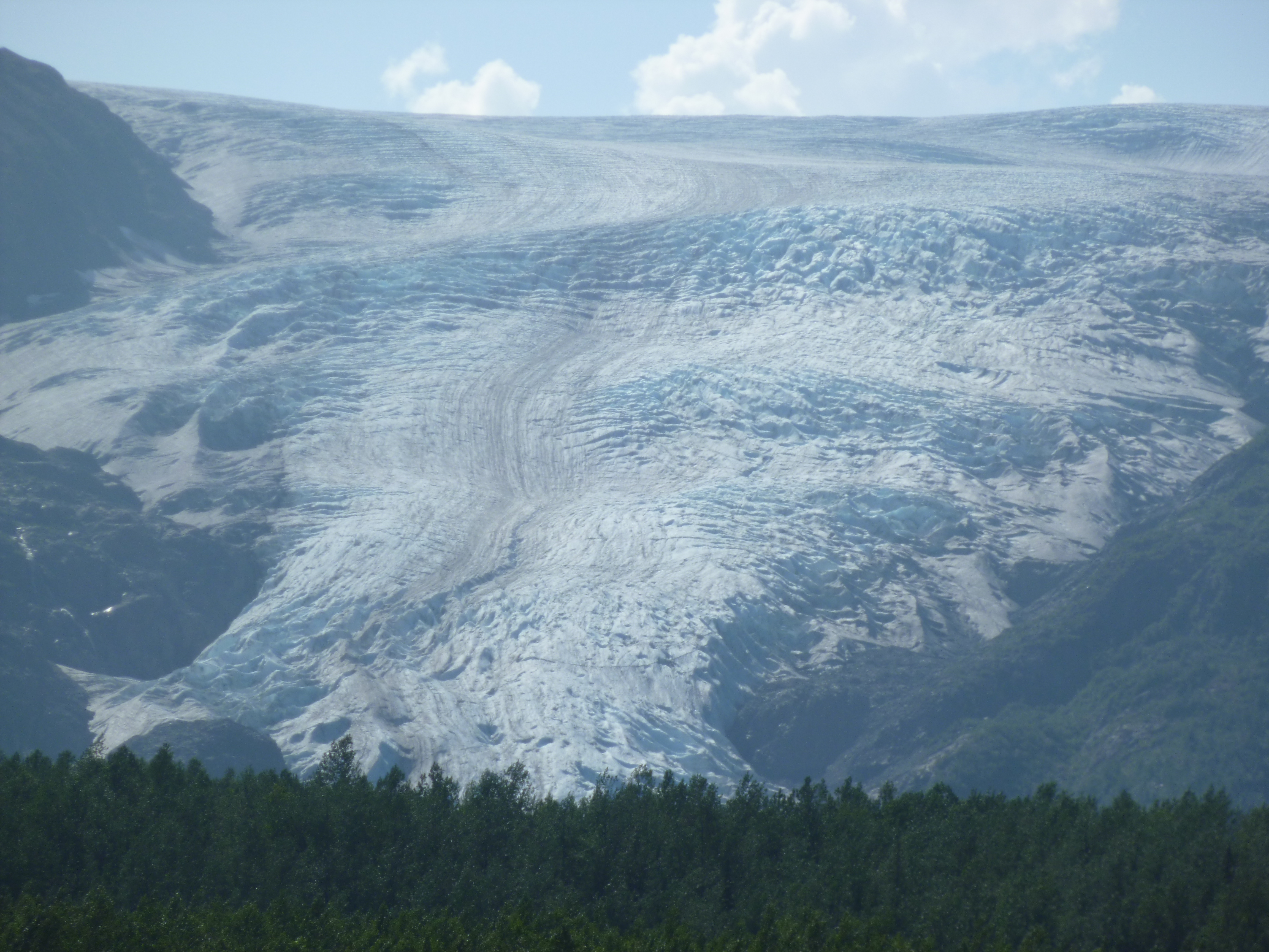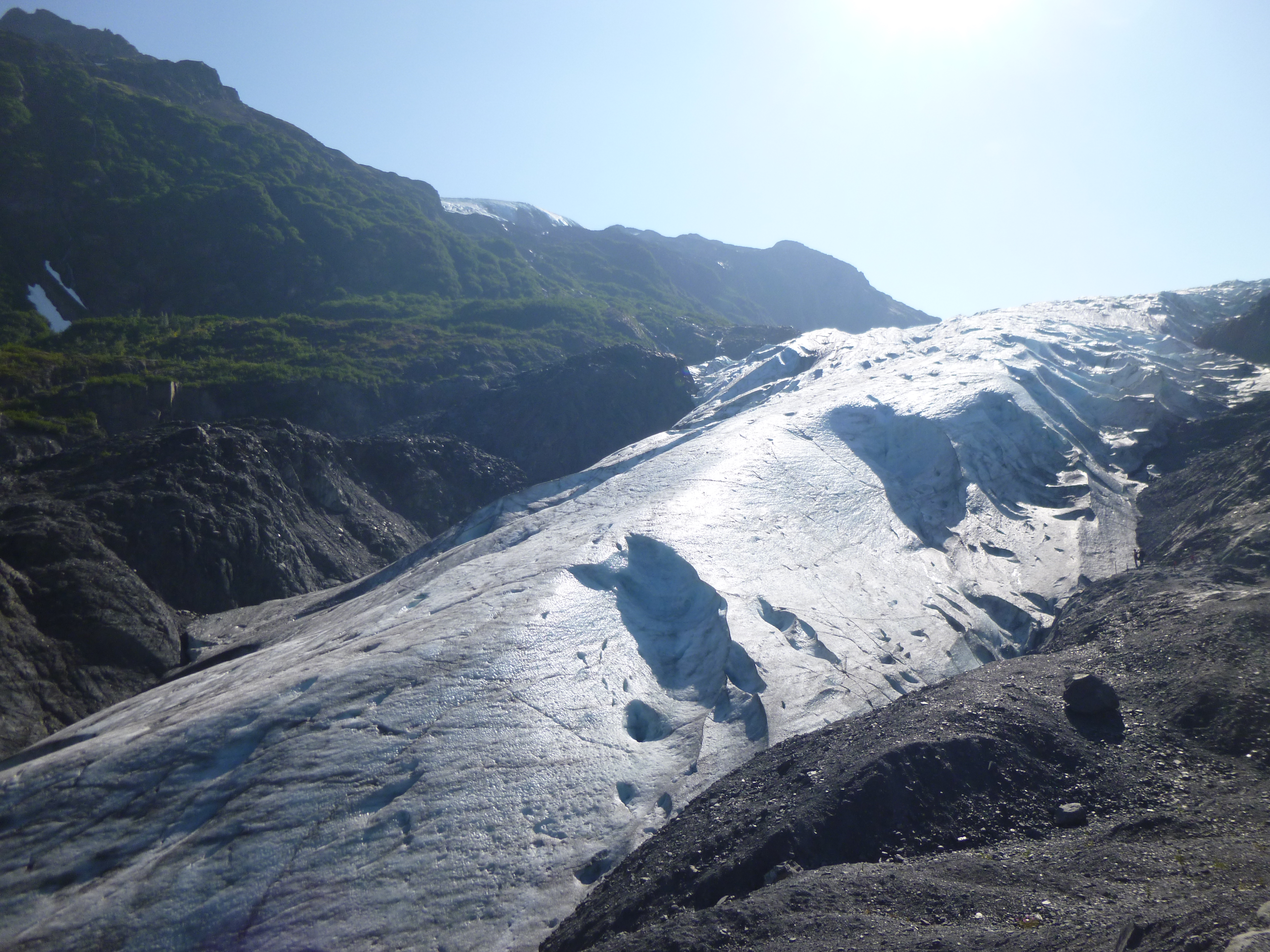I was close to the Kenai Fjords National Park, so I drove up there toward Exit Glacier, and had some beautiful views of it on the way up. I stopped in the visitor center to ask about short hikes, and decided on the 2 1/2 mile hike that would bring me close to the foot of the glacier. The bugs were pretty bad until I got closer to the cool air coming off the glacier, and when I got up to the viewing point, there was a sign showing where the glacier had been just 15 years ago. It was astonishing how far it had retreated in such a short time. Up close, the glacier looks a bit dirty from all the sand, dirt, and stones it picks up, and there were little rivulets of water flowing off into a very cold, fast-moving stream. It was interesting to see the actual toe of the glacier.