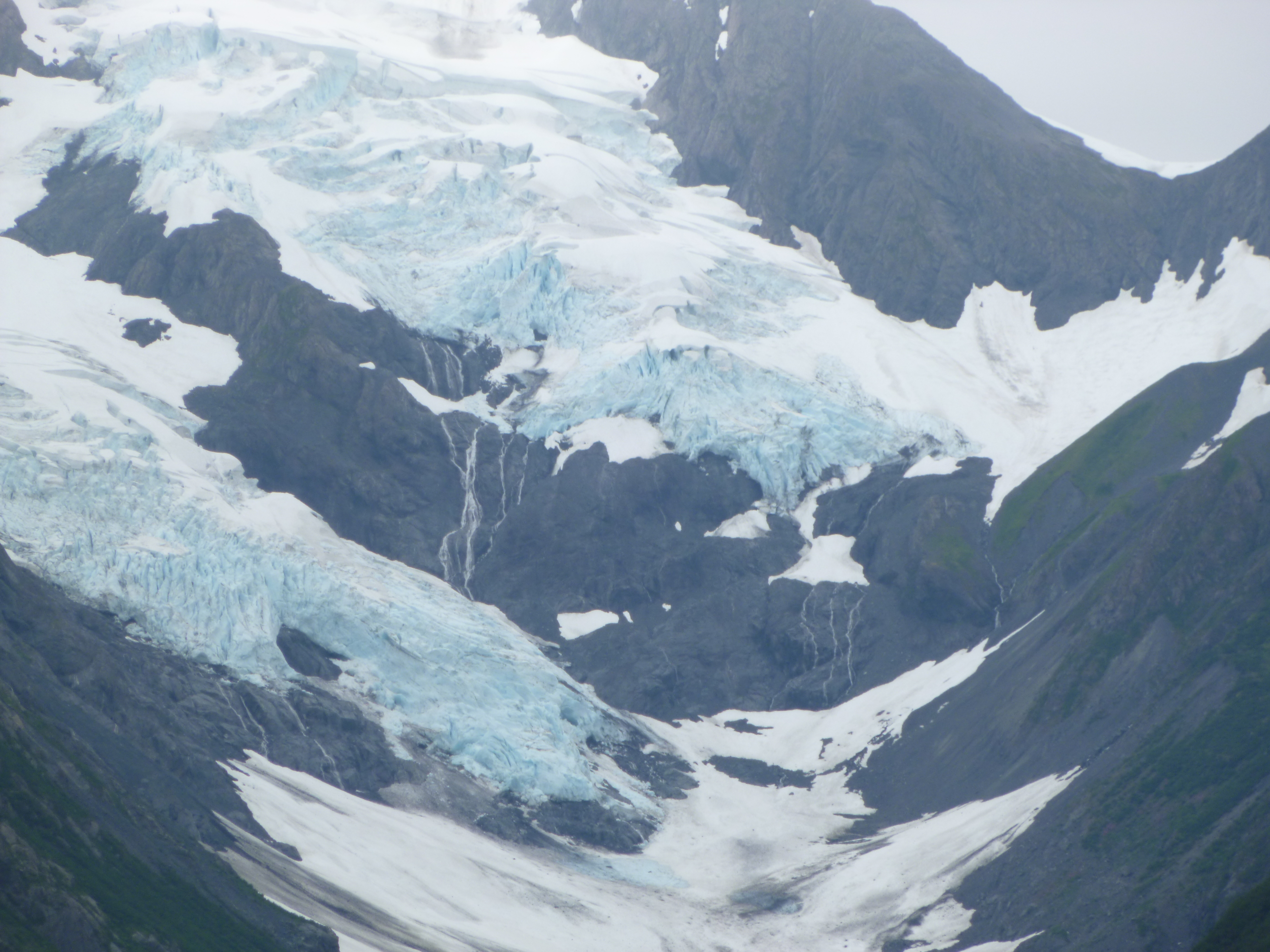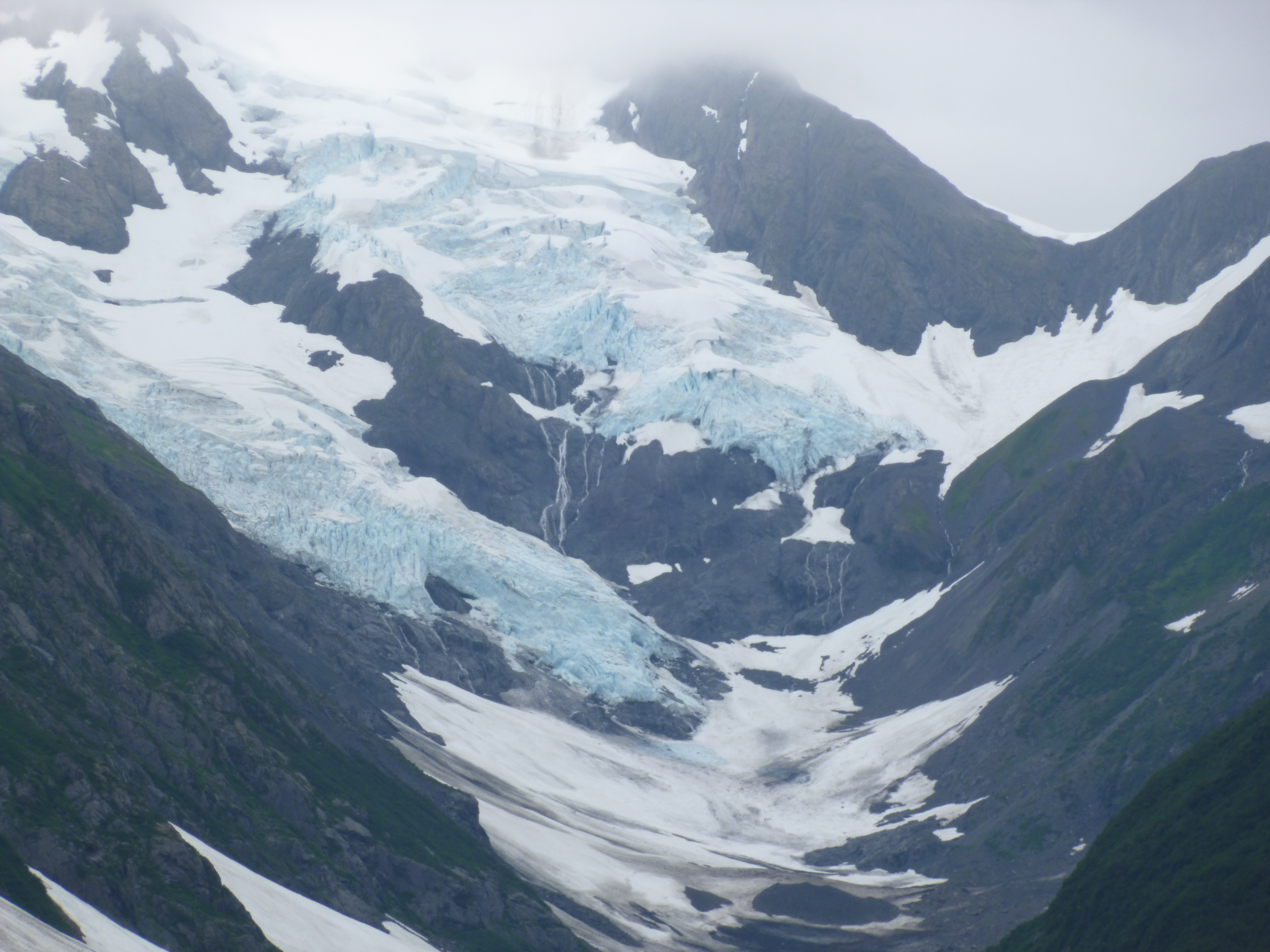 The first thing on the agenda this morning was a visit to Whittier, which is a town that wasn’t really open to tourists until about 2000, because the only access into town, other than coming in by sea in the Prince William Sound, was the railroad, which had to go through a 2 1/2 mile tunnel under all the massive mountains. There were no roads into town. But around 2000, they decided to make the railroad tunnel a combined auto/train tunnel, so that tourists and residents could drive in (Whittier is also one of the stops on Alaska’s Marine Highway). The tunnel is only one lane, and obviously the train schedule has top priority. Cars have to pay a fare and be assigned a lane in the staging area, and groups of west-bound and east-bound vehicles alternate. I wanted to see all of this, and it wasn’t too far from my Alaska exit route. So I had only driven about 10 miles toward Whittier, and was near the tunnel staging area, when I came around a bend in the road, and then was almost completely surrounded by mountains and glaciers. It’s a good thing there was a big pull-off, because it was a dramatic, scenic view – blue/white glaciers in every direction. It was a little misty, which just kind of added to the charm. And someone pointed out an eagle on a log in the river.