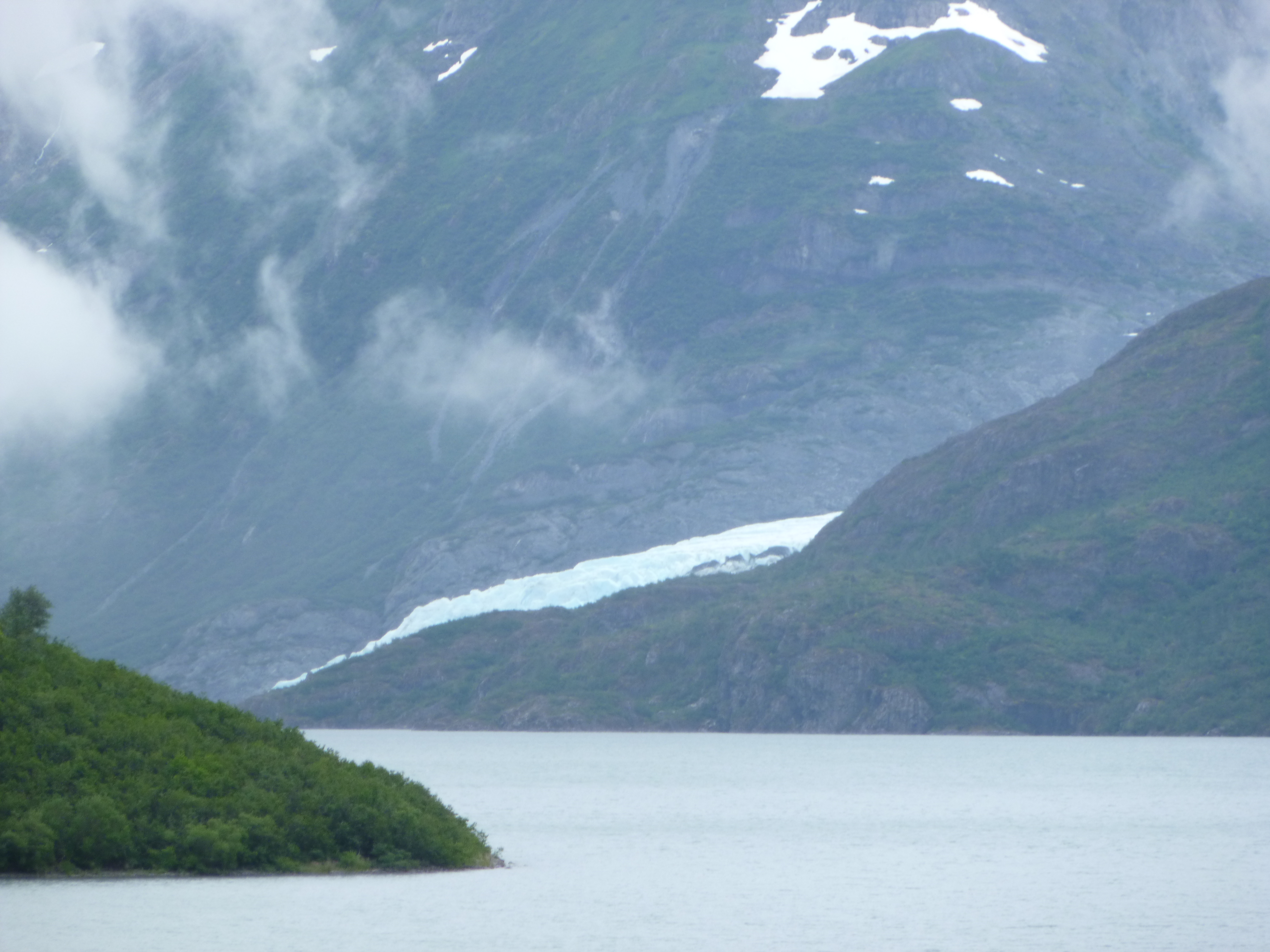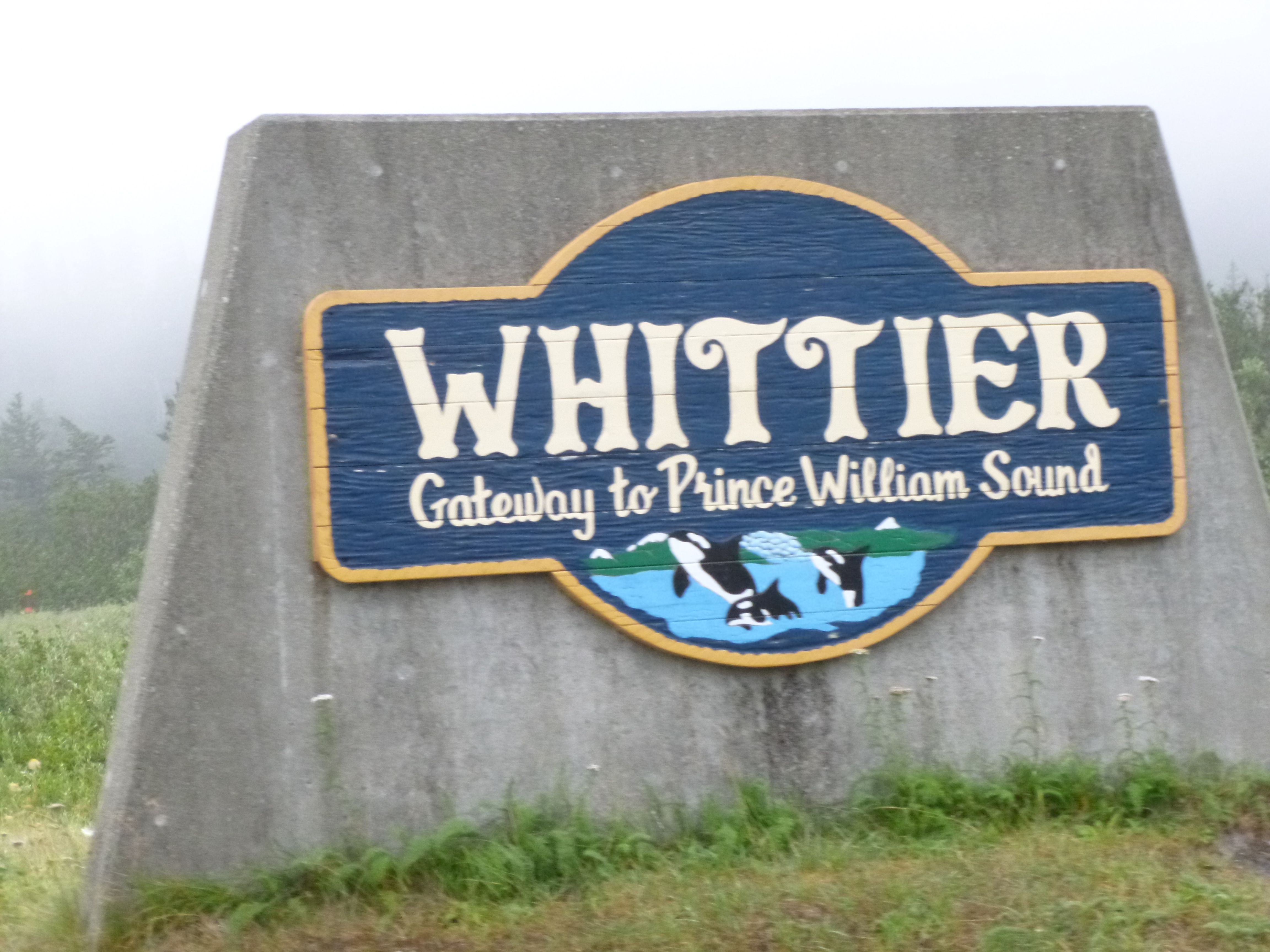 After I had spent some time gazing around, I got my tunnel ticket, and got in line. They have big road signs up, letting drivers know when the next group of cars will be “released.” The tunnel entrance looked like a little A-frame house, and was long and a little damp. I don’t like to think about the tons of rock, snow and glaciers that I’m driving under. It was fairly well lit, and signs pointed out the locations of 5 or 6 ventilated safety chambers that could be used in case of emergencies or fires. It’s just a single lane road, with the train tracks running down the center, and it’s narrow – the tunnel isn’t much taller or wider than the trains that first used it. After 2 1/2 miles, I came out the other side to a small, older sea-going town that was covered in fog. I could hardly even see the water. It’s not a big town, but it is a bit of a transportation hub, with ships bringing in freight for trains, and the passenger traffic for the ferry system. I hadn’t known much about the Alaskan Marine Highway, which is probably a good thing – I didn’t need to be cramming anything else into this particular visit. But it has sure given me some ideas for the future (the Aleutian Islands are calling!!) I picked up some literature, and asked about a ferry to Skagway on the off chance I could do that instead of driving back up to the Alaska Highway and down into Canada – Skagway is accessible by road, but one has to get into Canada first. A lot of towns on the Alaskan panhandles have no road access – one can’t even drive into Juneau, the state capital! I went into the ferry offices and got some schedule info – it was a little hard to figure out at first. Later in the day when I looked at it more closely, I was kicking myself for not taking the ferry to Valdez, and enjoying the glacier-filled drive up to the Alaska Highway by a partially different route than what I was doing. That would have allowed me to cover one of 2 little segments of roads in Alaska that I have not yet been on, plus a couple people have told me it’s one of the prettiest drives. But I’m not 100% sure that route was covered on Wednesdays, and I have an excuse to go back to Alaska at some point in the distant future to drive the few segments of road that I haven’t already done – plus maybe get out to the Aleutian Islands by ferry. So I’m pretty sure I’ll be back somewhere along the way!