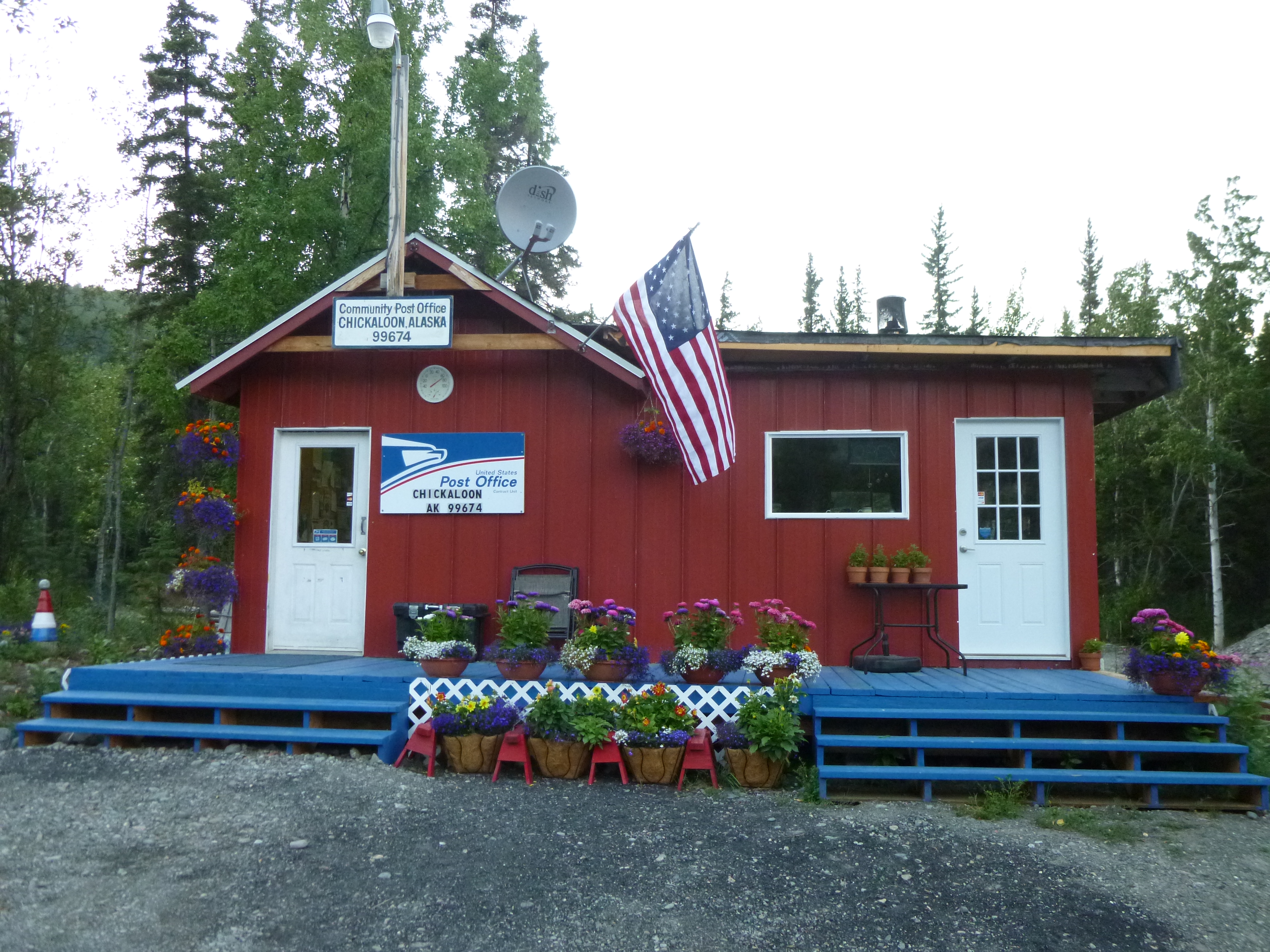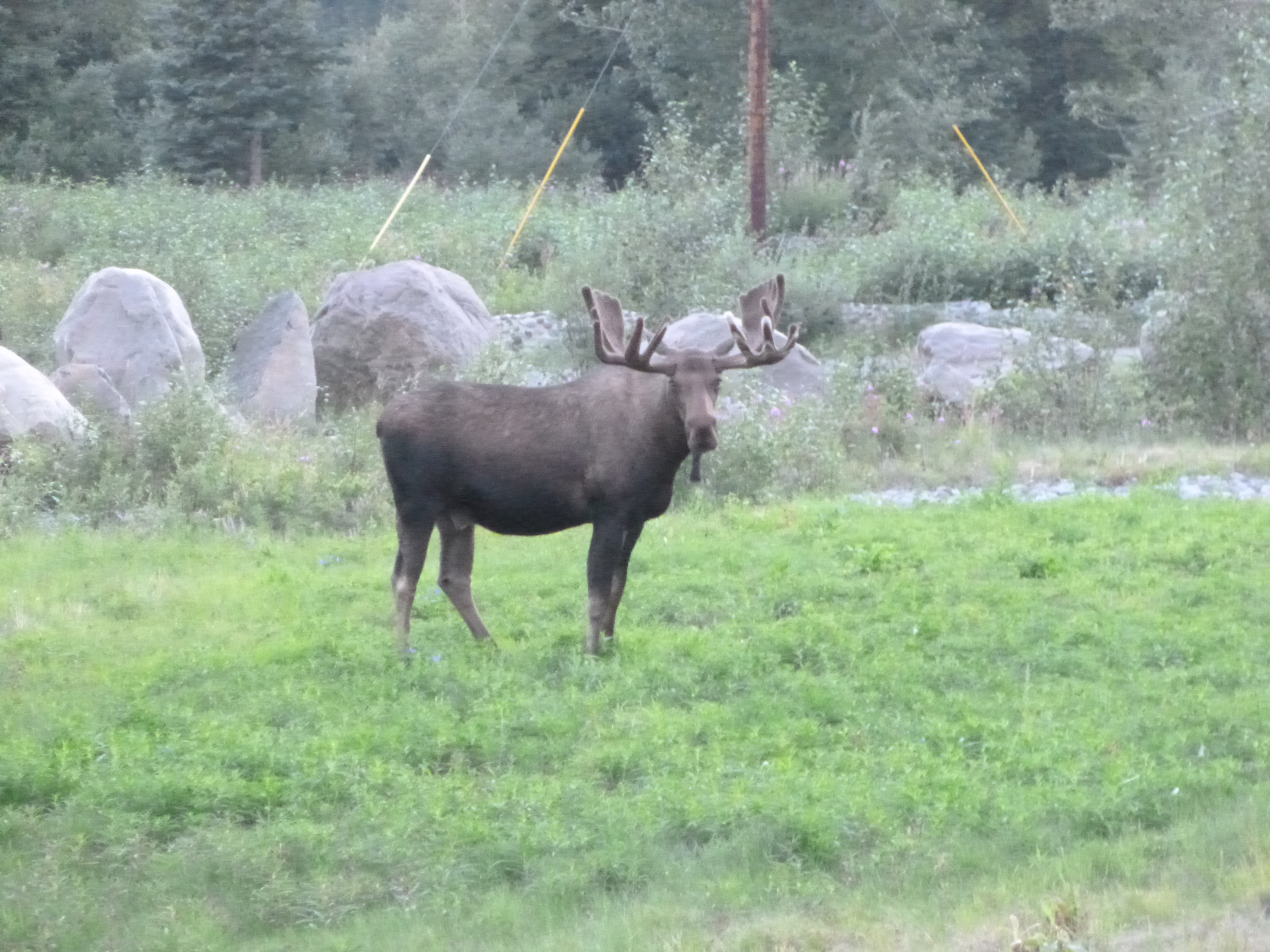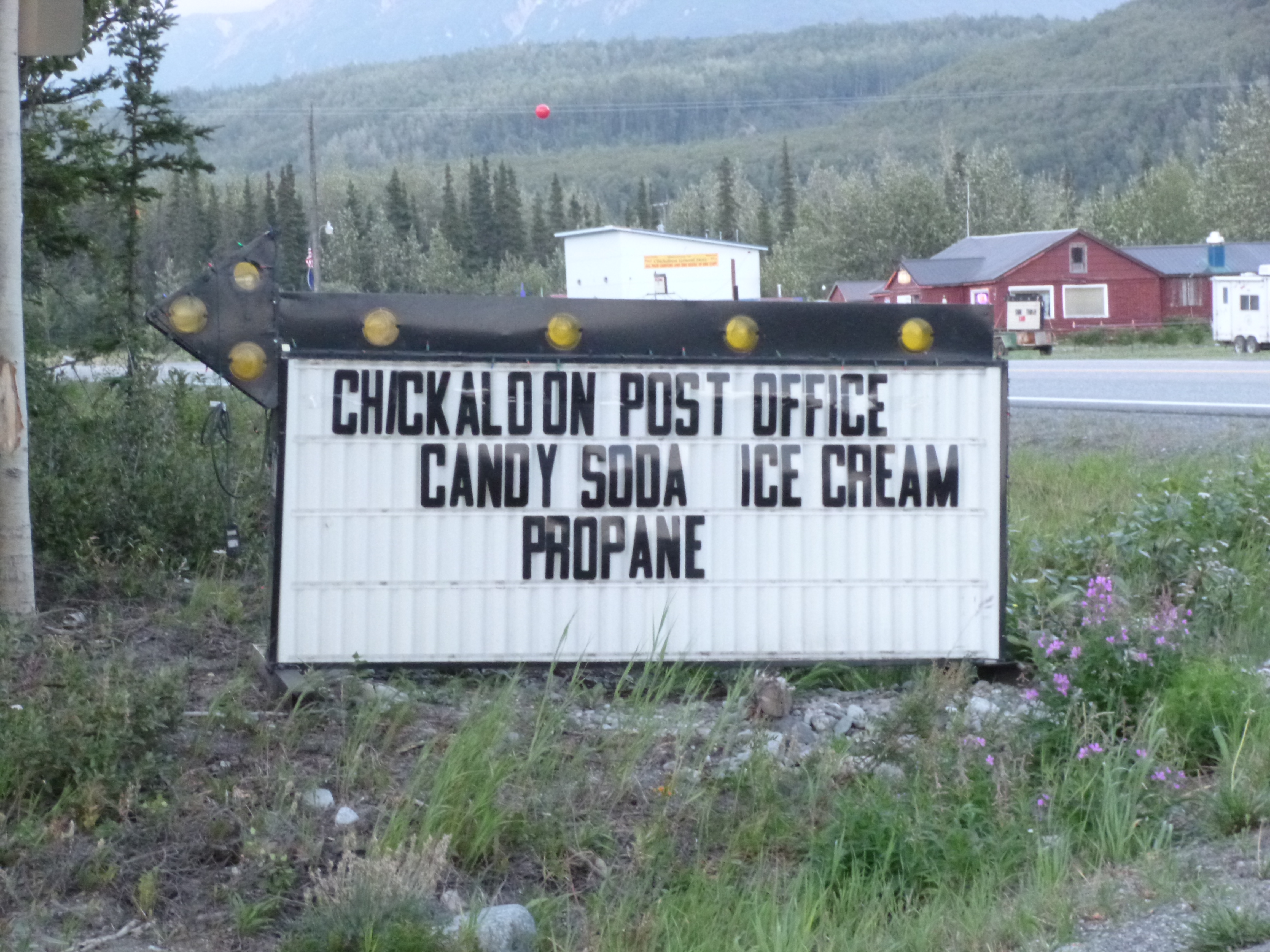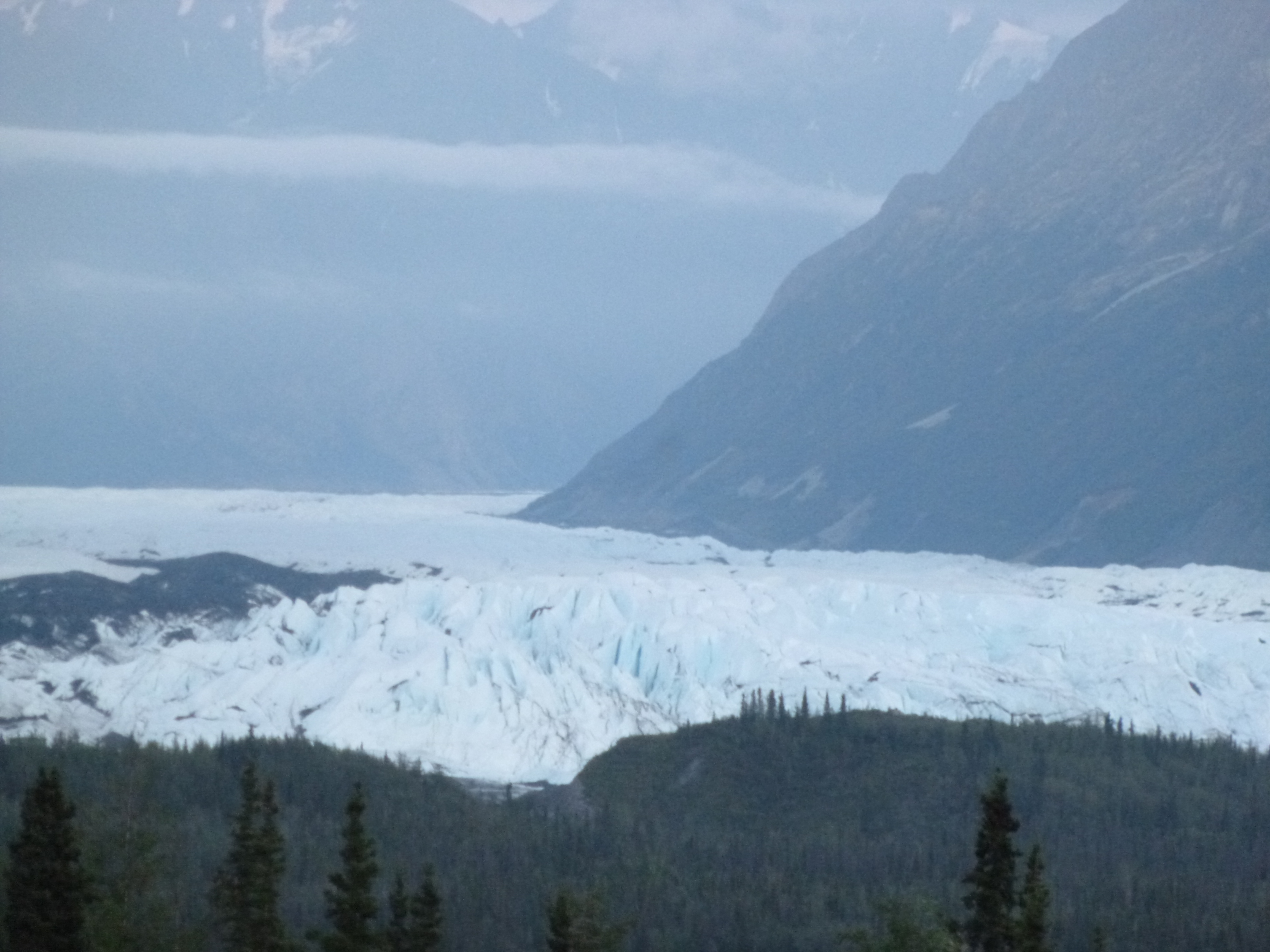 Then I drove through the evening and late evening hours along the Palmer-Glennallen Highway. That was another scenic mountain drive, and I was surprised to see some low-lying glaciers that seemed to be flowing from the bottoms of mountains. So I stopped and admired some of those. I passed through the town of Chickaloon, which is my favorite name of a town in Alaska. Like many small villages, Chickaloon only consists of a couple multi-purpose businesses, and a post office which also doubles as a candy, soda, ice cream and propane shop. (For my next job, I would like to manage a post office/ice cream/soda/candy shop/library!!) And then, finally, I saw a big bull moose along the side of the road. By this time I had seen quite a few female moose, but never a bull, and I stopped and watched him for quite a while. He was just munching on grasses alongside the road. I continued on, and then saw a porcupine, which I’ve never actually seen before. When it got to be 11:30 or so, I simply found a pull-out with a couple RVs and stopped for the night. I had thought I would be in Canada tonight, but there’s just too many miles! Alaska is complete as far as my journey – I walked more than 56 miles in the end (although I had a couple extra days to do so!) and all 7 donations were done – the North Pole Senior Citizen Center, the Fairbanks Foodbank, the Sled Dogs of Denali, NOLS, the Musk-ox Farm, the Alaska Veterans and Pioneer Home, and the Homer Food Pantry. Tomorrow I’ll cross into Canada for sure – I must have been dragging my heels in Alaska a bit – reluctant to leave!