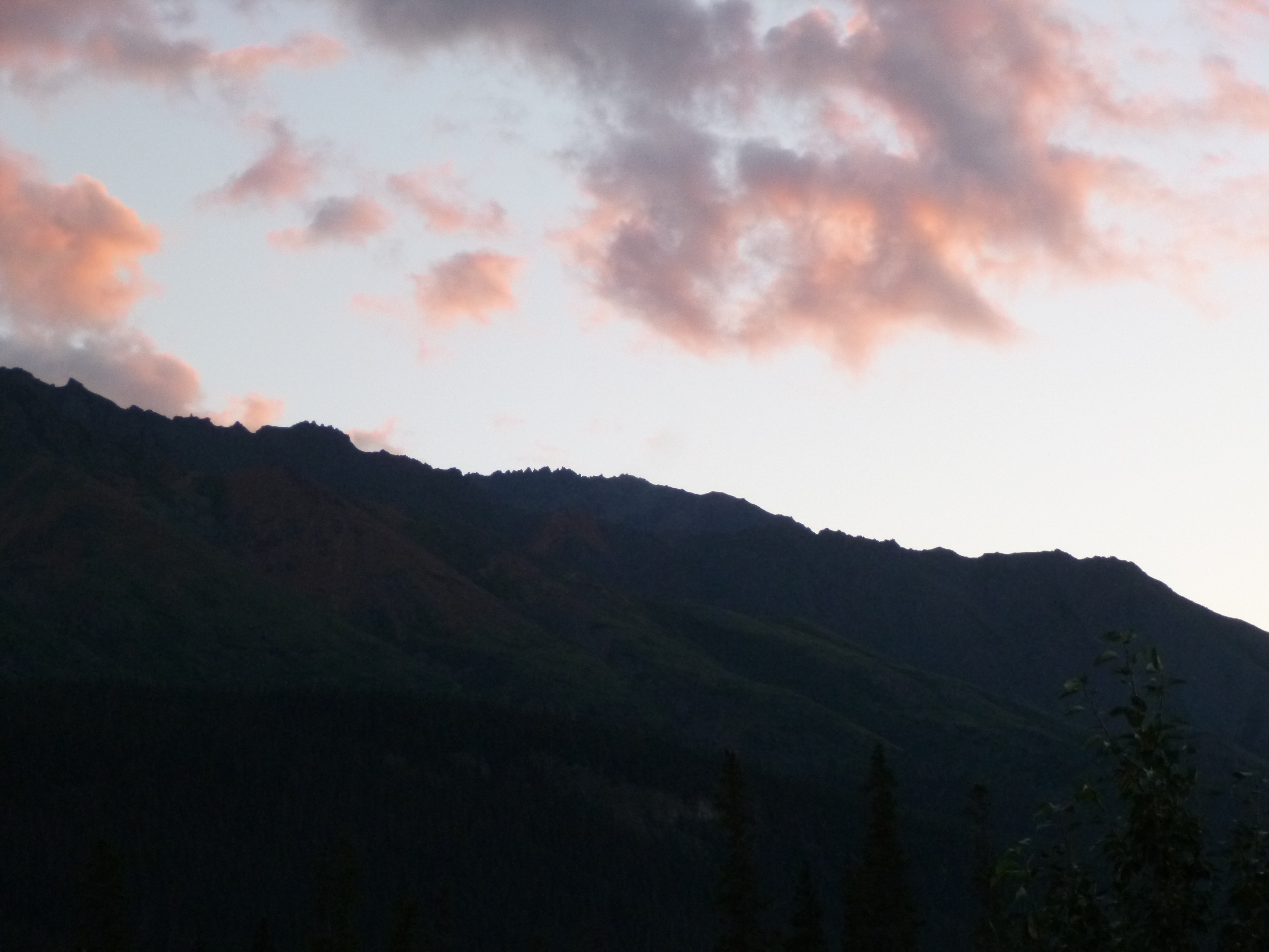 I had stopped sort of close to Glennallen last night, and it didn’t take too long to get there, although there was a lot of road repair work going on, and we had to wait for a pilot car to lead us through the zone again. I started to hear a loud screeching noise, and thought it was the truck ahead of me. But then I realized the racket was coming from my right front wheel. I knew I’d have to stop in Glennallen to see what that was. So I made my noisy way to the visitor center to ask about repair shops, and found out that I’d already passed through town – there wasn’t much to it, despite the fact it looked like a bigger one on the map! But I found out where a repair place was, and made a sharp turn out of the visitor center, and all of a sudden the noise stopped. I wondered if something had been stuck in the wheel that fell out when I turned. Just to be sure things were okay, I stopped by the shop and mentioned the noise to the guy, and he said it’s not uncommon for a stone to get stuck between a bearing and something else, and create a noise, and then it often falls out. The van seemed fine, and I was pretty much reassured I could safely set off the next 140 miles of wilderness. Along the way, I passed the turnoff for the other little segment of road I haven’t driven in Alaska, and was tempted to drive those 60 miles. But it would be slow going, and I’d have to come back 60 miles, and I just needed to continue on – it will be on my list of roads to drive when I come back to Alaska sometime in the future. I made it up to Tok, and then finished the final 100 miles to the Canadian border. It was kind of hard to leave.