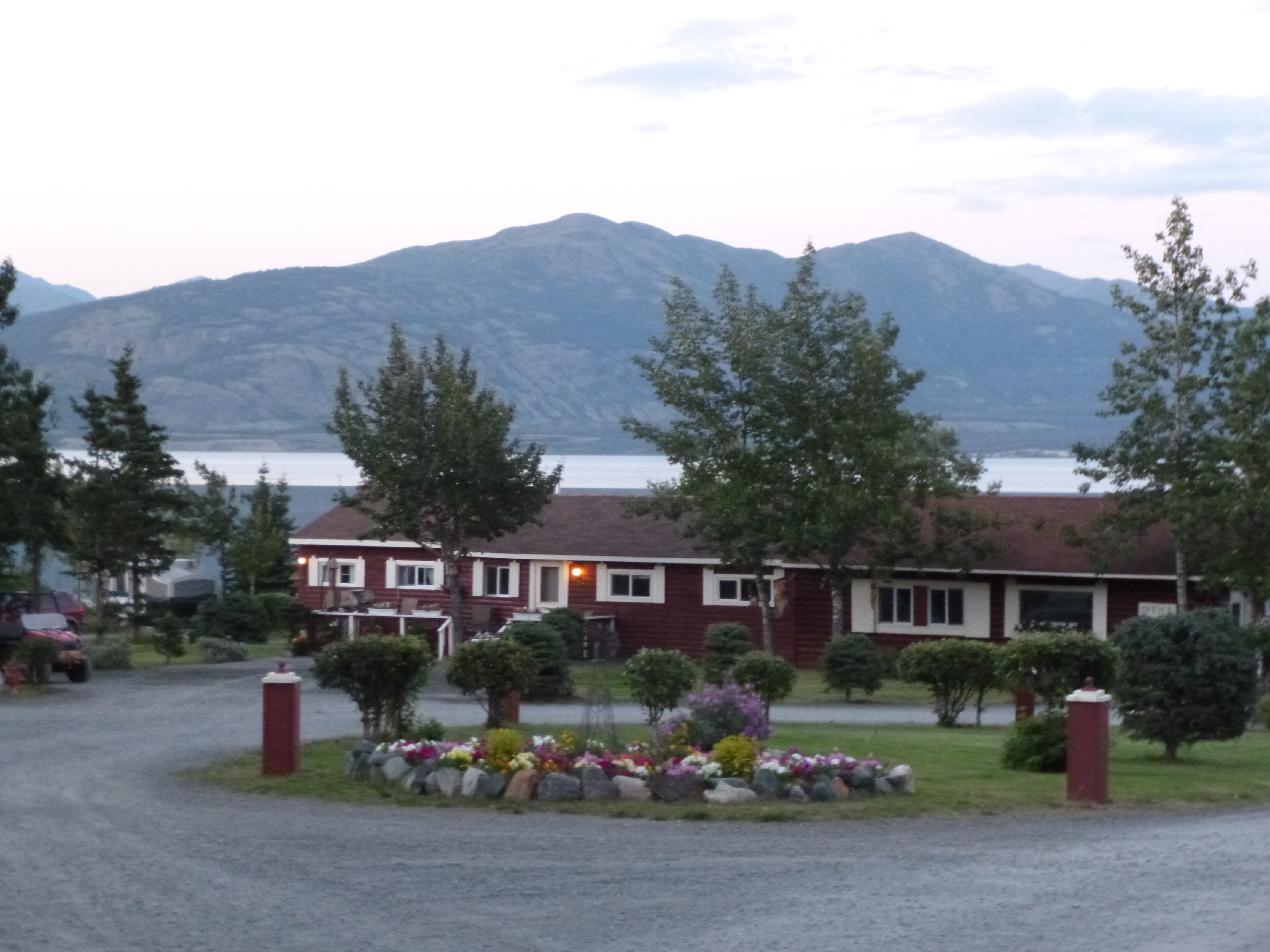 Shortly after I crossed the border and went through customs, I passed through the town of Beaver Creek, which is the westernmost town in all of Canada. This area around the border has the worst stretch of roads as far as potholes, frost heaves and pavement frequently changing to gravel. Typical speeds were 30-40mph, so it was kind of a slow go for a while through the Yukon. But I covered a couple hundred miles in a southeast direction, and passed the nice campground that had the helicopter, and drove by the familiar mountains and alongside lakes. I came to the Kluane Lake area, and then I saw a really nice-looking campground, and figured I better stop for the night. I didn’t want to spend 2 nights in a row alongside the road! The office had already closed, and a sign said to just take care of registration in the morning. Tula and I took a walk around the campground after I was set up, and there were mountains everywhere I looked. The campground is on the huge lake, which seemed to be a big recreation area, and even though it was pretty full, but it was very peaceful and quiet