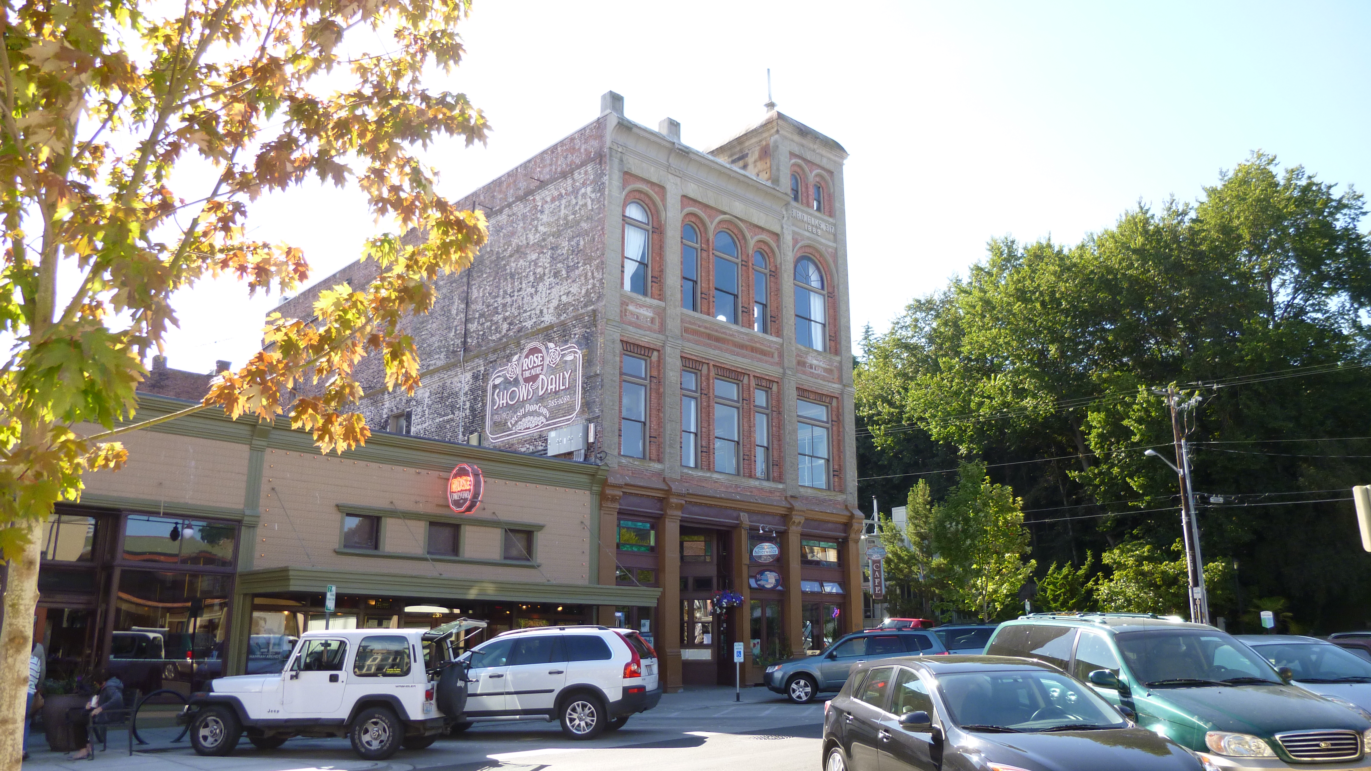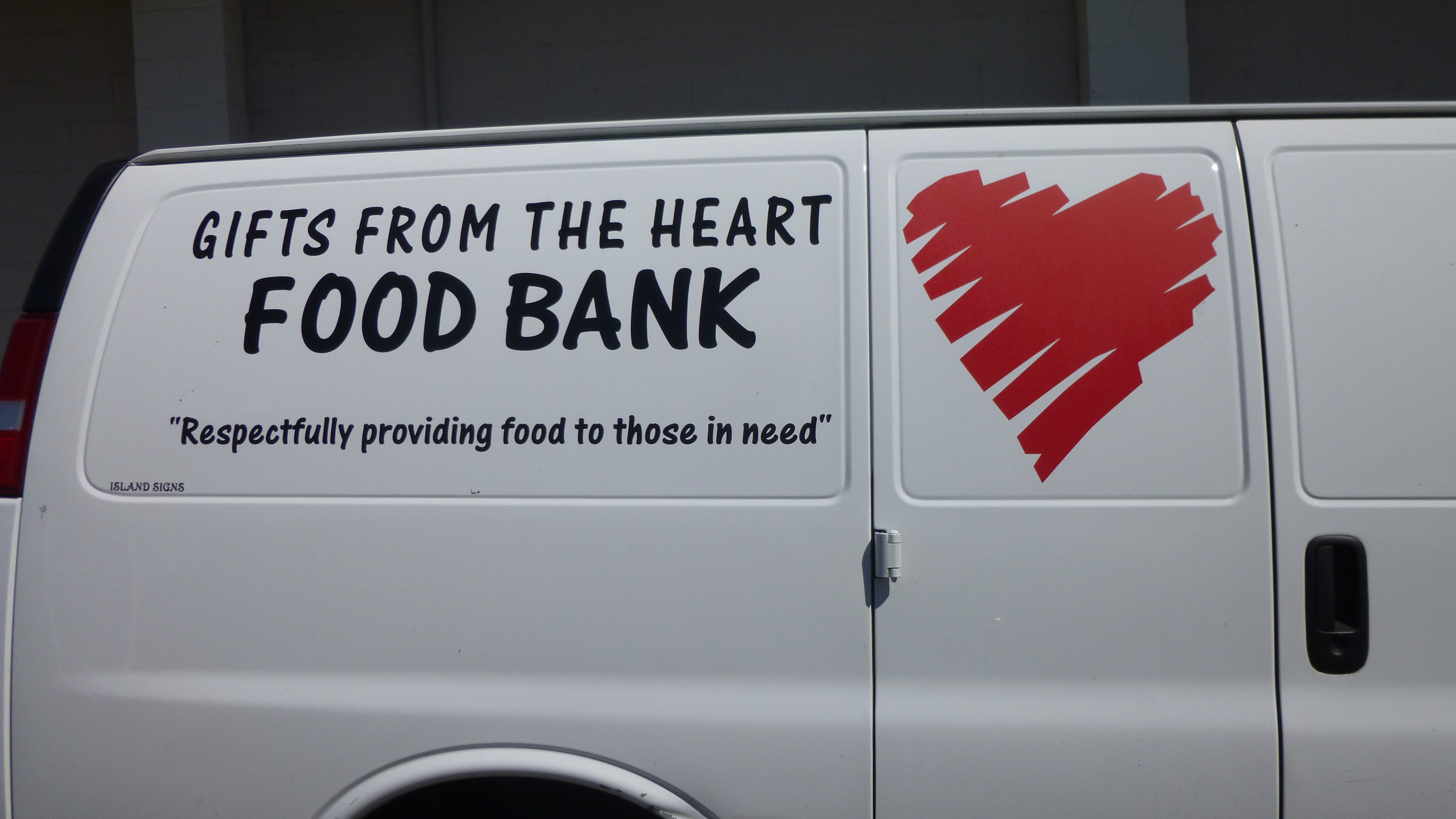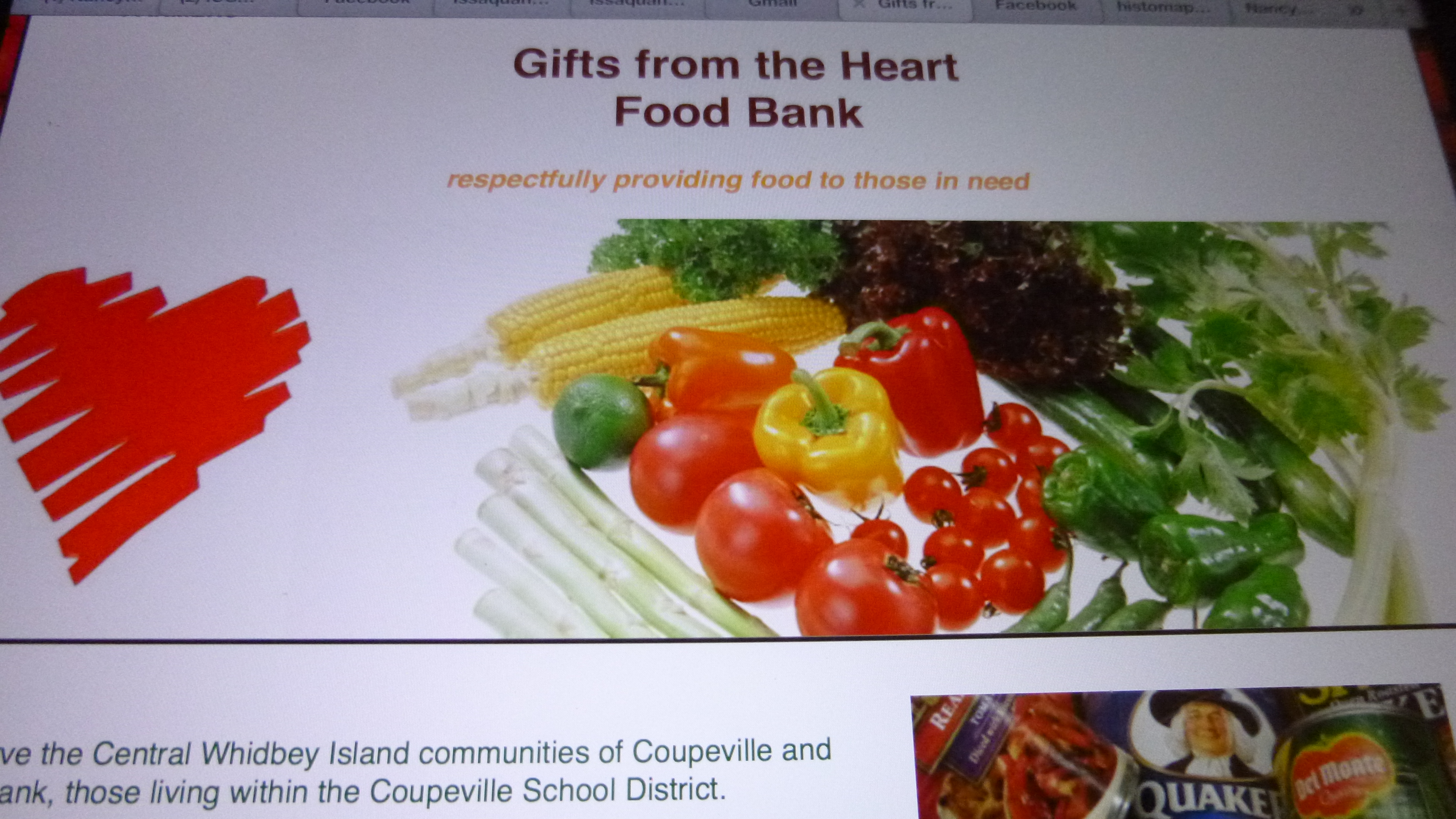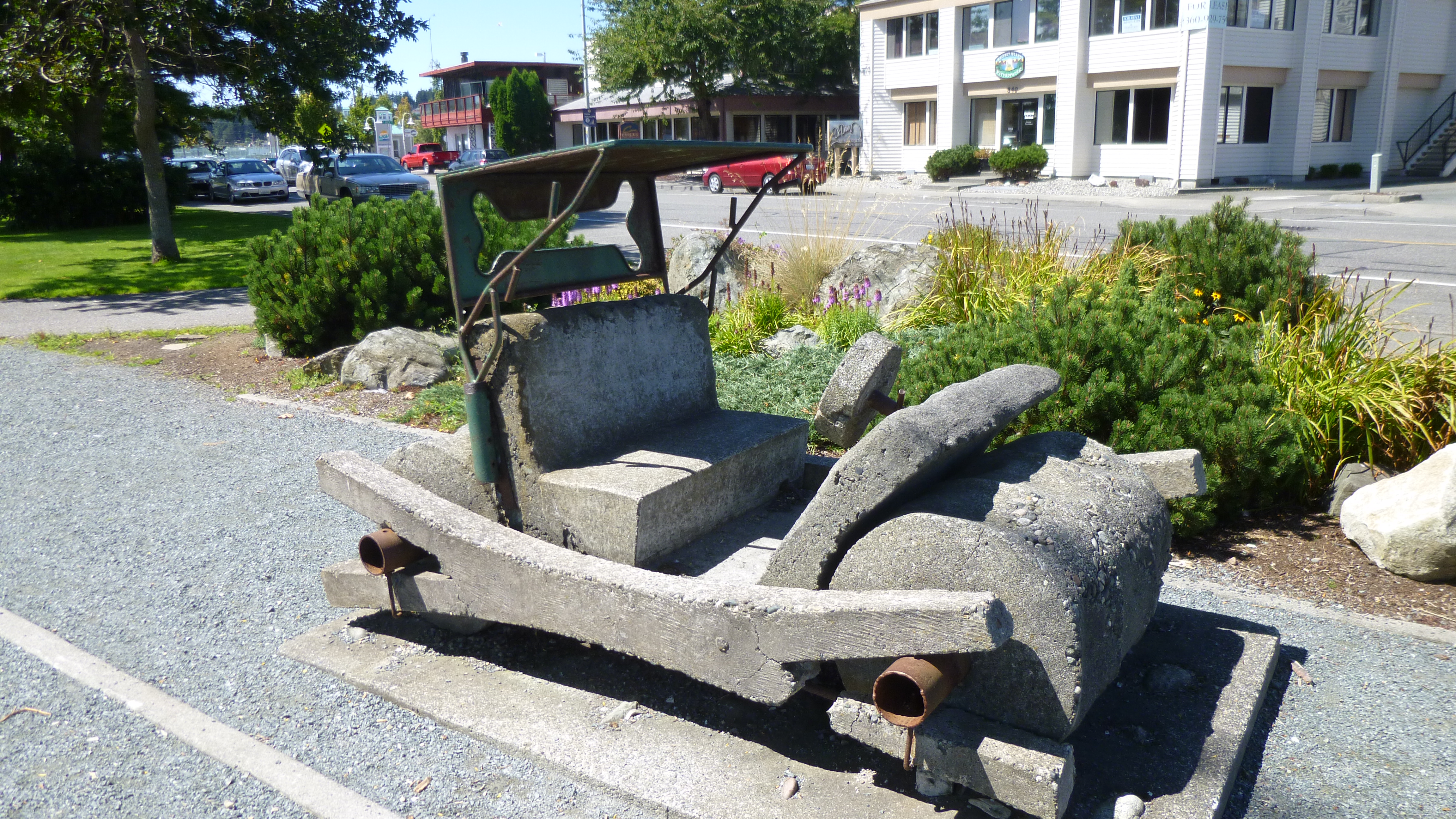 After I was set with that reservation, I headed south on Whidbey Island toward the town of Oak Harbor, where we got out for 2 1/2 miles of walking by the water. Oak Harbor was settled by the Dutch, and there’s a windmill in one of the parks. I walked along a boardwalk, and then came across a concrete version of a Fred Flintstone car – hmmm! I continued on to Coupeville, where I was going to make my donation to the Gifts from the Heart Food Bank, which serves central Whidbey Island. They are not open every day, but their website said non-perishable foods could be dropped off any time at one of 5 different places in town. So I went shopping for non-perishable goods and got cereal, oatmeal, spaghetti sauce and pasta, canned pasta, mac and cheese, and canned chicken and tuna. Then I found the Whidbey Island Bank, and one of the ladies showed me the box that was set out for donations. It only had a couple things in it – I added all my shopping bags and overflowed the box!