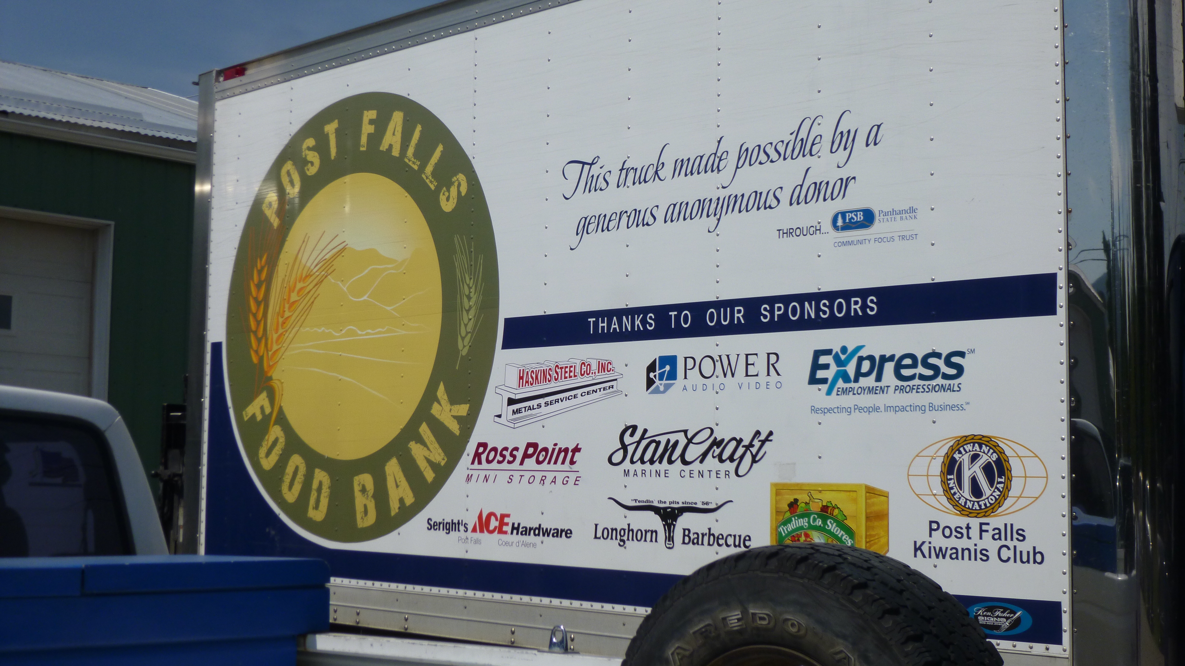 About 5 miles after I crossed the state line, I came to the town of Post Falls. I figured it was a good place to start my Idaho walking, but first I looked into donation possibilities, and saw that the Post Falls Food Pantry had a backpack program, and with school getting ready to start up, I wanted to make a donation to that program. I called to find out if it would be best if I went shopping for some of the food, or if a financial donation would be better, and they said they could stretch the dollars farther than I could up at a big food bank, so they would certainly appreciate a check! I found the food pantry, and they were open for business, and helping some people get their food. I met Sherry (I think I have that right!) and she showed me around. Everything is wonderfully organized, and they had carts of food ready for people to pick up – in addition to non-perishable food, families also get fresh produce, and baked goods from stores. They’re able to come in once a week. And there is a huge need for the backpacks that are sent home with school kids on the weekends – I’m pretty sure I heard that close to 60% of the children in the area qualify for the extra help, and a lot of volunteers come in to help get the weekly backpack bags ready. It was fun to hear about their programs and see the whole place – it’s bigger than it first looks!