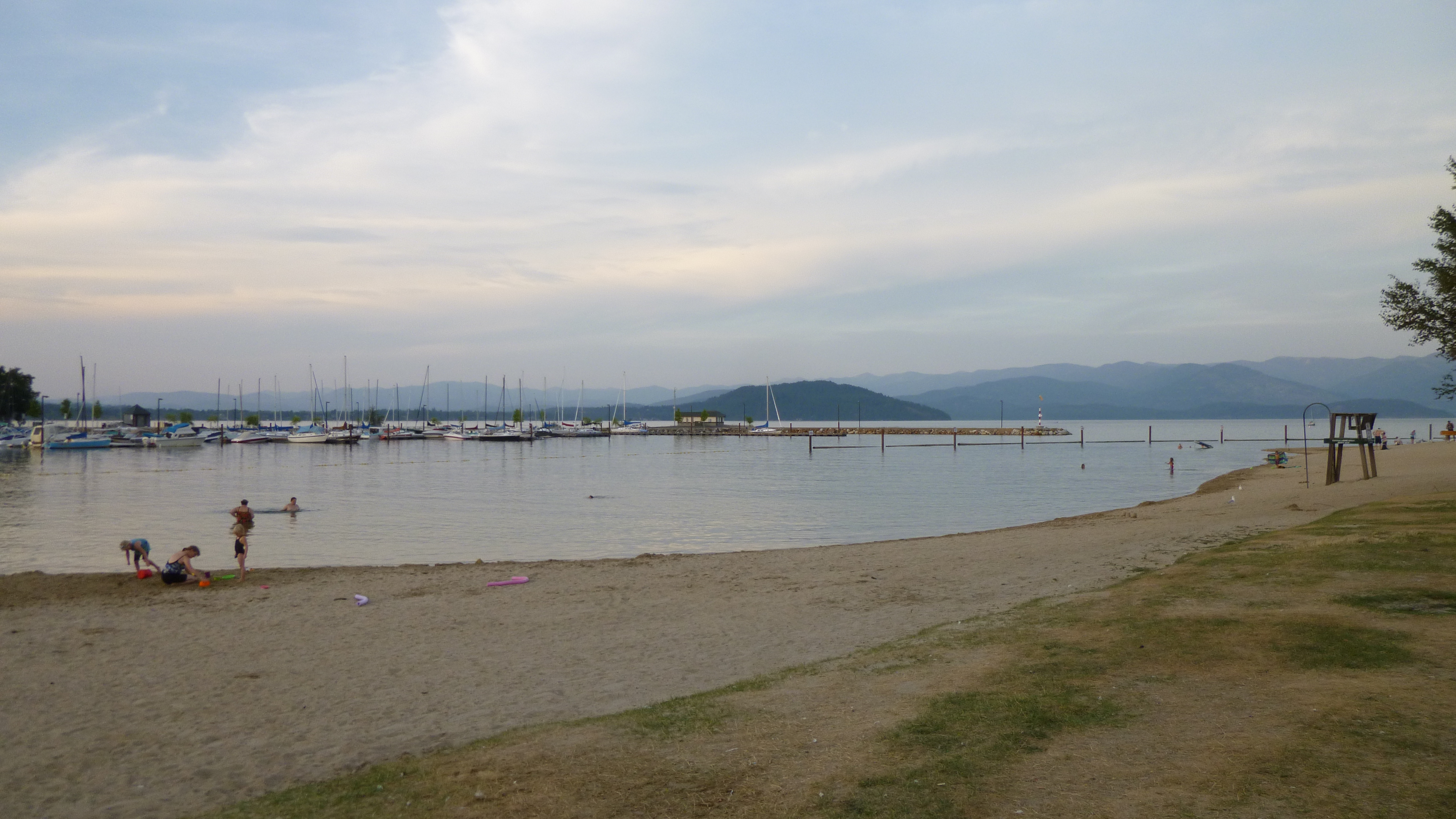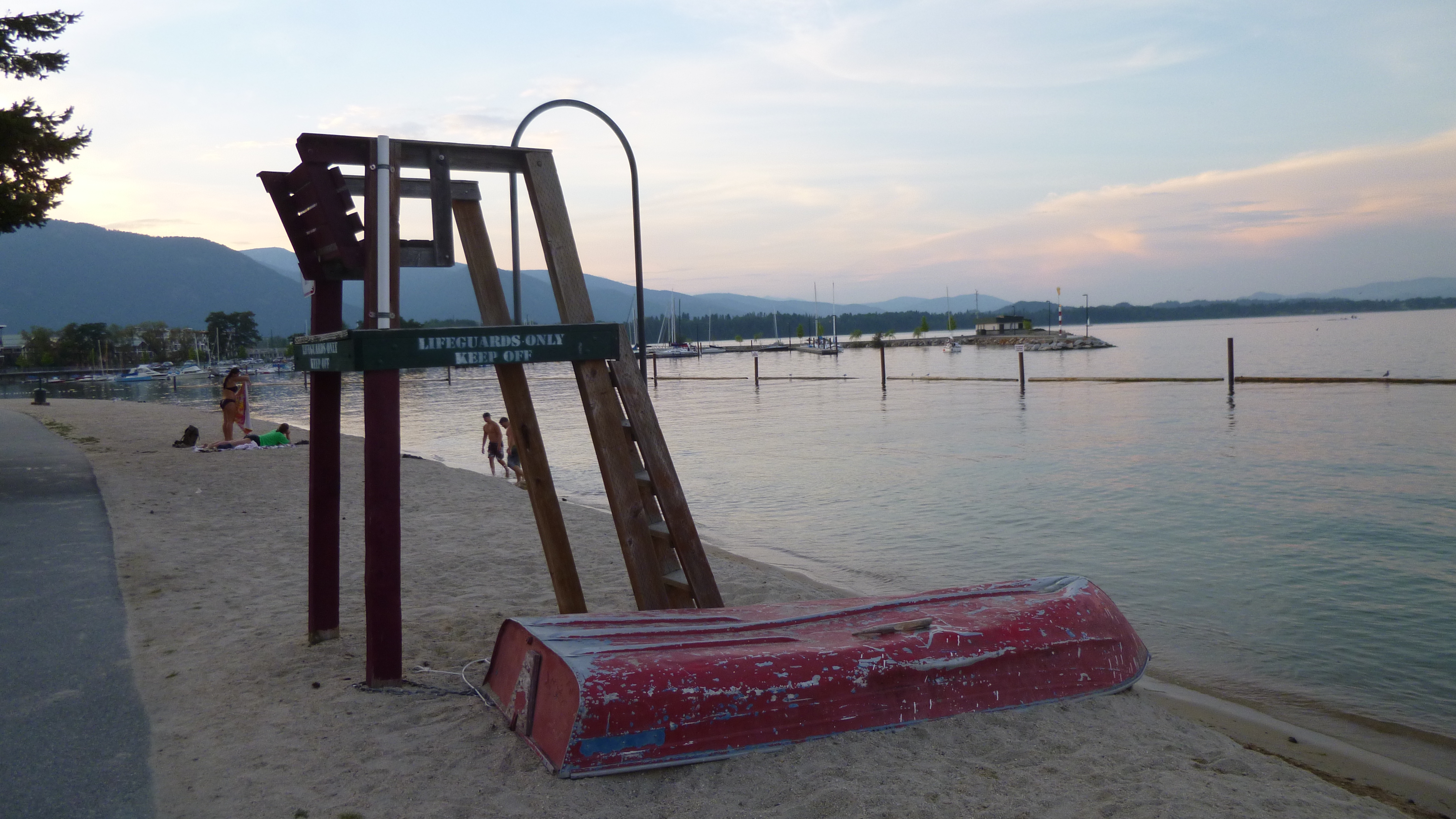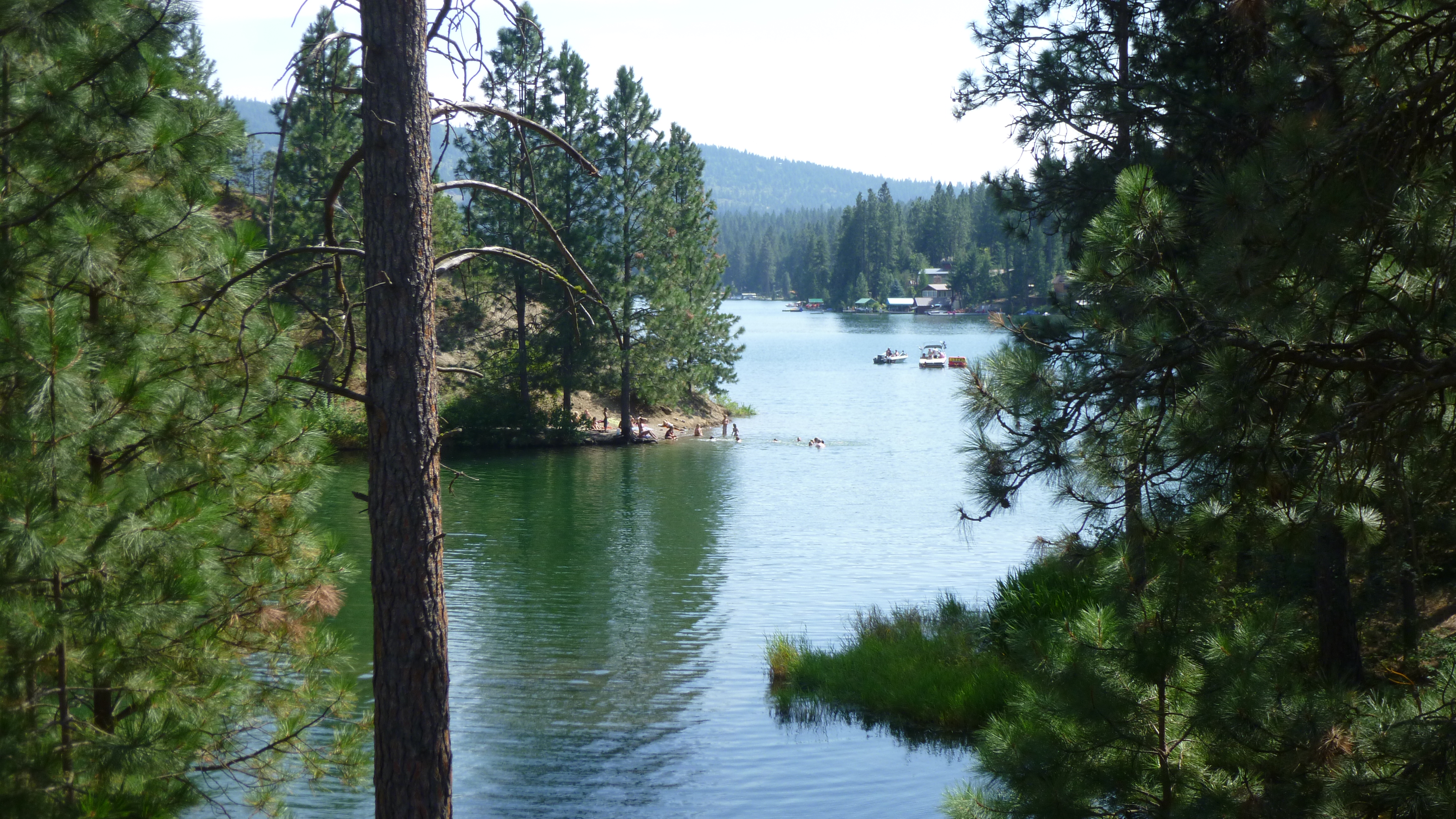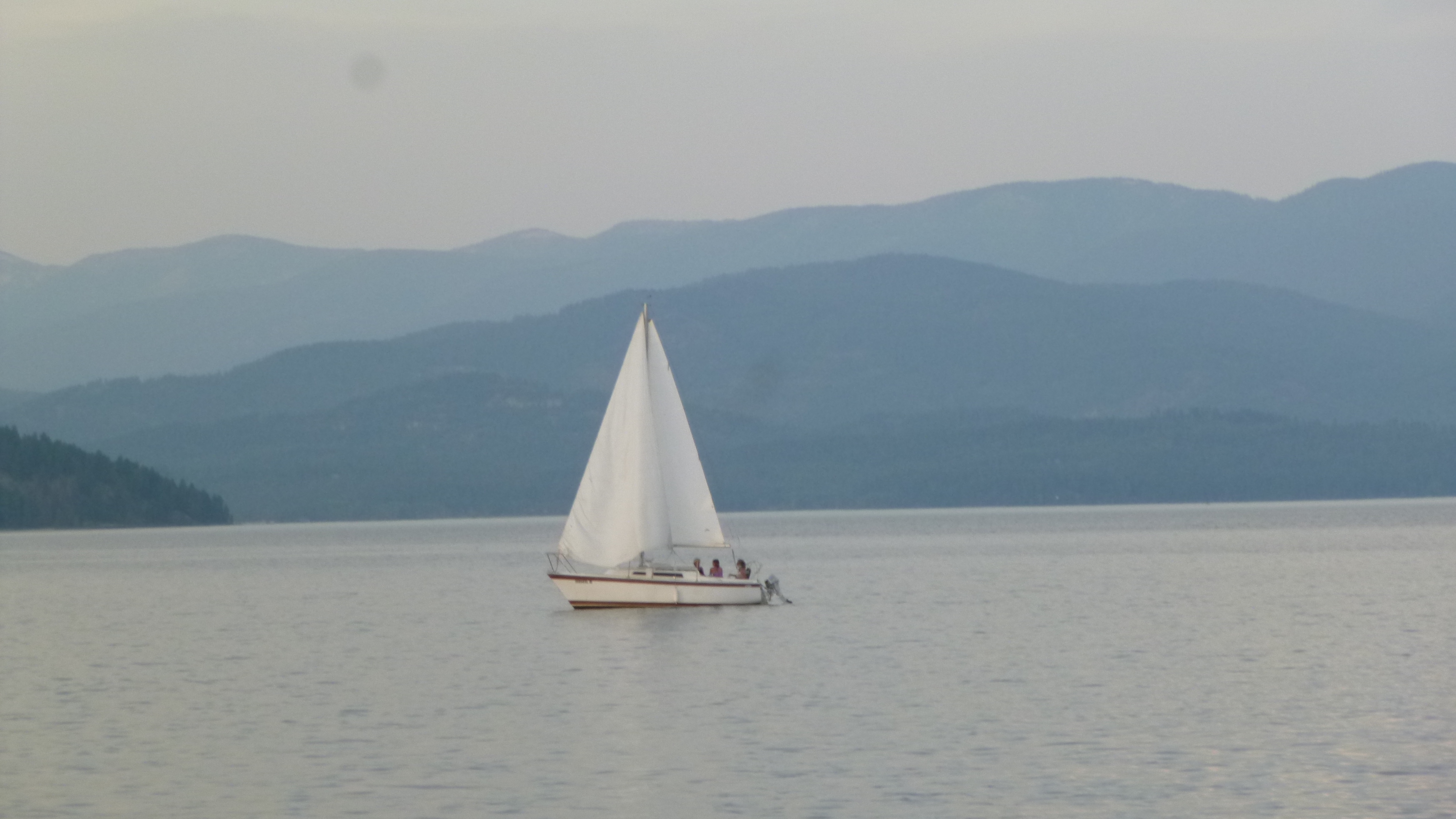 Then I left Post Falls and headed up to Sandpoint, a town located at the north end of a 43 mile long lake. There was a farmer’s market going on in a park in town, and it was fun to wander around that, and through the rest of town. The Coldwater Creek flagship store is in Sandpoint, and I popped in after I put Tula back in the car, but it pretty much looked like any other Coldwater Creek store – except they had a wine bar upstairs. There was a bike trail along one of the rivers in town, so I walked a couple miles along that, and then finished off the walking for the day at the beach area – which was a big peninsula sort of shape with numerous sandy beaches, lifeguard chairs, sailboats coming in, a lake tour boat, and playgrounds. There was a walking path around the whole area, and it was just kind of a perfect summer snapshot!