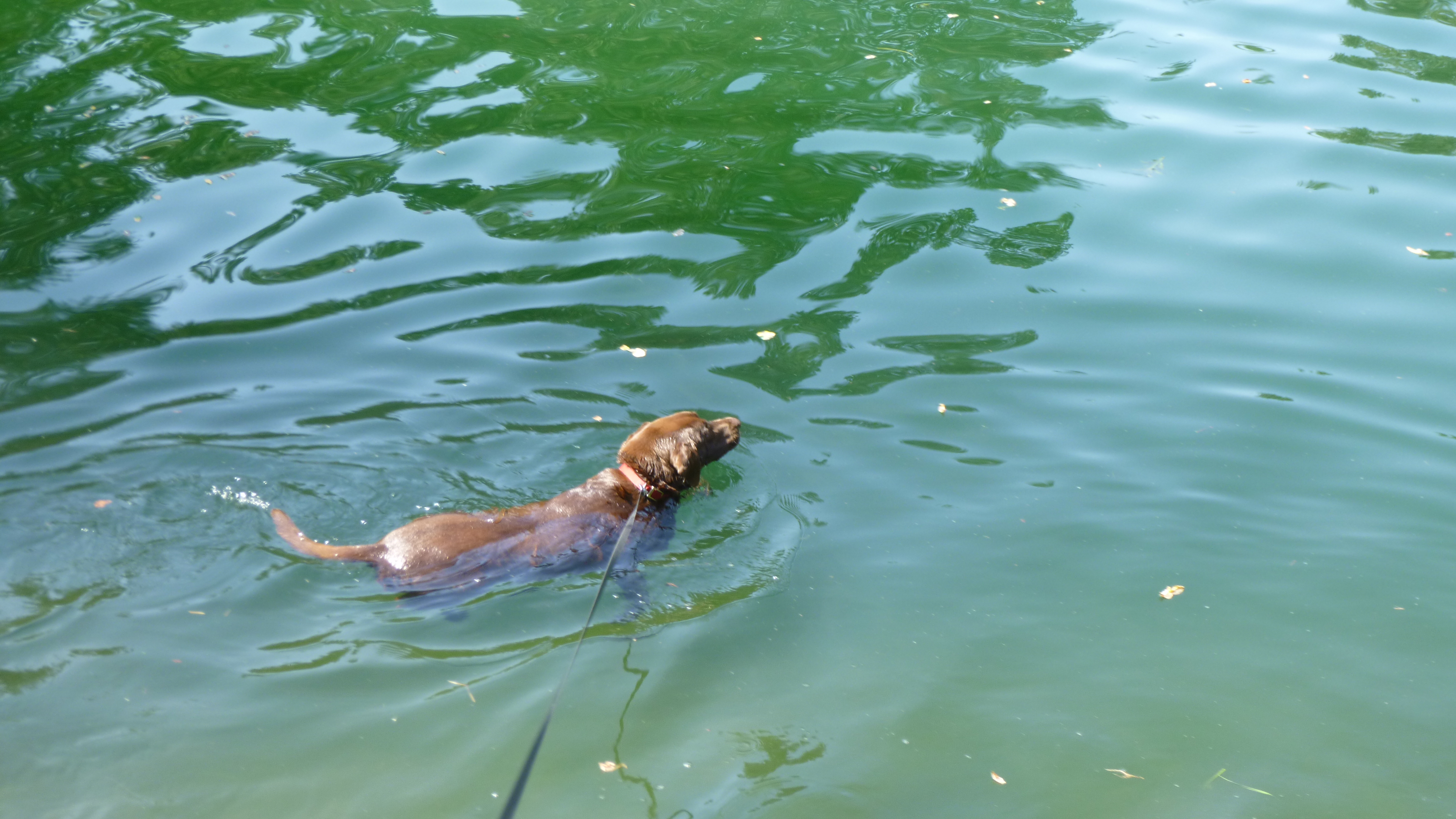 Then it was time to do some walking. I found some trails near a beautiful lake, and lots of people were out swimming and boating. There was an especially pretty little cove, and one of the big pine trees even had a long rope tied to it so the kids could swing out over the water and drop in. It was such a nice summery afternoon – kids on bikes and skateboards, bikes flung down in haste to get to the water, families on the beach and even some dogs in the water. At one point by the lake, Tula decided so quickly to take a dip that I couldn’t even get her leash off! And she jumped in at a steep spot and of course gave no thought as to how she was going to get out again, so that was a bit awkward, but she made it! Altogether on the lake paths and part of the Black Bay trail, I covered a little over 4 miles.