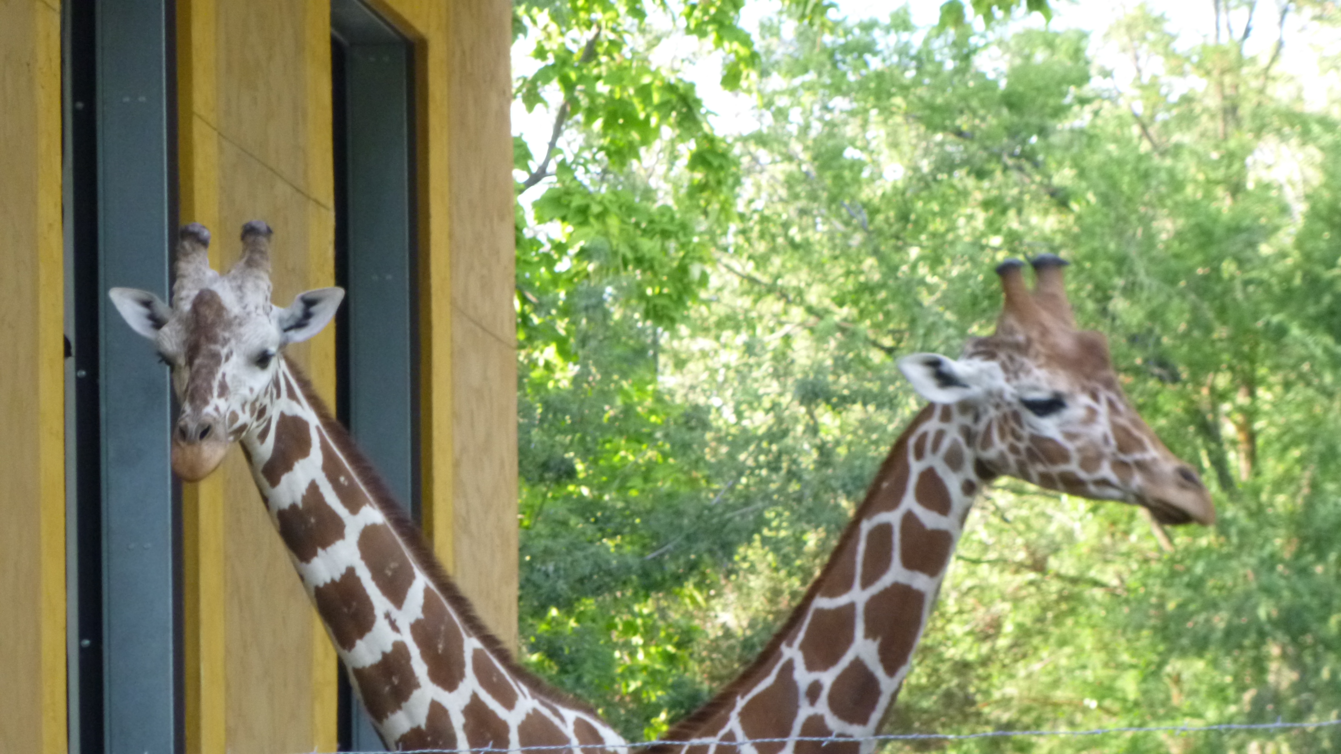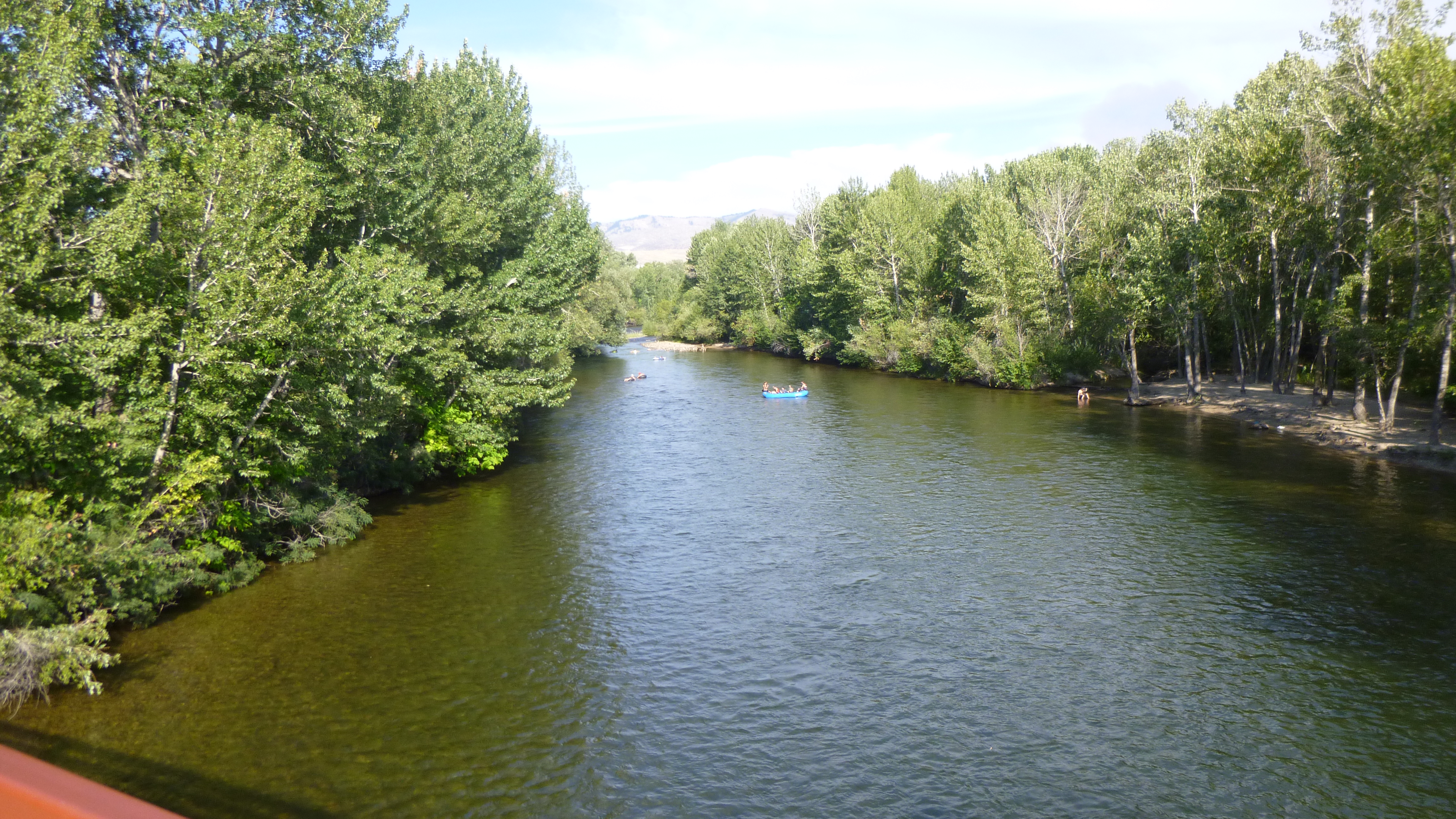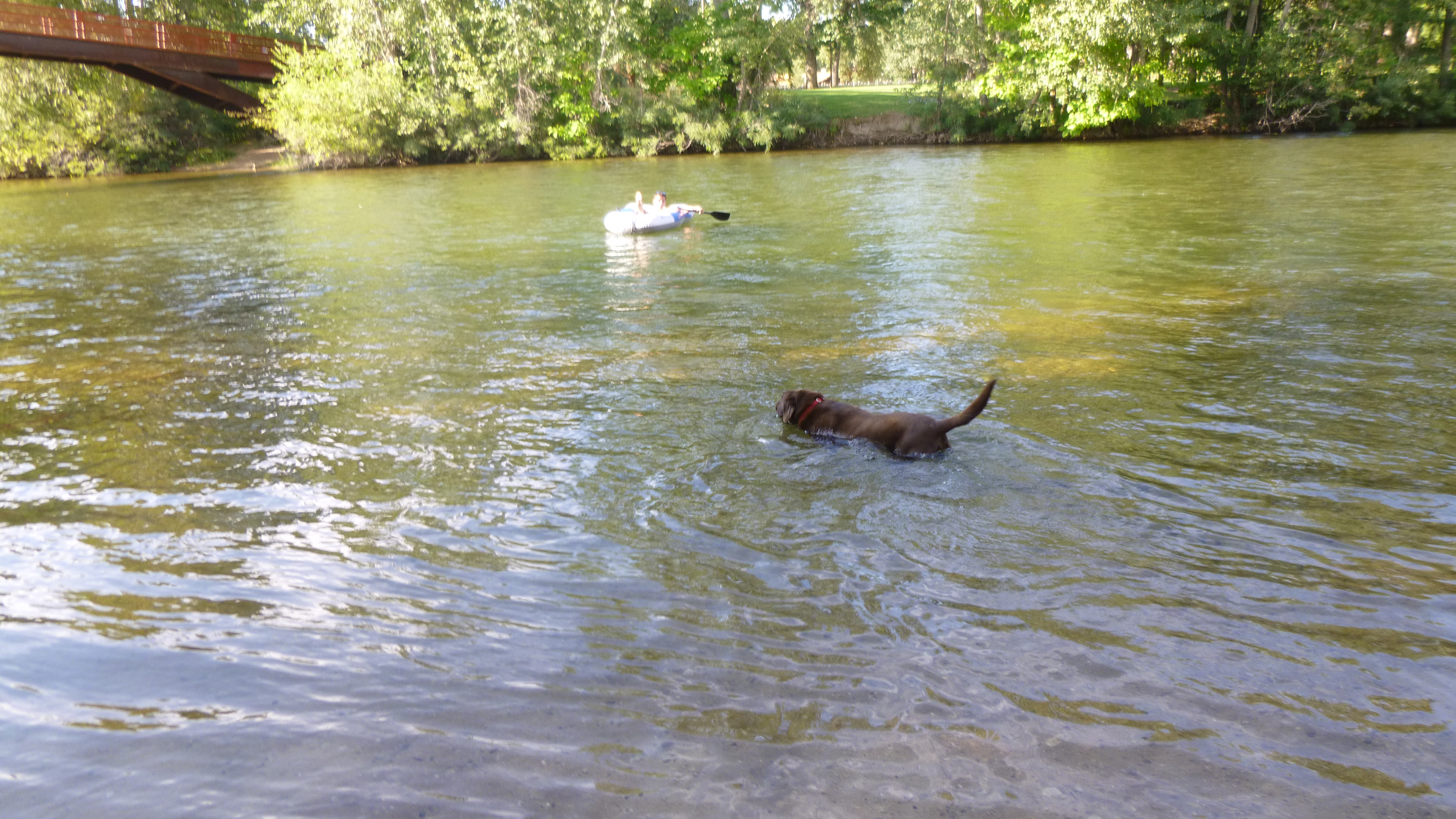 So after we took some pictures, I drove over to one of the old residential areas, and Tula and I walked a couple miles and admired all the different homes. Then I went downtown to the state capital area, and covered another mile and a half there while Tula waited in the car with the air conditioning. This part of the state is also along the old Oregon Trail, and there was a monument dedicated to the pioneers. Then we found the greenway, and it was a wonderful, shady path along the river that stretches for miles, and Tula and I walked another 3 miles. We crossed a bridge at one point, and went down by the water’s edge, where Tula waded in to the river for a quick dip. She dried off on our way back to the van. Then I headed out for another 2 1/2 miles in a slightly different area, and at one point I walked around a bend, and saw some people looking up in the trees (I thought) and wondered what was up there – it turned out they were looking at giraffes! I certainly didn’t expect to see a couple giraffes while out walking in a city in Idaho, but there was a zoo in town and the bike trail happened to go by the giraffe habitat. They’re one of my all-time favorite animals, and it was fun to just stand there and watch them for a while.