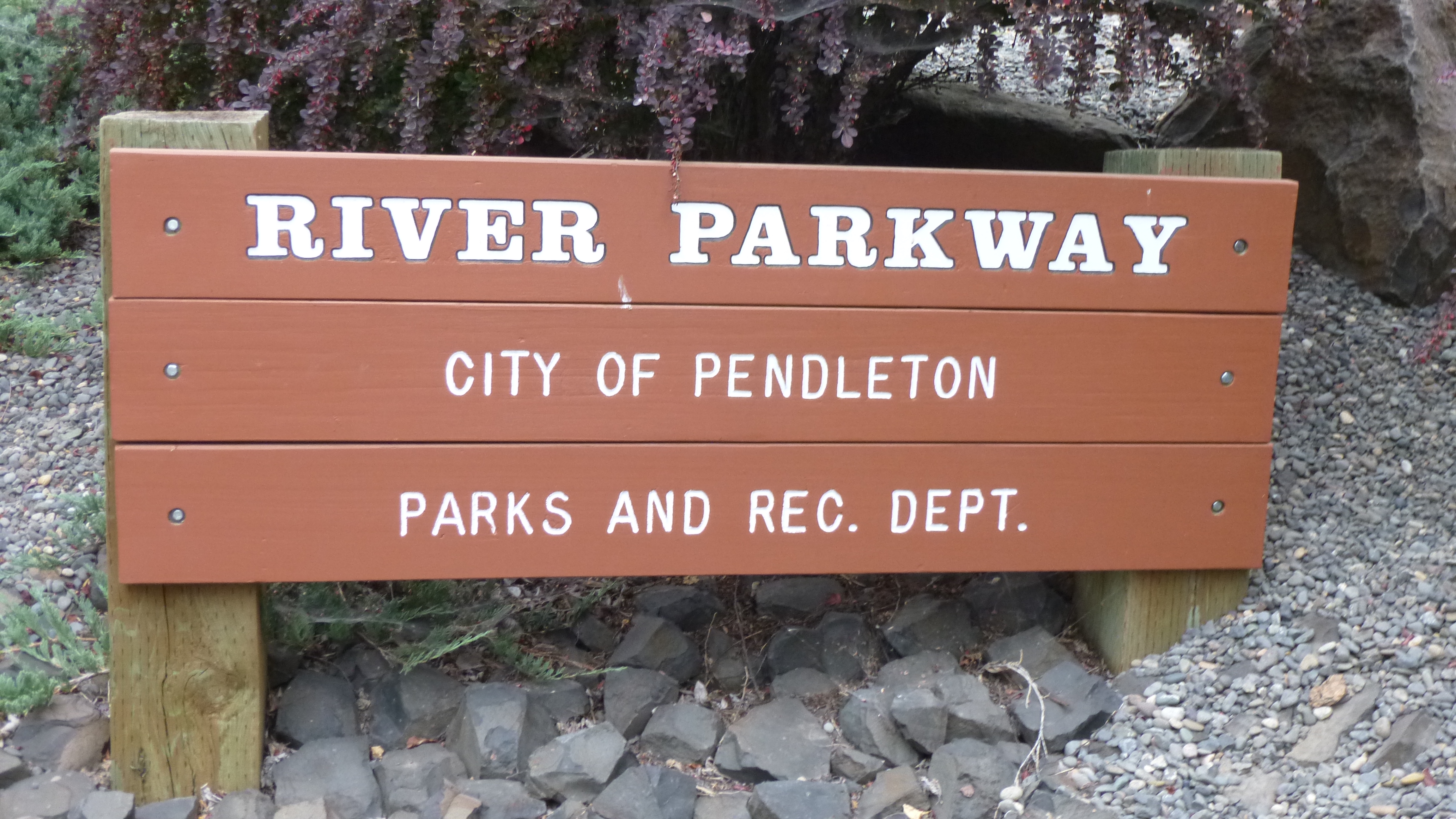 From there I headed to the town of Pendleton. Rain clouds were beginnning to move in, but Tula and I set off for about 2 1/2 miles of walking on the river trail. Despite being next to river, it wasn’t the most scenic of walks – this used to be a railway, and the tracks ran between the river and the backyards of some well-worn houses, showing me yet another dimension of American life. Plus some police cars came along, and I saw the police questioning a couple of teenage boys, and by the time I was walking back, the mother of one of them had arrived, and she was not very happy with her son. It was time to finish up that part of my walk, and then I headed into the historic part of town to finish the last of my walking in a sprinkling of rain. Then I drove past the Pendleton Woolen Mill, but it had closed for the day – it would have been interesting to go on one of their tours, but that will have to wait for another time.